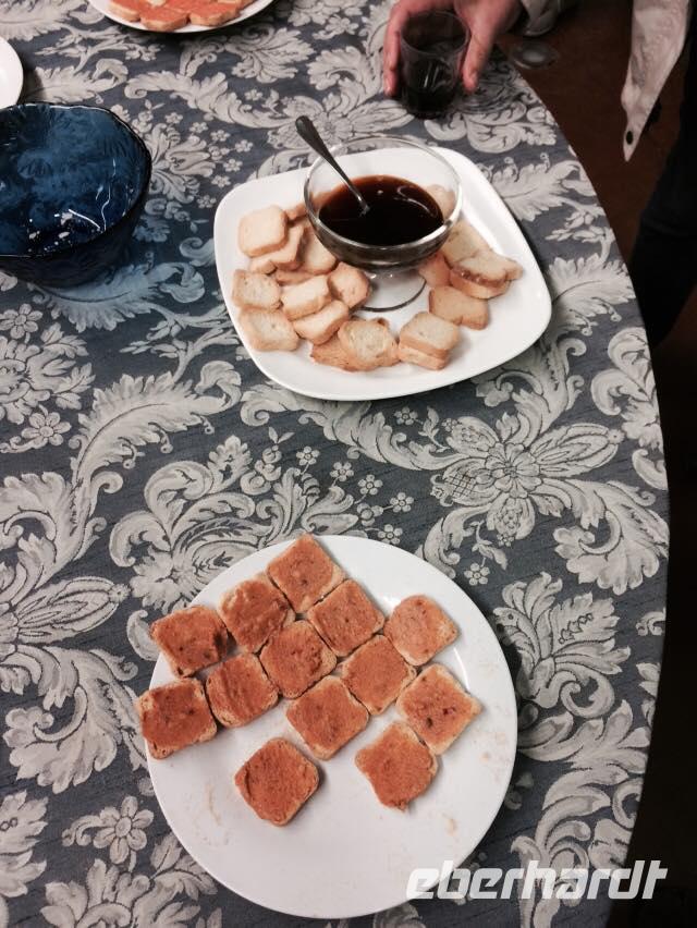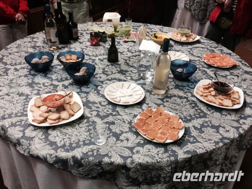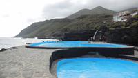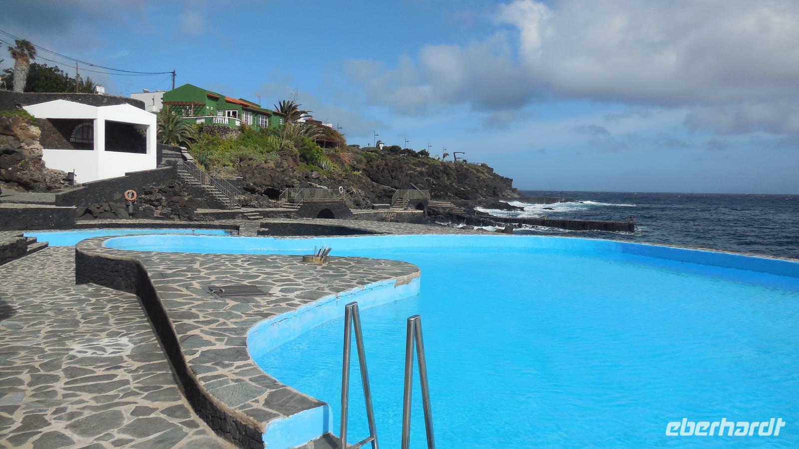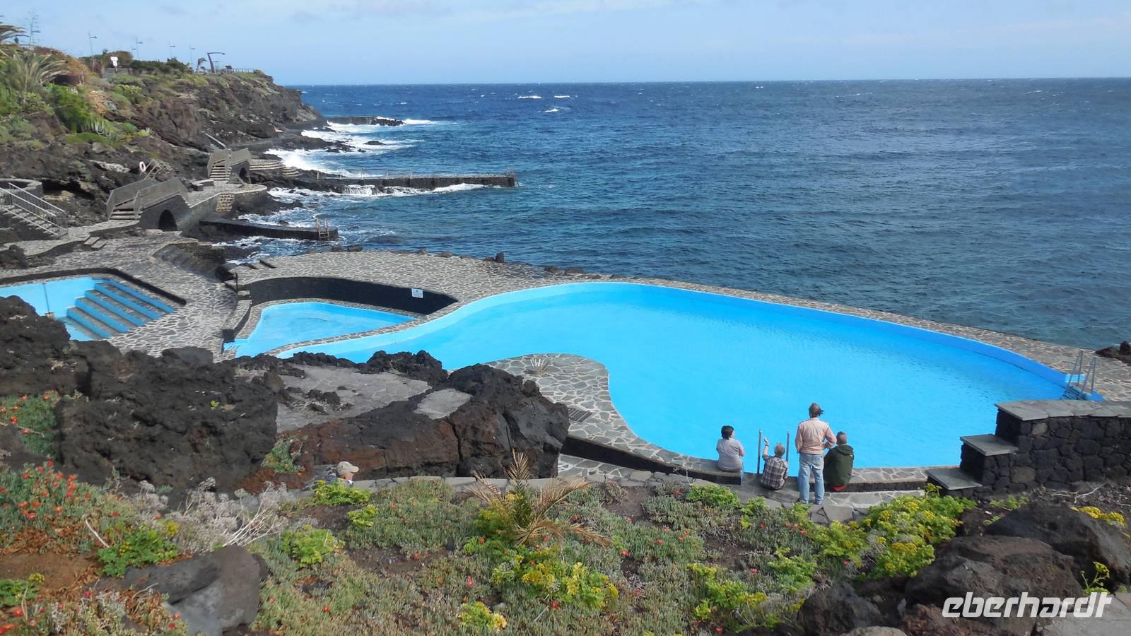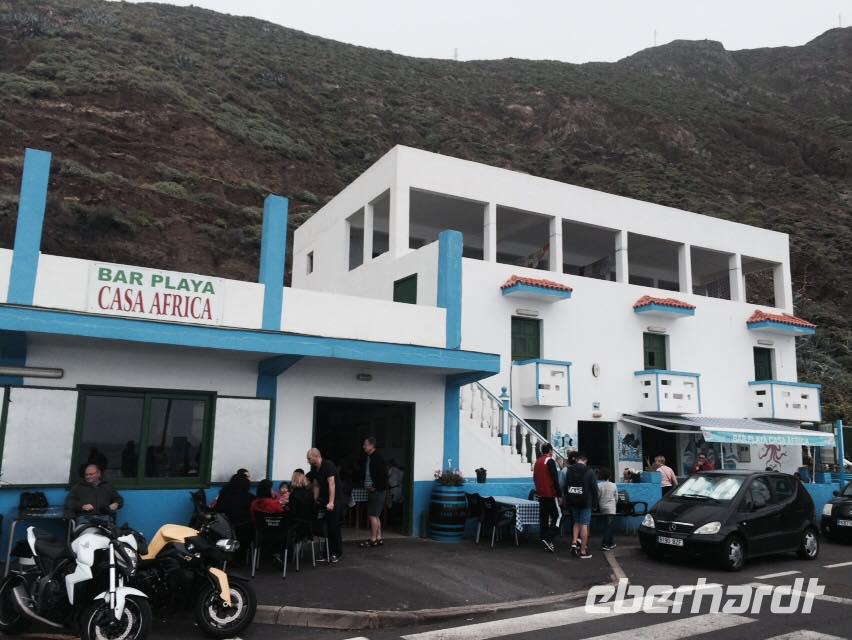 Gegen drei erreichen wir den Küstenort La Caleta und kehren in einer typisch kanarischen Bar ein, wo wir traditionelle Tapas kosten: Croquetas, Arepas, Sandwiches mit Avocado und natürlich die Papas arrugadas mit verschiedenen Mojosaußen. Nach einem herzhaften Mahl geht es weiter ans Ende des Dörfchens, zu den Meerwasserbädern.Obwohl der hellblaue Pool verlockend aussieht, geht von uns niemand ins Wasser, denn der Wind ist ziemlich stark. Bei schönstem Meerblick belohnen wir uns wieder mit einem Gläschen Ron Miel. Wir entspannen in der angenehm, warmen Sonne und lauschen einer neuen Legende, welche uns Ralf vorliest. Diese handelt von Untergang der Guanchen, ihrem letzten großen Kampf. Nebenan zeigt uns ein Fischer hocherfreut seine gefangene Muräne. Schließlich fahren wir zurück ins Hotel in Mocanal, wo wir zum Abend heute gemischten Paella essen und typischen Wein von El Hierro trinken.