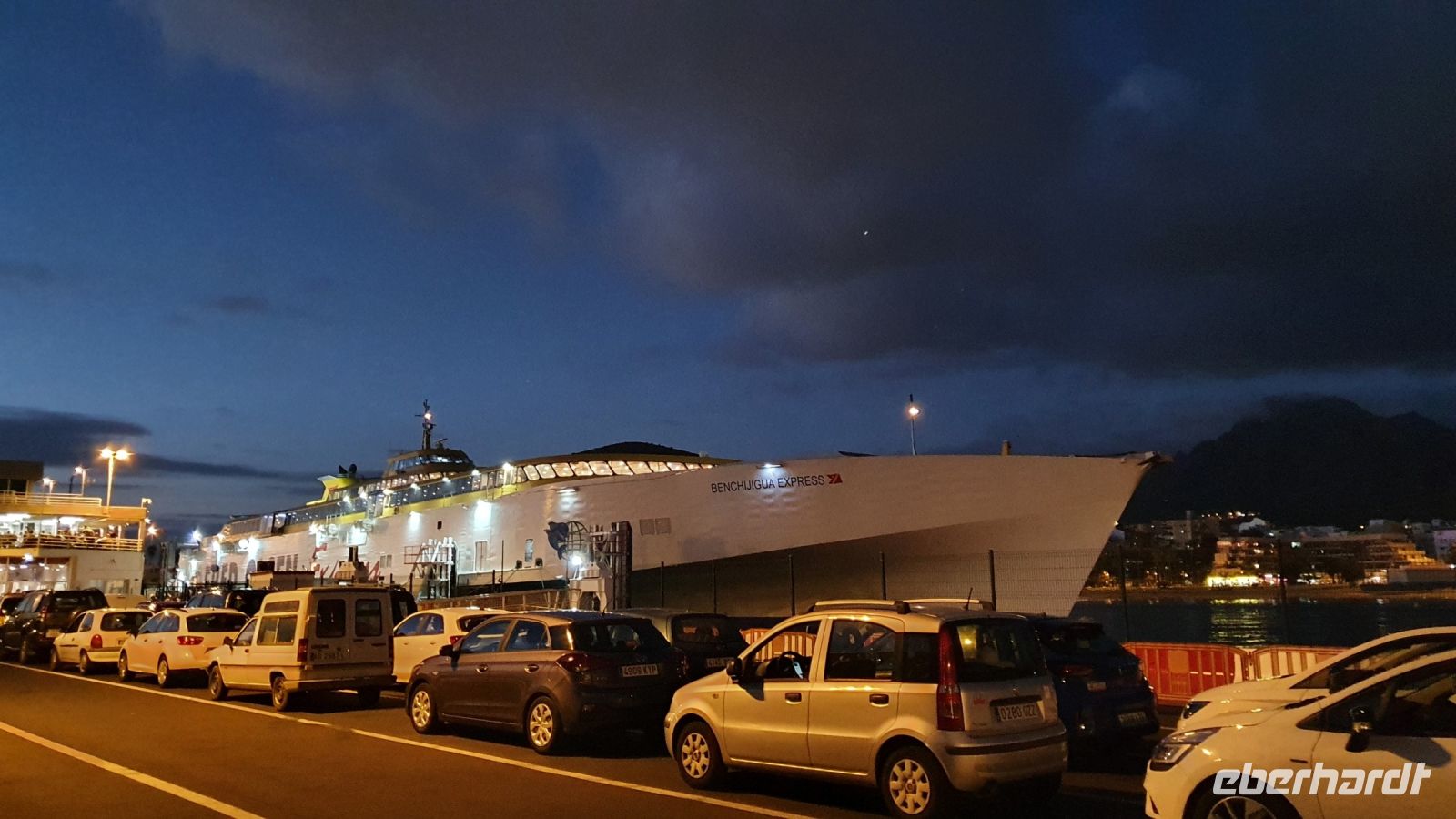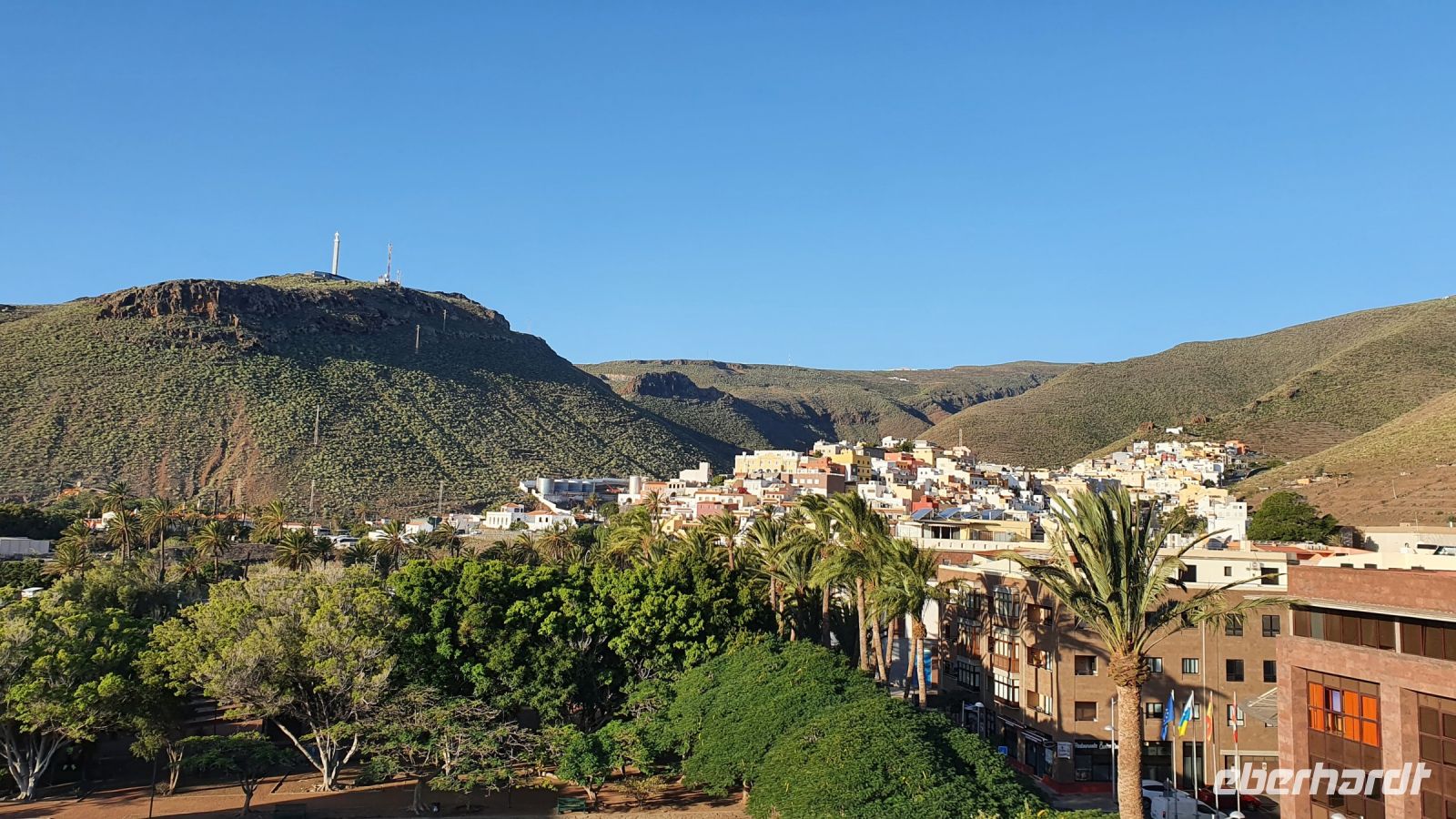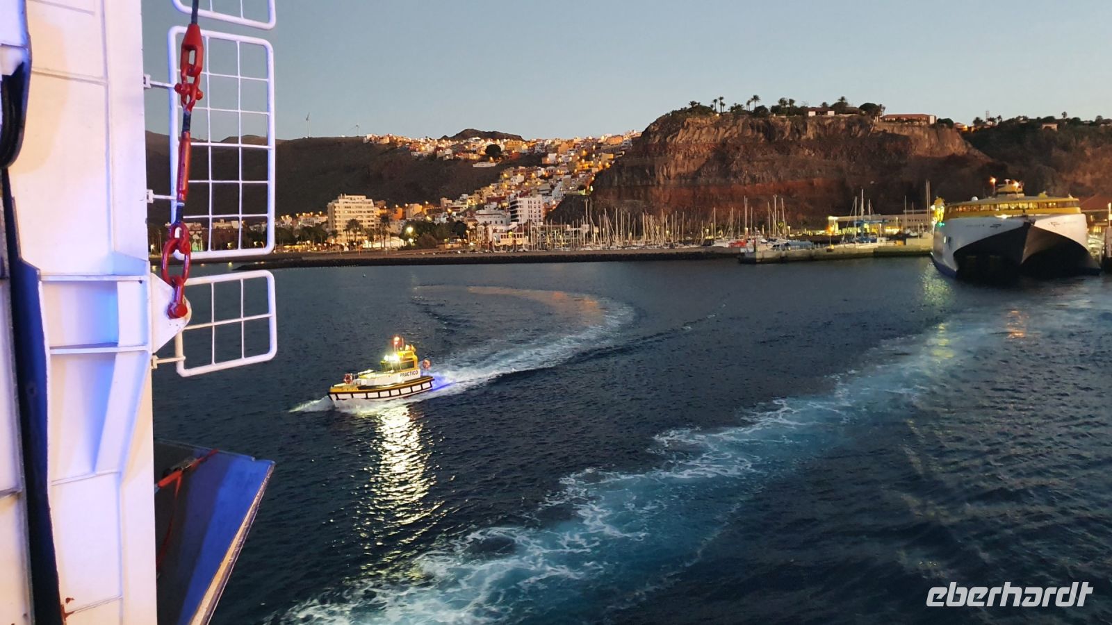 Die meisten Gäste unserer Gruppe flogen mit mir vom BER nach Teneriffa Süd und dort trafen wir auf weitere 4 Wandergäste. Gemeinsam fuhren wir ein kurzes Stück vom Flughafen zum Fährhafen im Süden der Insel Teneriffa und dort machten wir es uns auf der Aussichtsterrasse bequem, aßen eine Kleinigkeit und warteten. 19.30 Uhr endlich legte die Fähre von ARMAS ab und eine Stunde später erreichten wir den Hafen von San Sebastian auf der Insel La Gomera. Ulrike erwartete uns schon und begleitete uns ins Hotel Torre del Conde, mitten in San Sebastian. Man hatte mit dem Abendessen auf uns gewartet und zur Begrüßung gab es ein Glas Sekt. Während des Essens wurden die checkin Formularitäten abgewickelt und danach freuten sich alle auf ihr Bett nach der langen Anreise.