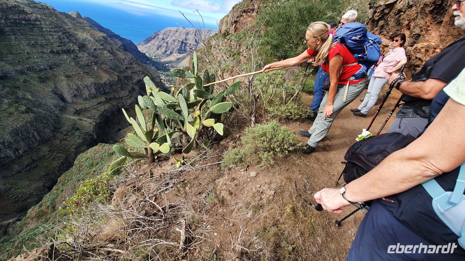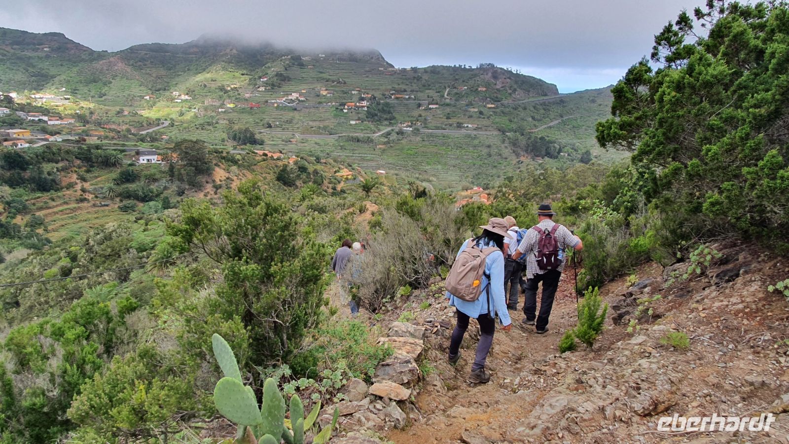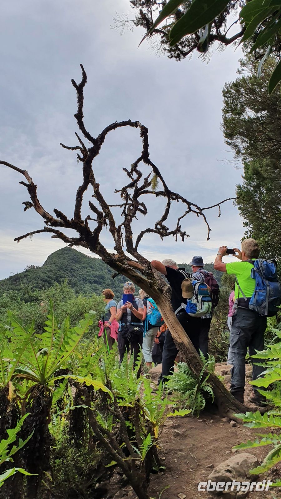 Mit dem Bus fuhren wir dann auf einer aussichtsreichen Strasse hinauf in die Berge und machten sogleich den ersten Fotostopp mit Blick auf San Sebastian und hinüber zum Teide auf Teneriffa. Die über viele Tage herrschende Calima Wetterlage war letzte Nacht mit einem kurzen Regenguss zu Ende gegangen und so hatten wir eine klare Sicht. Nur oben in den Bergen hingen die Wolken noch fest. Wir fuhren über Chipute ins Töpferdorf El Cercado und begannen dort unsere erste Wanderung steil bergab in einen Barranco und auf der anderen Seite wieder steil bergan. Die Vegetation war sehr üppig mit vielen Opuntien und deren Früchten. Ulrike gab eine erste Unterweisung zur Cochenille Schildlaus, die auf den "Blättern" der Opuntien prächtig gedeihen und einst für viele Familien ein sicheres Einkommen brachten, denn aus der Laus wurde der rote Farbstoff gewonnen und verkauft in ganz Europa. Auch zur Gewinnung des Palmensaftes hatte Ulrike Interessantes zu berichten. Durch zwei Ansiedlungen erreichten wir schliesslich den Lorbeerwald, das eigentliche Ziel unserer Wanderung. Der Lorbeerwald ist mehr als 2 Millionen Jahre alt und bedeckte einst große Gebiete Europas. Durch das Fehlen der Eiszeit auf den kanarischen Inseln, konnte er weiter existieren und die kleine Insel La Gomera besitzt heute den noch größten Teil des Lorbeerwaldes, auch Nebelwald oder gar Märchenwald genannt. Die Passatwolken bleiben in größeren Höhen "hängen" und die Pflanzen werden so kontinuierlich mit Wasser aus den Wolken versorgt.