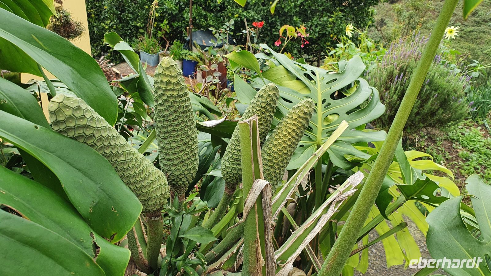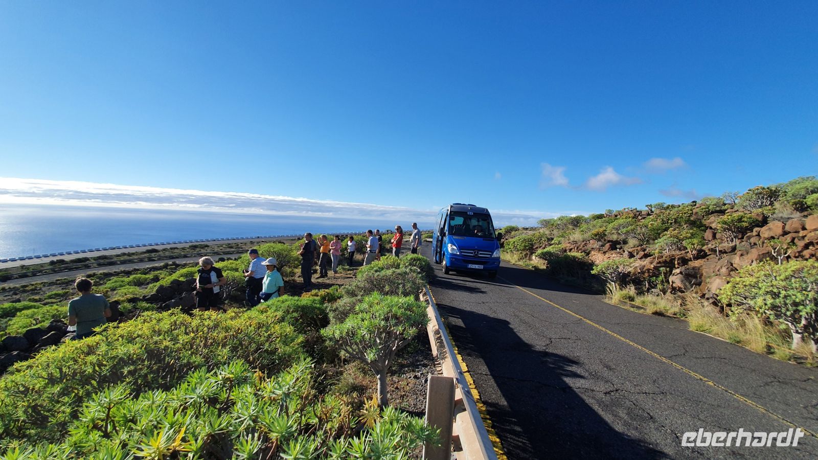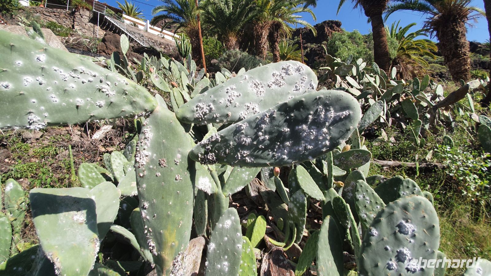 Mit dem Bus fuhren wir dann auf einer aussichtsreichen Strasse hinauf in die Berge und machten sogleich den ersten Fotostopp mit Blick auf San Sebastian und hinüber zum Teide auf Teneriffa. Die über viele Tage herrschende Calima Wetterlage war letzte Nacht mit einem kurzen Regenguss zu Ende gegangen und so hatten wir eine klare Sicht. Nur oben in den Bergen hingen die Wolken noch fest. Wir fuhren über Chipute ins Töpferdorf El Cercado und begannen dort unsere erste Wanderung steil bergab in einen Barranco und auf der anderen Seite wieder steil bergan. Die Vegetation war sehr üppig mit vielen Opuntien und deren Früchten. Ulrike gab eine erste Unterweisung zur Cochenille Schildlaus, die auf den "Blättern" der Opuntien prächtig gedeihen und einst für viele Familien ein sicheres Einkommen brachten, denn aus der Laus wurde der rote Farbstoff gewonnen und verkauft in ganz Europa. Auch zur Gewinnung des Palmensaftes hatte Ulrike Interessantes zu berichten. Durch zwei Ansiedlungen erreichten wir schliesslich den Lorbeerwald, das eigentliche Ziel unserer Wanderung. Der Lorbeerwald ist mehr als 2 Millionen Jahre alt und bedeckte einst große Gebiete Europas. Durch das Fehlen der Eiszeit auf den kanarischen Inseln, konnte er weiter existieren und die kleine Insel La Gomera besitzt heute den noch größten Teil des Lorbeerwaldes, auch Nebelwald oder gar Märchenwald genannt. Die Passatwolken bleiben in größeren Höhen "hängen" und die Pflanzen werden so kontinuierlich mit Wasser aus den Wolken versorgt.