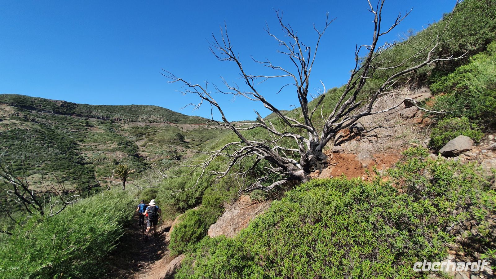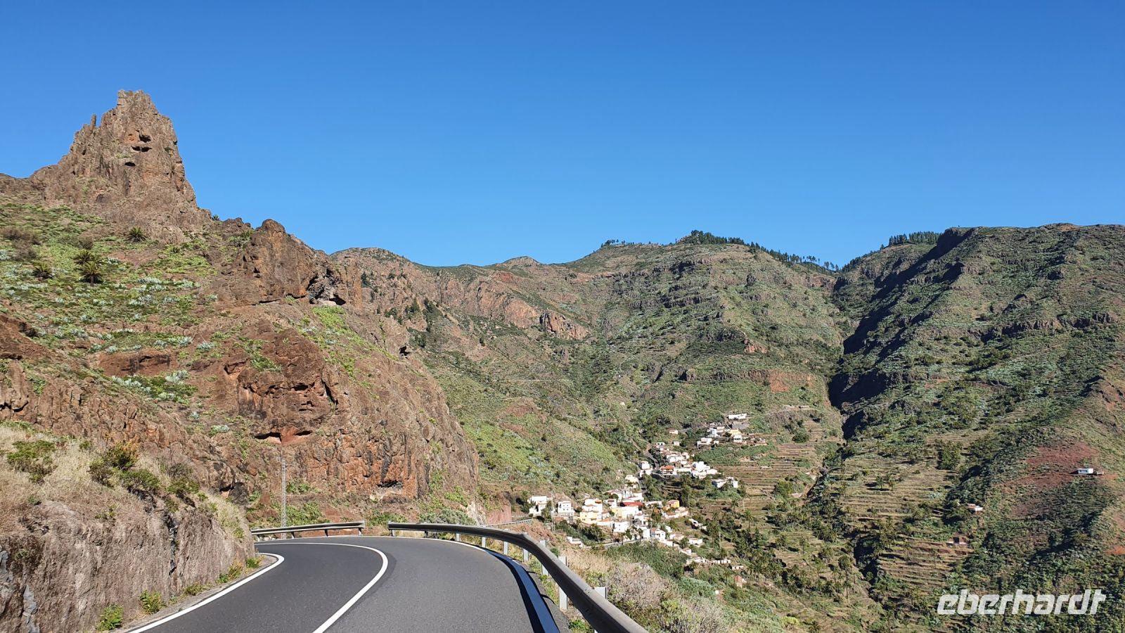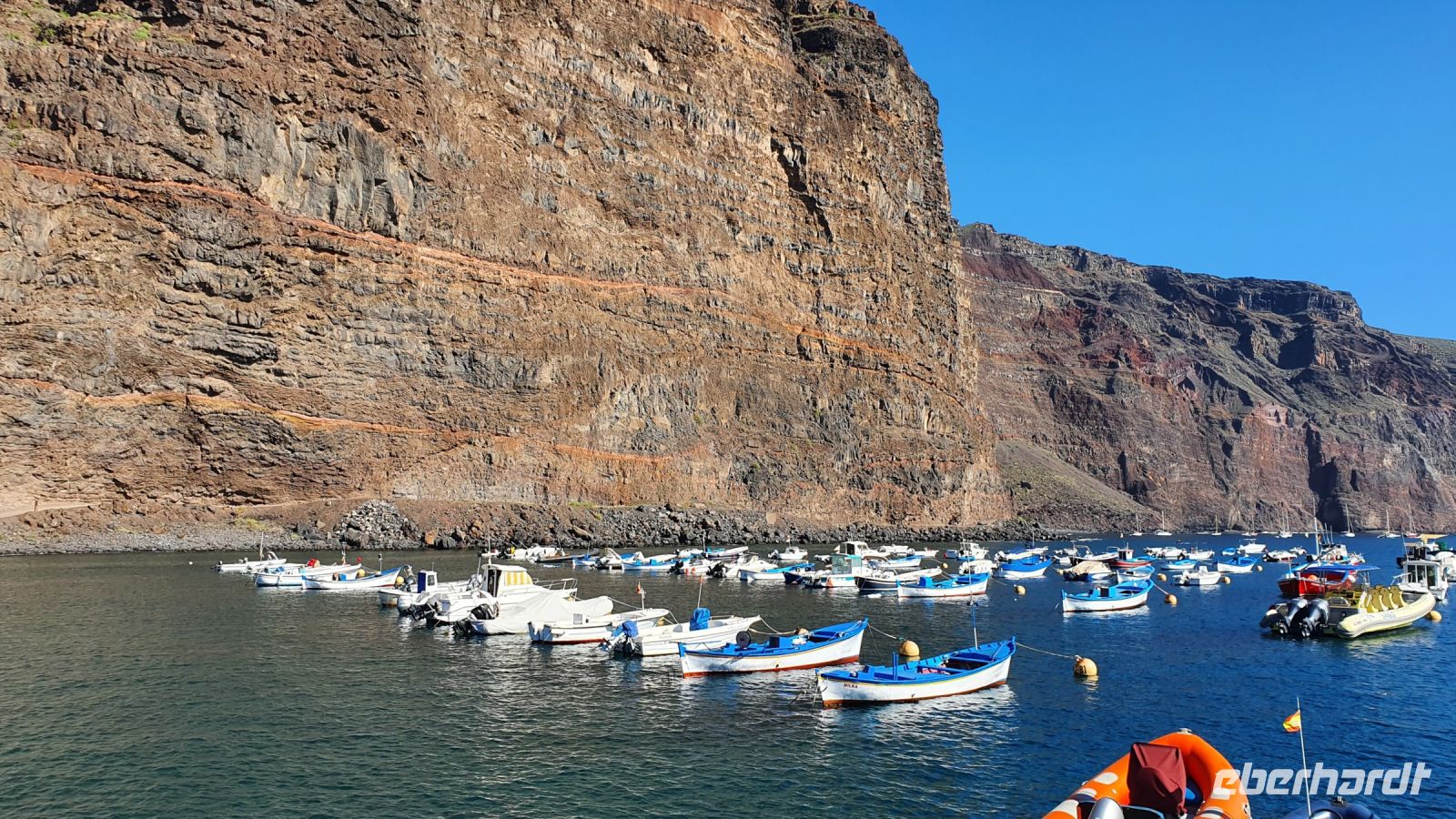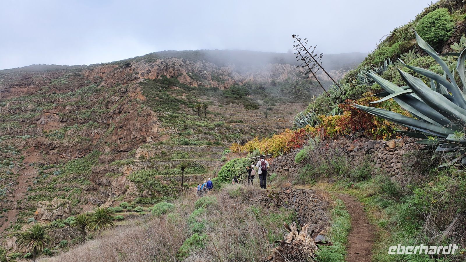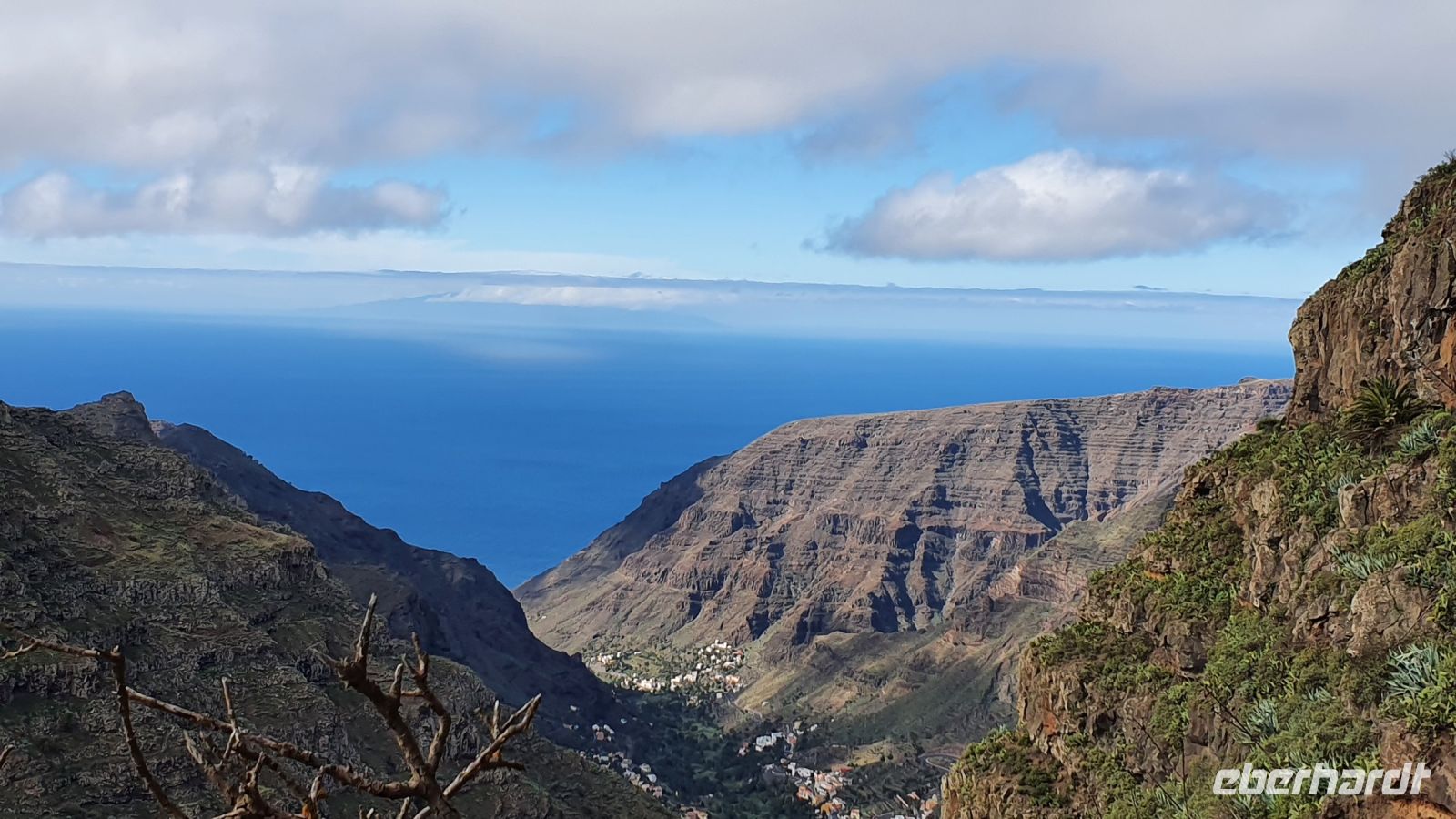 Zu unserem Wanderausgangspunkt in Imada fuhren wir wieder auf der aussichtsreichen Strasse hinauf und bogen dann aber nach Süden ab. Schon die kurvenreiche Strasse dorthin, bot unzählige schöne Ausblicke. Von Imada ging es dann immer bergab im Barranco de Guarimiar. Anfangs war der Weg recht gemütlich und führte durch Terrassenfelder. Später kamen wir zu den steileren Passagen, die durch loses Lavagestein steil bergab führten und unsere ganze Konzentration brauchten. Aber die Aussichten waren einfach grandios. Wir wanderten in der Sonne und freuten uns über jede Unterstellmöglichkeit an der Felswand im Schatten. Bei den Häusern von Guarimiar waren wir schon tief unten im Barranco und gönnten uns eine Mittagsrast im Schatten. Danach gingen wir eine weitere Stunde bergab bis zur Strasse, wo unser Bus stand. Hier gab es die Möglichkeit, die Wanderung zu beenden und mit dem Bus nach Playa de Santiago zu fahren, dort den Hafen anzuschauen und auf einen KAFFEE oder Barraquito einzukehren. Etwa die Hälfe der Gruppe nutzte diese Möglichkeit und die andere Hälfte wanderte steil bergan über 400 Höhenmeter hinauf zur Hauptstrasse, um dort oben dann später in den Bus einzusteigen. Gemeinsam fuhren wir dann hinauf zu einer Bar und liessen den anstrengenden Wandertag bei einem leckeren Getränk ausklingen. Zum Abendessen gingen wir gemeinsam zum Hafen in das Restaurant Los Caprichos.