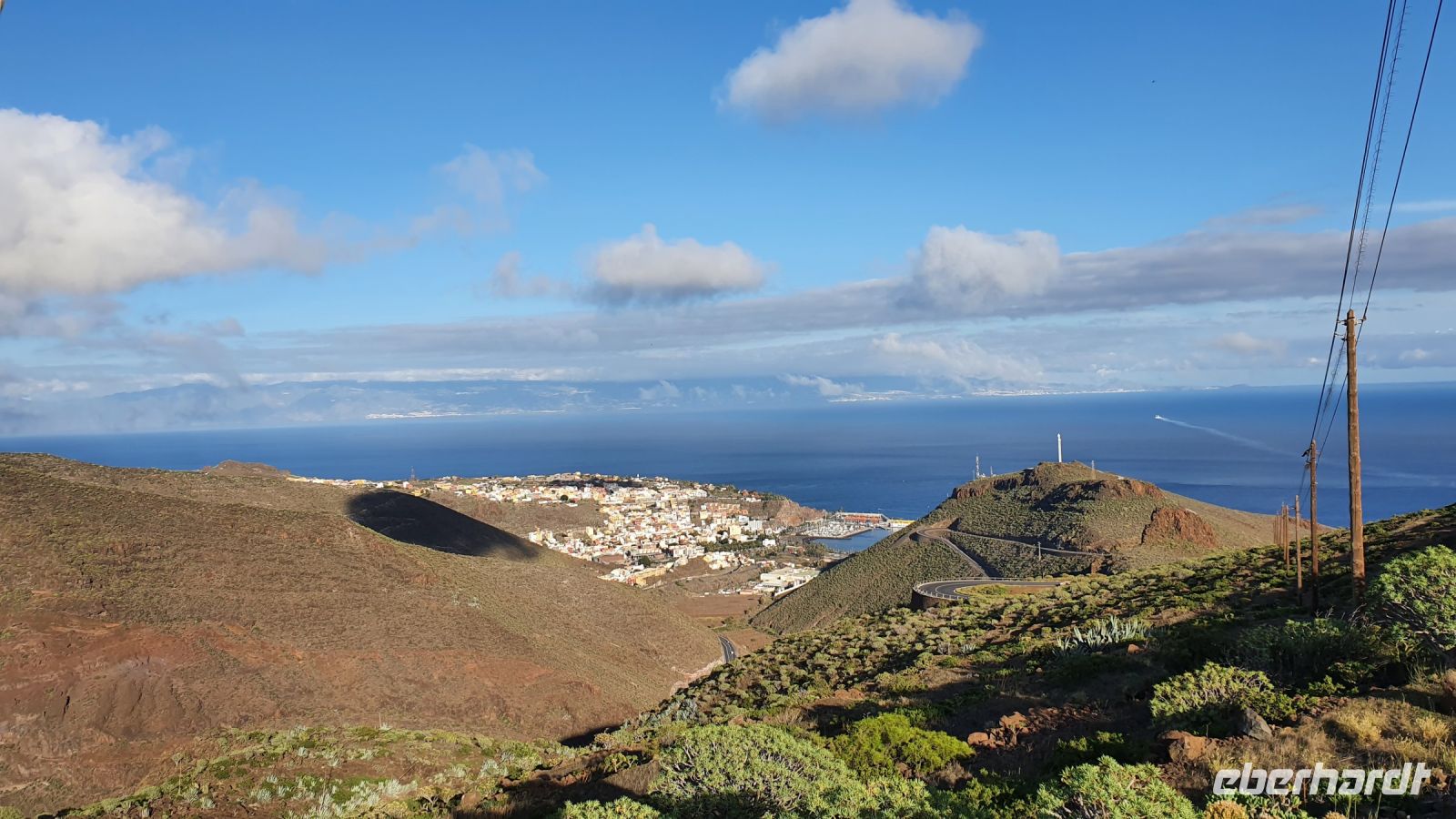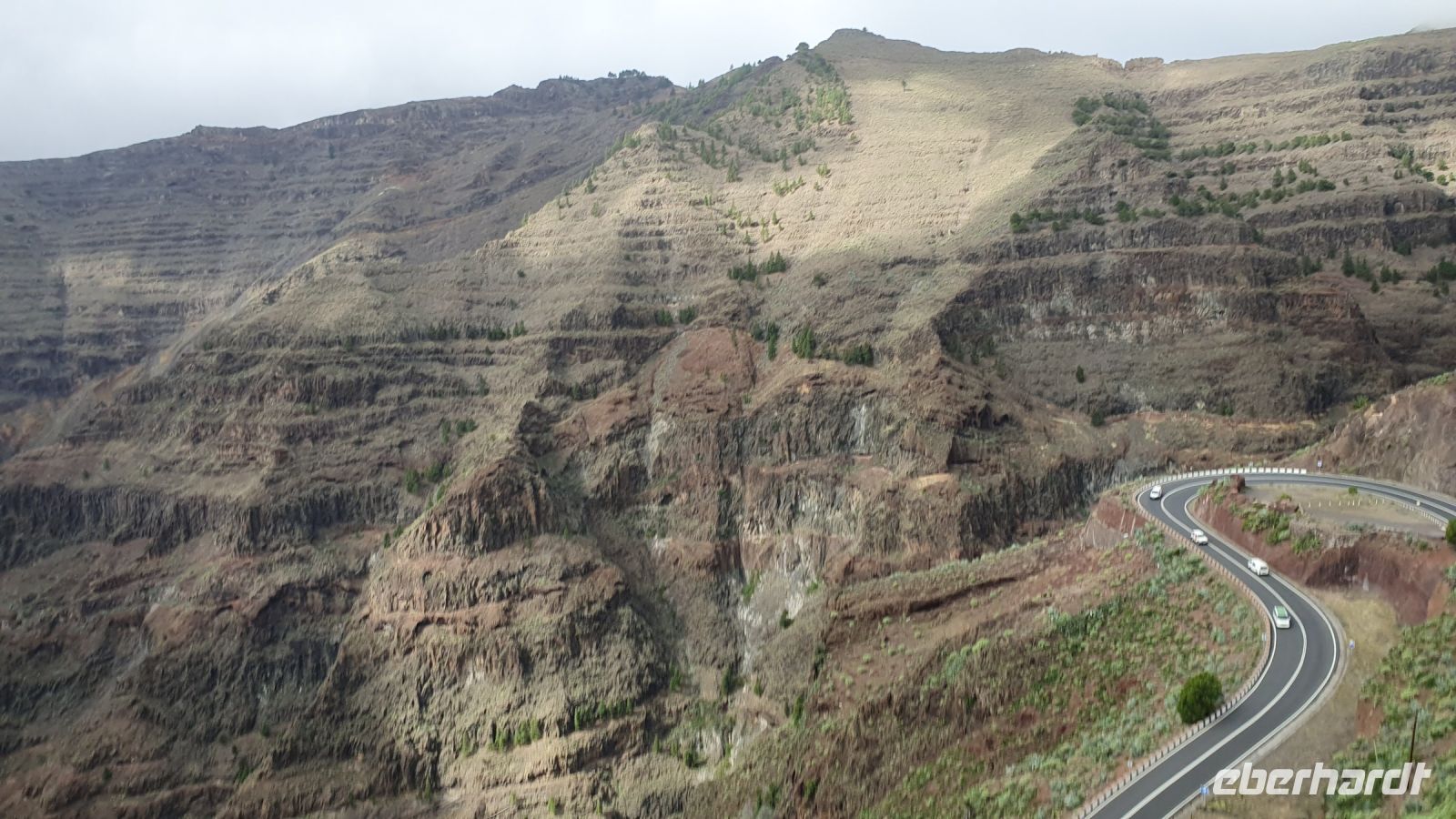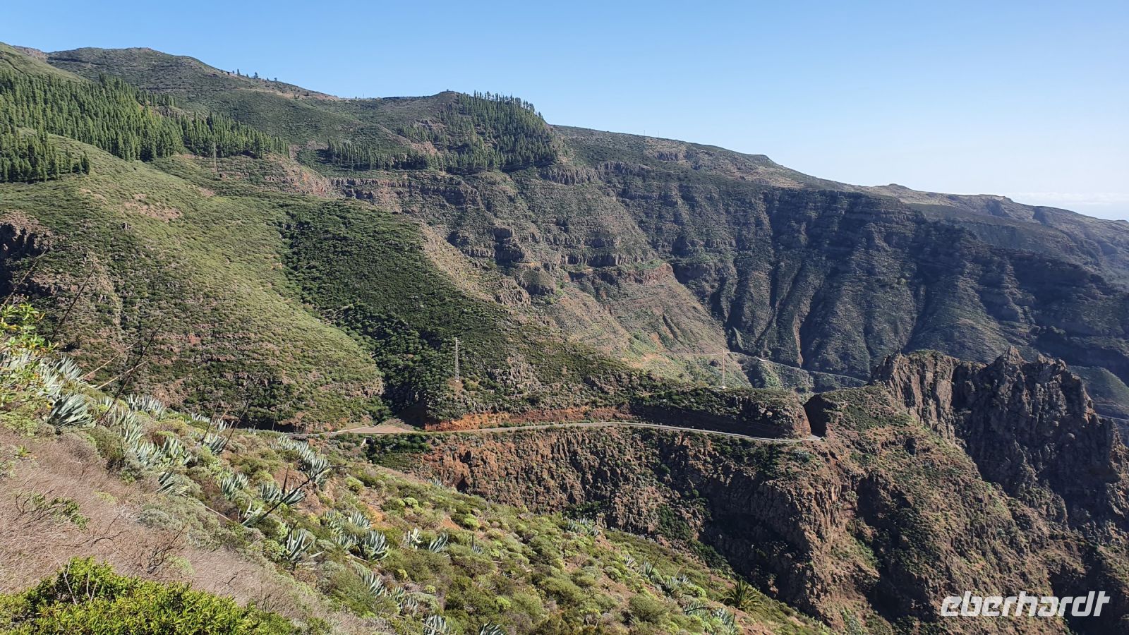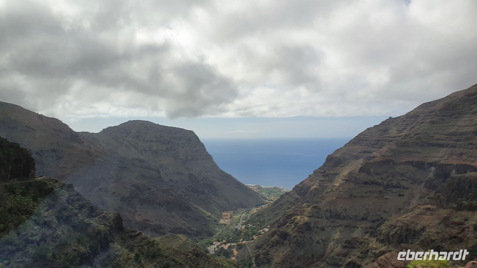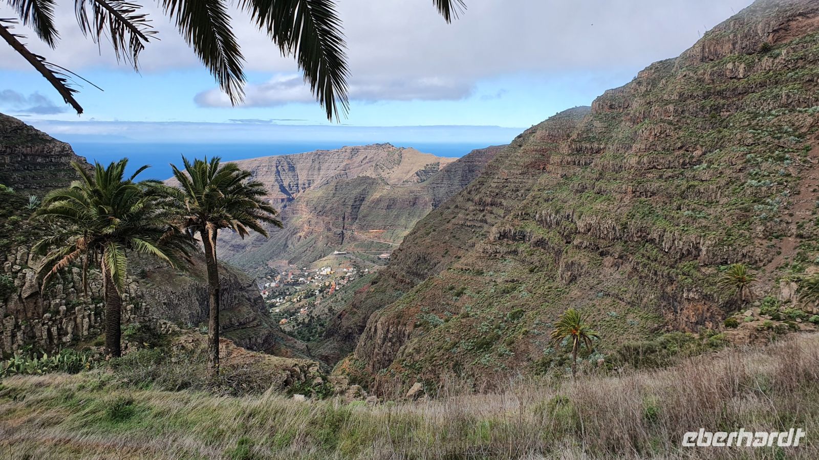 Zu unserem Wanderausgangspunkt in Imada fuhren wir wieder auf der aussichtsreichen Strasse hinauf und bogen dann aber nach Süden ab. Schon die kurvenreiche Strasse dorthin, bot unzählige schöne Ausblicke. Von Imada ging es dann immer bergab im Barranco de Guarimiar. Anfangs war der Weg recht gemütlich und führte durch Terrassenfelder. Später kamen wir zu den steileren Passagen, die durch loses Lavagestein steil bergab führten und unsere ganze Konzentration brauchten. Aber die Aussichten waren einfach grandios. Wir wanderten in der Sonne und freuten uns über jede Unterstellmöglichkeit an der Felswand im Schatten. Bei den Häusern von Guarimiar waren wir schon tief unten im Barranco und gönnten uns eine Mittagsrast im Schatten. Danach gingen wir eine weitere Stunde bergab bis zur Strasse, wo unser Bus stand. Hier gab es die Möglichkeit, die Wanderung zu beenden und mit dem Bus nach Playa de Santiago zu fahren, dort den Hafen anzuschauen und auf einen KAFFEE oder Barraquito einzukehren. Etwa die Hälfe der Gruppe nutzte diese Möglichkeit und die andere Hälfte wanderte steil bergan über 400 Höhenmeter hinauf zur Hauptstrasse, um dort oben dann später in den Bus einzusteigen. Gemeinsam fuhren wir dann hinauf zu einer Bar und liessen den anstrengenden Wandertag bei einem leckeren Getränk ausklingen. Zum Abendessen gingen wir gemeinsam zum Hafen in das Restaurant Los Caprichos.