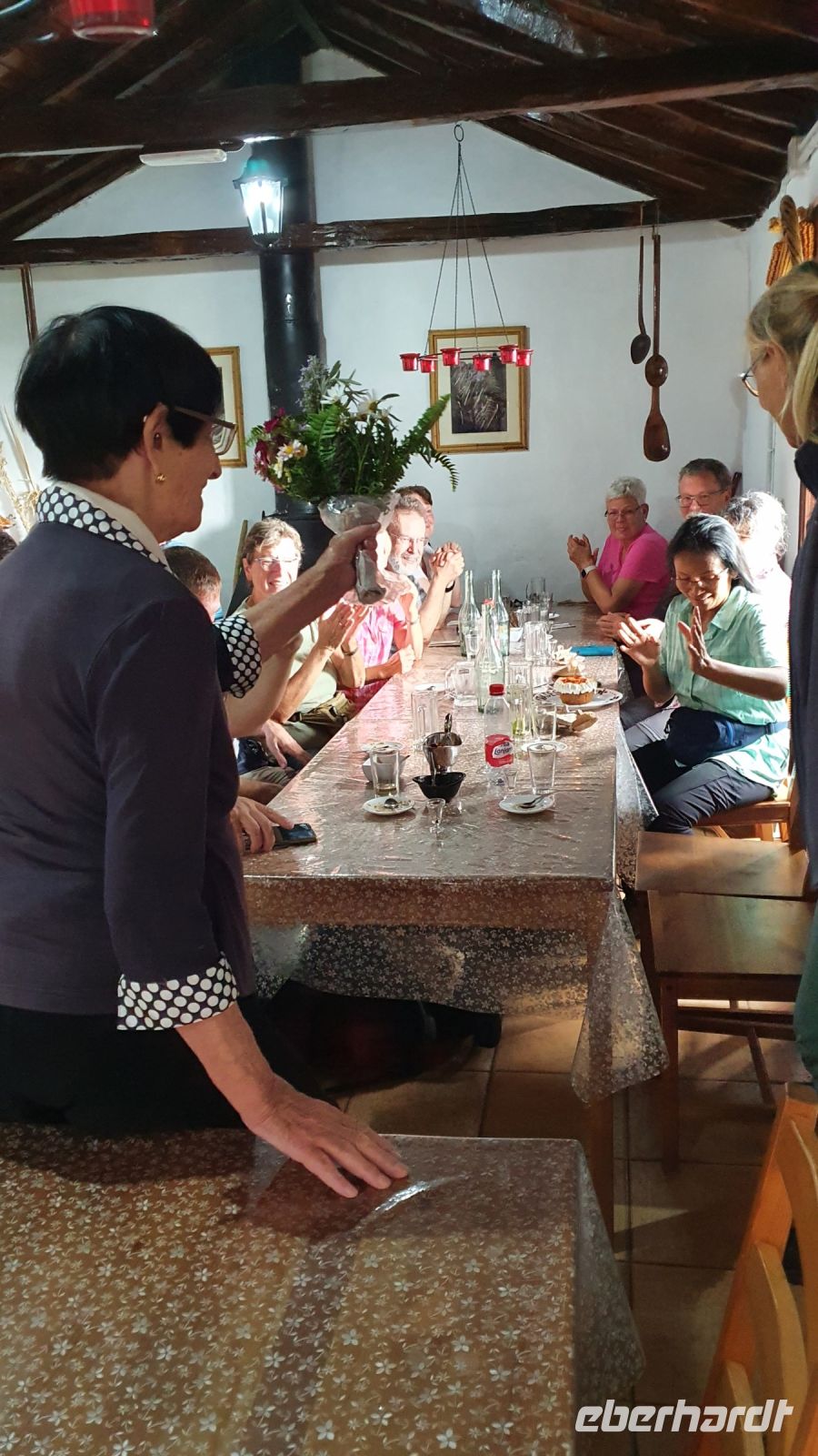 Wir waren fasziniert von den riesigen verschiedenen Lorbeerbäumen, Gagelbäumen, der Baumheide, Erdbeerbäumen usw. Es wurden unzählige Fotos gemacht und nach 10 Kilometern erreichten wir das angesagte Lokal von Efigenia. Dort nahmen wir ein vegetarisches Mittagessen mit Spezialitäten aus der Natur zu uns. Die hochbetagte Gründerin des Lokals kam auch zu unserer Gruppe und gratulierte einer Dame, die ihren Geburtstag feierte, persönlich mit einem Blumenstrauss aus ihrem Garten. Die leckeren Produkte von Efigenia konnten wir dann auch kaufen und so ging unser erster Wandertag mit der Busfahrt zurück nach San Sebastian zu Ende.