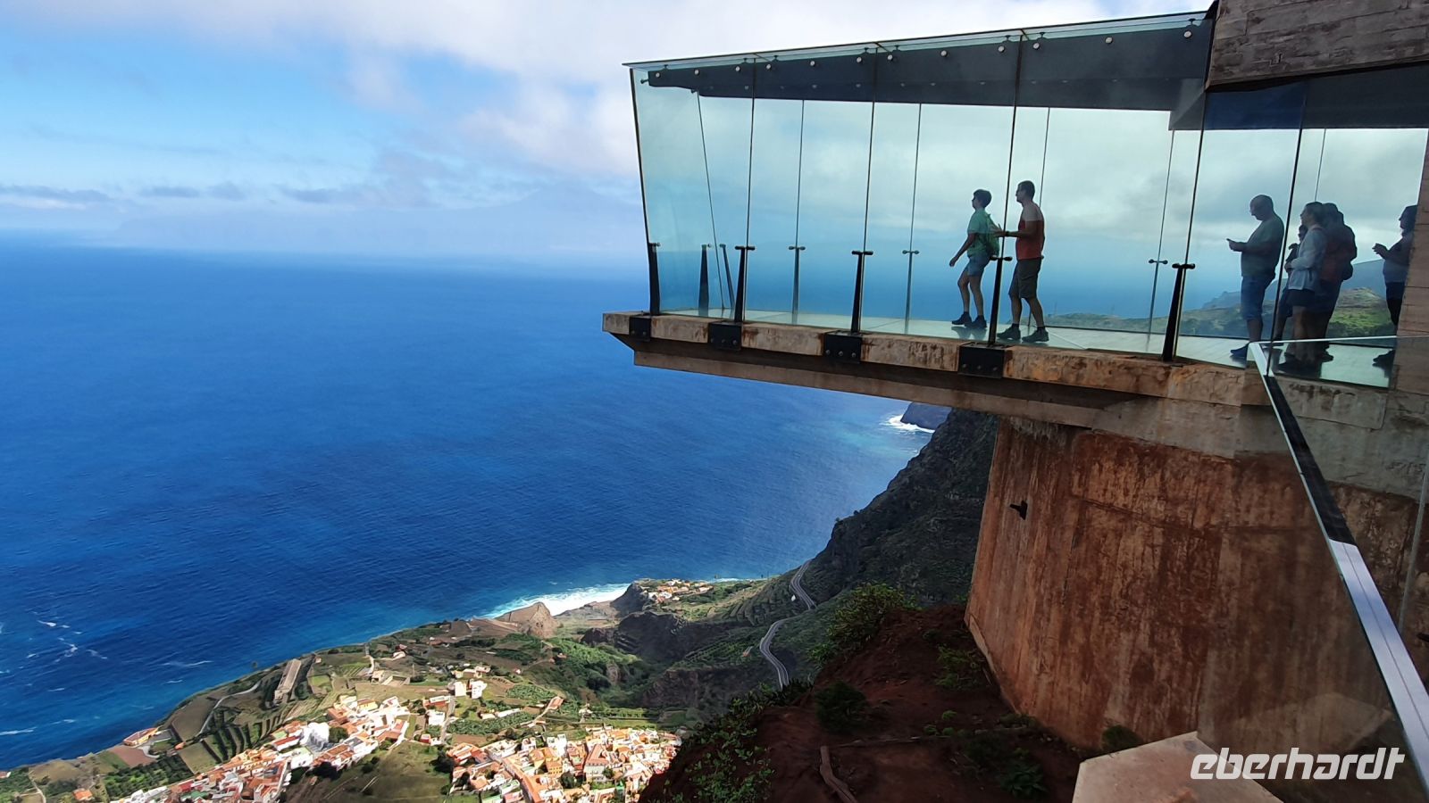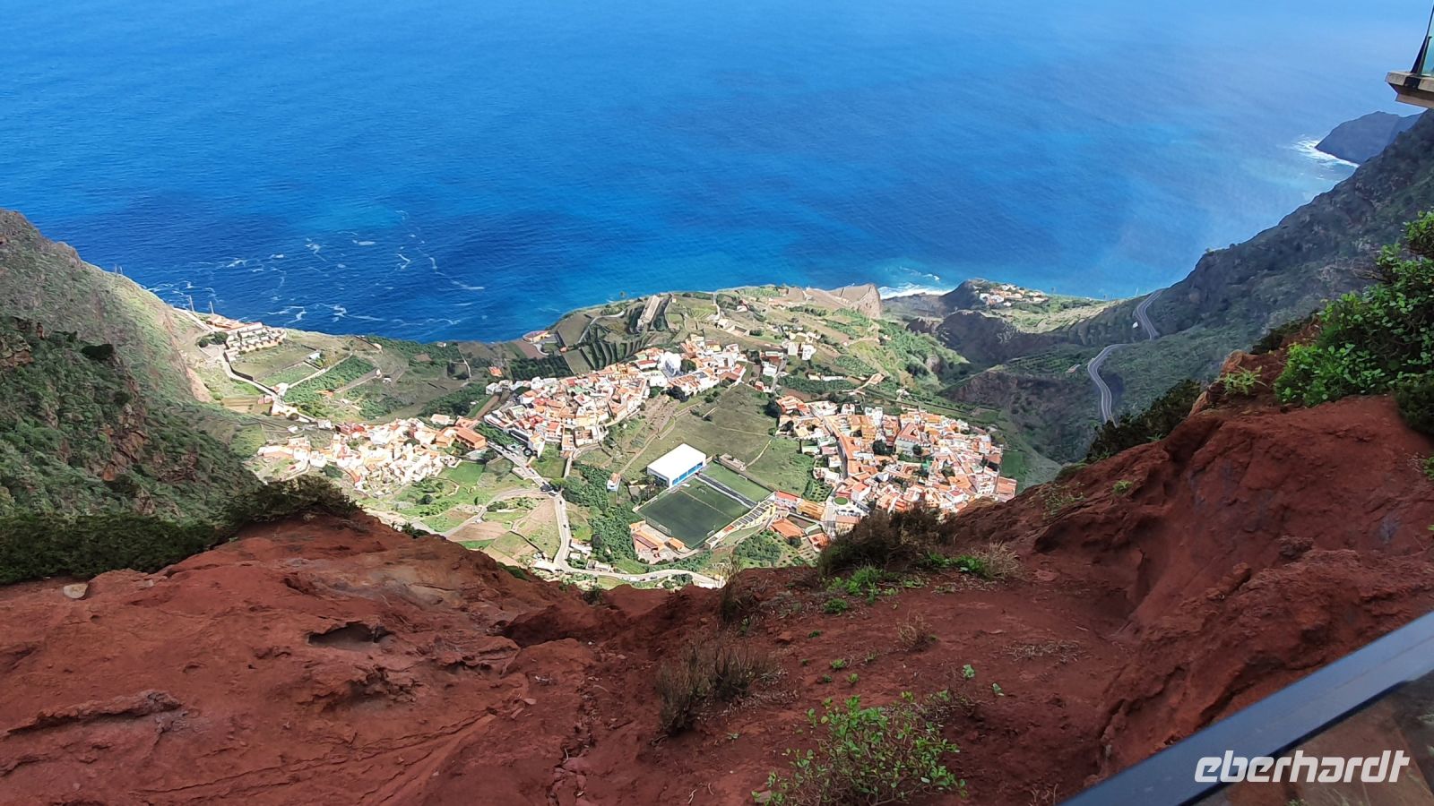 Zunächst fuhren wir mit dem Bus gen Norden durch einen Tunnel, der den Süden vom Norden der Insel trennt. Den ersten Fotostopp gab es hinter Hermigua und den zweiten oberhalb von Agulo. Danach nahm unser Bus eine schmale Strasse hinauf zum Besucher Zentrum. Dort begann und endete auch unsere Wanderung. Zunächst liefen wir steil bergab und bogen dann in einen Wanderweg ein, der zwischen den Terrassenfeldern lang führte. Hier konnten wir viele Kulturpflanzen sehen und hatten tolle Ausblicke in tiefe Schluchten bis hin zum Meer. Dort wo der gesperrte Wanderweg von unten ankam, gingen wir weiter steil bergan bis in die rote Wüste. Dieses Gebiet wurde vor Jahrhunderten abgeholzt und nun hat es die neue Vegetation schwer, hier wieder zu wachsen. Am Abhang mit Blick hinunter nach Agula steht der Mirador de Abrante, einst ein angesagtes Restaurant, welches aber leider während der Corona Pandemie geschlossen wurde. Das Besondere ist aber die Glasplattform ca. 7 m lang, über dem Abgrund mit Blick hinunter nach Agulo. Das war der Höhepunkt unserer Wanderung und dort im Gelände machten wir auch gleich unsere Mittagspause. Durch die rote Wüste wanderten wir wieder nach oben bis zum Informations Zentrum. Zur besten Kaffeezeit gab es für jeden einen Gofiokeks und im Informations Zentrum eine interessante Ausstellung anzuschauen. Zum Abendessen trafen wir uns in einem kleinen Lokal mit Namen Donde Marco´s und da gab es wunderbar zubereiteten frischen Fisch.