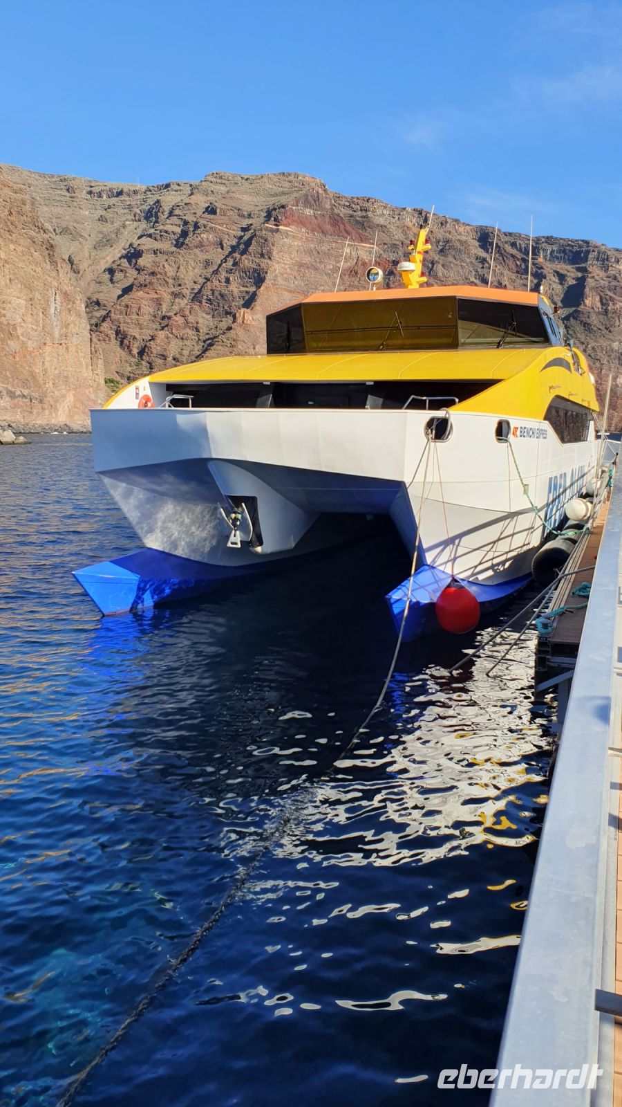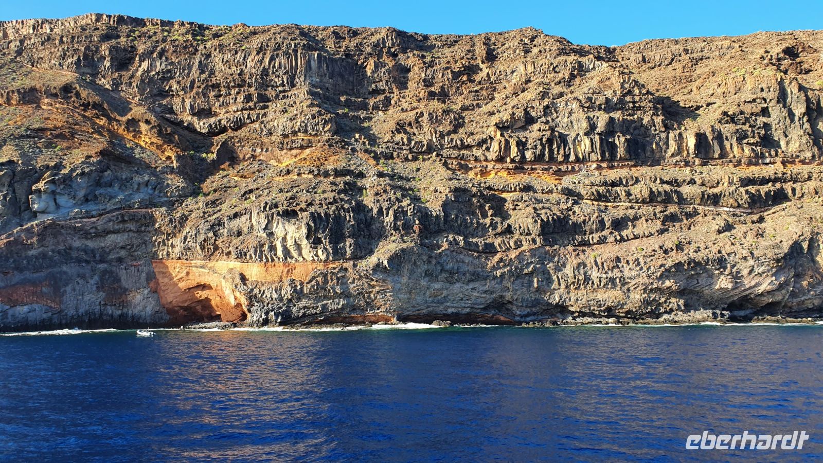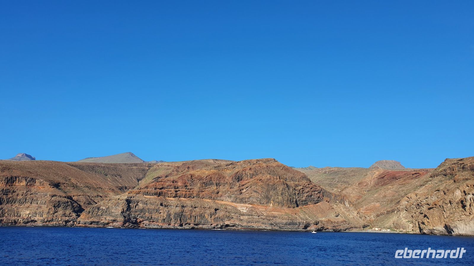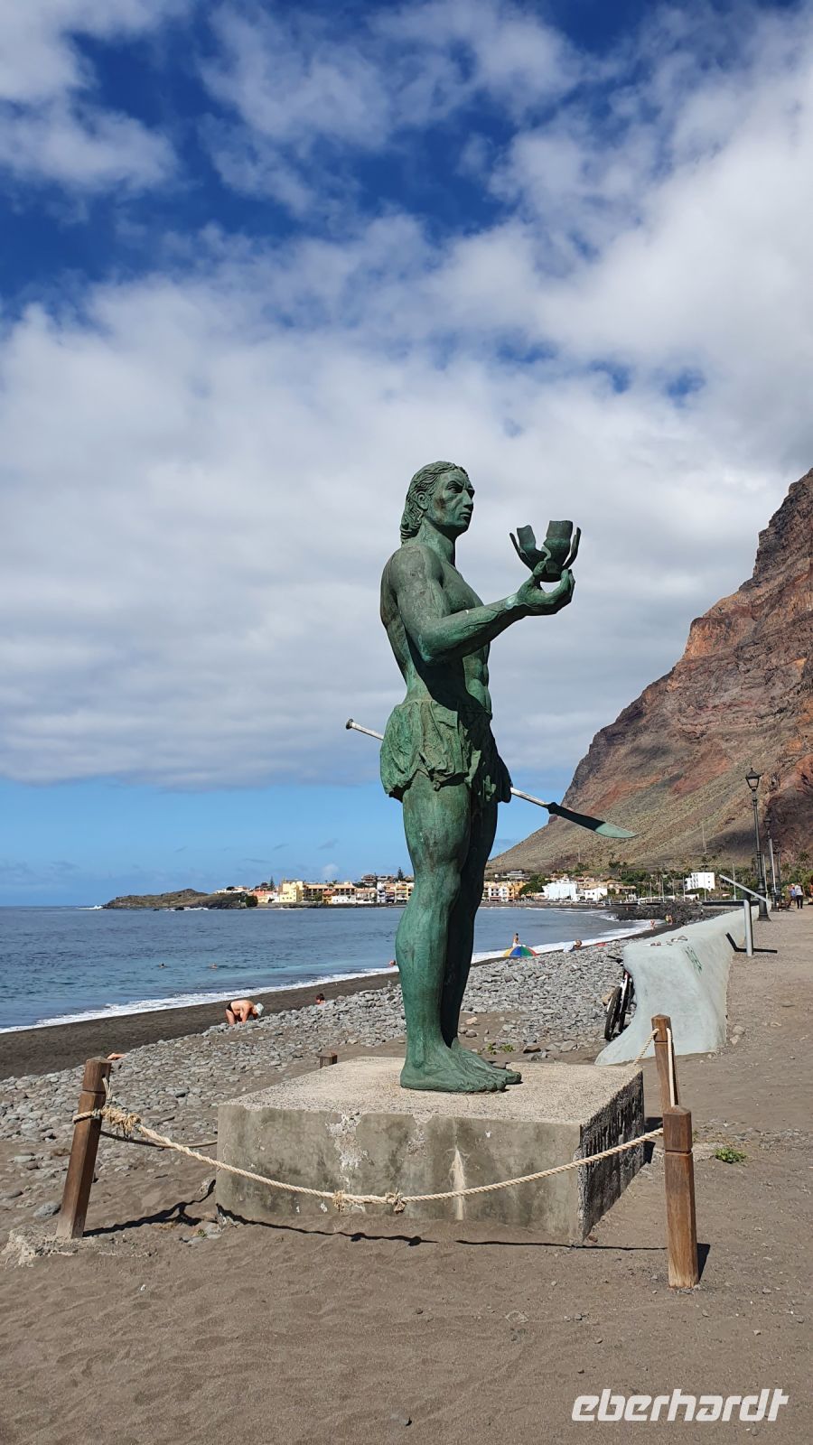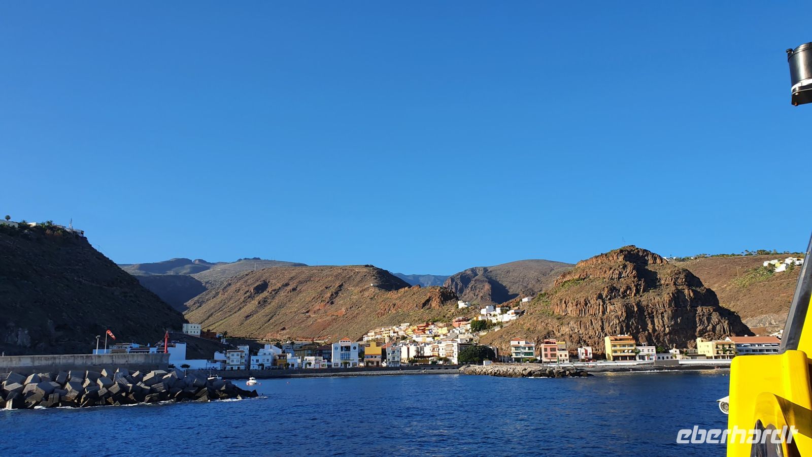 Der heutige Tag war frei und es wurde empfohlen, an einer Walbeobachtungsfahrt teilzunehmen. Unsere Gruppe aber hatte andere Pläne. Wir fuhren mit dem Linienbus einmal quer über die Insel nach Valle Gran Rey, dort wo in den 70er Jahren die Hippies zu Hause waren. Valle Gran Rey liegt an der Südwest Küste Gomeras und hat einige Badebuchten, so mit der Playa del Ingles auch eine FKK Badebucht. Wir wanderten von Strand zu Strand immer an der Küste entlang bis eben zum FKK Strand ganz an Ende der Bucht. Einige nahmen ein Bad in der "Baby"Bucht, völlig ungefährlich und unbehelligt von den stürmischen Wellen. Am Nachmittag fuhren wir mit der Benchi Express Fähre wieder zurück nach San Sebastian. Wir konnten geschützt draußen sitzen und die herrliche Südküste Gomeras im Vorbeifahren genießen. Das war ein wunderschöner Tag und wir hatten noch eine unbekannte Ecke der Insel kennen gelernt. Zum Abendessen trafen wir uns wieder im 4 Caminos und auch Ulrike war mit dabei.