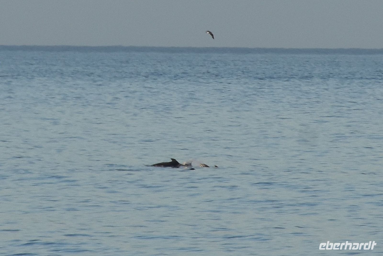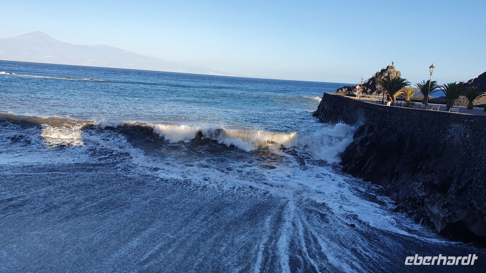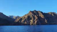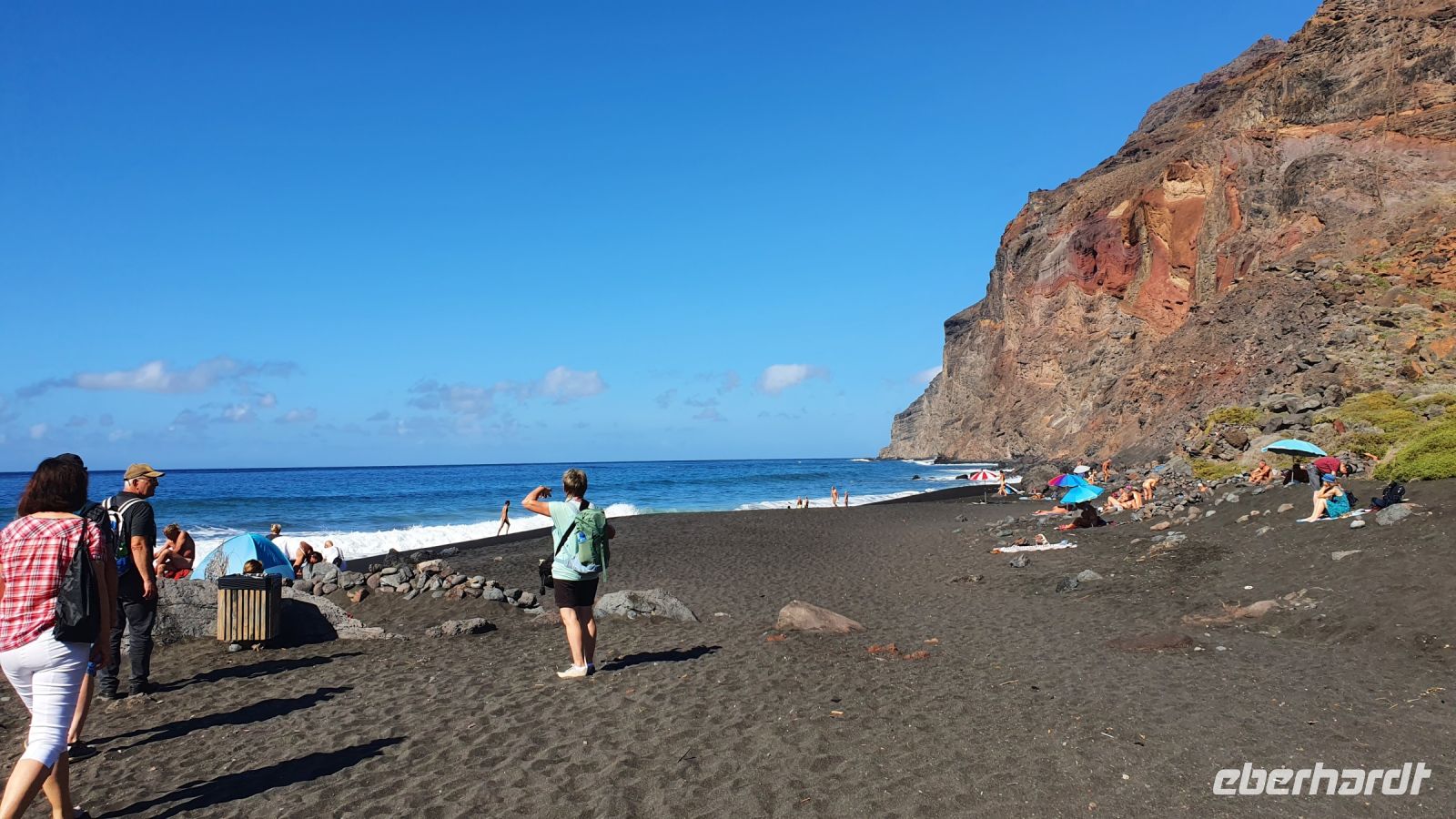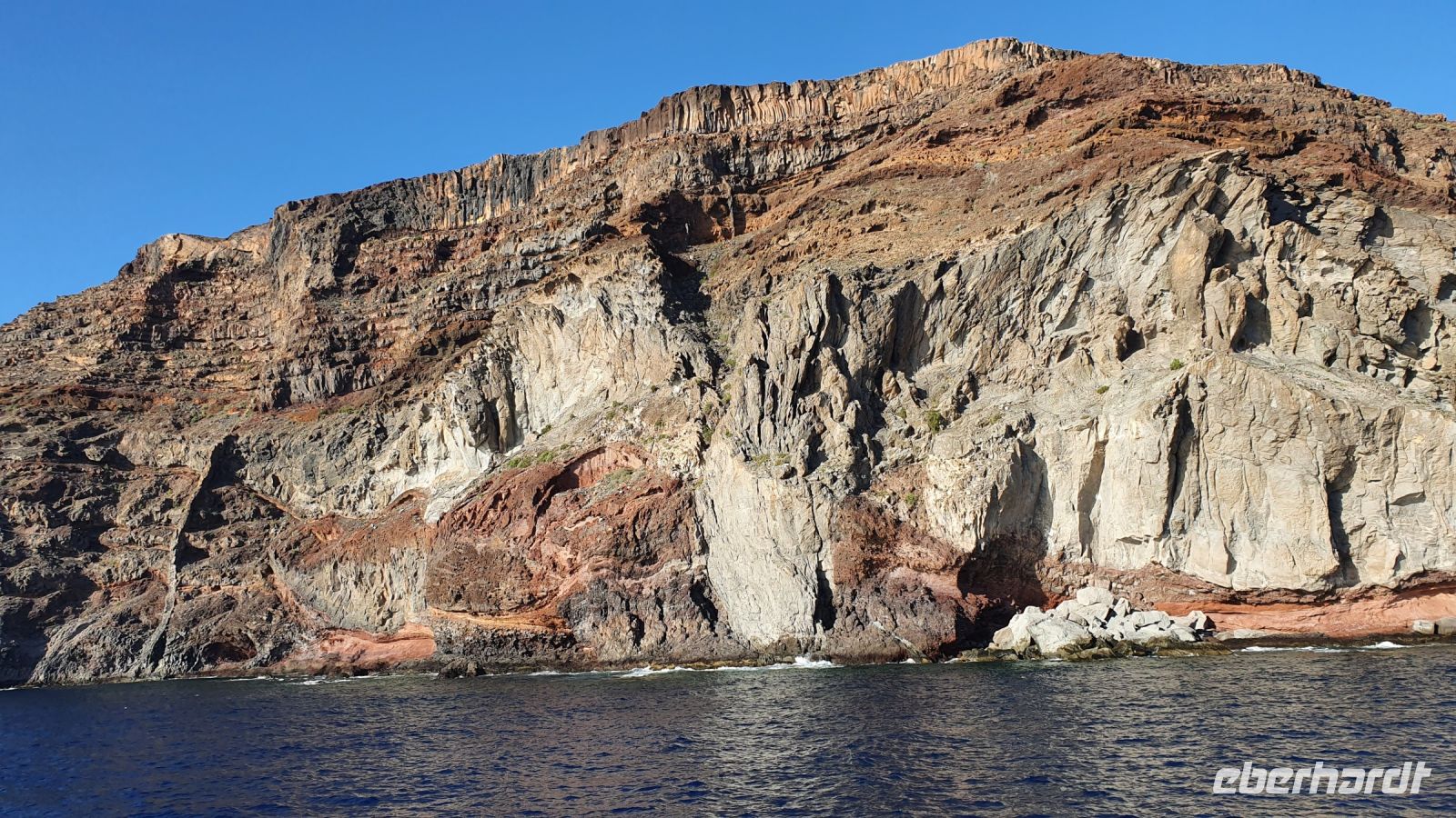 Der heutige Tag war frei und es wurde empfohlen, an einer Walbeobachtungsfahrt teilzunehmen. Unsere Gruppe aber hatte andere Pläne. Wir fuhren mit dem Linienbus einmal quer über die Insel nach Valle Gran Rey, dort wo in den 70er Jahren die Hippies zu Hause waren. Valle Gran Rey liegt an der Südwest Küste Gomeras und hat einige Badebuchten, so mit der Playa del Ingles auch eine FKK Badebucht. Wir wanderten von Strand zu Strand immer an der Küste entlang bis eben zum FKK Strand ganz an Ende der Bucht. Einige nahmen ein Bad in der "Baby"Bucht, völlig ungefährlich und unbehelligt von den stürmischen Wellen. Am Nachmittag fuhren wir mit der Benchi Express Fähre wieder zurück nach San Sebastian. Wir konnten geschützt draußen sitzen und die herrliche Südküste Gomeras im Vorbeifahren genießen. Das war ein wunderschöner Tag und wir hatten noch eine unbekannte Ecke der Insel kennen gelernt. Zum Abendessen trafen wir uns wieder im 4 Caminos und auch Ulrike war mit dabei.