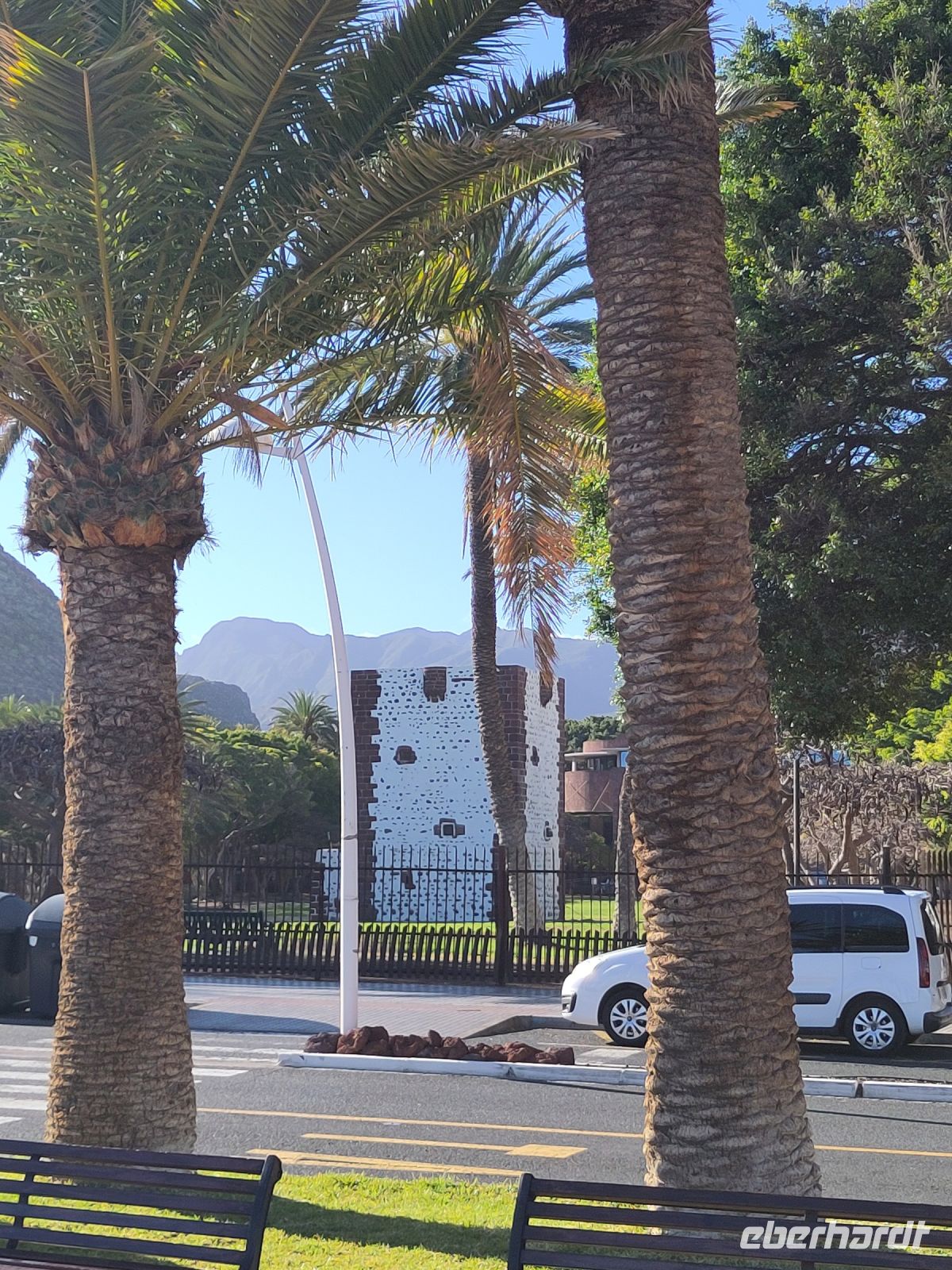 Nach einem kurzen, aber heftigen Nieselregen (Nieselregen und heftig klingt wie ein Widerspruch in sich, man muss es erlebt haben), scheint den Rest des Tages die Sonne und es rührt sich kaum ein Lüftchen, aber Wanderwege und selbst der Stadtpark bleiben geschlossen. Wir steigen in die obere Etage von San Sebastián und gehen am Parador und am Leuchtturm vorbei. Auf dem Rückweg in die Stadt begegnen wir ein paar Schülern, die uns den Silbo noch einmal stolz vorführen.