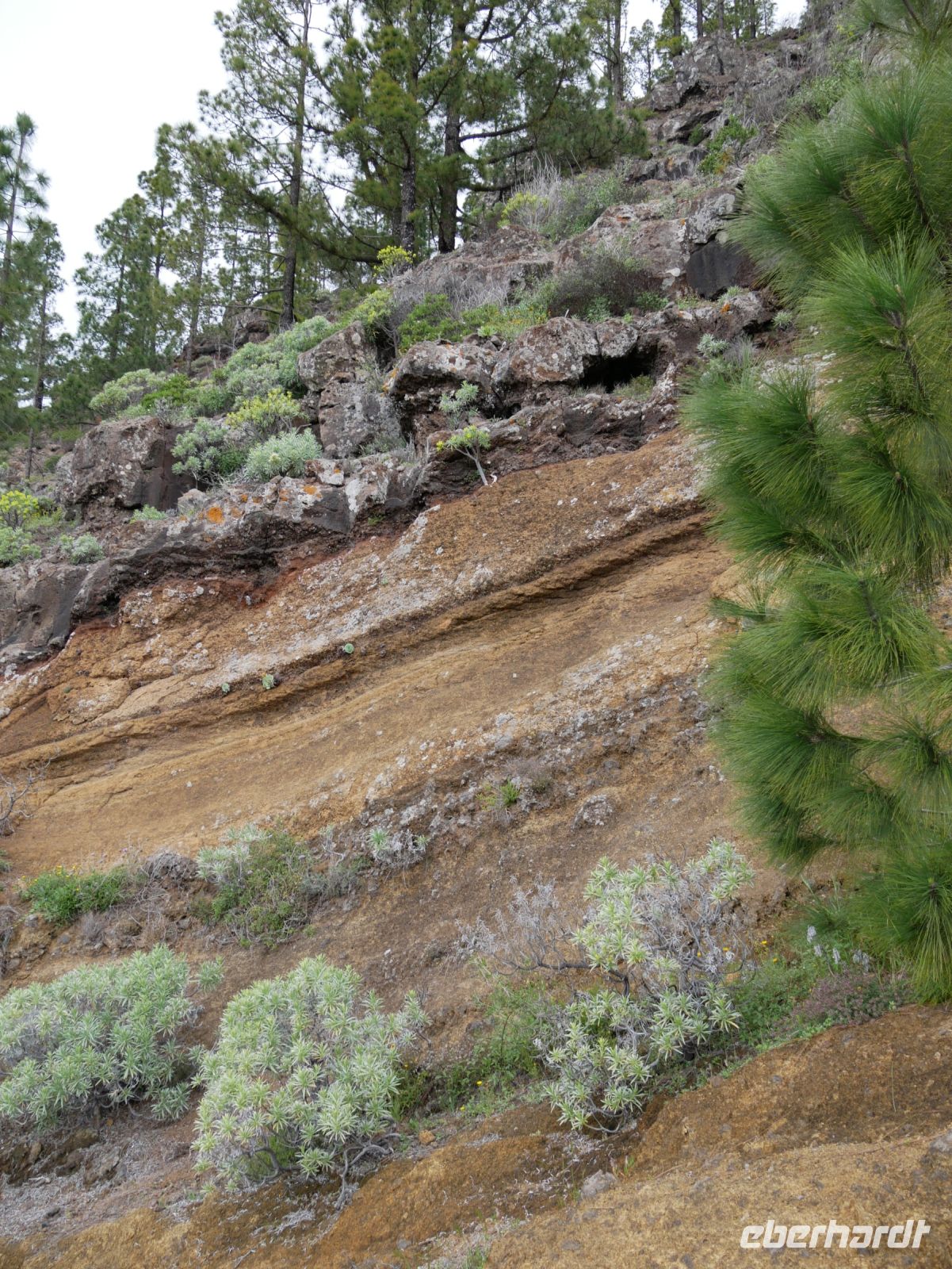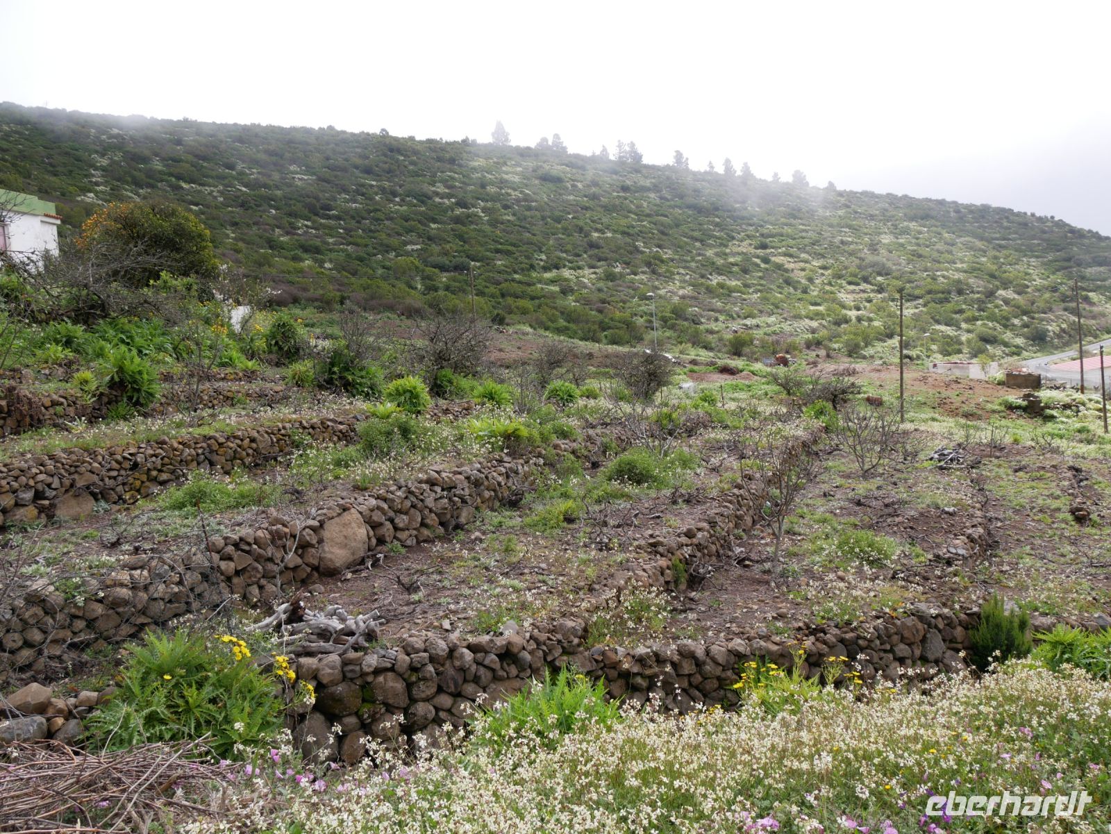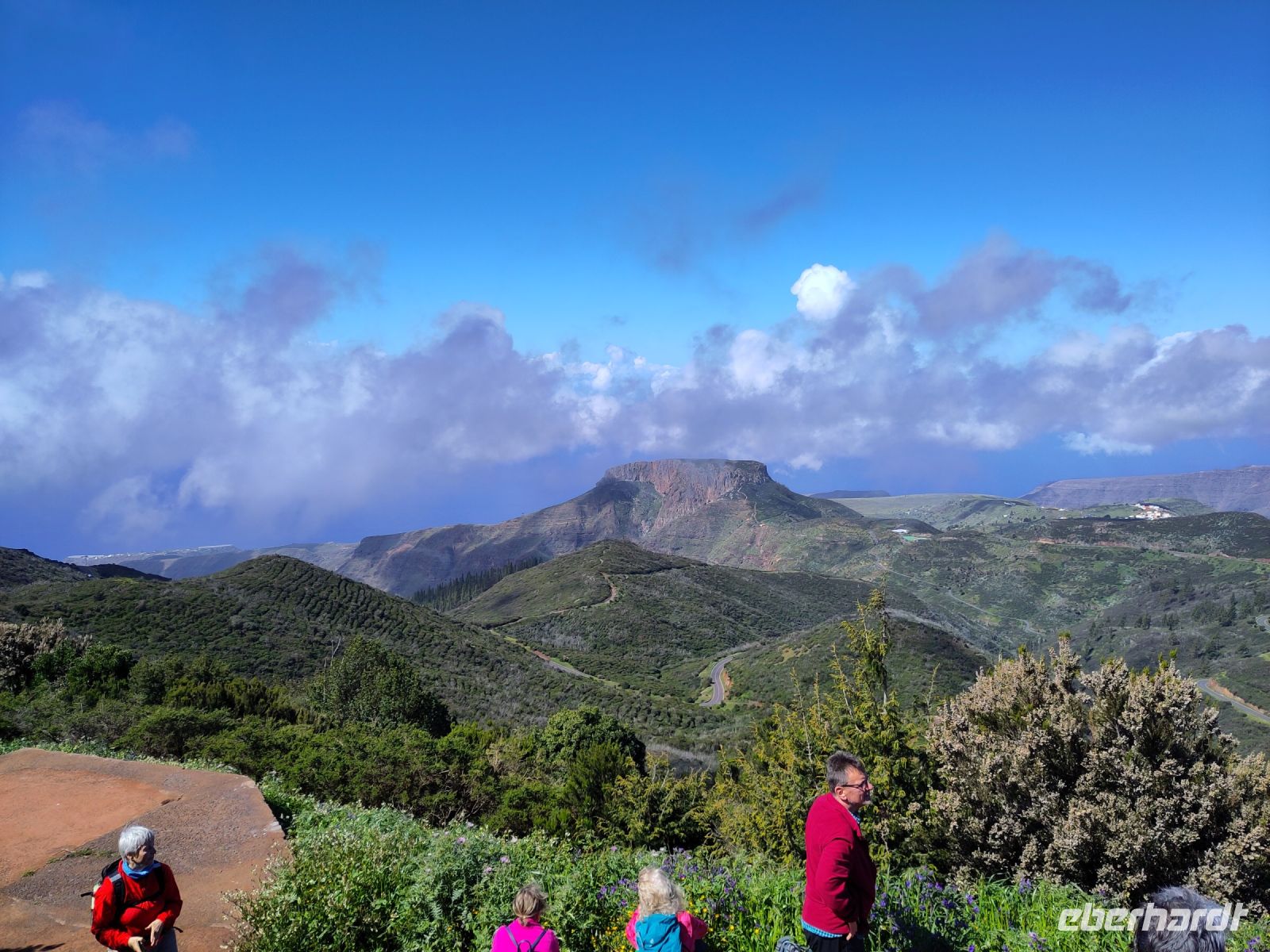 Zunächst geht es ins Tal von Hermigua, eines der fruchtbarsten Täler von La Gomera, wo eine gewisse Regensicherheit besteht und die Leute ihre Feldfrüchte anbauen können. Man sieht zwar auch noch Bananenplantagen, aber früher war das Tal von Hermigua das Zentrum des Bananenanbaus auf La Gomera, Ulli zeigt uns vom Mirador aus auch den Anleger, mit dem Becken, in dem früher die Bananen gewaschen wurden (heute ein meerwassergespeistes Schwimmbad, in dem man nur baden solle, wenn auch die Gomeros darin badeten, denn wenn man Pech habe, trage einen eine Welle von hier ins Meer hinaus). Dann geht es weiter durch Agulo und mit Richtung wieder ins Inselinnere bis nach Rosas (Rosen). Früher hieß Rosas Rozas (Rodungen). In Rosas laufen wir los, vorbei an Kapuzinerkresse und Sauerklee und auch noch einigen Eukalyptusbäumen, sowie den Überresten von Baumheiden. dann laufen wir die Flanke des Berges entlang, den wir schließlich nach einigen Wendungen erklimmen. Jetzt geht es durch eine rote Halbwüste, den eigentlichen Rodungen. Man hat hier im 19. und 20. Jhdt. ziemlich schonungslos abgeholzt, sich aber nicht darum gekümmert, was aus dem Gelände würde. Es erodiert und es entstanden Badlands. Seit einigen Jahrzehnten versucht man diesem Prozess Einhalt zu gebieten und hat angfangen, kanarische Kiefern und anderes Grün anzupflanzen. Leider hat dies anfänglich wenig Erfolg gehabt, wir sehen viele verkrüppelte und eingegangene Kiefern, aber in den Erosionsrinnen enzwickelt sich allmählich das Grün, was Grund zur Hoffnung gibt (da kann man in der ockerroten Umgebung den Spruch "grün ist die Hoffnung" sehr anschaulich sehen). An der Abbruchkannte, die einige hundert Meter über Agudo liegt, hat man einen "Skywalk" gebaut, da wir aber am falschen Wochentag hier sind (der Skywalk bzw. das zugehörige Restaurang ist derzeit nicht vermietet und daher der Skywalk nicht täglich geöffnet), bedingt durch die wetterbedingten Umplanungen, müssen wir das Panorama eben ein paar Meter links vom Skywalk genießen. Es tut dem Panorama an sich keinen Abbruch, nur können wir eben nicht 400 Meter über dem Ort Agudo über eine über dem Boden "schwebende" Glasplatte laufen. Dafür aber zaubere ich einen Kuchen aus meinem Rucksack und Ulli ein Messer hervor und wir verteilen einen safgtigen Kuchen, den Efigenias Großneffe Geo mir gestern zum Abschied noch unter den Arm gedrückt hat. Eine etwas krümelige Angelegenheit, aber der Kuchen ist lecker!