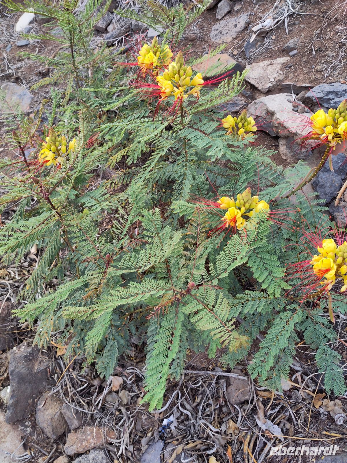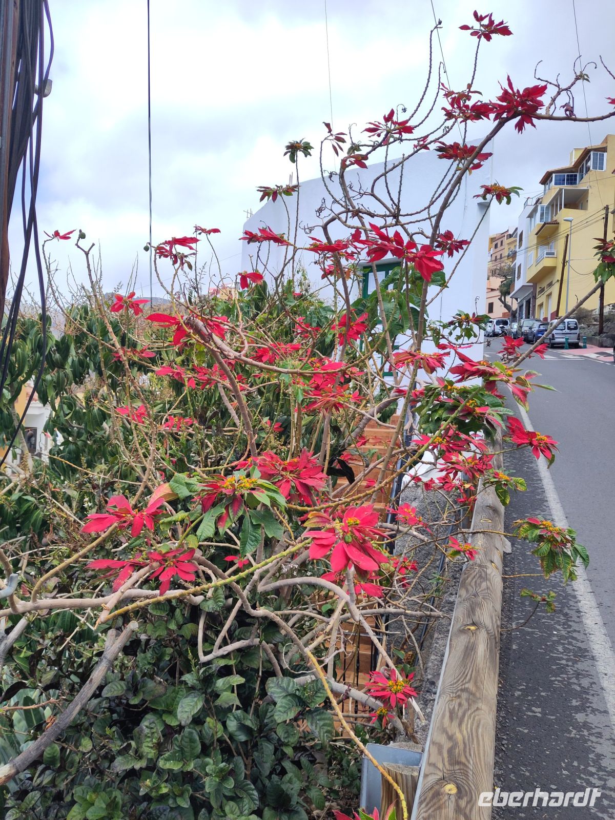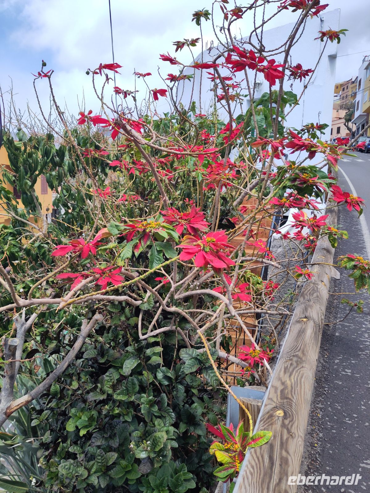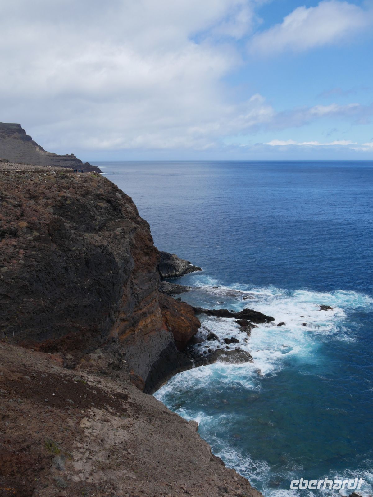 Zunächst geht es ins Tal von Hermigua, eines der fruchtbarsten Täler von La Gomera, wo eine gewisse Regensicherheit besteht und die Leute ihre Feldfrüchte anbauen können. Man sieht zwar auch noch Bananenplantagen, aber früher war das Tal von Hermigua das Zentrum des Bananenanbaus auf La Gomera, Ulli zeigt uns vom Mirador aus auch den Anleger, mit dem Becken, in dem früher die Bananen gewaschen wurden (heute ein meerwassergespeistes Schwimmbad, in dem man nur baden solle, wenn auch die Gomeros darin badeten, denn wenn man Pech habe, trage einen eine Welle von hier ins Meer hinaus). Dann geht es weiter durch Agulo und mit Richtung wieder ins Inselinnere bis nach Rosas (Rosen). Früher hieß Rosas Rozas (Rodungen). In Rosas laufen wir los, vorbei an Kapuzinerkresse und Sauerklee und auch noch einigen Eukalyptusbäumen, sowie den Überresten von Baumheiden. dann laufen wir die Flanke des Berges entlang, den wir schließlich nach einigen Wendungen erklimmen. Jetzt geht es durch eine rote Halbwüste, den eigentlichen Rodungen. Man hat hier im 19. und 20. Jhdt. ziemlich schonungslos abgeholzt, sich aber nicht darum gekümmert, was aus dem Gelände würde. Es erodiert und es entstanden Badlands. Seit einigen Jahrzehnten versucht man diesem Prozess Einhalt zu gebieten und hat angfangen, kanarische Kiefern und anderes Grün anzupflanzen. Leider hat dies anfänglich wenig Erfolg gehabt, wir sehen viele verkrüppelte und eingegangene Kiefern, aber in den Erosionsrinnen enzwickelt sich allmählich das Grün, was Grund zur Hoffnung gibt (da kann man in der ockerroten Umgebung den Spruch "grün ist die Hoffnung" sehr anschaulich sehen). An der Abbruchkannte, die einige hundert Meter über Agudo liegt, hat man einen "Skywalk" gebaut, da wir aber am falschen Wochentag hier sind (der Skywalk bzw. das zugehörige Restaurang ist derzeit nicht vermietet und daher der Skywalk nicht täglich geöffnet), bedingt durch die wetterbedingten Umplanungen, müssen wir das Panorama eben ein paar Meter links vom Skywalk genießen. Es tut dem Panorama an sich keinen Abbruch, nur können wir eben nicht 400 Meter über dem Ort Agudo über eine über dem Boden "schwebende" Glasplatte laufen. Dafür aber zaubere ich einen Kuchen aus meinem Rucksack und Ulli ein Messer hervor und wir verteilen einen safgtigen Kuchen, den Efigenias Großneffe Geo mir gestern zum Abschied noch unter den Arm gedrückt hat. Eine etwas krümelige Angelegenheit, aber der Kuchen ist lecker!