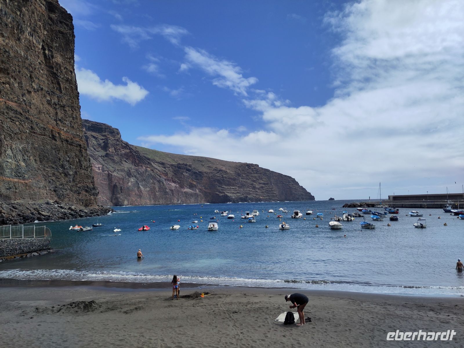 Fernán fährt uns runter nach Playa Santiago, wo das Schlitzohr behauptet, er könne uns nicht bis in den Ort fahren und uns oberhalb des Ortes aussteigen lässt. So müssen wir noch etwa einen halben Kilometer laufen, bis wir endlich den Strand erreichen, dort treffen wir Antje, Uschi und Burkhardt, die schon auf uns warten. Fernán fährt nun hoch nach Alajeró um die andere Hälfte der Gruppe dort abzuholen.