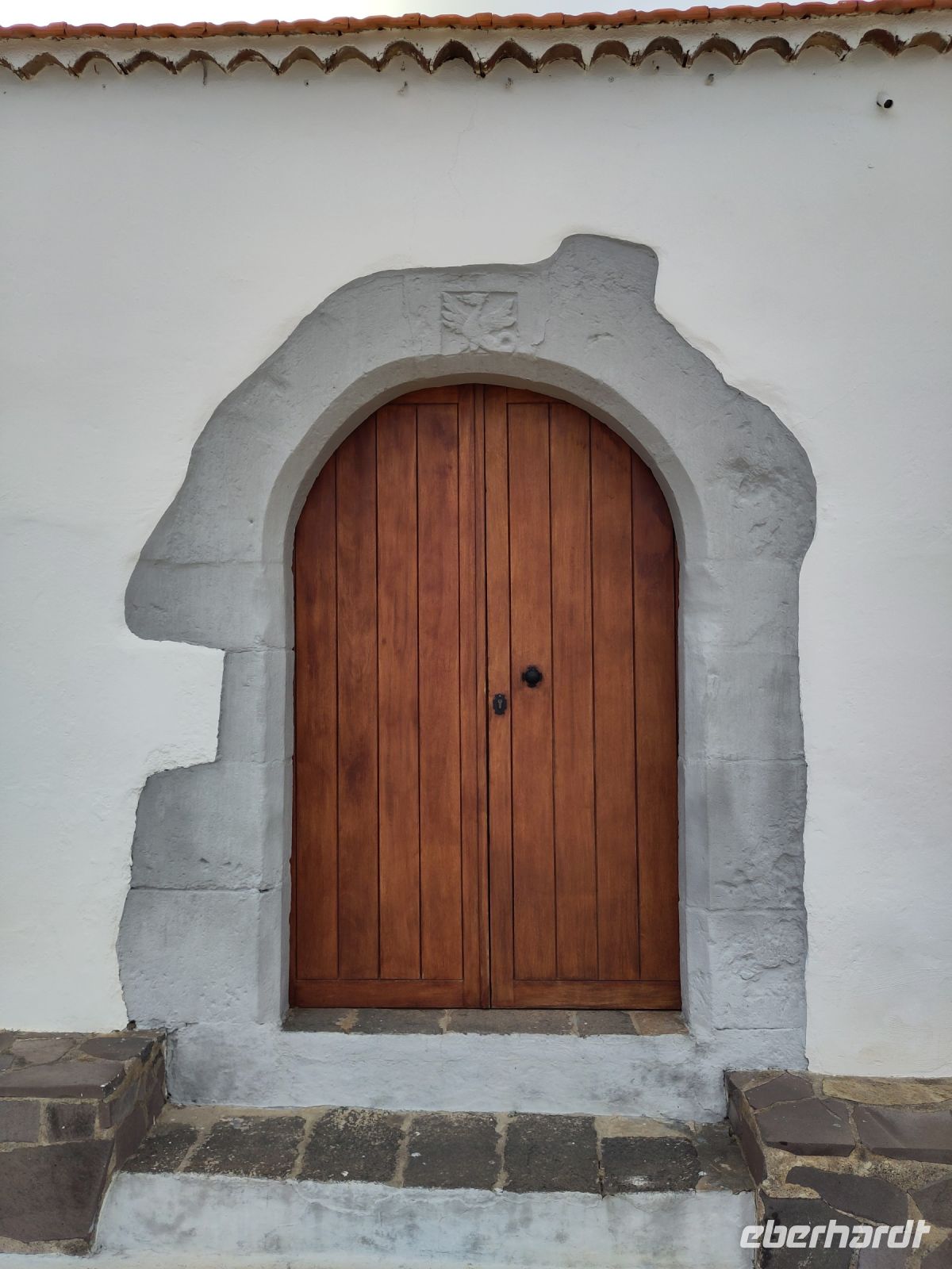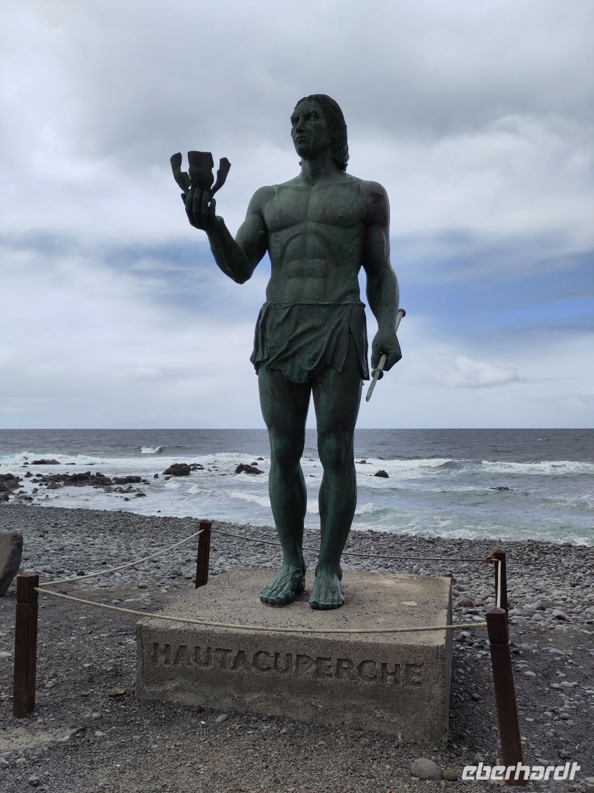 Wir treffen uns heute ein wenig später, als normal und tatsächlich: Eine heftige Windböe jagt durch San Sebastián. Das war alles, was wir von dem Sturm, der auf Teneriffa auch Palmen entwurzelt, in San Sebastián mitbekommen. Wir beginnen eine kurze Stadtführung, vorbei am Torre del Conde zur namensgebenden Ermita de San Sebastián, dem ersten KIrchlein auf der Insel, die später dann durch die größere Pfarrkirche Iglesia de la Asunción (Kirche von der Himmelfahrt Mariens) ersetzt wurde. Aber vorher schauen wir uns noch eine Ausstellung in der Casa de Colón (Kolumbushaus) an. Hier sind aus auf der Insel gefundenen Hölzern Figuren geschnitzt worden. James Kline sitzt in der Ausstellung und spielt auf seiner interessanten Arch-Harp-Guitar, einer Gitarre, an deren Körper sich ein weiteres gitarrenartiges Seiteninstrument anschmiegt.