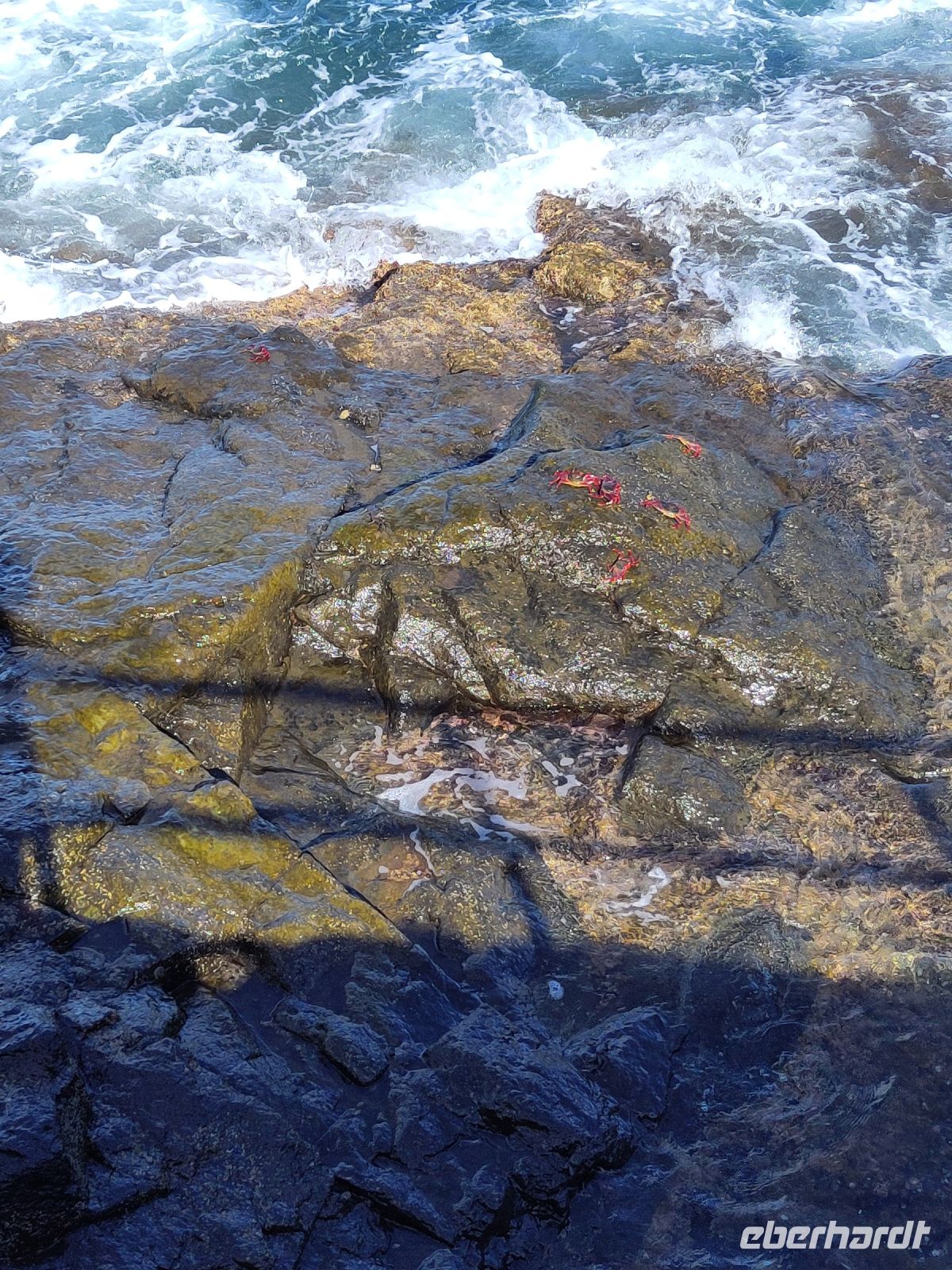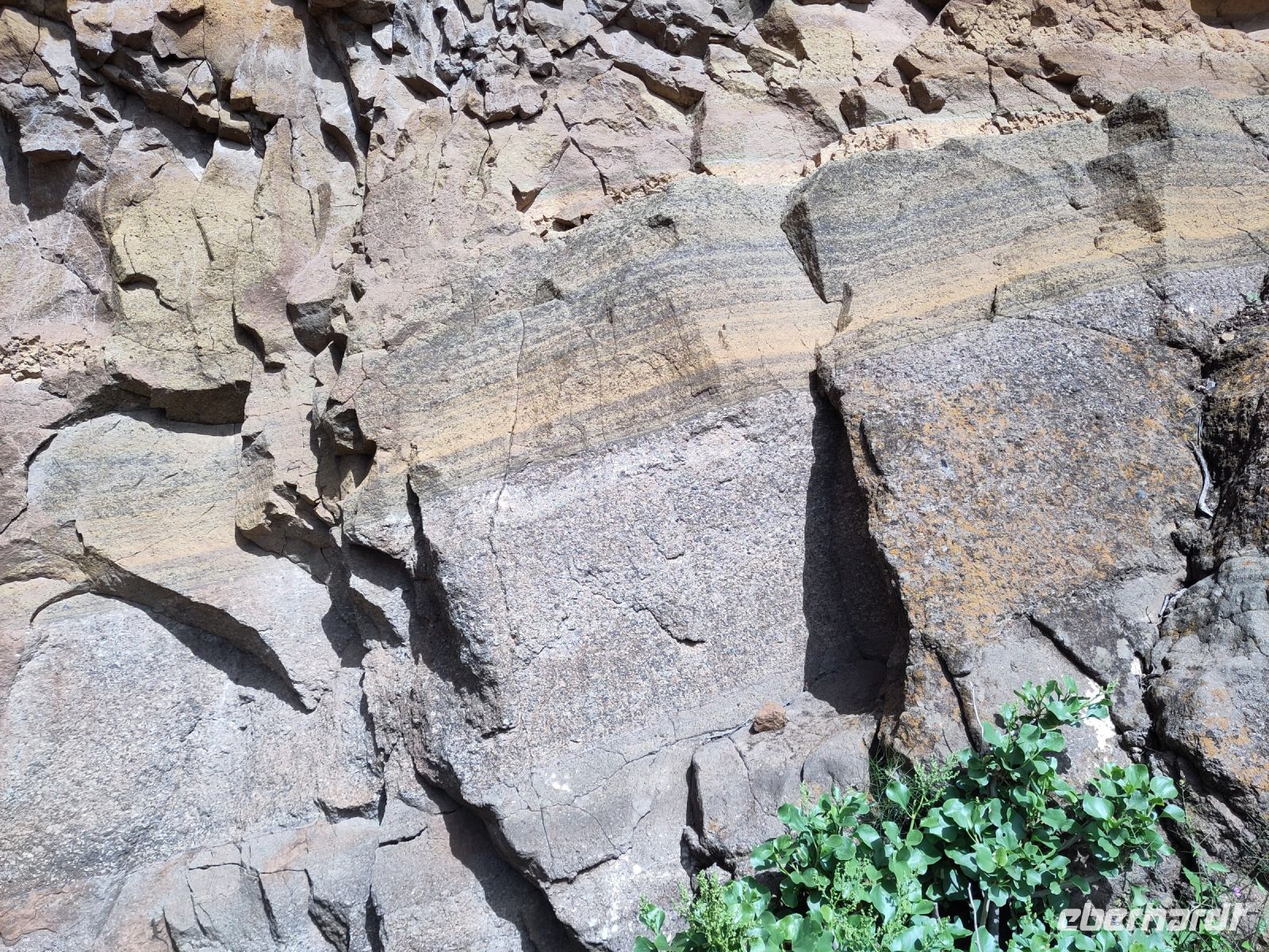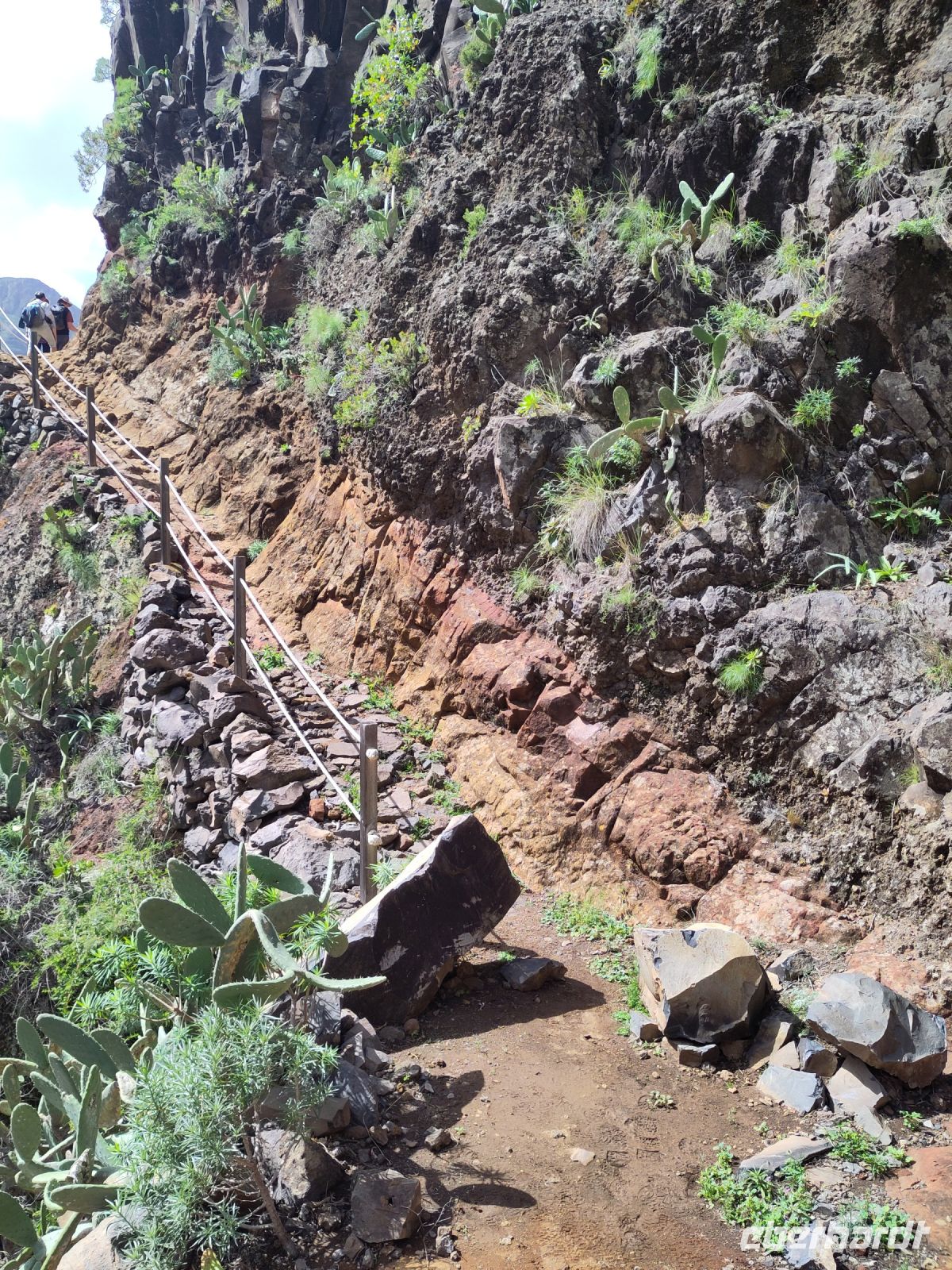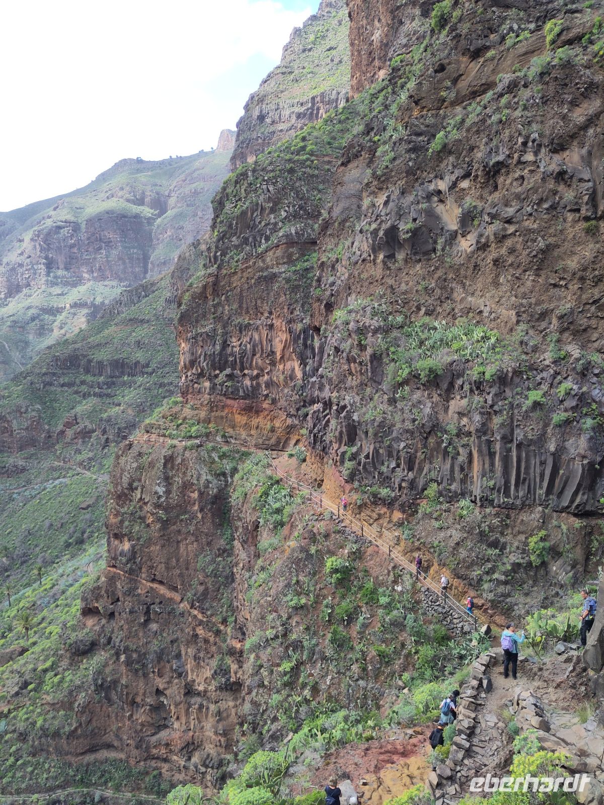 Wir hingegen wandern nun schluchtabwärts. Zunächst noch ein wenig durch den unteren Dorfteil, den wir aber bald hinter uns lassen. Der den Barranco formende Bach hat einige Tümpel hinterlassen, die unter uns liegen, über uns ragen Steilwände auf, teilweise laufen wir entlang alter Wasserleitungen oder wasserführender Schichten im Vulkangestein an einem alten Weg in der Steilwand - natürlich ist der Weg gesichert. Hier wollte Ulli keinesfalls bei Regen mit uns entlang gehen, denn Vulkangestein kann feucht wirklich rutschig werden.