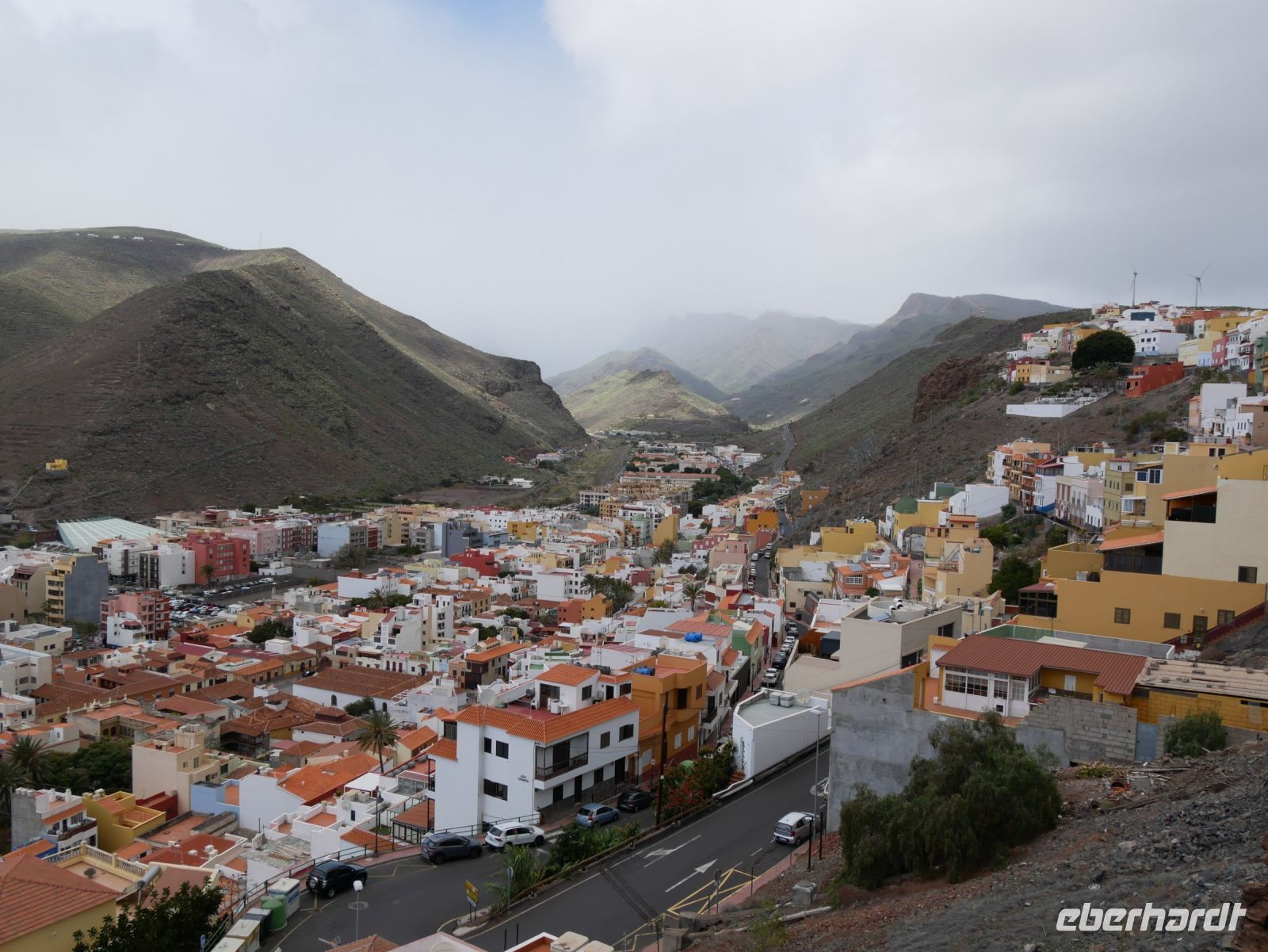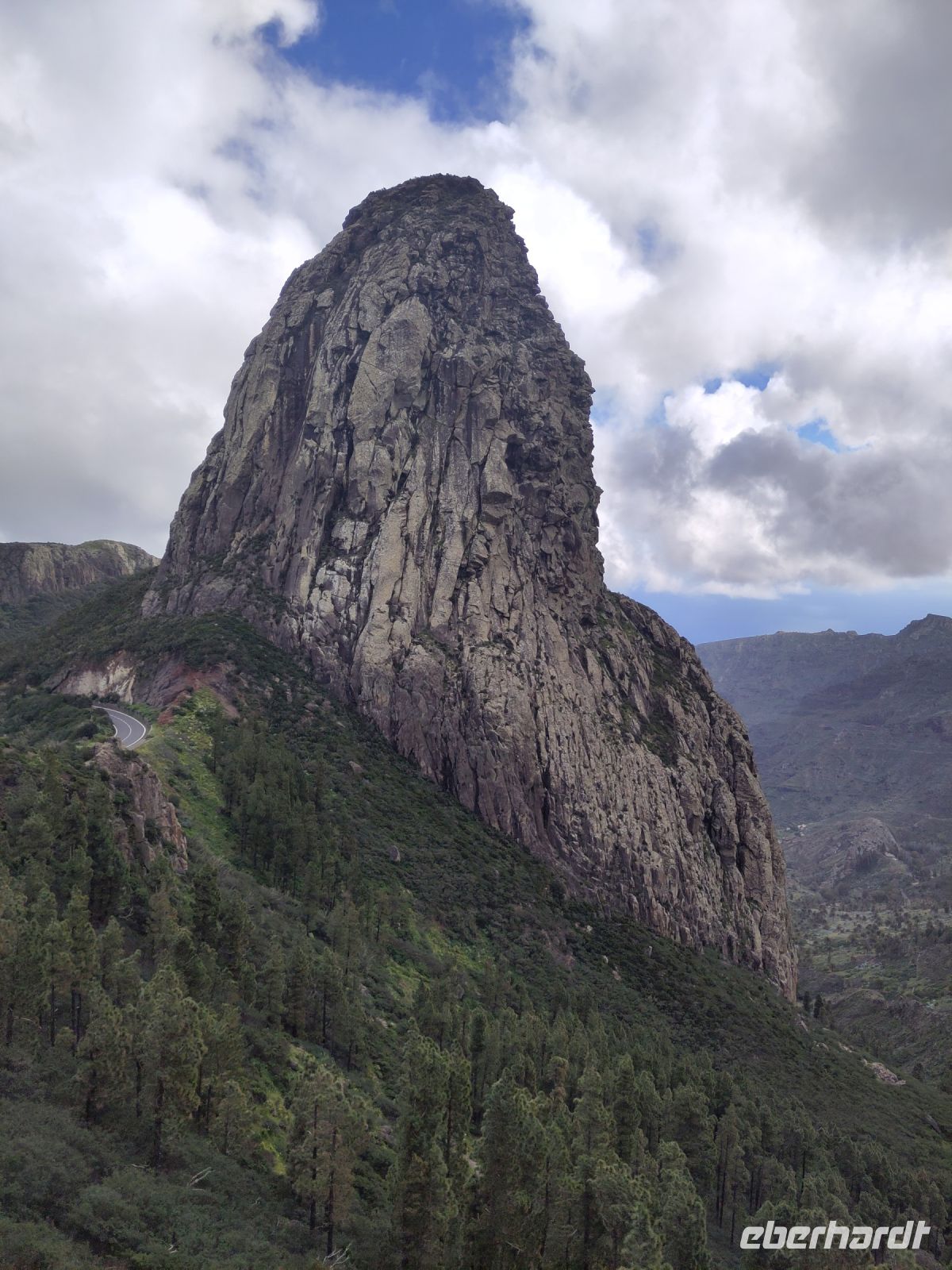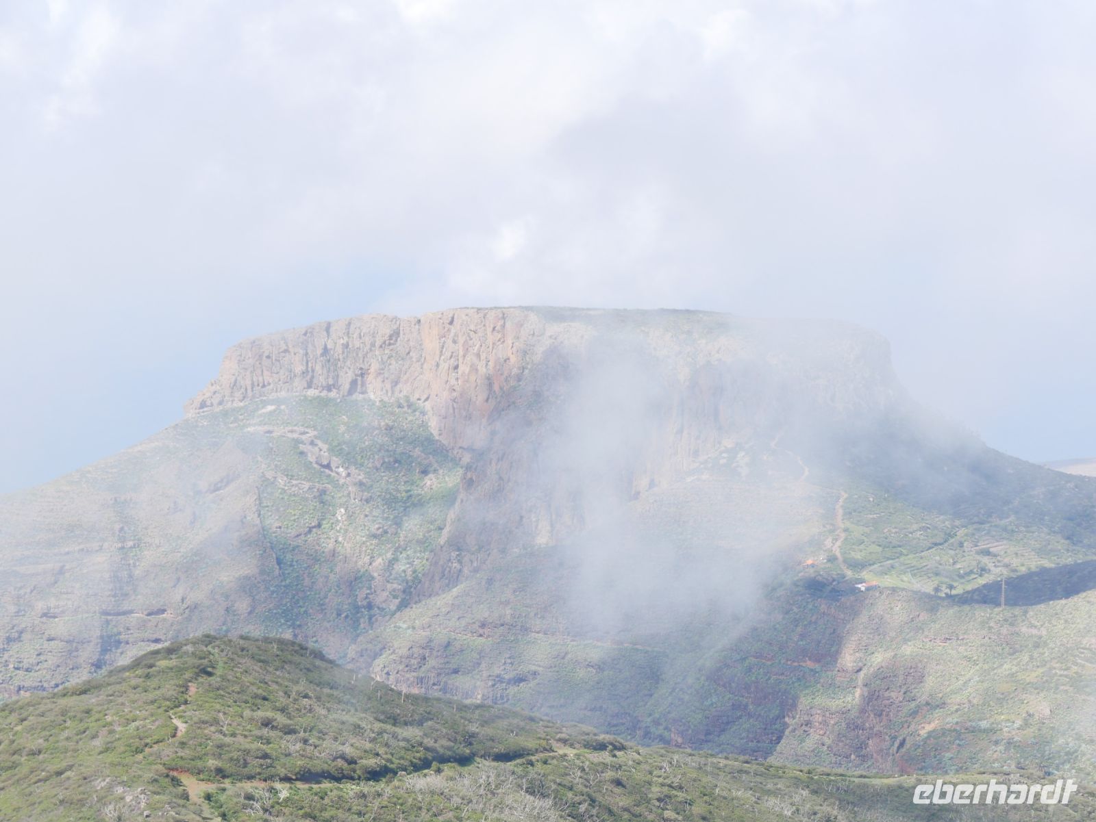 Auf dem Weg dorthin fahren wir durch einen hier als Calima bekannten und durch Saharastaub verursachten Nebel, den man, da es sich um einen trockenen Nebel handelt, hier auch Bruma Seca nennt. Oft sehen wir kaum 100 Meter weit, dann reißt wieder etwas auf und man sieht mehr. Aber die berühmtesten Basaltfelsen Gomeras, die erstarrten Magmakammern Roque Agando und Ojila (sowie die kleineren La Zarcita und Carmona) sind kaum zu sehen, ihre Existenz eher zu erahnen, gleichwohl die Straße mitten zwischen ihnen durch führt.