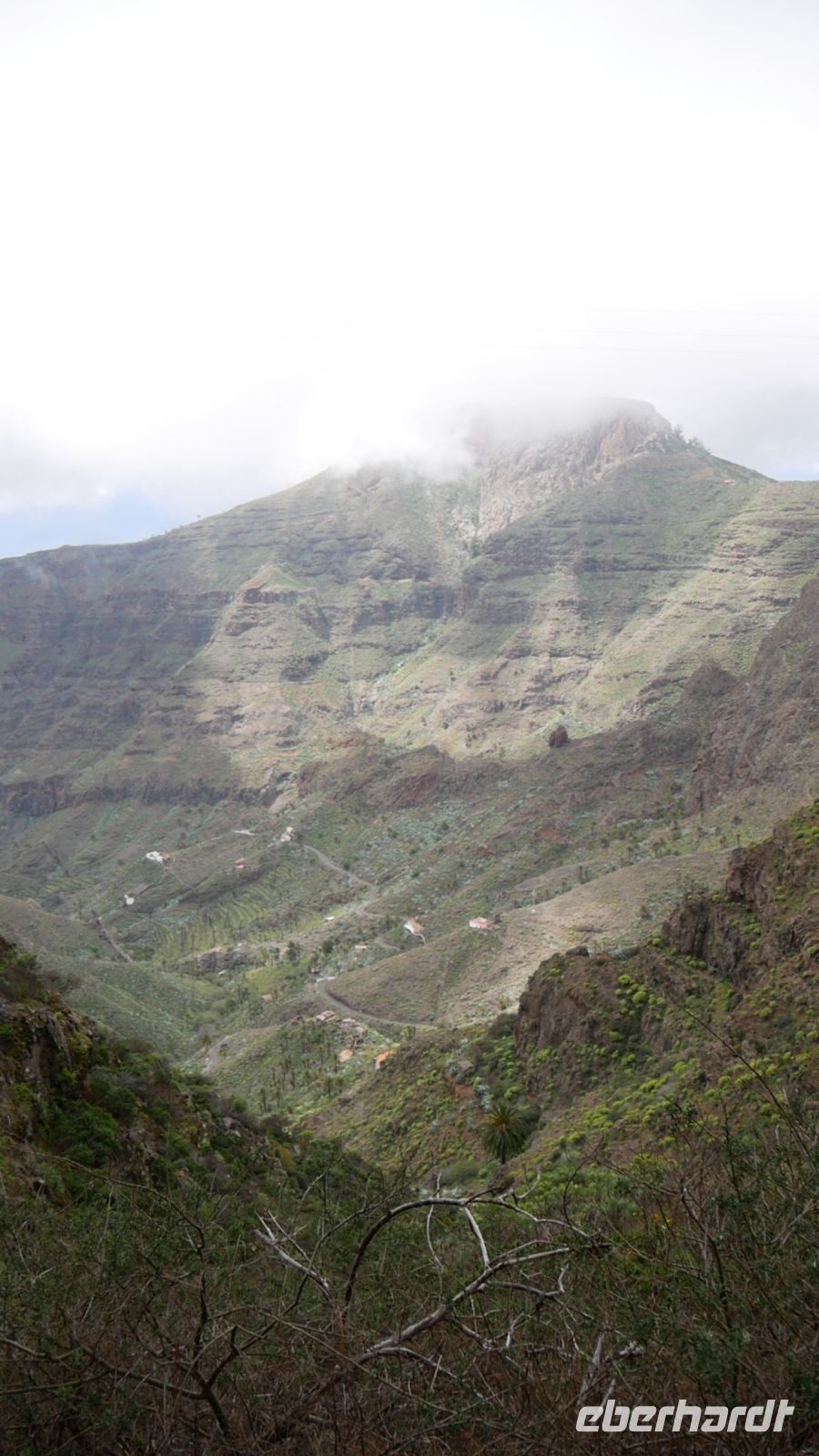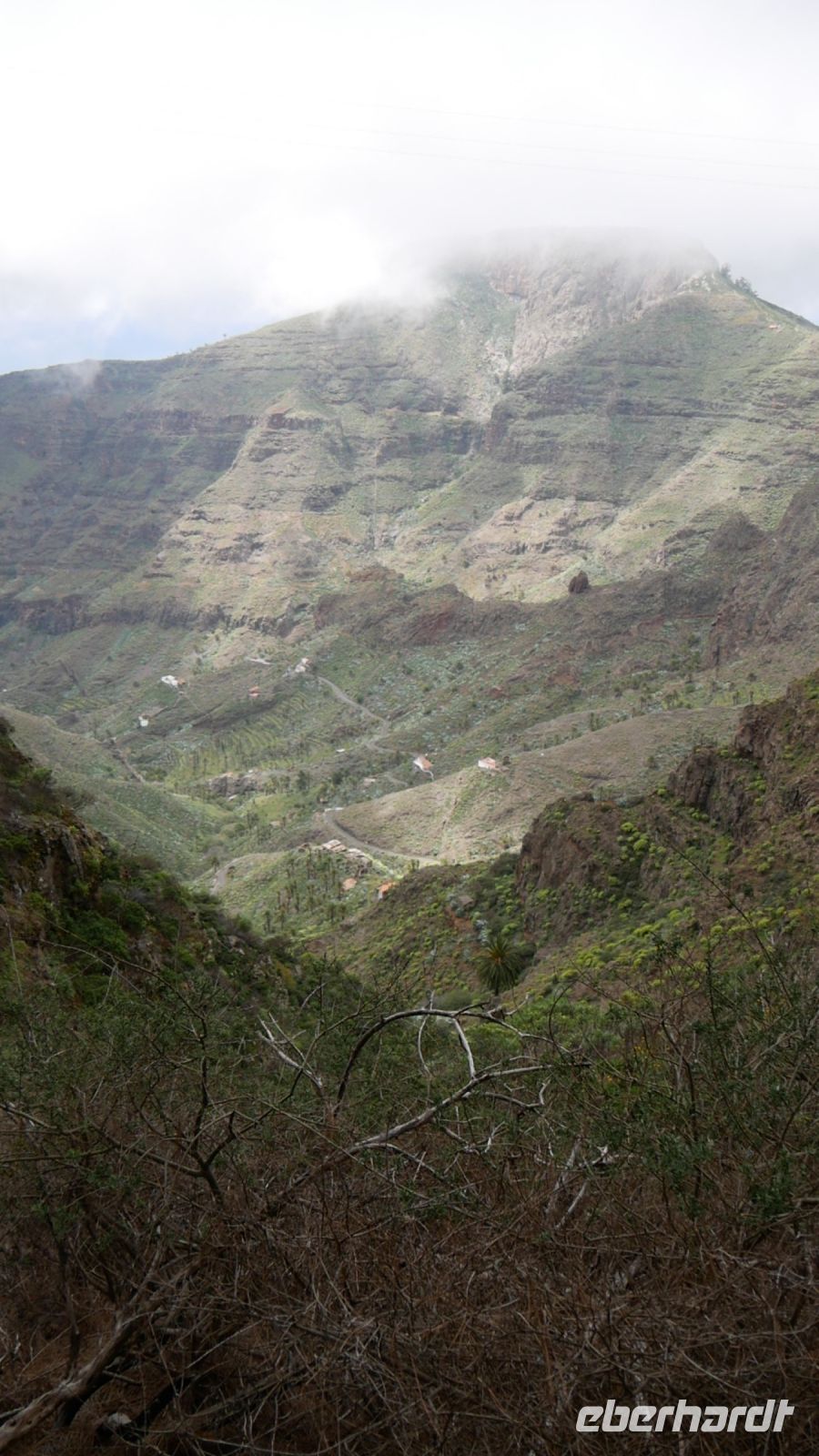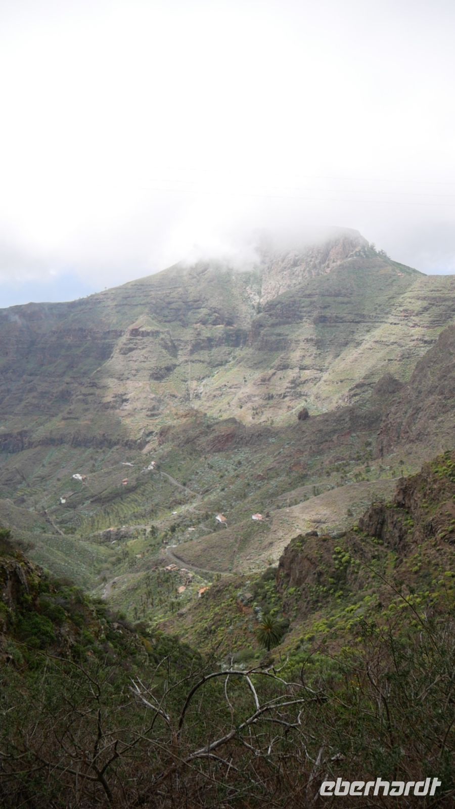 Auf dem Weg dorthin fahren wir durch einen hier als Calima bekannten und durch Saharastaub verursachten Nebel, den man, da es sich um einen trockenen Nebel handelt, hier auch Bruma Seca nennt. Oft sehen wir kaum 100 Meter weit, dann reißt wieder etwas auf und man sieht mehr. Aber die berühmtesten Basaltfelsen Gomeras, die erstarrten Magmakammern Roque Agando und Ojila (sowie die kleineren La Zarcita und Carmona) sind kaum zu sehen, ihre Existenz eher zu erahnen, gleichwohl die Straße mitten zwischen ihnen durch führt.