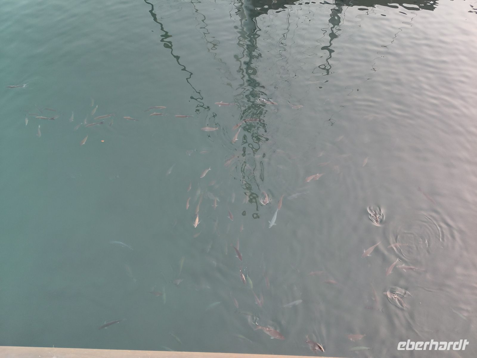 Nachdem wir einige Stunden in Valle Gran Rey verbracht haben, finden wir am Hafen wieder zusammen und fahren jetzt mit dem Benchi zurück nach San Sebastíán. Als wir dort sind, entdecken wir unter den Fischen im Hafenbecken einen Trompetenfisch.