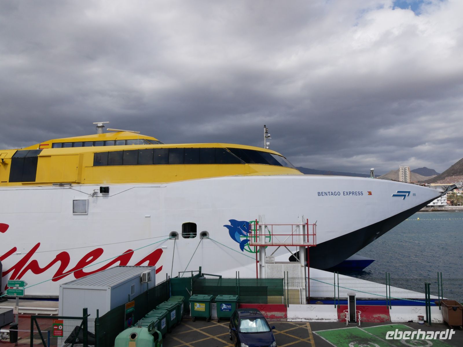 Das Boarding beginnt und dann geht auch schon unsere kurze Überfahrt von Los Cristianos mach San Sebastián de la Gomera los; nach ca. 50 Minuten kommen wir in San Sebastián an. Jetzt müssen wir unser Gepäck suchen, dass wir in Teneriffa auf einen Gepäckwagen gehievt haben. Busfahrer Ventura fährt uns vom Hafen zum Busbahnhof, von dort müssen wir 350 Meter zum Hotel laufen, denn näher kommt er mit dem großen Bus nicht heran. Vom Hafen wären es 650 Meter gewesen. Ein Klacks für eine Wandergruppe.