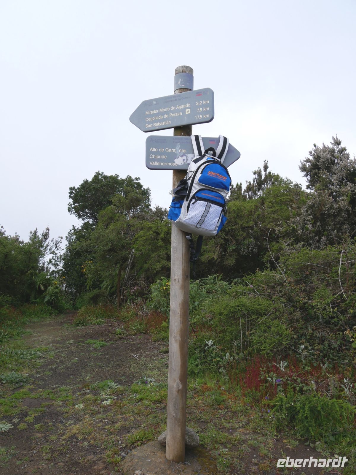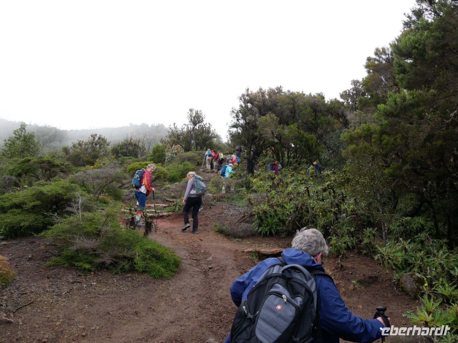 Am Cruce de Pajarito angekommen, beginnt nach kurzer Sortierung unser Aufstieg zu La Gomeras höchstem Berg, dem Garajonay. Es sind von hier aus noch ca. 175 Höhenmeter zu überwinden. Wir sehen erste Baumheiden und den "falschen Löwenzahn", die Gänsedistel. Weite Strecken unserer Wanderung führen durch ein Gelände, das vor einigen Jahren abgebrannt ist. Dor wächst eine Ginsterart (Klebriger Drüsenginster), die besonders gut auf Asche wächst. Die Pflanze vertrocknet in warmen Sommern und brennt dann leicht, was wiederum zu Bränden führt, die für die Gattung an sich, die ja gerne auf Asche wächst, nicht schlecht ist, aber eben auch nicht gerade geeignet, um unter der afrikanischen Sonne der Kanaren wieder den Wald erblühen zu lassen. Als wir wieder vom Garajonay herunetrsteigen, zeigt uns Ulli daher, wie die Gomeros dem Problem begegnen: Sie schlagen Schneisen zwischen die Codesos und pflanzen Gagelbäume. Die Gagelbäume sind typisch für die Randbereiche des Lorbeerwaldes. Die Gagelbäume spenden Schatten, so, dass der Ginster im Sommer nicht austrocknet, es kommt zu weniger Bränden, andere Pflanzen des gomerischen Waldes bekommen eine Chance zu wachsen.