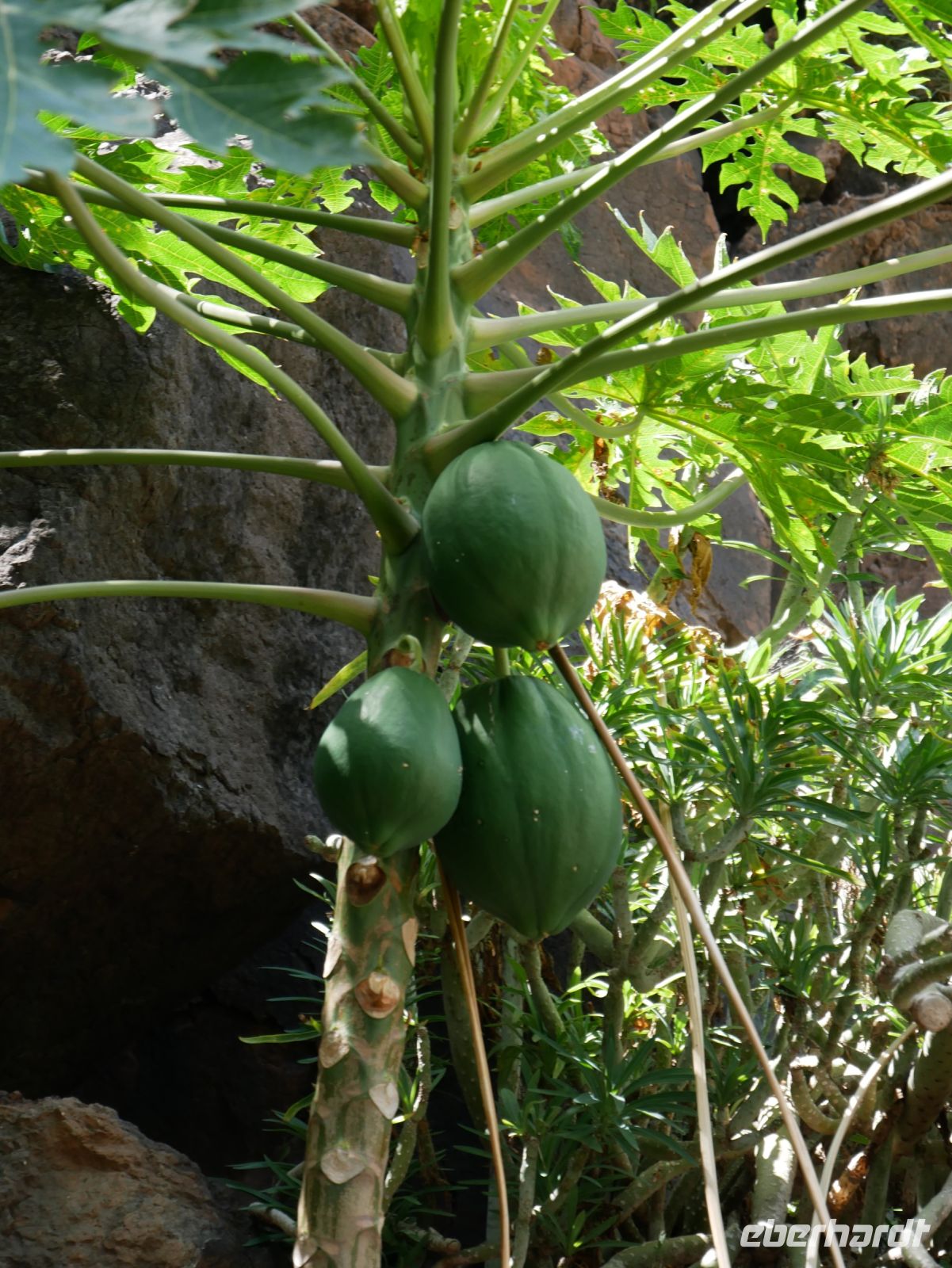 Zunächst aber zeigt uns Ulli die kanarischen Palmen. Hier sehen sie noch gesund aus. Diese hier, das kann man an den relativ jungen (frisch grünen, relativ kurzen) Kronenblättern sehen, sind vor nicht allzu langer Zeit angezapft worden: Man gewinnt Nachts über die Krone den sogenannten Palmhonig (der sich offiziell nicht Plamhonig nennen darf, weil er ja kein Bienenprodukt ist), vor Sonnenaufgang werden die Eimer abgenommen und dann wird der Palmsirup, wie der Palmhonig fachmännisch korrekt heißt, aber wie ihn niemand freiwillig nennt, eingekocht. Der Palmhonig ist ein beliebtes Süßungsmittel auf La Gomera und Grundlage des Palmhoniglikörs Gomerón.