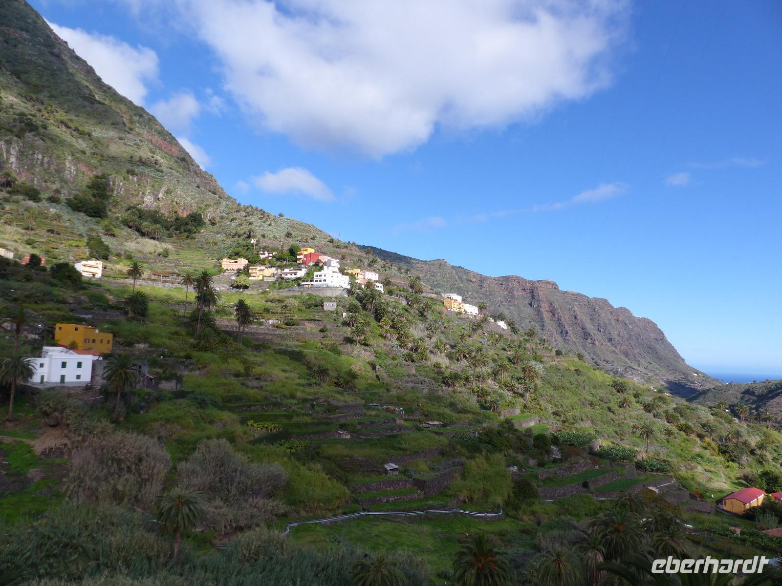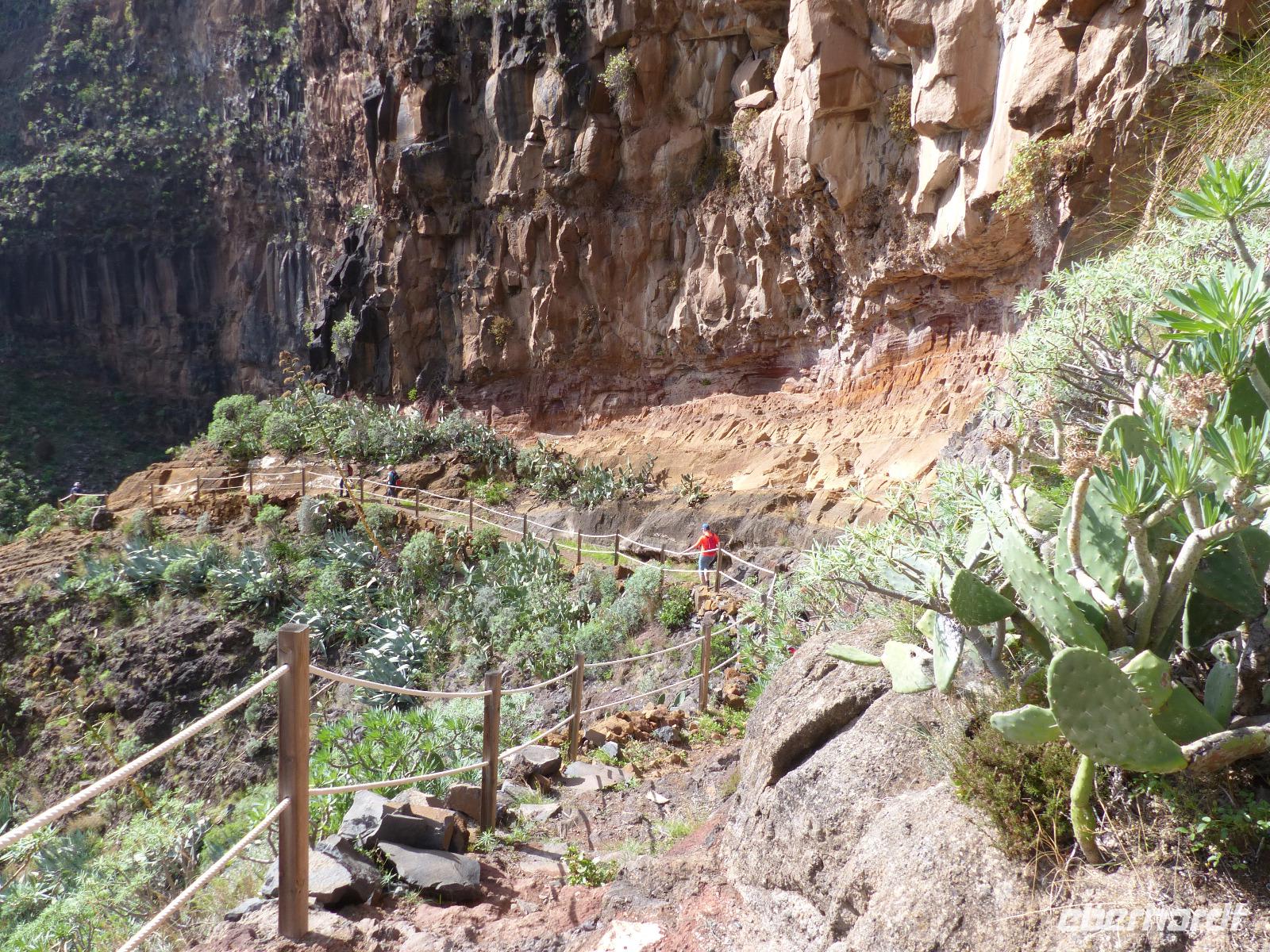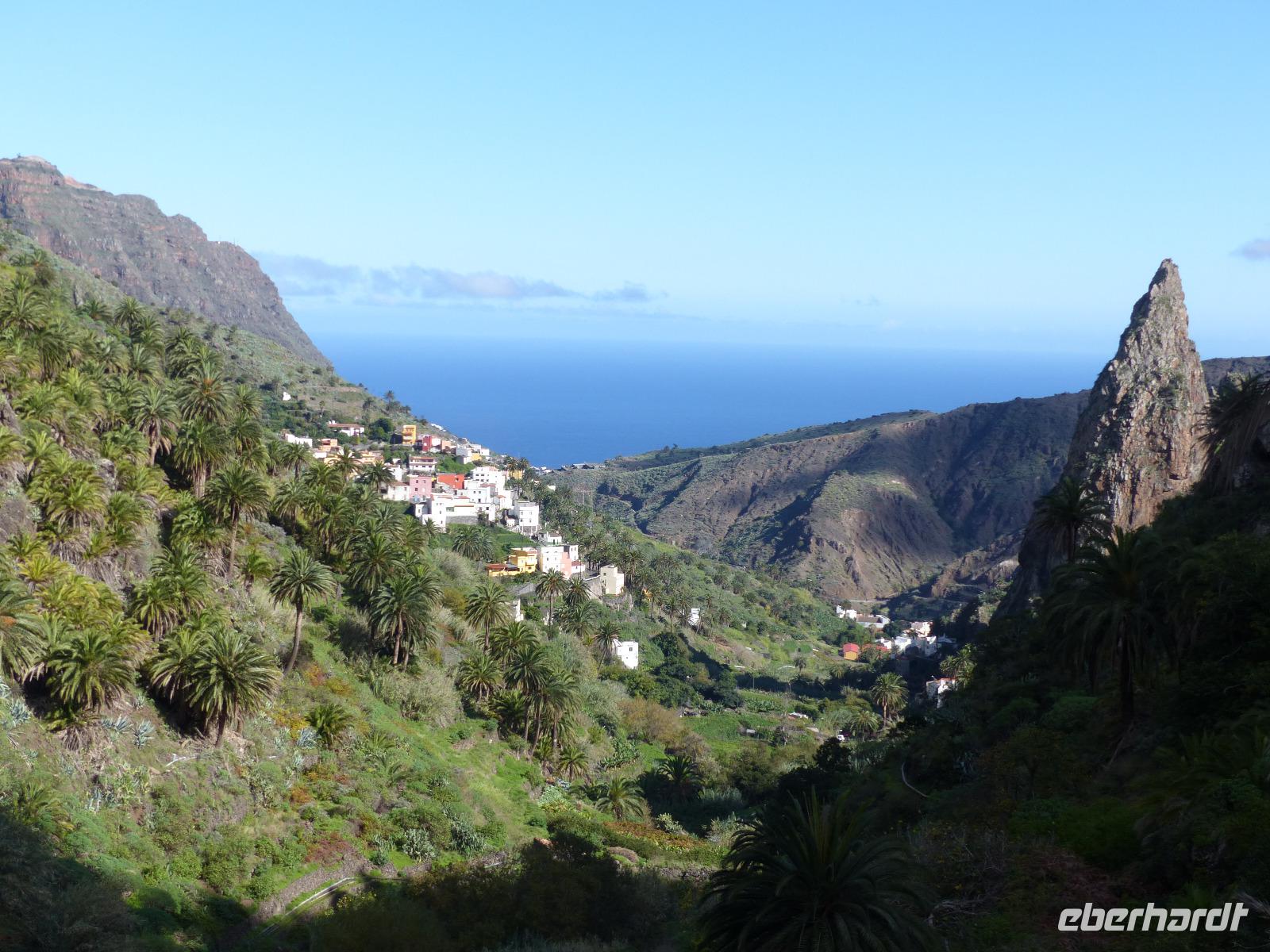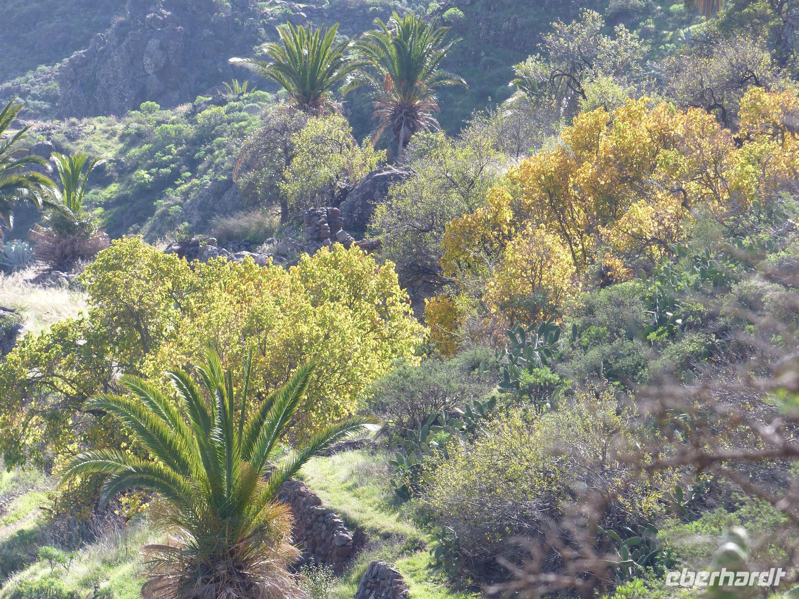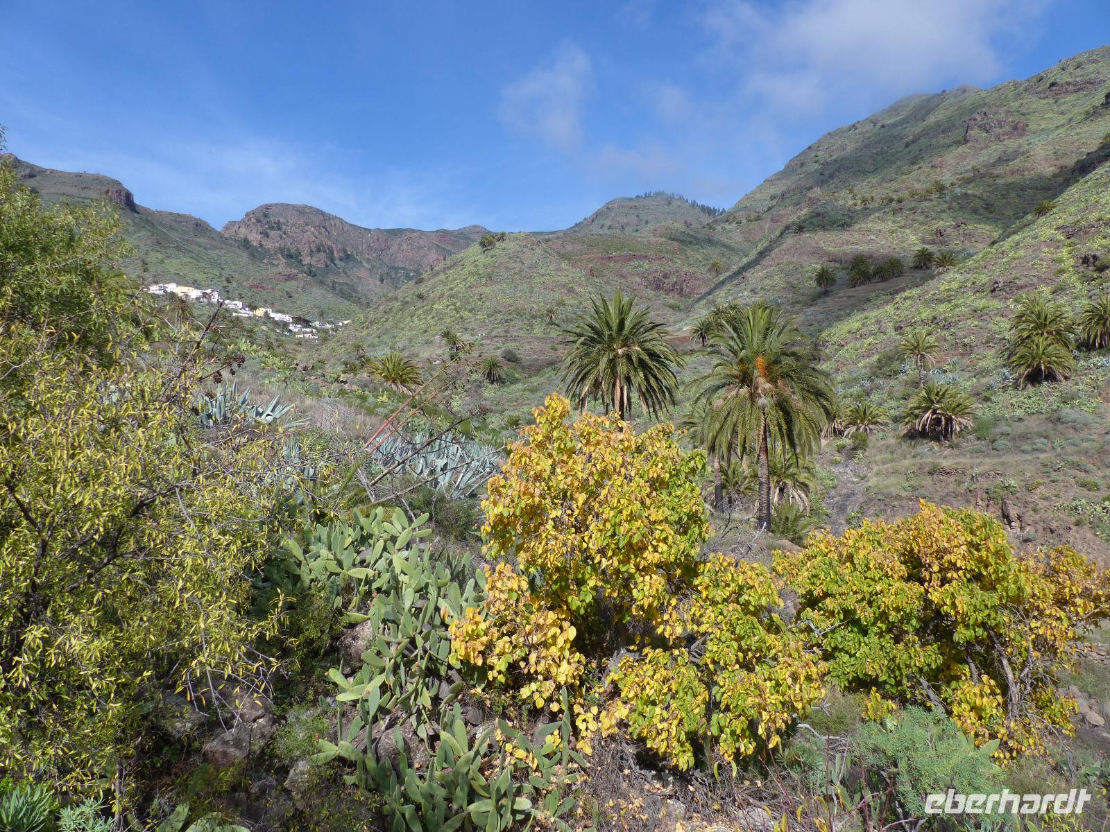 Unser letzter Tag auf La Gomera brach an. Auch heute schien die Sonne in Imada. Und so folgte der Wanderhighlight am letzten Tag: die Palmenschlucht. Vom kleinen Bergdorf führt ein Pfad abwärts durch aufgelassene Terrassenfelder. Blühende Sukkulenten, Agaven, Wolfsmilchgewächse, Opuntien. Und Palmen. Und immer wieder herbstlich verfärbte Laubbäume. Der Weg war nicht ganz einfach, v.a. wenn man nicht schwindelfrei ist und Höhenangst hat. Aber alle kamen mit und schafften es auch ohne Panik diese Stellen zu meistern. Und keiner bereute es, dass er mitgekommen war, so beeindruckend sind die Felswände der Basaltschlucht. Wir ließen uns Zeit und genossen den Abstieg. Je tiefer wir kamen um so mehr Palmen säumten unseren Weg. Unten trennten wir uns. Wer keine Lust auf einen schweißtreibenden Steilaufstieg hatte, folgte der Straße abwärts zum Bus. Der brachte die Genusswanderer nach Playa de Santiago. Die Bergziegen folgten mir steil bergauf. Bizarre Felsen und Höhlen lagen am Wegesrand. Und der Blick auf den Roques Agando wurde frei. Oben machten wir eine Pause und genossen die Aussicht, bevor wir mehrere kleine Weiler durchschritten und schließlich den Bus erreichten. Wir holten die Genusswanderer dann in Playa de Santiago ab und kamen gerade noch rechtzeitig in San Sebastian an, um noch ein Meeresbad in der Sonne nehmen zu können, denn im Dezember verschwindet die Sonne schon relativ früh aus der Bucht. Und nun war Kofferpacken angesagt. Unseren letzten Abend verbrachten wir in einem kleinen Restaurant, wo wir sehr lecker gegessen haben. Und am späten Abend köpften wir noch 2 Flaschen Rebensaft und ließen so diese schöne Reise in guter Stimmung ausklingen. Dann hieß es Abschied nehmen von unserer kleinen hübschen Insel im großen Meer.
