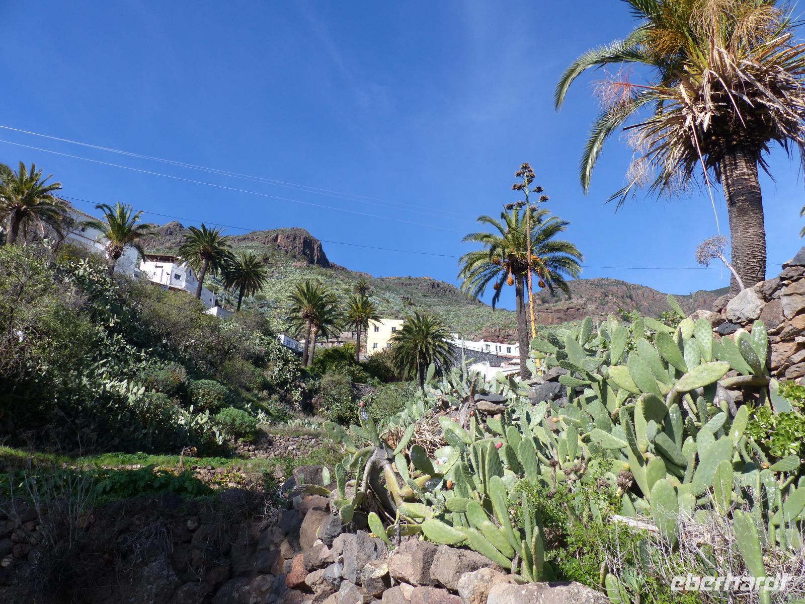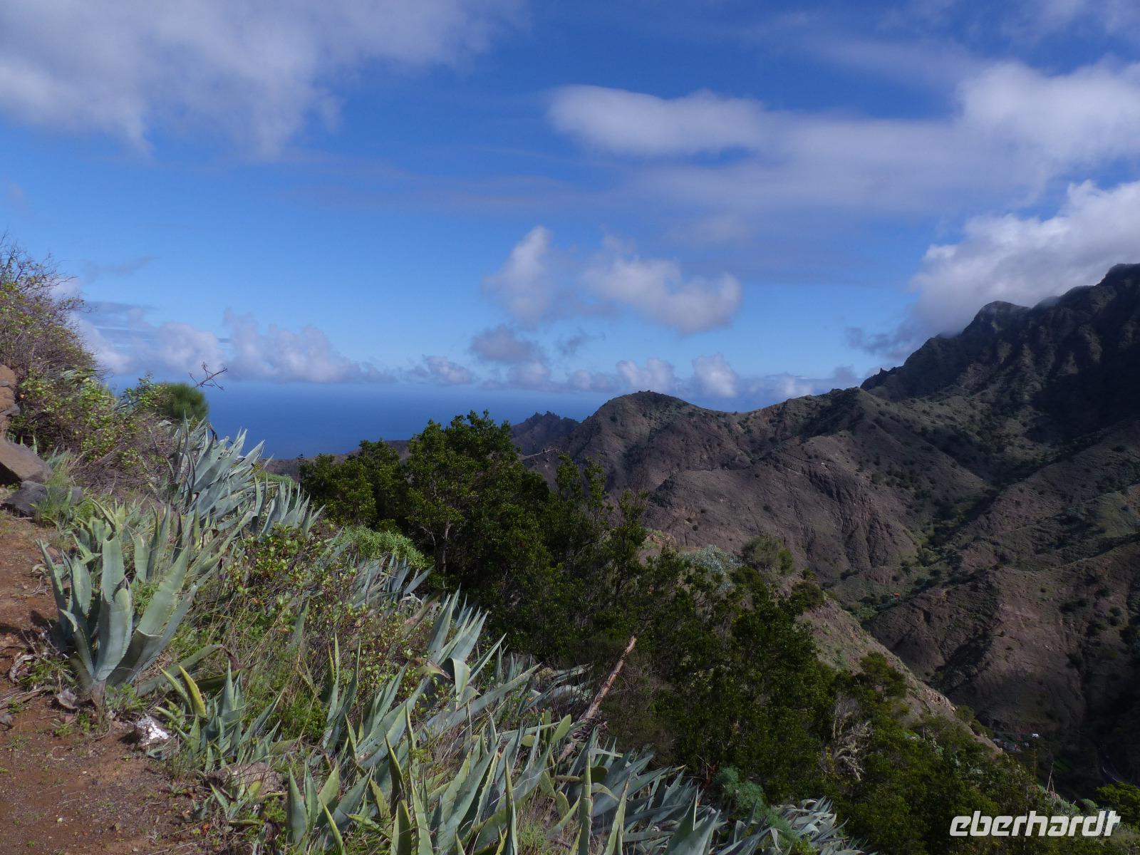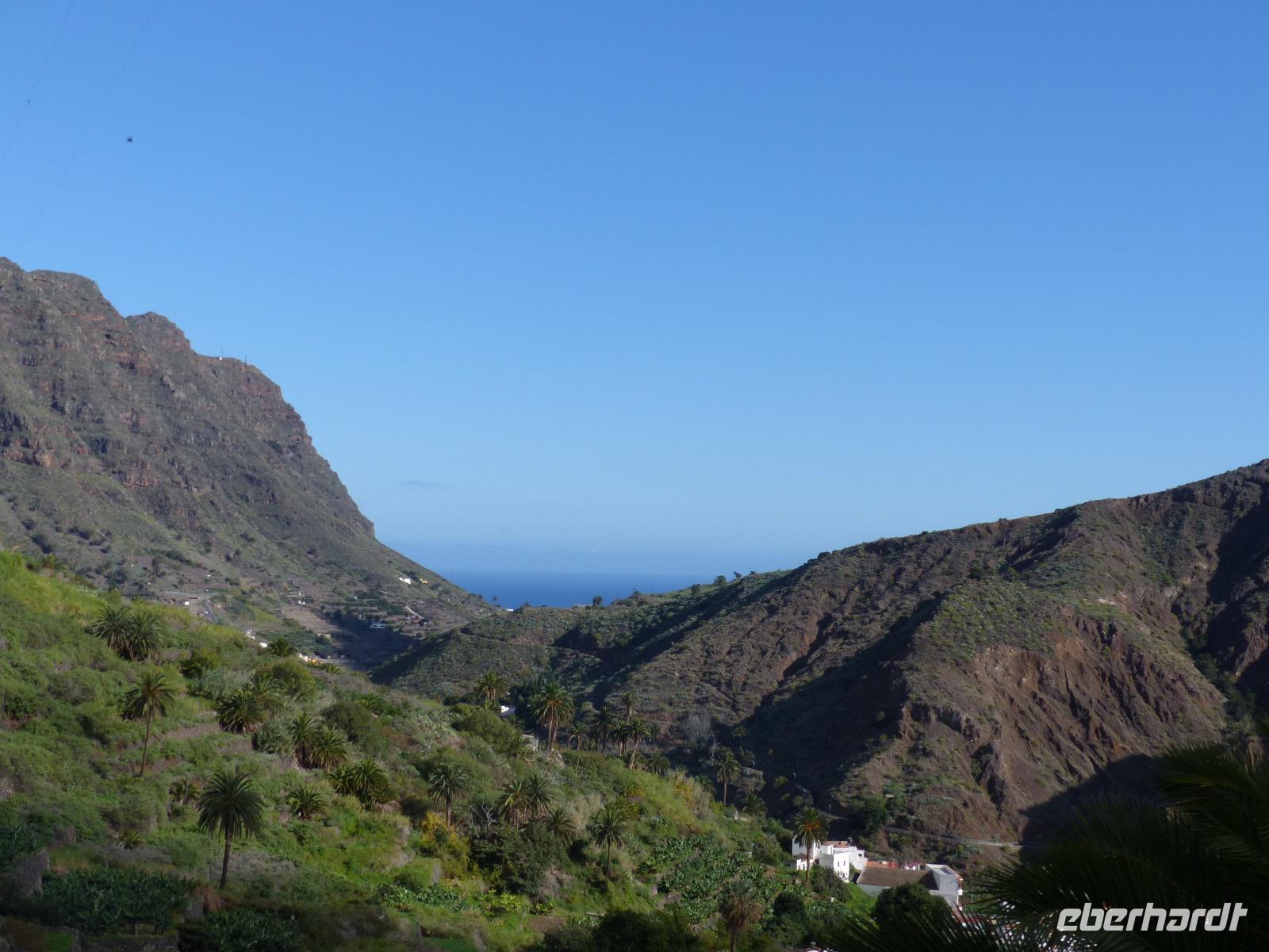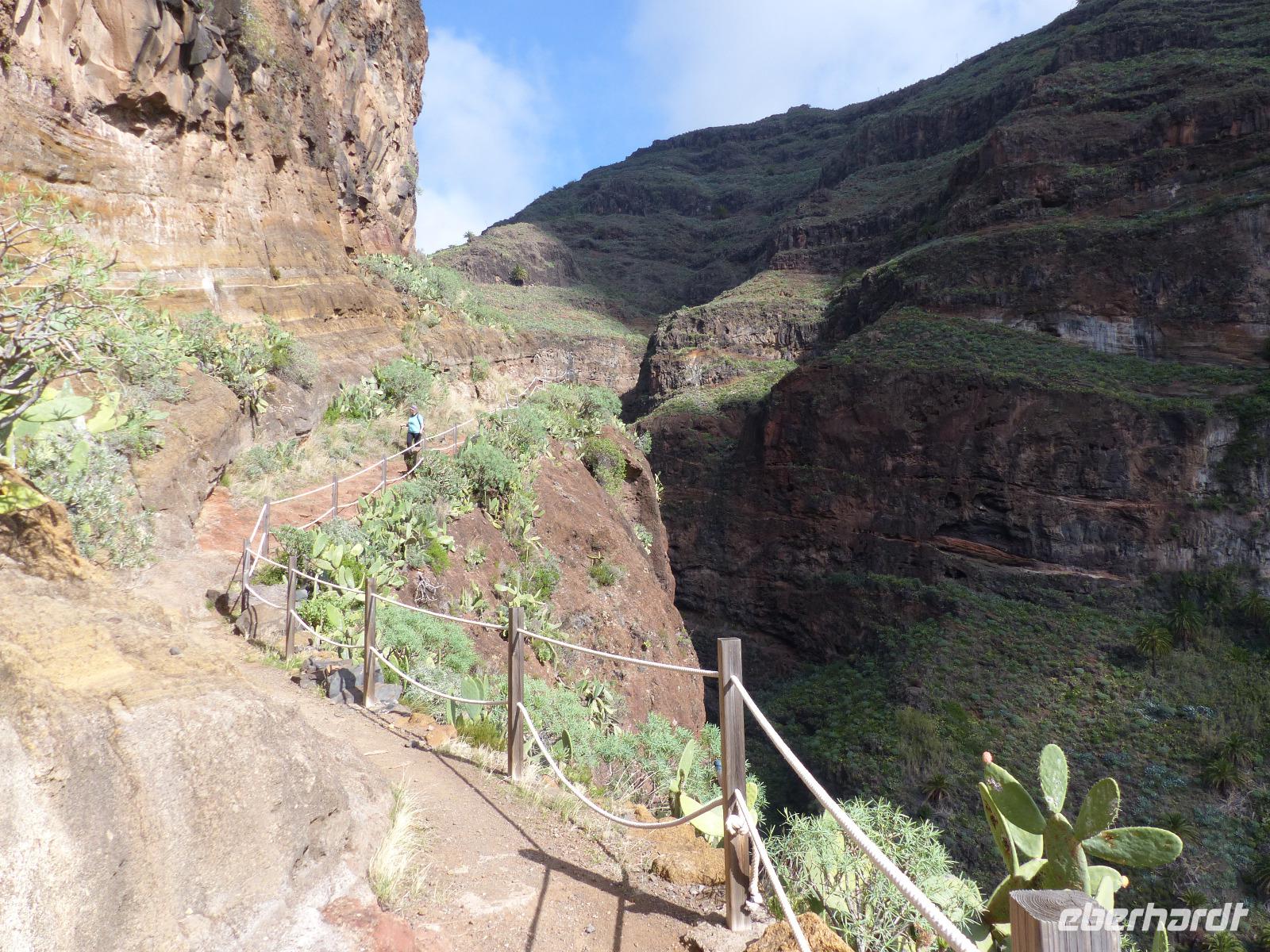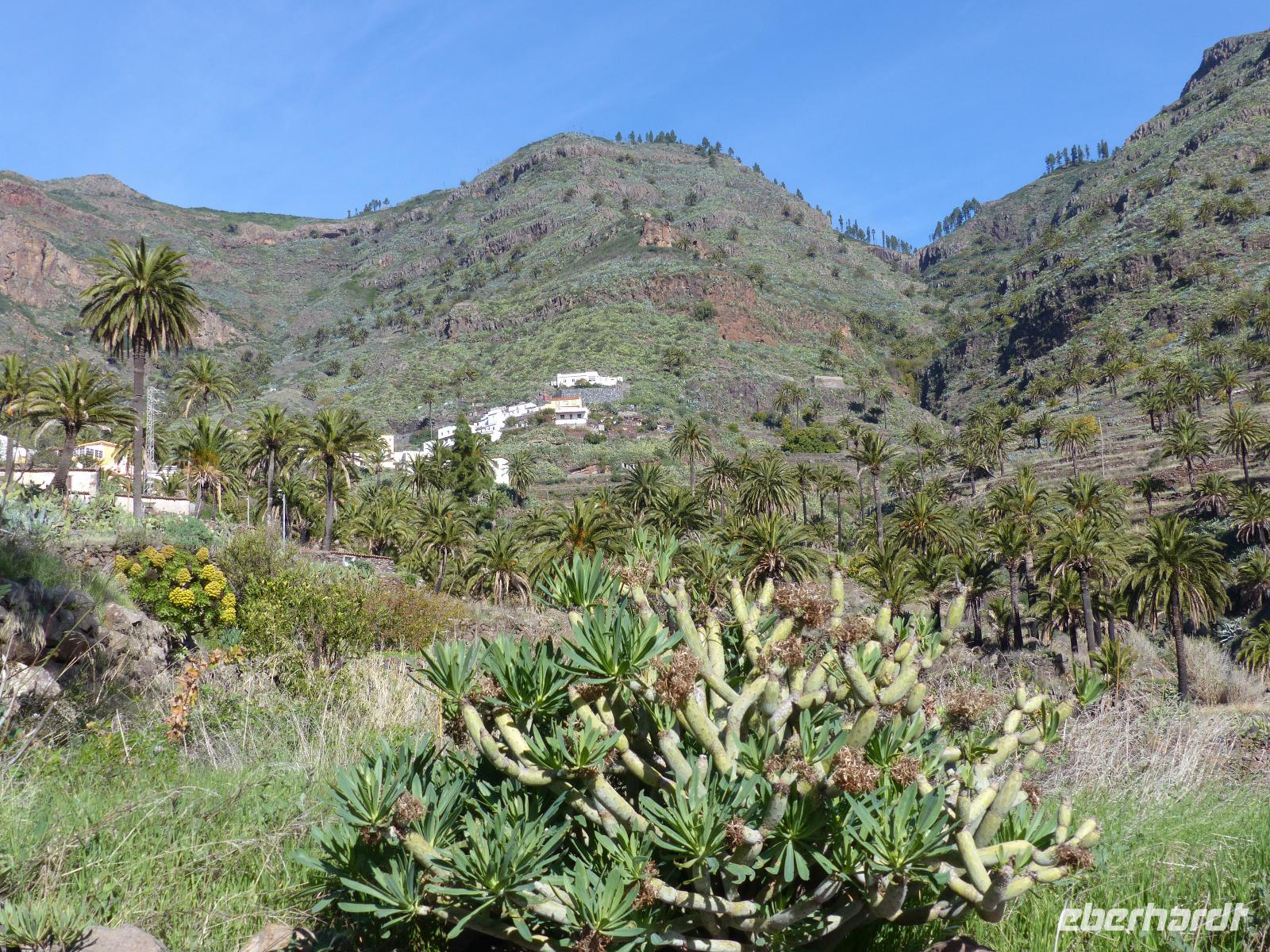 Unser letzter Tag auf La Gomera brach an. Auch heute schien die Sonne in Imada. Und so folgte der Wanderhighlight am letzten Tag: die Palmenschlucht. Vom kleinen Bergdorf führt ein Pfad abwärts durch aufgelassene Terrassenfelder. Blühende Sukkulenten, Agaven, Wolfsmilchgewächse, Opuntien. Und Palmen. Und immer wieder herbstlich verfärbte Laubbäume. Der Weg war nicht ganz einfach, v.a. wenn man nicht schwindelfrei ist und Höhenangst hat. Aber alle kamen mit und schafften es auch ohne Panik diese Stellen zu meistern. Und keiner bereute es, dass er mitgekommen war, so beeindruckend sind die Felswände der Basaltschlucht. Wir ließen uns Zeit und genossen den Abstieg. Je tiefer wir kamen um so mehr Palmen säumten unseren Weg. Unten trennten wir uns. Wer keine Lust auf einen schweißtreibenden Steilaufstieg hatte, folgte der Straße abwärts zum Bus. Der brachte die Genusswanderer nach Playa de Santiago. Die Bergziegen folgten mir steil bergauf. Bizarre Felsen und Höhlen lagen am Wegesrand. Und der Blick auf den Roques Agando wurde frei. Oben machten wir eine Pause und genossen die Aussicht, bevor wir mehrere kleine Weiler durchschritten und schließlich den Bus erreichten. Wir holten die Genusswanderer dann in Playa de Santiago ab und kamen gerade noch rechtzeitig in San Sebastian an, um noch ein Meeresbad in der Sonne nehmen zu können, denn im Dezember verschwindet die Sonne schon relativ früh aus der Bucht. Und nun war Kofferpacken angesagt. Unseren letzten Abend verbrachten wir in einem kleinen Restaurant, wo wir sehr lecker gegessen haben. Und am späten Abend köpften wir noch 2 Flaschen Rebensaft und ließen so diese schöne Reise in guter Stimmung ausklingen. Dann hieß es Abschied nehmen von unserer kleinen hübschen Insel im großen Meer.