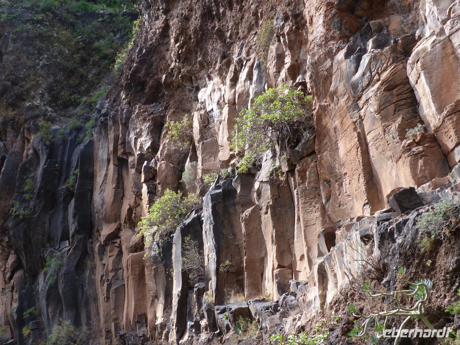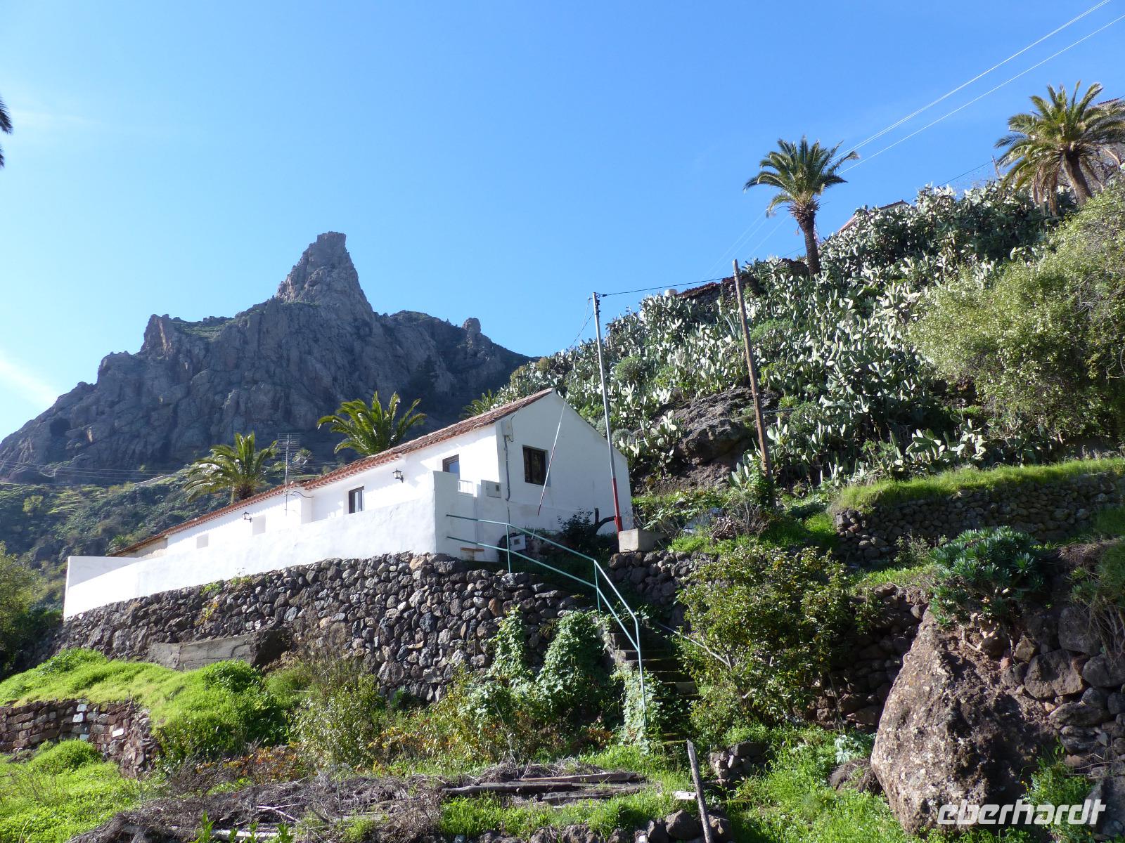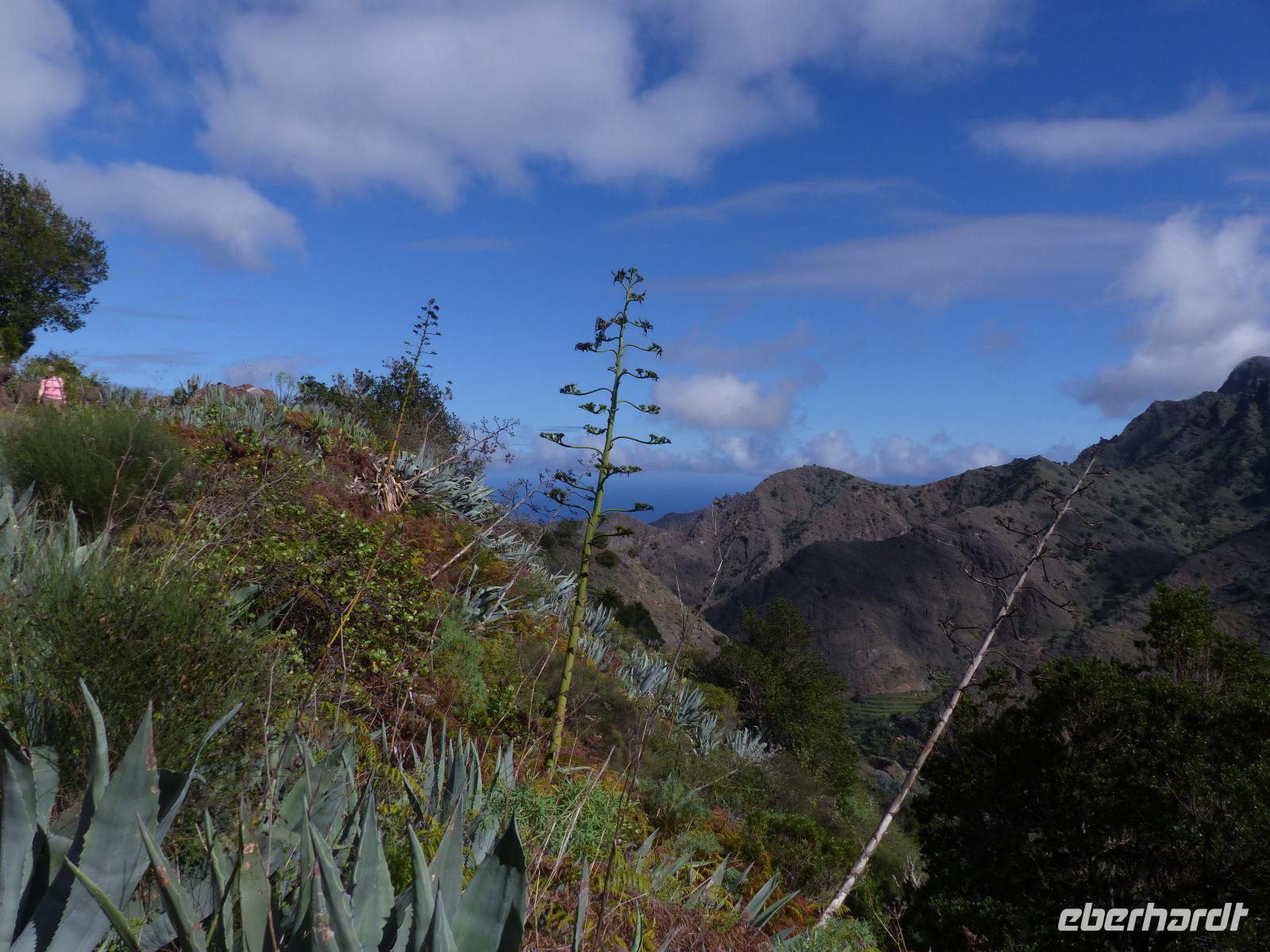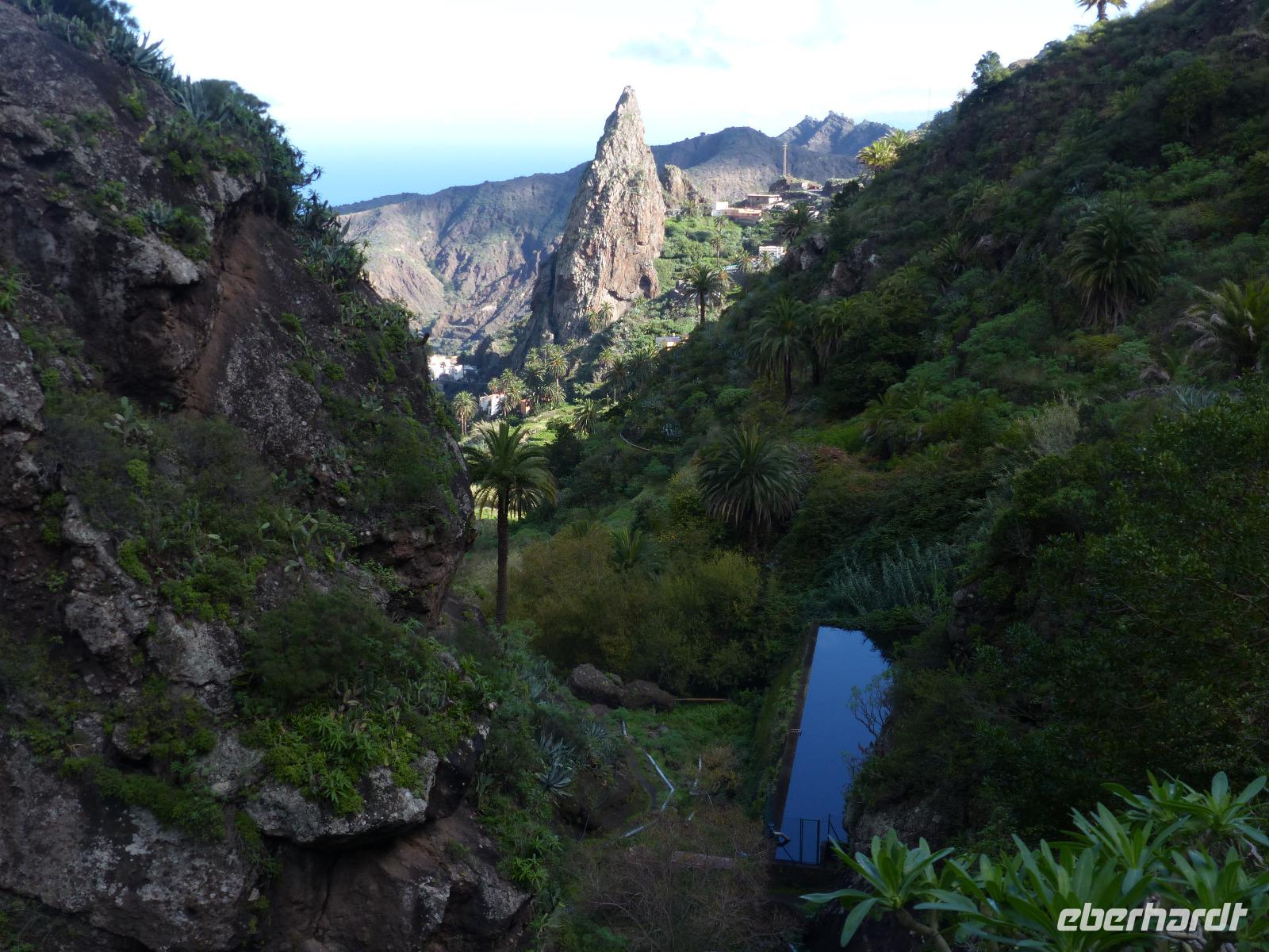 Unser letzter Tag auf La Gomera brach an. Auch heute schien die Sonne in Imada. Und so folgte der Wanderhighlight am letzten Tag: die Palmenschlucht. Vom kleinen Bergdorf führt ein Pfad abwärts durch aufgelassene Terrassenfelder. Blühende Sukkulenten, Agaven, Wolfsmilchgewächse, Opuntien. Und Palmen. Und immer wieder herbstlich verfärbte Laubbäume. Der Weg war nicht ganz einfach, v.a. wenn man nicht schwindelfrei ist und Höhenangst hat. Aber alle kamen mit und schafften es auch ohne Panik diese Stellen zu meistern. Und keiner bereute es, dass er mitgekommen war, so beeindruckend sind die Felswände der Basaltschlucht. Wir ließen uns Zeit und genossen den Abstieg. Je tiefer wir kamen um so mehr Palmen säumten unseren Weg. Unten trennten wir uns. Wer keine Lust auf einen schweißtreibenden Steilaufstieg hatte, folgte der Straße abwärts zum Bus. Der brachte die Genusswanderer nach Playa de Santiago. Die Bergziegen folgten mir steil bergauf. Bizarre Felsen und Höhlen lagen am Wegesrand. Und der Blick auf den Roques Agando wurde frei. Oben machten wir eine Pause und genossen die Aussicht, bevor wir mehrere kleine Weiler durchschritten und schließlich den Bus erreichten. Wir holten die Genusswanderer dann in Playa de Santiago ab und kamen gerade noch rechtzeitig in San Sebastian an, um noch ein Meeresbad in der Sonne nehmen zu können, denn im Dezember verschwindet die Sonne schon relativ früh aus der Bucht. Und nun war Kofferpacken angesagt. Unseren letzten Abend verbrachten wir in einem kleinen Restaurant, wo wir sehr lecker gegessen haben. Und am späten Abend köpften wir noch 2 Flaschen Rebensaft und ließen so diese schöne Reise in guter Stimmung ausklingen. Dann hieß es Abschied nehmen von unserer kleinen hübschen Insel im großen Meer.