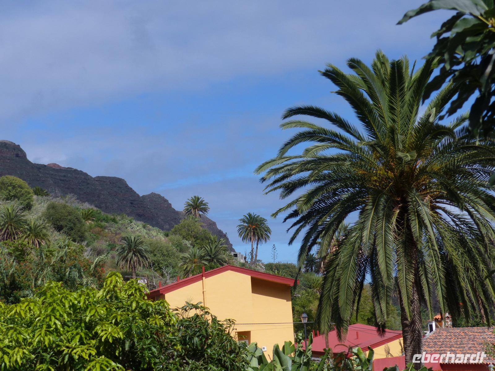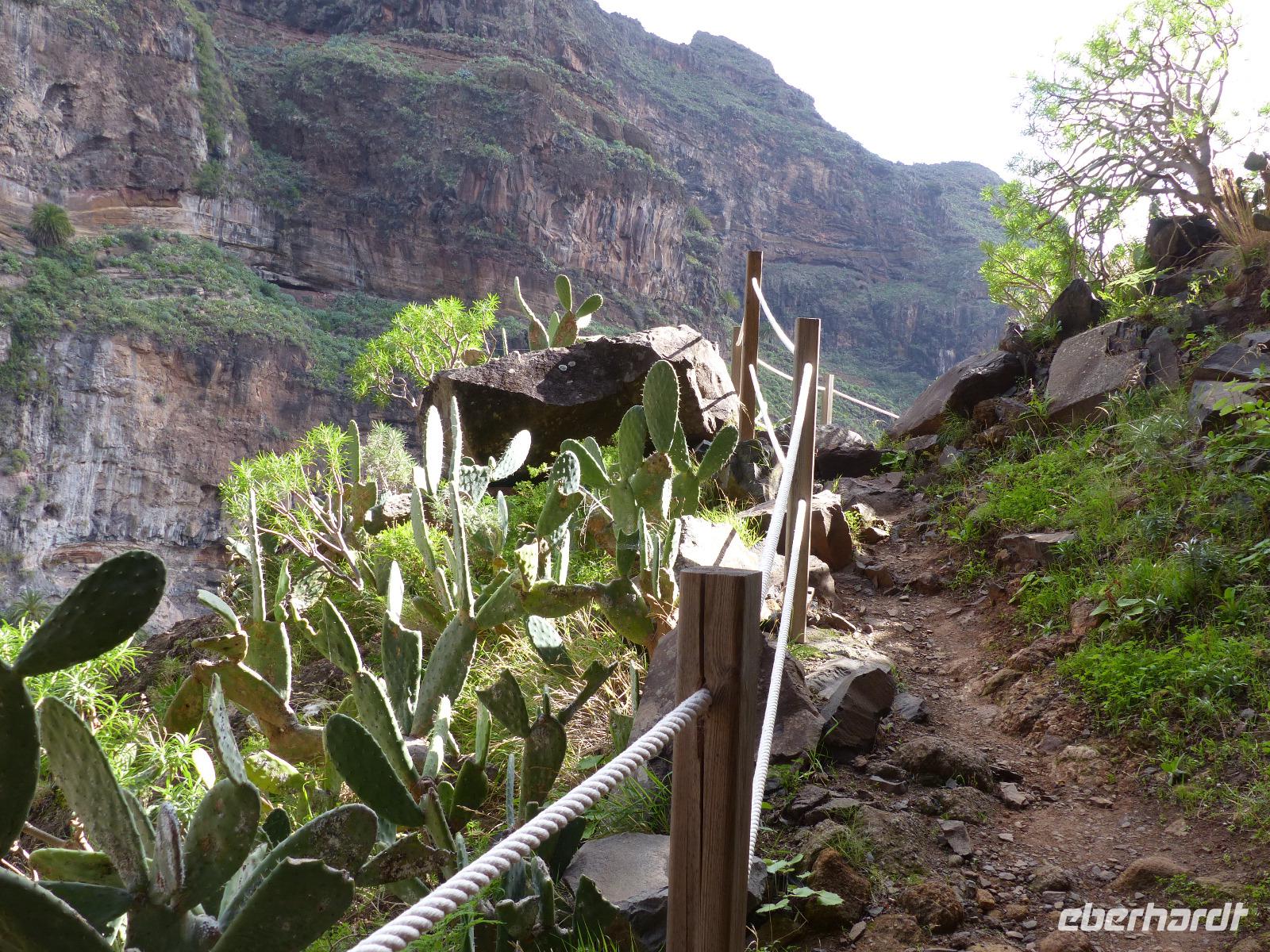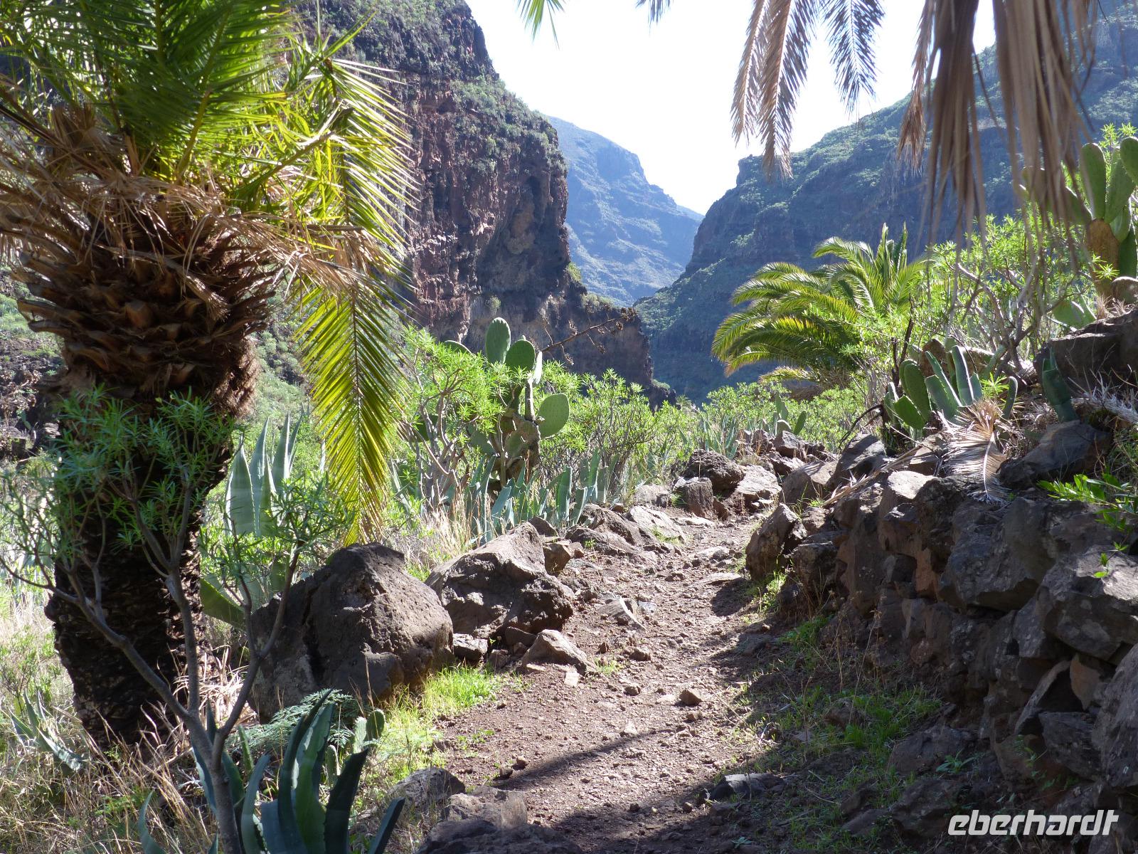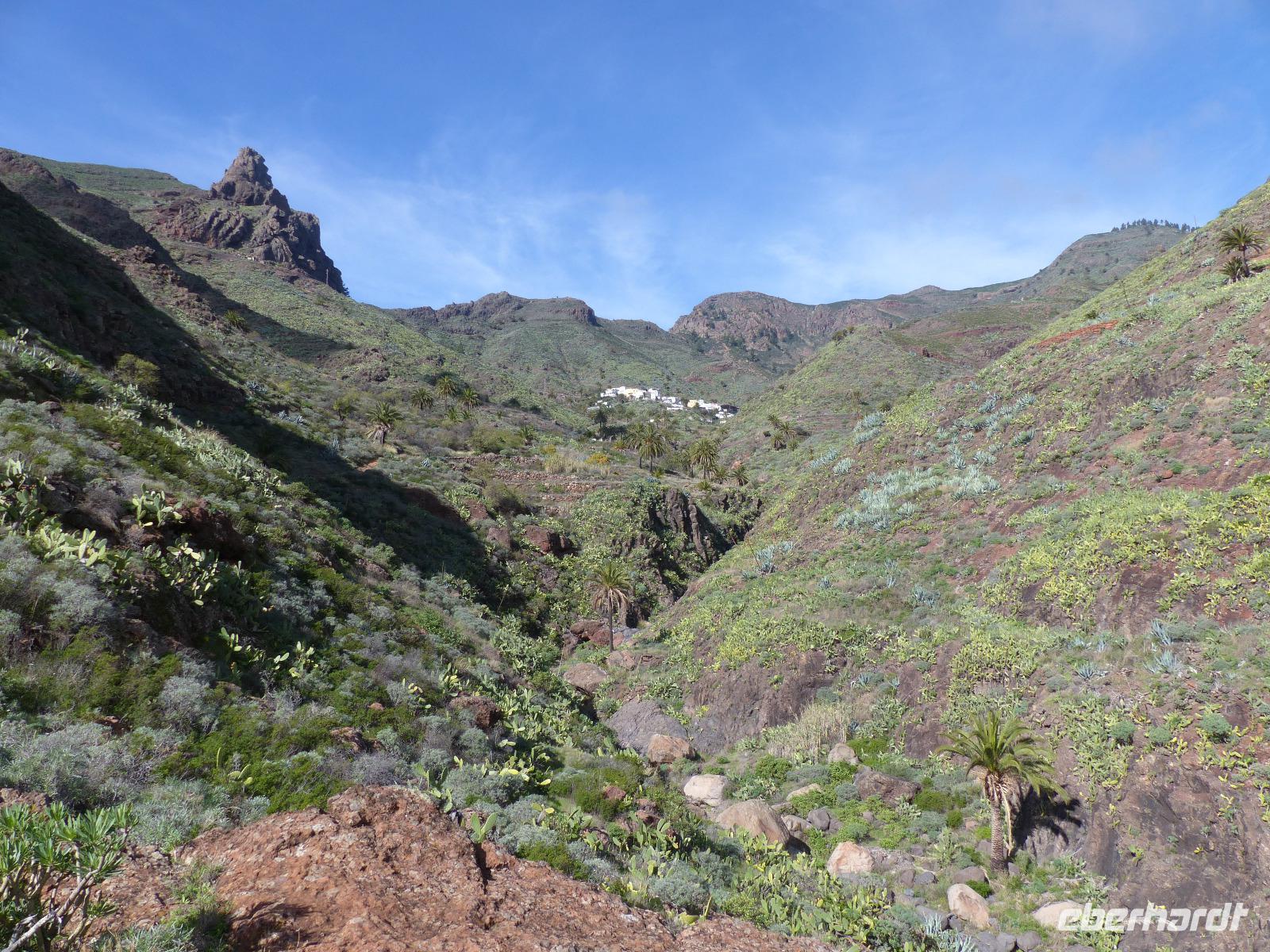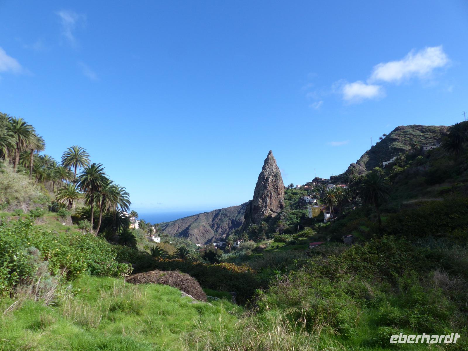 Unser letzter Tag auf La Gomera brach an. Auch heute schien die Sonne in Imada. Und so folgte der Wanderhighlight am letzten Tag: die Palmenschlucht. Vom kleinen Bergdorf führt ein Pfad abwärts durch aufgelassene Terrassenfelder. Blühende Sukkulenten, Agaven, Wolfsmilchgewächse, Opuntien. Und Palmen. Und immer wieder herbstlich verfärbte Laubbäume. Der Weg war nicht ganz einfach, v.a. wenn man nicht schwindelfrei ist und Höhenangst hat. Aber alle kamen mit und schafften es auch ohne Panik diese Stellen zu meistern. Und keiner bereute es, dass er mitgekommen war, so beeindruckend sind die Felswände der Basaltschlucht. Wir ließen uns Zeit und genossen den Abstieg. Je tiefer wir kamen um so mehr Palmen säumten unseren Weg. Unten trennten wir uns. Wer keine Lust auf einen schweißtreibenden Steilaufstieg hatte, folgte der Straße abwärts zum Bus. Der brachte die Genusswanderer nach Playa de Santiago. Die Bergziegen folgten mir steil bergauf. Bizarre Felsen und Höhlen lagen am Wegesrand. Und der Blick auf den Roques Agando wurde frei. Oben machten wir eine Pause und genossen die Aussicht, bevor wir mehrere kleine Weiler durchschritten und schließlich den Bus erreichten. Wir holten die Genusswanderer dann in Playa de Santiago ab und kamen gerade noch rechtzeitig in San Sebastian an, um noch ein Meeresbad in der Sonne nehmen zu können, denn im Dezember verschwindet die Sonne schon relativ früh aus der Bucht. Und nun war Kofferpacken angesagt. Unseren letzten Abend verbrachten wir in einem kleinen Restaurant, wo wir sehr lecker gegessen haben. Und am späten Abend köpften wir noch 2 Flaschen Rebensaft und ließen so diese schöne Reise in guter Stimmung ausklingen. Dann hieß es Abschied nehmen von unserer kleinen hübschen Insel im großen Meer.