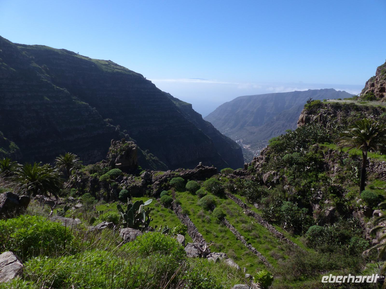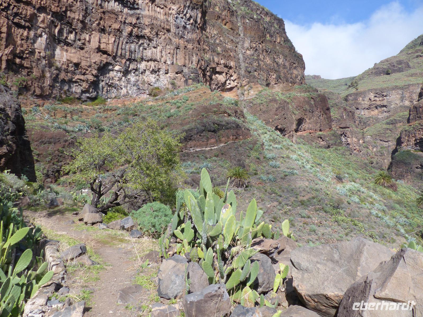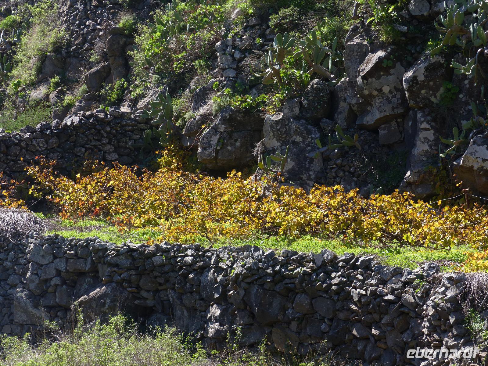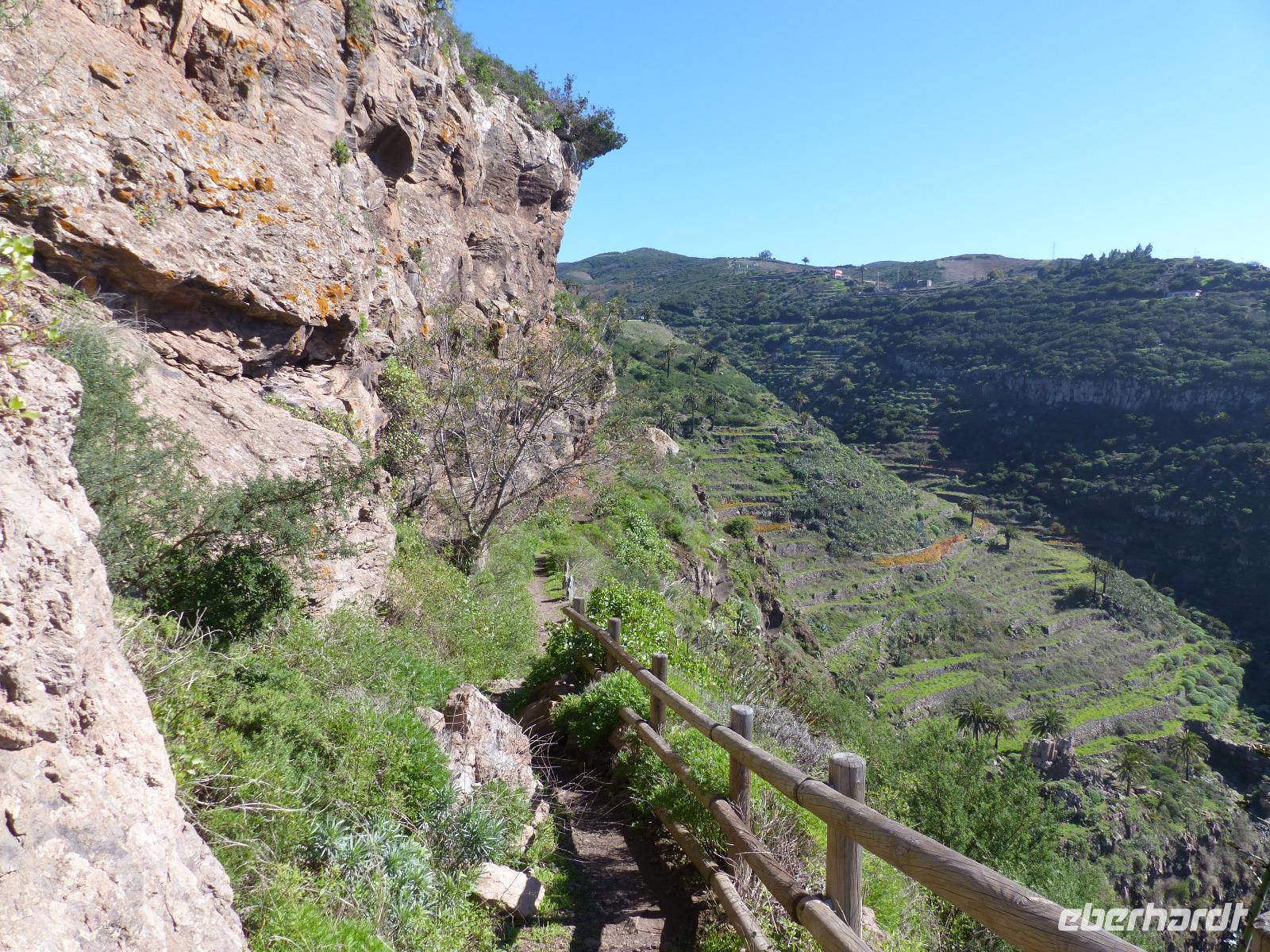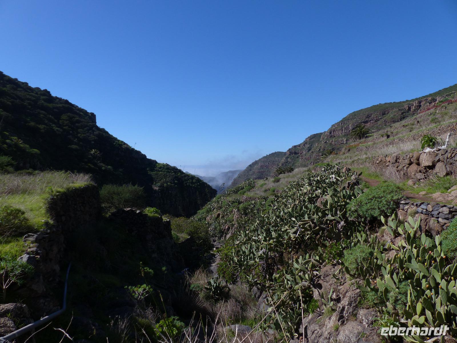 Unser letzter Tag auf La Gomera brach an. Auch heute schien die Sonne in Imada. Und so folgte der Wanderhighlight am letzten Tag: die Palmenschlucht. Vom kleinen Bergdorf führt ein Pfad abwärts durch aufgelassene Terrassenfelder. Blühende Sukkulenten, Agaven, Wolfsmilchgewächse, Opuntien. Und Palmen. Und immer wieder herbstlich verfärbte Laubbäume. Der Weg war nicht ganz einfach, v.a. wenn man nicht schwindelfrei ist und Höhenangst hat. Aber alle kamen mit und schafften es auch ohne Panik diese Stellen zu meistern. Und keiner bereute es, dass er mitgekommen war, so beeindruckend sind die Felswände der Basaltschlucht. Wir ließen uns Zeit und genossen den Abstieg. Je tiefer wir kamen um so mehr Palmen säumten unseren Weg. Unten trennten wir uns. Wer keine Lust auf einen schweißtreibenden Steilaufstieg hatte, folgte der Straße abwärts zum Bus. Der brachte die Genusswanderer nach Playa de Santiago. Die Bergziegen folgten mir steil bergauf. Bizarre Felsen und Höhlen lagen am Wegesrand. Und der Blick auf den Roques Agando wurde frei. Oben machten wir eine Pause und genossen die Aussicht, bevor wir mehrere kleine Weiler durchschritten und schließlich den Bus erreichten. Wir holten die Genusswanderer dann in Playa de Santiago ab und kamen gerade noch rechtzeitig in San Sebastian an, um noch ein Meeresbad in der Sonne nehmen zu können, denn im Dezember verschwindet die Sonne schon relativ früh aus der Bucht. Und nun war Kofferpacken angesagt. Unseren letzten Abend verbrachten wir in einem kleinen Restaurant, wo wir sehr lecker gegessen haben. Und am späten Abend köpften wir noch 2 Flaschen Rebensaft und ließen so diese schöne Reise in guter Stimmung ausklingen. Dann hieß es Abschied nehmen von unserer kleinen hübschen Insel im großen Meer.