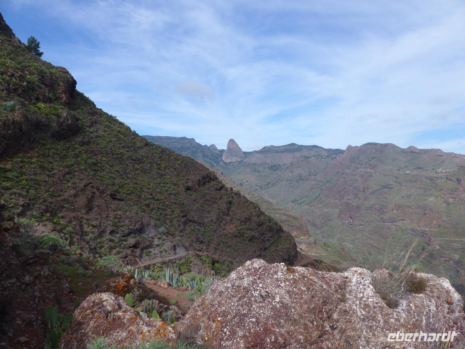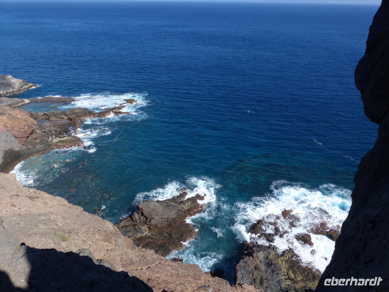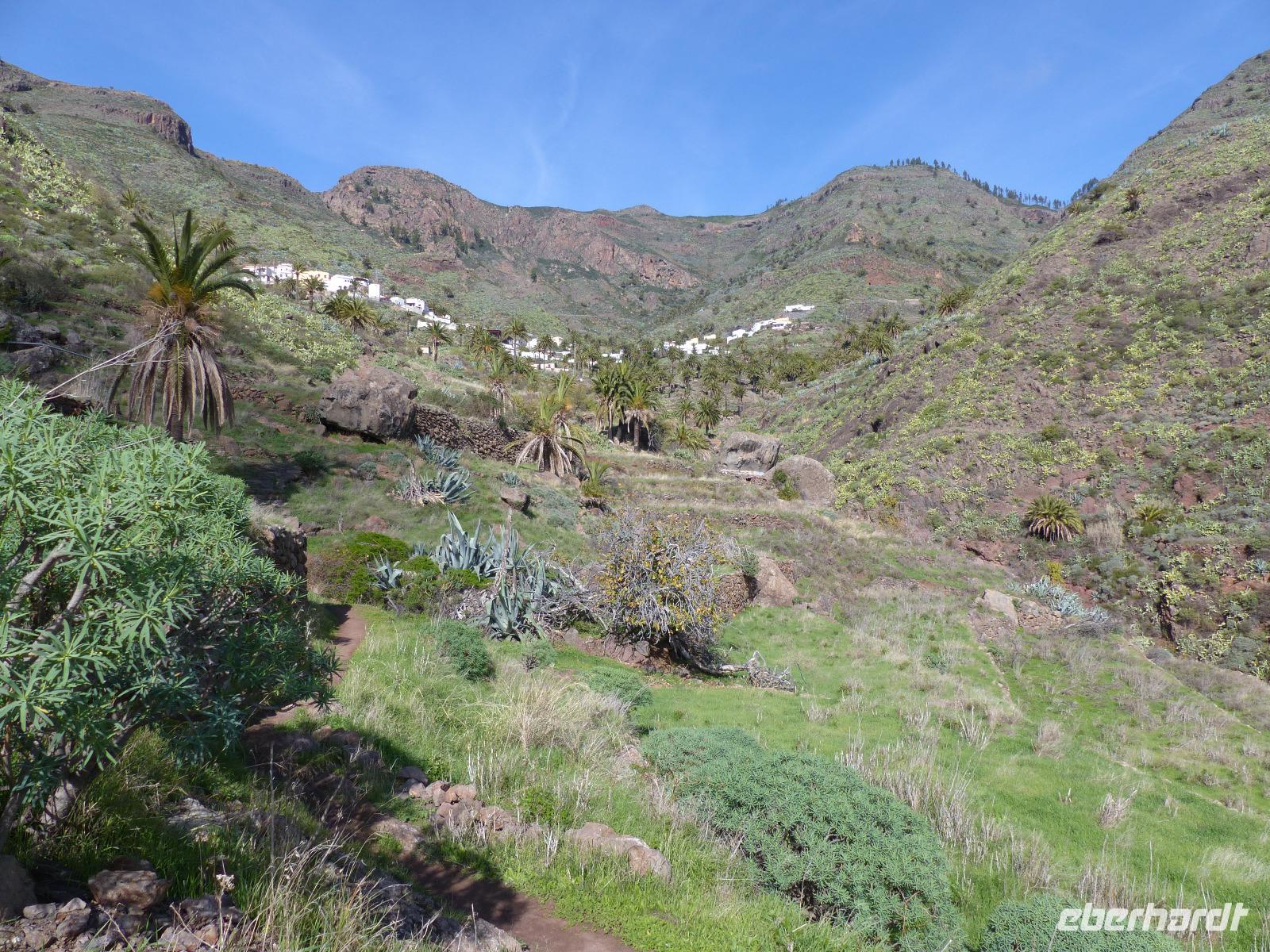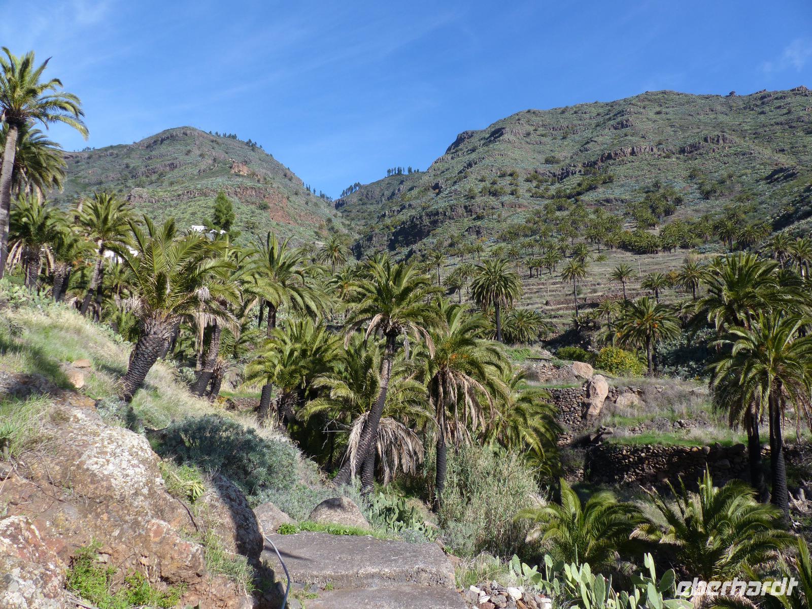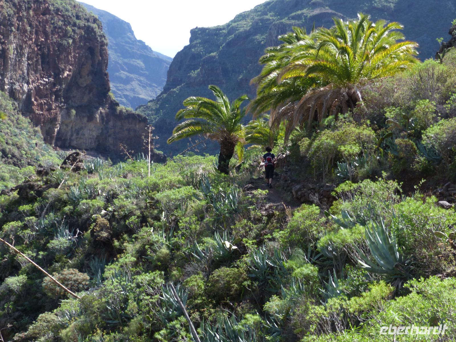 Unser letzter Tag auf La Gomera brach an. Auch heute schien die Sonne in Imada. Und so folgte der Wanderhighlight am letzten Tag: die Palmenschlucht. Vom kleinen Bergdorf führt ein Pfad abwärts durch aufgelassene Terrassenfelder. Blühende Sukkulenten, Agaven, Wolfsmilchgewächse, Opuntien. Und Palmen. Und immer wieder herbstlich verfärbte Laubbäume. Der Weg war nicht ganz einfach, v.a. wenn man nicht schwindelfrei ist und Höhenangst hat. Aber alle kamen mit und schafften es auch ohne Panik diese Stellen zu meistern. Und keiner bereute es, dass er mitgekommen war, so beeindruckend sind die Felswände der Basaltschlucht. Wir ließen uns Zeit und genossen den Abstieg. Je tiefer wir kamen um so mehr Palmen säumten unseren Weg. Unten trennten wir uns. Wer keine Lust auf einen schweißtreibenden Steilaufstieg hatte, folgte der Straße abwärts zum Bus. Der brachte die Genusswanderer nach Playa de Santiago. Die Bergziegen folgten mir steil bergauf. Bizarre Felsen und Höhlen lagen am Wegesrand. Und der Blick auf den Roques Agando wurde frei. Oben machten wir eine Pause und genossen die Aussicht, bevor wir mehrere kleine Weiler durchschritten und schließlich den Bus erreichten. Wir holten die Genusswanderer dann in Playa de Santiago ab und kamen gerade noch rechtzeitig in San Sebastian an, um noch ein Meeresbad in der Sonne nehmen zu können, denn im Dezember verschwindet die Sonne schon relativ früh aus der Bucht. Und nun war Kofferpacken angesagt. Unseren letzten Abend verbrachten wir in einem kleinen Restaurant, wo wir sehr lecker gegessen haben. Und am späten Abend köpften wir noch 2 Flaschen Rebensaft und ließen so diese schöne Reise in guter Stimmung ausklingen. Dann hieß es Abschied nehmen von unserer kleinen hübschen Insel im großen Meer.