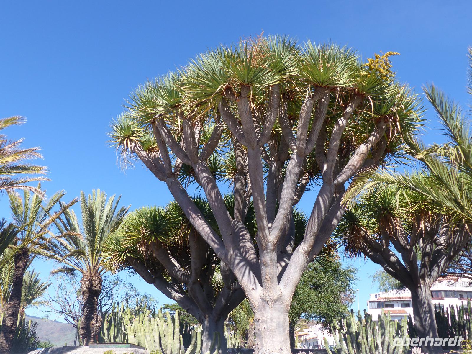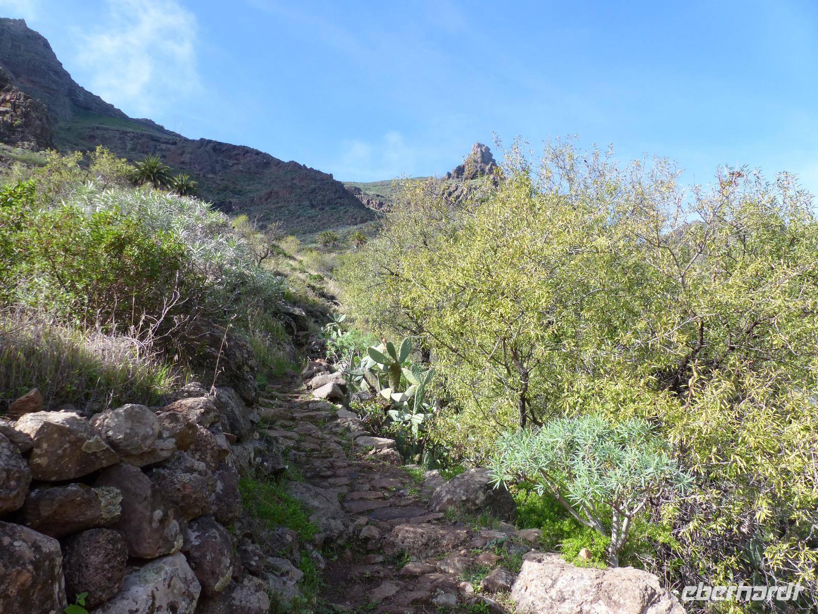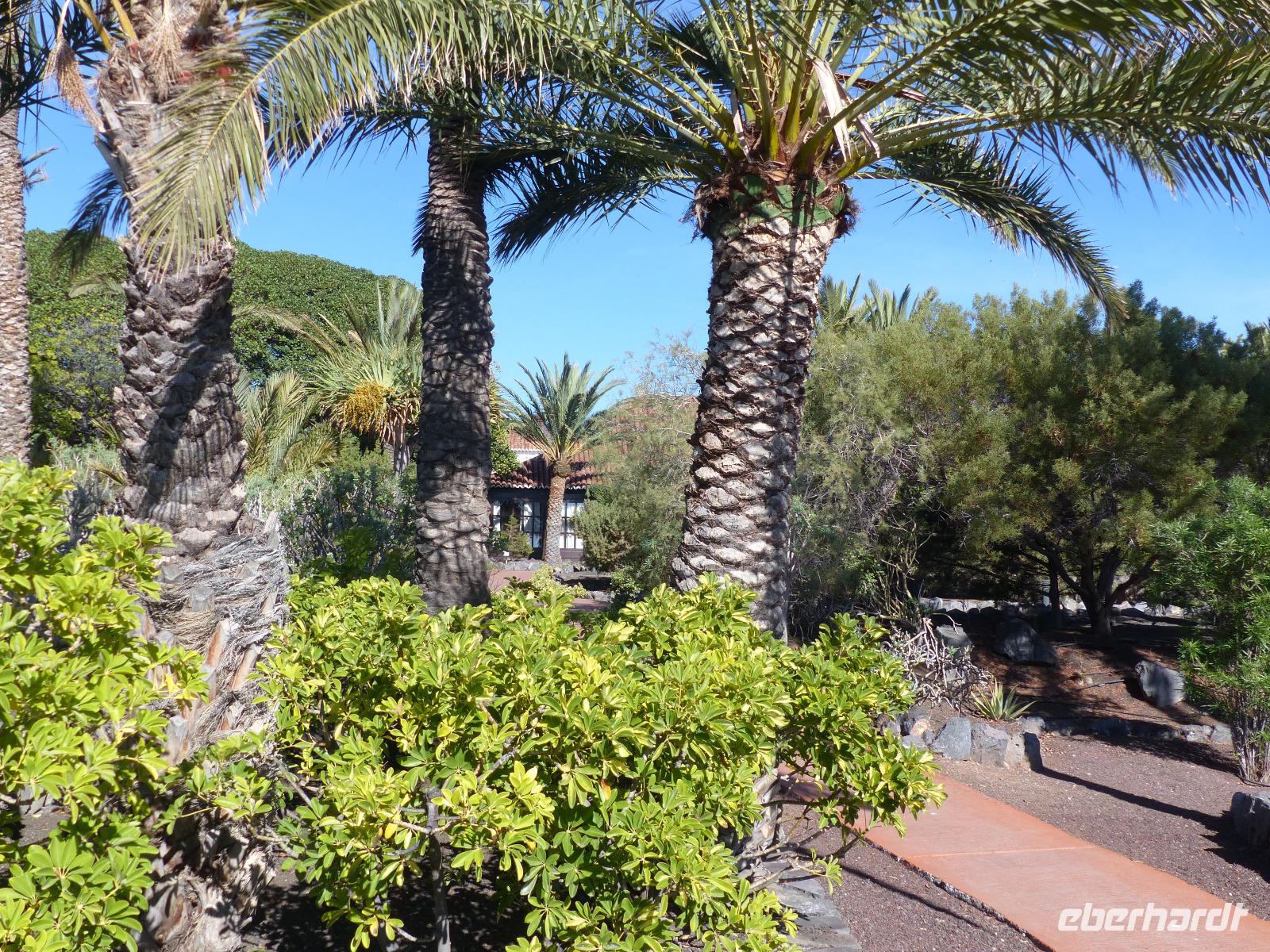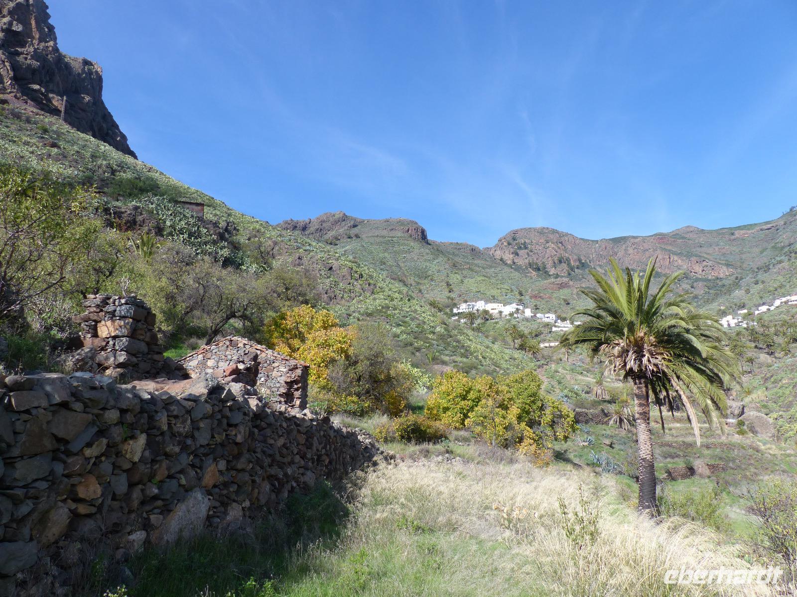 Unser letzter Tag auf La Gomera brach an. Auch heute schien die Sonne in Imada. Und so folgte der Wanderhighlight am letzten Tag: die Palmenschlucht. Vom kleinen Bergdorf führt ein Pfad abwärts durch aufgelassene Terrassenfelder. Blühende Sukkulenten, Agaven, Wolfsmilchgewächse, Opuntien. Und Palmen. Und immer wieder herbstlich verfärbte Laubbäume. Der Weg war nicht ganz einfach, v.a. wenn man nicht schwindelfrei ist und Höhenangst hat. Aber alle kamen mit und schafften es auch ohne Panik diese Stellen zu meistern. Und keiner bereute es, dass er mitgekommen war, so beeindruckend sind die Felswände der Basaltschlucht. Wir ließen uns Zeit und genossen den Abstieg. Je tiefer wir kamen um so mehr Palmen säumten unseren Weg. Unten trennten wir uns. Wer keine Lust auf einen schweißtreibenden Steilaufstieg hatte, folgte der Straße abwärts zum Bus. Der brachte die Genusswanderer nach Playa de Santiago. Die Bergziegen folgten mir steil bergauf. Bizarre Felsen und Höhlen lagen am Wegesrand. Und der Blick auf den Roques Agando wurde frei. Oben machten wir eine Pause und genossen die Aussicht, bevor wir mehrere kleine Weiler durchschritten und schließlich den Bus erreichten. Wir holten die Genusswanderer dann in Playa de Santiago ab und kamen gerade noch rechtzeitig in San Sebastian an, um noch ein Meeresbad in der Sonne nehmen zu können, denn im Dezember verschwindet die Sonne schon relativ früh aus der Bucht. Und nun war Kofferpacken angesagt. Unseren letzten Abend verbrachten wir in einem kleinen Restaurant, wo wir sehr lecker gegessen haben. Und am späten Abend köpften wir noch 2 Flaschen Rebensaft und ließen so diese schöne Reise in guter Stimmung ausklingen. Dann hieß es Abschied nehmen von unserer kleinen hübschen Insel im großen Meer.
