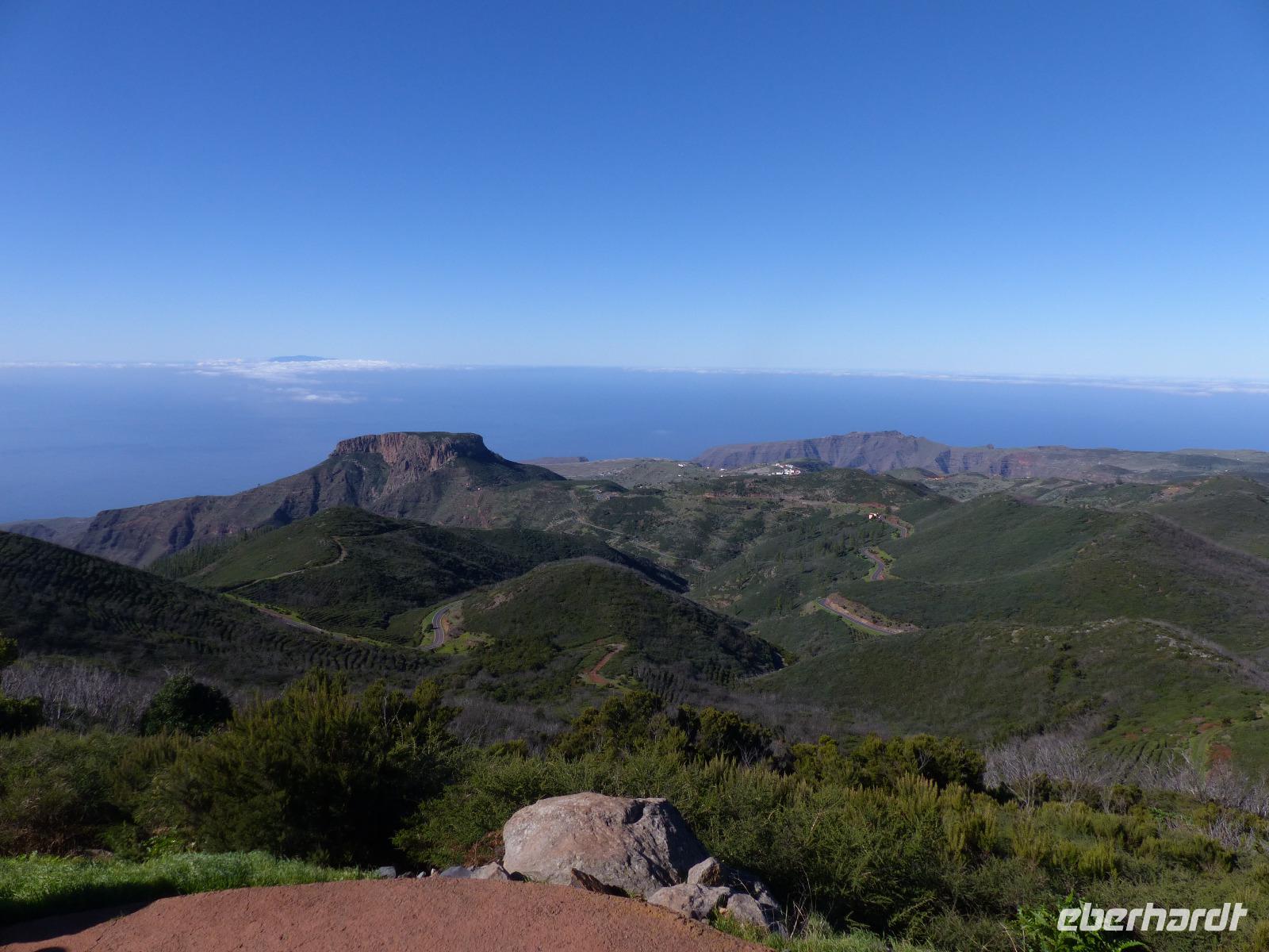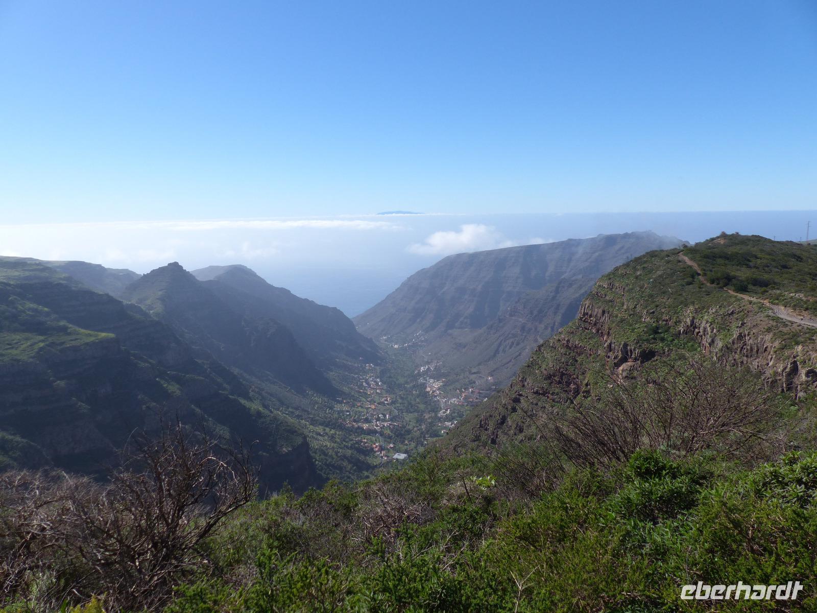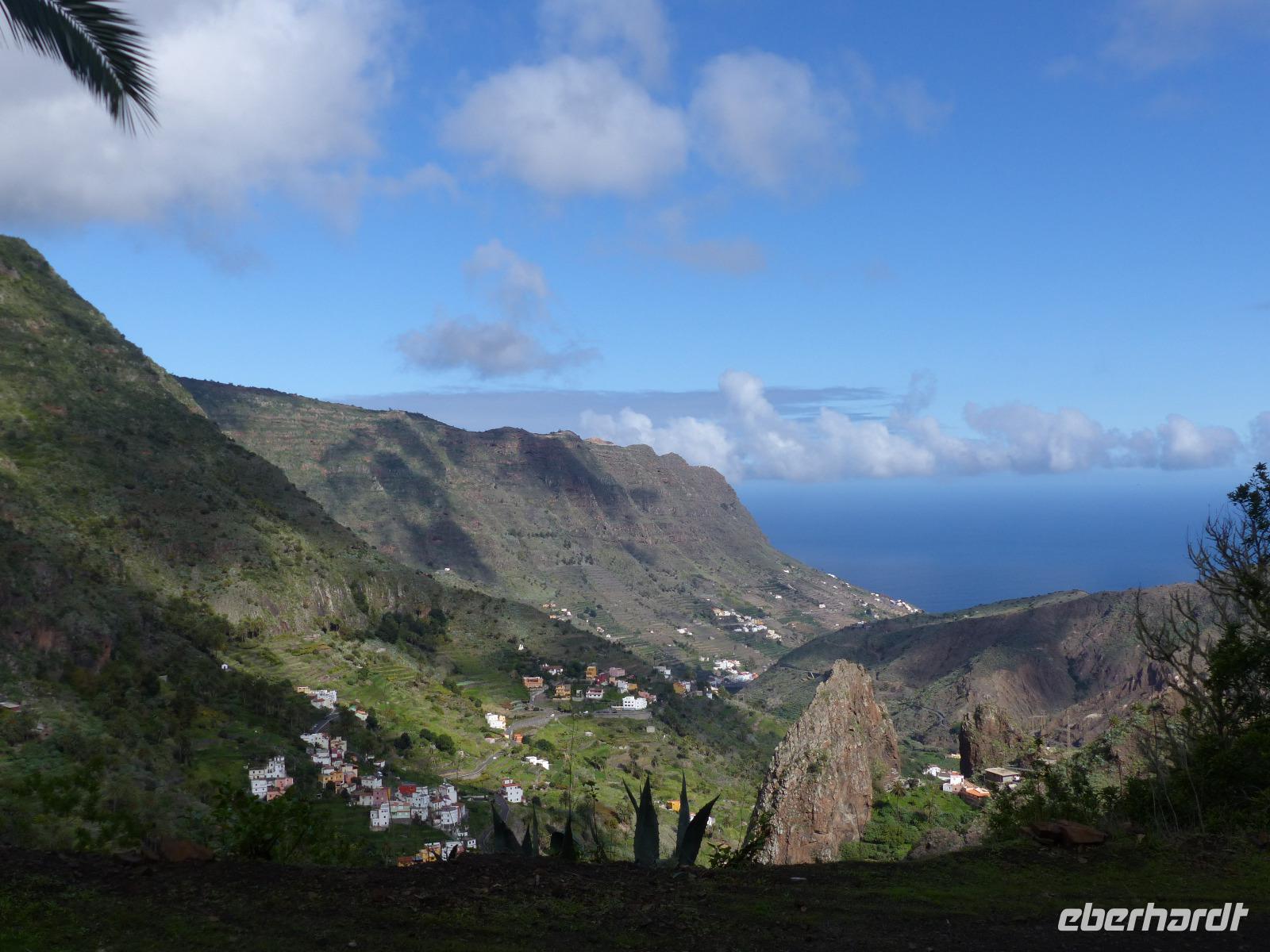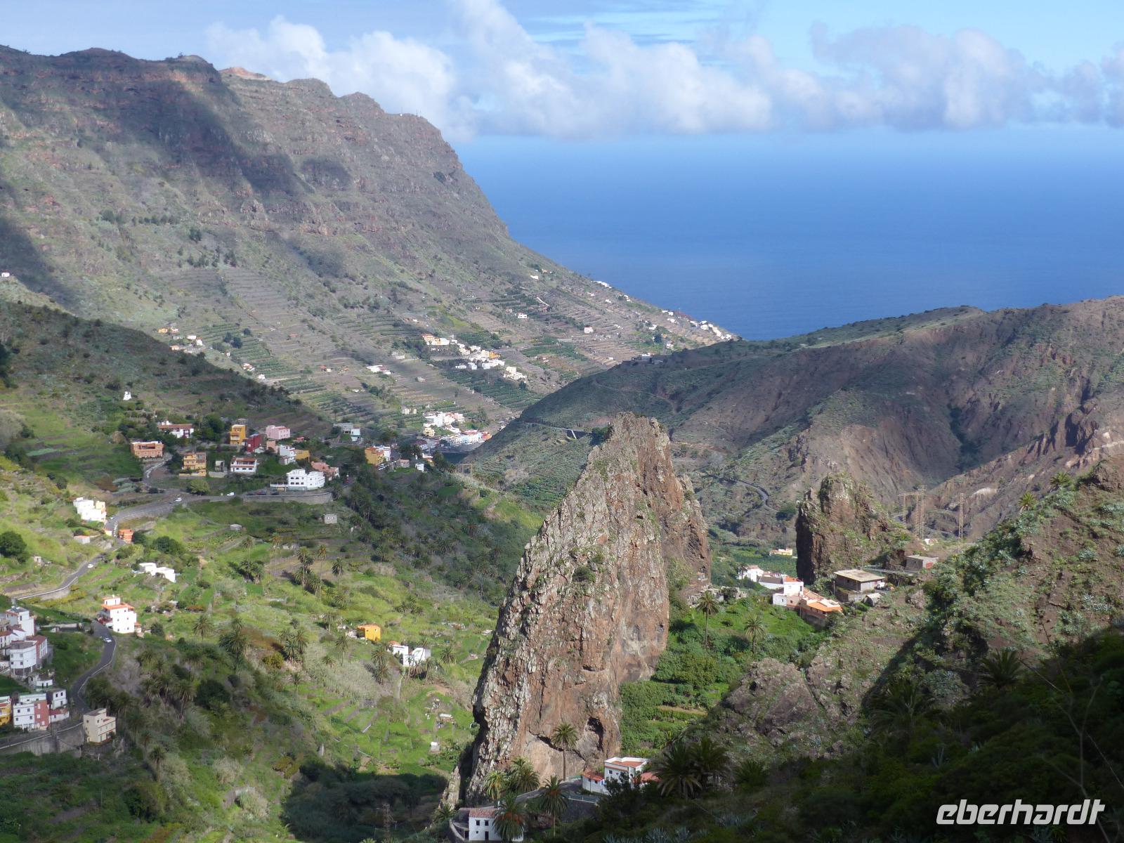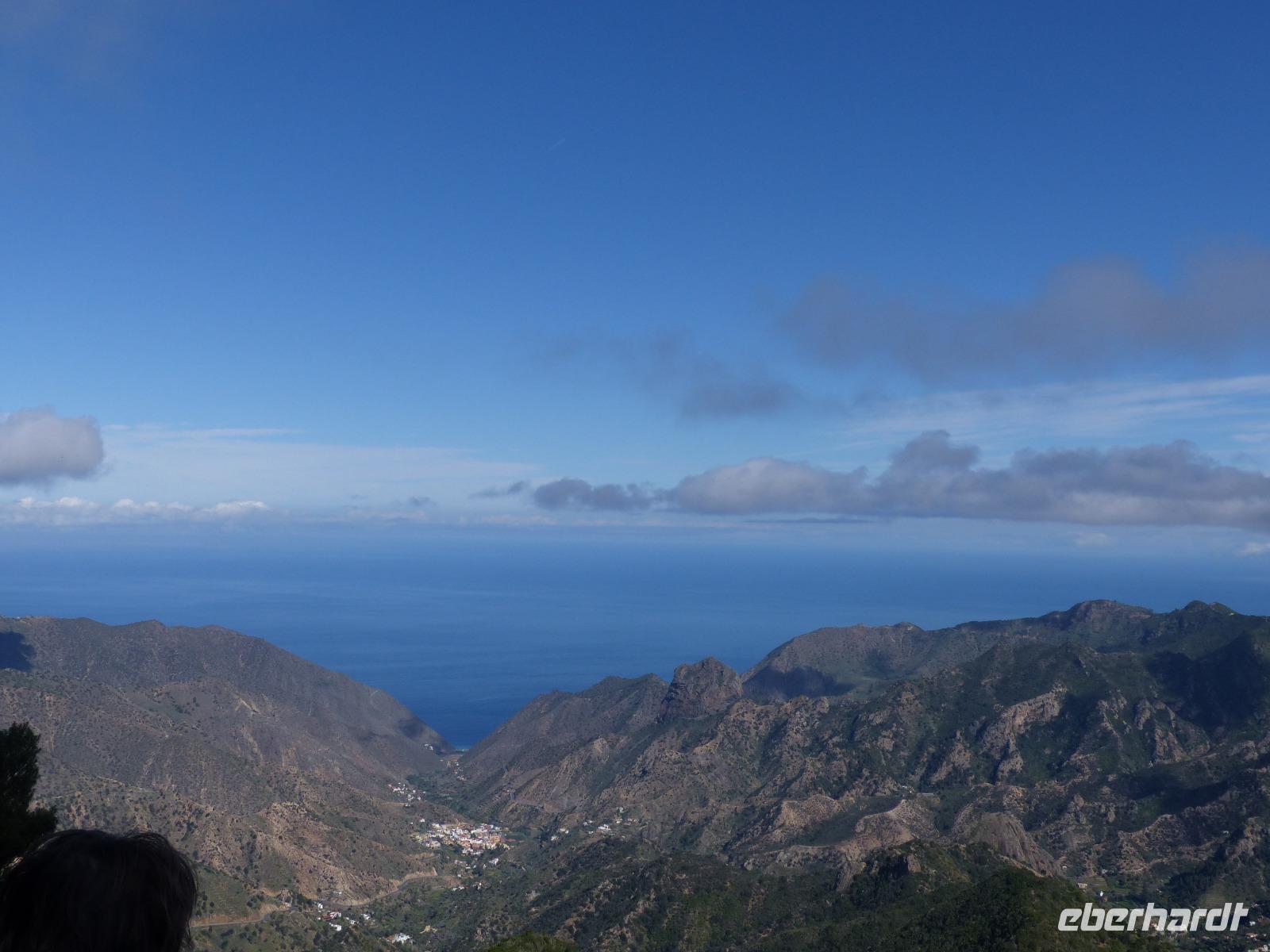 Dann meldeten sich unsere Mägen und wir ließen uns herrliche Vorspeisen in einem kleinen Restaurant in Hermingua gut munden. Hermingua bot uns bei strahlender Sonne gutes Essen, eine hübsche Kirche und viele Blüten. An diesen Ort erinnern wir uns gerne! Und bald schon zogen wir weiter, denn Highlights hatten wir heute jede Menge auf dem Programm. Agulo. Das schönste Dorf der Insel. Wir machten einen Spaziergang durch die malerischen Gassen, bevor sich unser Bus den Steilhang hoch zum Aussichtspunkt Mirador de Abrante quälte. Ein gewagtes Gebäude mit einem 7 m langen Arm, der über eine Felswand hinausragt und der einen Glasboden hat. Der Pächter Fred Olsen bietet erfreulicherweise Gastronomie an - man kann aber man muss nicht! Auch Nicht-Restaurant-Gäste dürfen den Glasarm betreten. Eine schöne Geste, die wir zu schätzen wussten. Aber nun rückten uns wieder die Wolken auf die Pelle und Carlos, unser freundlicher Fahrer, brachte uns gegen Abend wieder zurück nach San Sebastian. Wieder ein toller Tag! So hatten wir uns das vorgestellt...