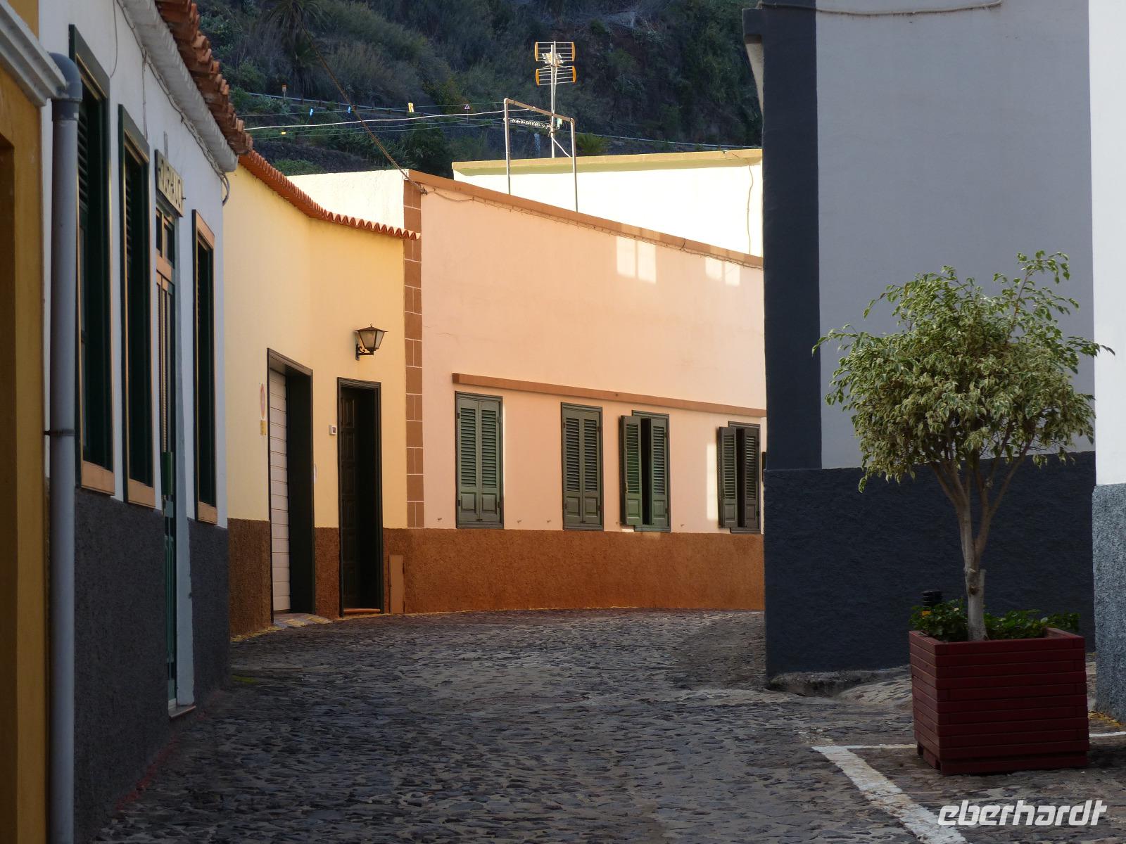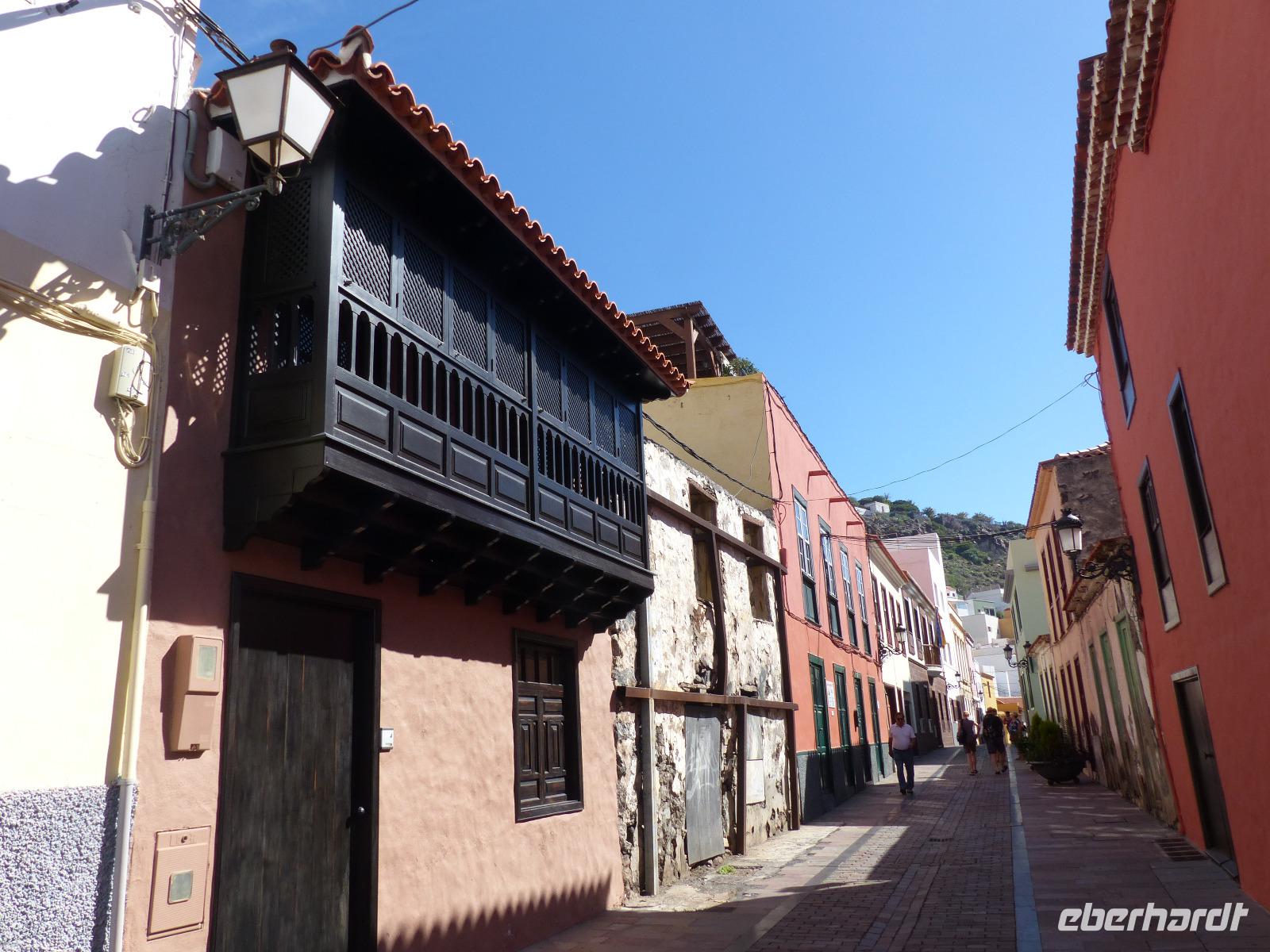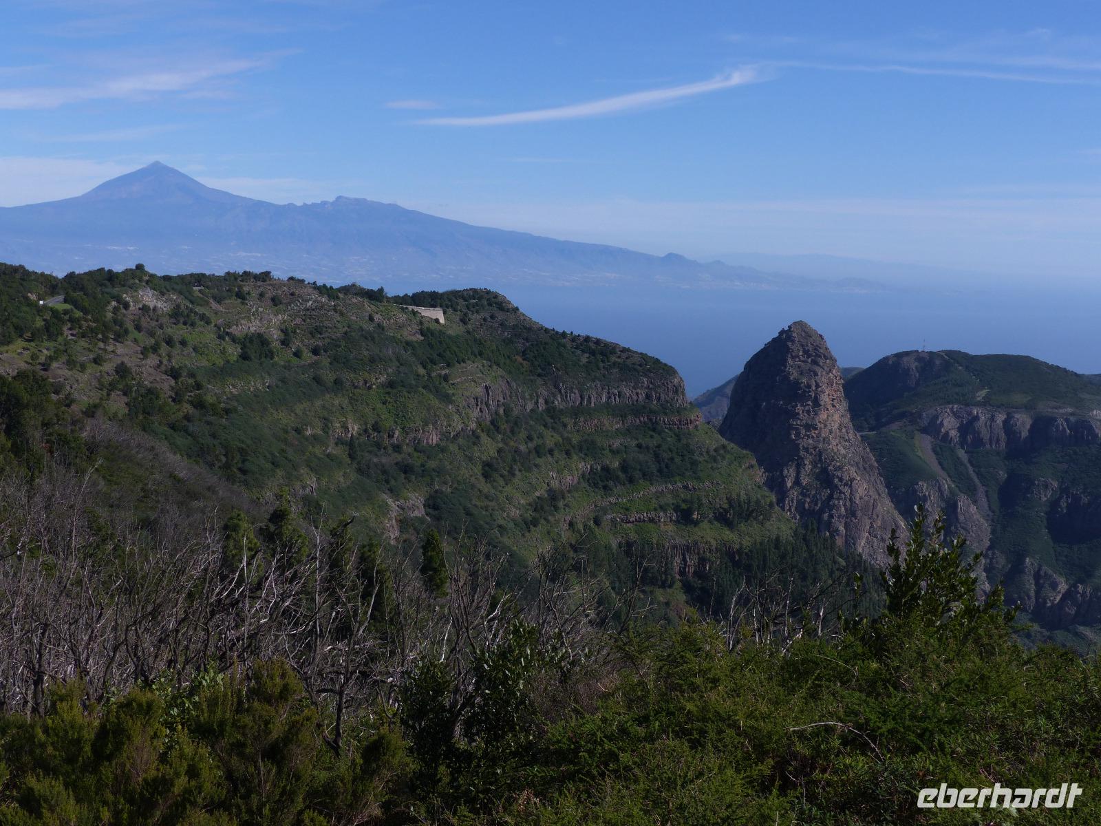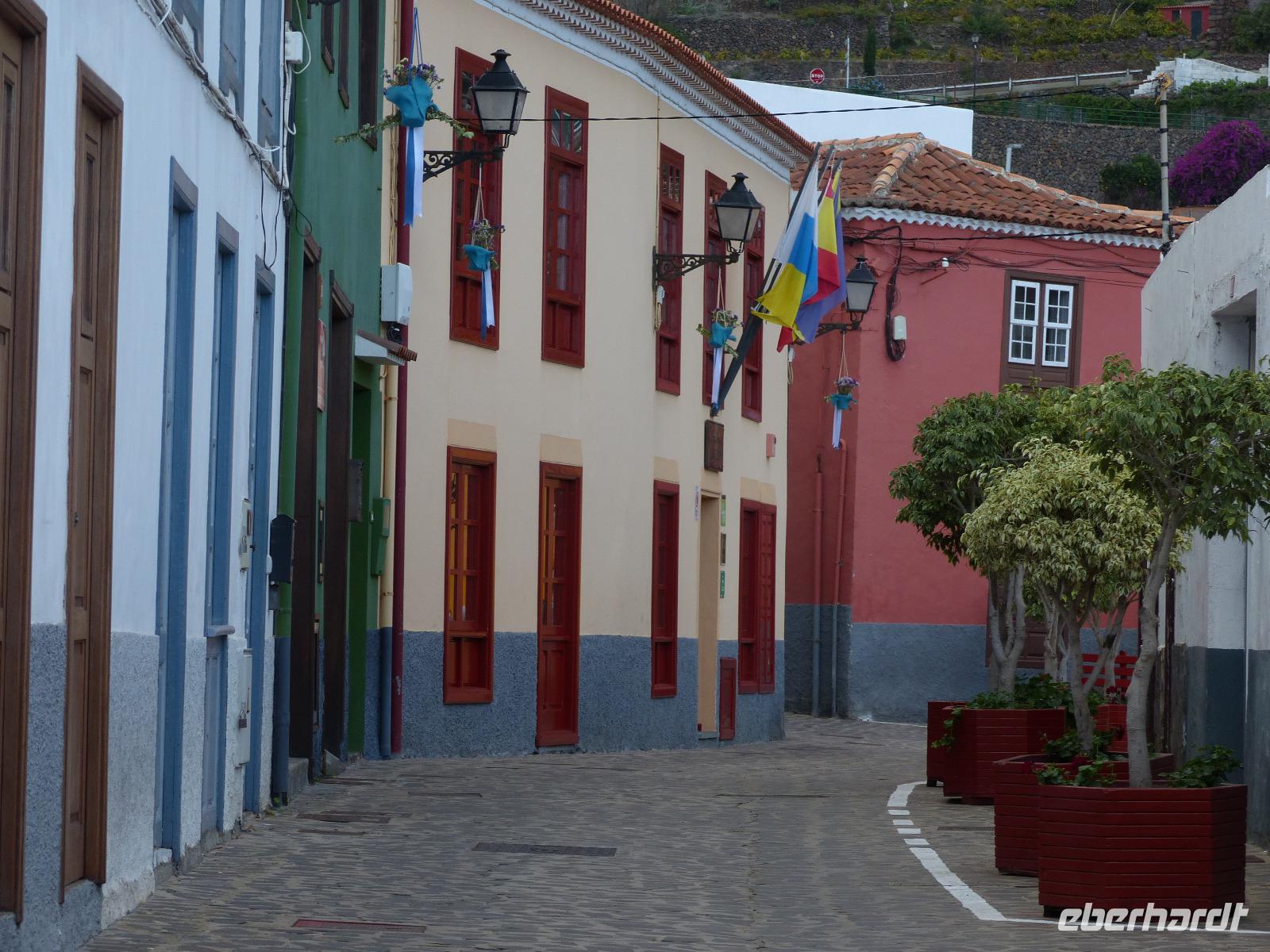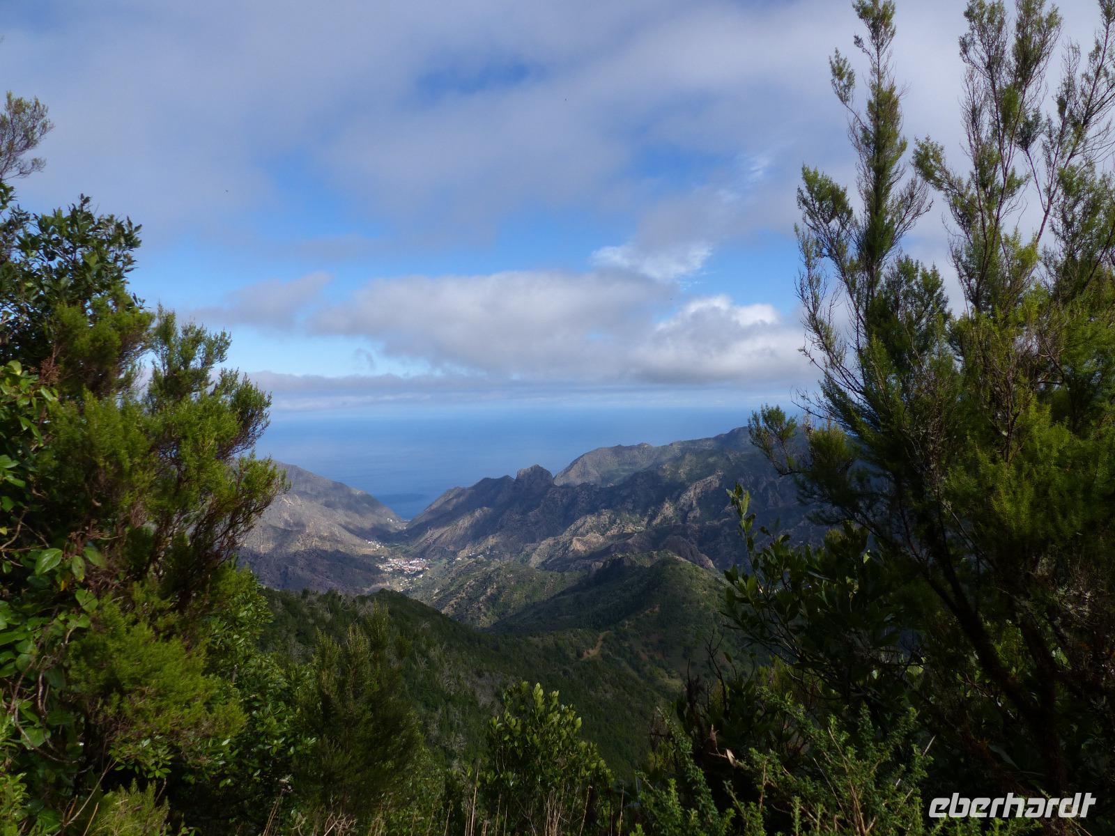 Dann meldeten sich unsere Mägen und wir ließen uns herrliche Vorspeisen in einem kleinen Restaurant in Hermingua gut munden. Hermingua bot uns bei strahlender Sonne gutes Essen, eine hübsche Kirche und viele Blüten. An diesen Ort erinnern wir uns gerne! Und bald schon zogen wir weiter, denn Highlights hatten wir heute jede Menge auf dem Programm. Agulo. Das schönste Dorf der Insel. Wir machten einen Spaziergang durch die malerischen Gassen, bevor sich unser Bus den Steilhang hoch zum Aussichtspunkt Mirador de Abrante quälte. Ein gewagtes Gebäude mit einem 7 m langen Arm, der über eine Felswand hinausragt und der einen Glasboden hat. Der Pächter Fred Olsen bietet erfreulicherweise Gastronomie an - man kann aber man muss nicht! Auch Nicht-Restaurant-Gäste dürfen den Glasarm betreten. Eine schöne Geste, die wir zu schätzen wussten. Aber nun rückten uns wieder die Wolken auf die Pelle und Carlos, unser freundlicher Fahrer, brachte uns gegen Abend wieder zurück nach San Sebastian. Wieder ein toller Tag! So hatten wir uns das vorgestellt...