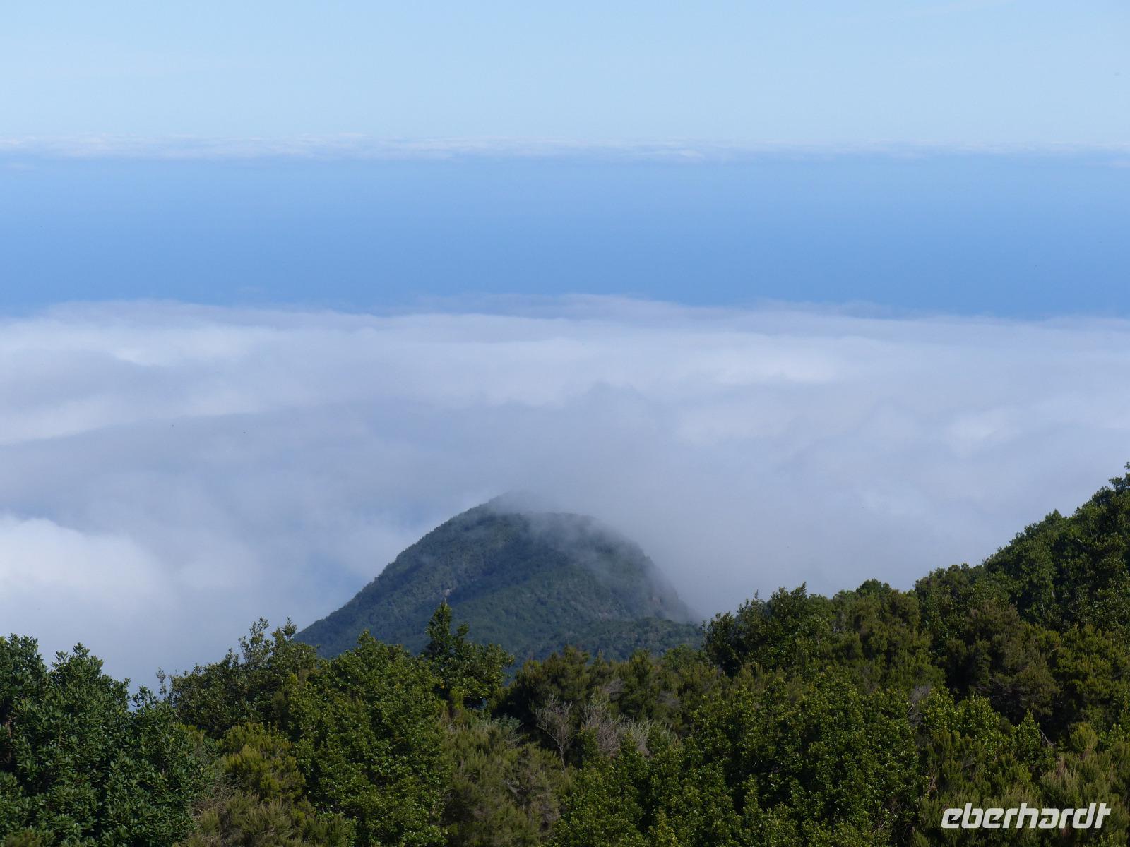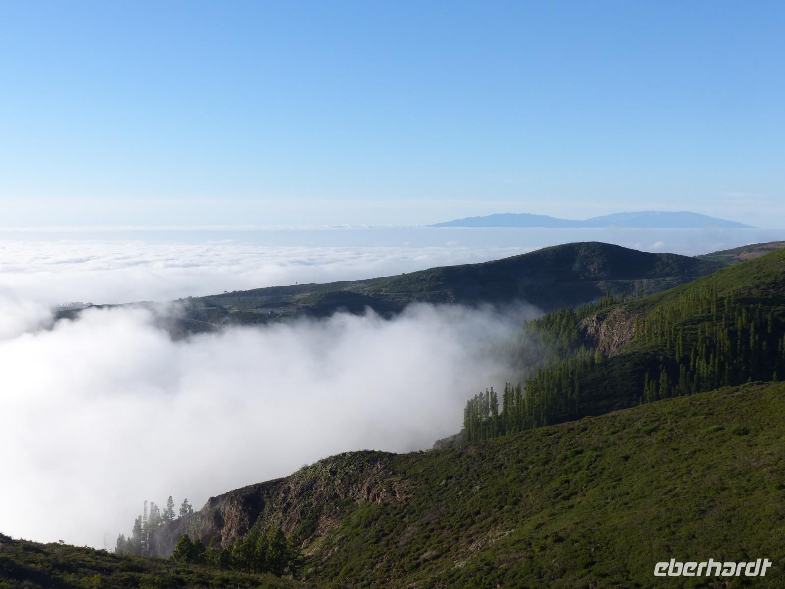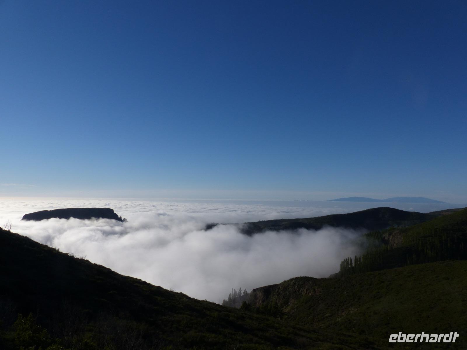 Die Wettervorhersage war nicht einheitlich. Jede App sagte etwas anderes. Aber schließlich glaubte ich der richtigen App: Heute sollte der schönste Tag der Woche werden, verkündete sie. Tief strahlend blauer Himmel. Ich warf also alle Pläne über den Haufen und pickte aus 2 Wanderungen die Highlight heraus. Was man hat, das hat man! Und so hatte unser Carlos heute einen relativ langen Arbeitstag. Wir fuhren nach Pajarito und stiegen hoch aufs Dach der Insel, auf den höchsten Berg La Gomeras, den Garajonay. Benannt wurde er nach Gara und Jonay, die beiden „Romeo und Julia" von La Gomera. Strahlendes Blau umgab uns. Weit schweifte unser Blick: Wir konnten Gran Canaria sehen, Teneriffa, La Palma und El Hierro. Die Gipfel aller Inseln, die uns umgaben, ragten aus dem Dunst hervor. Wir konnten uns kaum satt sehen. Einziger Wehrmutstropfen an diesem Morgen: mein Handy klingelte und uns wurde die Walbeobachtungstour am folgenden Tag abgesagt. Kein Kapitän zu finden, so lautete die Begründung, die mich ein bisschen ärgerte. Aber das Wetter war viel zu schön, um sich lange zu ärgern. Zurück zum Bus, brachte uns Carlos wieder nach Las Hayas. „Nun kann ich sagen, dass ich den gleichen Lokus besucht habe wie Angela Merkel," war der Kommentar den ich erhielt, als ich die Gruppe für dringliche Fälle in ein bekanntes Restaurant abkommandierte, in dem Angela Merkel auch schon zu Gast war, wie man uns stolz berichtete. Dann zogen wir los zu einem Aussichtspunkt mit atemberaubendem Blick ins Valle Gran Rey, das Tal des großen Königs, wanderten weiter an Balsaltwänden, bunt belaubten Weinbergen und Kakteen vorüber, durch eine wilde Schlucht und hinauf ins Töpferdorf El Cercato. Das war wie ausgestorben. Alle in kirchlichen Dingen unterwegs?? Nun denn. Hier trafen wir wieder auf unsere Genusswanderer, die diesen Teil der Tour übersprangen. In Chipude durfte ich meine Qualitäten als Servierkraft auf die Probe stellen, denn so eine Gruppe, die dann auch noch Sonderwünsche hat - hmm. Da soll doch dann mal die Reiseleiterin bedienen und abkassieren... Dann warfen wir noch einen Blick in die strahlend weiße Kirche und Carlos fuhr uns dann noch ein Stück, so dass wir uns den Wandweg, der hier ein Stück auf der Teerstraße entlang führt, ersparten und direkt am Fußweg ankamen. Dieser führte uns aufwärts am Rande eines Kiefernwaldes entlang. Eigentlich ist das eine total heiße Ecke. Aber nun krochen die Wolken den Hang hoch und uns war nicht mehr lange zu heiß. In Igualero bot sich uns ein tolles Bild. Wolkensuppe unter uns soweit man sah, das alles ins Abendlicht getaucht, so dass die Wolken richtig leuchteten. Wir wären hier wirklich gerne noch länger geblieben, aber der Tag neigte sich dem Ende zu und Carlos brachte uns wieder zurück nach San Sebastian.