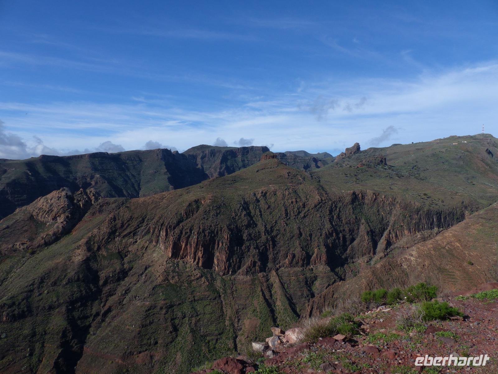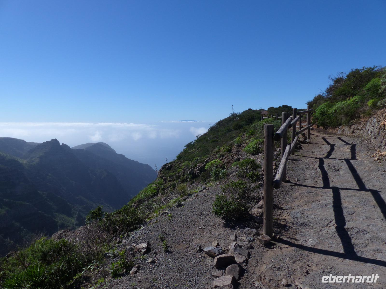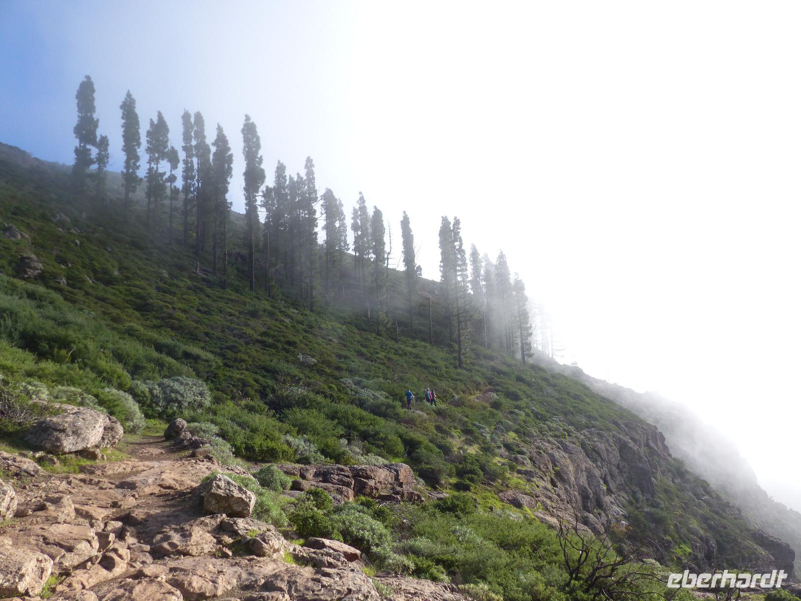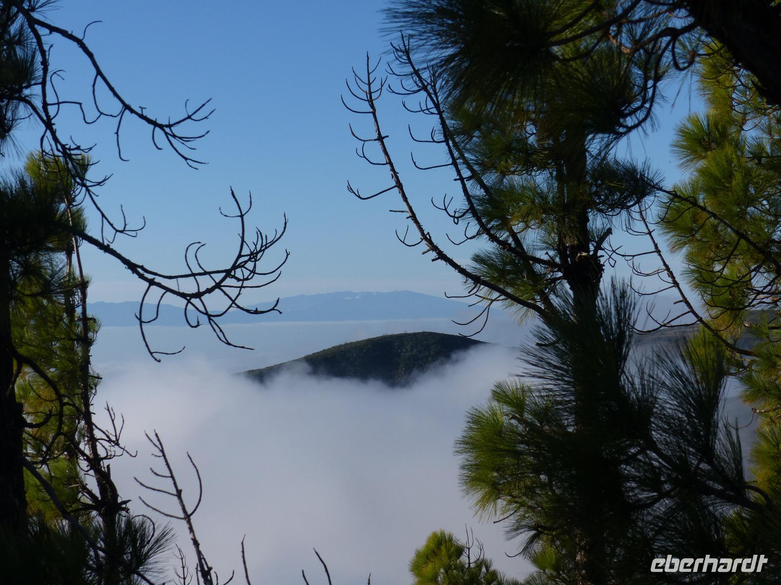 Die Wettervorhersage war nicht einheitlich. Jede App sagte etwas anderes. Aber schließlich glaubte ich der richtigen App: Heute sollte der schönste Tag der Woche werden, verkündete sie. Tief strahlend blauer Himmel. Ich warf also alle Pläne über den Haufen und pickte aus 2 Wanderungen die Highlight heraus. Was man hat, das hat man! Und so hatte unser Carlos heute einen relativ langen Arbeitstag. Wir fuhren nach Pajarito und stiegen hoch aufs Dach der Insel, auf den höchsten Berg La Gomeras, den Garajonay. Benannt wurde er nach Gara und Jonay, die beiden „Romeo und Julia" von La Gomera. Strahlendes Blau umgab uns. Weit schweifte unser Blick: Wir konnten Gran Canaria sehen, Teneriffa, La Palma und El Hierro. Die Gipfel aller Inseln, die uns umgaben, ragten aus dem Dunst hervor. Wir konnten uns kaum satt sehen. Einziger Wehrmutstropfen an diesem Morgen: mein Handy klingelte und uns wurde die Walbeobachtungstour am folgenden Tag abgesagt. Kein Kapitän zu finden, so lautete die Begründung, die mich ein bisschen ärgerte. Aber das Wetter war viel zu schön, um sich lange zu ärgern. Zurück zum Bus, brachte uns Carlos wieder nach Las Hayas. „Nun kann ich sagen, dass ich den gleichen Lokus besucht habe wie Angela Merkel," war der Kommentar den ich erhielt, als ich die Gruppe für dringliche Fälle in ein bekanntes Restaurant abkommandierte, in dem Angela Merkel auch schon zu Gast war, wie man uns stolz berichtete. Dann zogen wir los zu einem Aussichtspunkt mit atemberaubendem Blick ins Valle Gran Rey, das Tal des großen Königs, wanderten weiter an Balsaltwänden, bunt belaubten Weinbergen und Kakteen vorüber, durch eine wilde Schlucht und hinauf ins Töpferdorf El Cercato. Das war wie ausgestorben. Alle in kirchlichen Dingen unterwegs?? Nun denn. Hier trafen wir wieder auf unsere Genusswanderer, die diesen Teil der Tour übersprangen. In Chipude durfte ich meine Qualitäten als Servierkraft auf die Probe stellen, denn so eine Gruppe, die dann auch noch Sonderwünsche hat - hmm. Da soll doch dann mal die Reiseleiterin bedienen und abkassieren... Dann warfen wir noch einen Blick in die strahlend weiße Kirche und Carlos fuhr uns dann noch ein Stück, so dass wir uns den Wandweg, der hier ein Stück auf der Teerstraße entlang führt, ersparten und direkt am Fußweg ankamen. Dieser führte uns aufwärts am Rande eines Kiefernwaldes entlang. Eigentlich ist das eine total heiße Ecke. Aber nun krochen die Wolken den Hang hoch und uns war nicht mehr lange zu heiß. In Igualero bot sich uns ein tolles Bild. Wolkensuppe unter uns soweit man sah, das alles ins Abendlicht getaucht, so dass die Wolken richtig leuchteten. Wir wären hier wirklich gerne noch länger geblieben, aber der Tag neigte sich dem Ende zu und Carlos brachte uns wieder zurück nach San Sebastian.