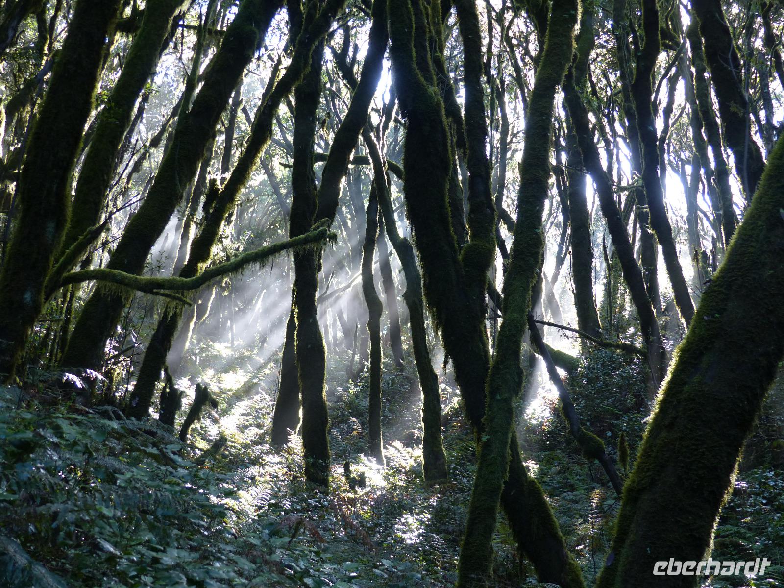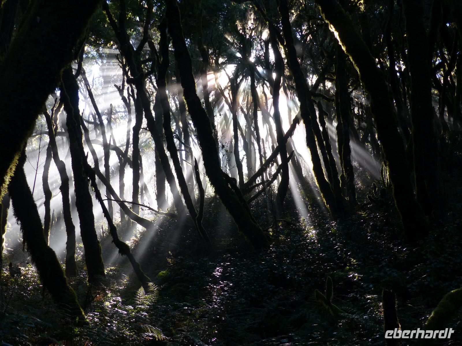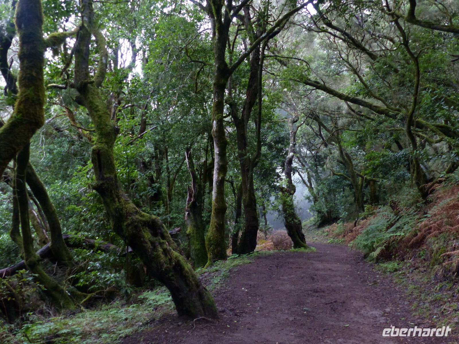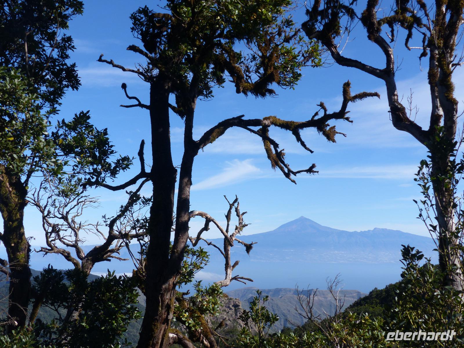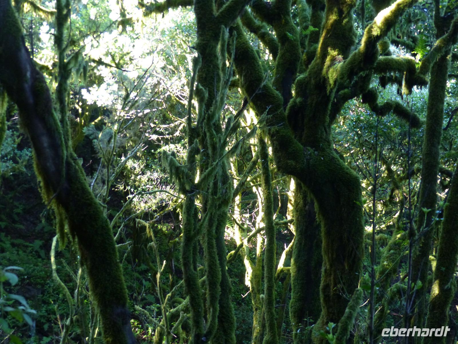 Nach dem Frühstück starteten wir zu unserer ersten Wanderung. Ich hatte die Tour durch den Nebelwald ausgewählt, denn sie ist nicht allzu schwierig und die Wettervorhersage kündigte zwar warmes, aber auch etwas wolkiges Wetter an. Am Morgen sah man nicht viel von den Wolken. Die Sonne strahlte und unser netter Busfahrer Carlos musste bald schon Fotostopps einlegen, denn wir hatten eine herrliche Aussicht nach Teneriffa, als wir ins Gebirge hochfuhren. Blitzblau der Himmel, blitzblau das Meer, leuchtend Grün die Pflanzen und alles überragt vom Teide, der sich am Horizont abzeichnete. Wir starteten schließlich in Las Hayas in rund 1000 Metern Höhe. Da war es dann nicht mehr so warm wie an der Küste und wir trugen sogar Jacken. Gleich hinter dem Dorfrand erreichten wir eine zauberhafte Welt voller bizarr geformter Bäume. Und es war feucht, ein bisschen klamm sogar. Die Pflanzen leben vom Wasser des Nebels. Große Baumheidegewächse und Gagelbäume säumten zunächst unseren Weg, von Flechten und Moosen bedeckt. Dann erreichten wir den Lorbeerwald. Krumme, bizarr geformte Stämme voller Moose schraubten sich in die Höhe und beeindruckten uns sehr. Die Sonne brach durch den Nebel, was uns spektakuläre Fotomotive brachte. Spinnennetze voller Tautropfen, die in der Sonne glitzerten. Und blitzblauen Himmel an der Nordküste, so dass wir von einem Aussichtspunkt aus Hermingua in der Sonne liegen sahen. Farbenfrohe Baumpilze säumten unseren malerischen Weg. Zurück in Las Hayas fuhren wir per Bus nach Arure. Nun waren sie da, die Wolken. Sie verschluckten in Windeseile fast alles. Wir zogen uns zu einem späten Mittagessen in Arure in eine lokale Gaststätte zurück, und kehrten am Nachmittag mit wirklich guter Stimmung zurück in unser Hotel ins immer noch sonnige San Sebastian.