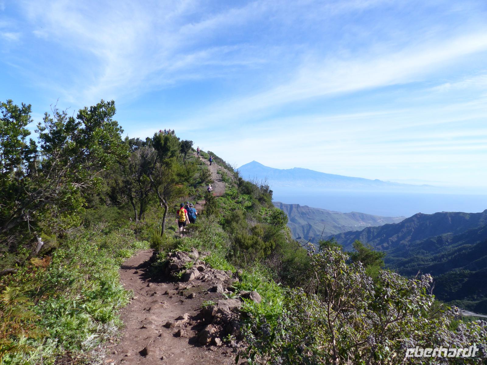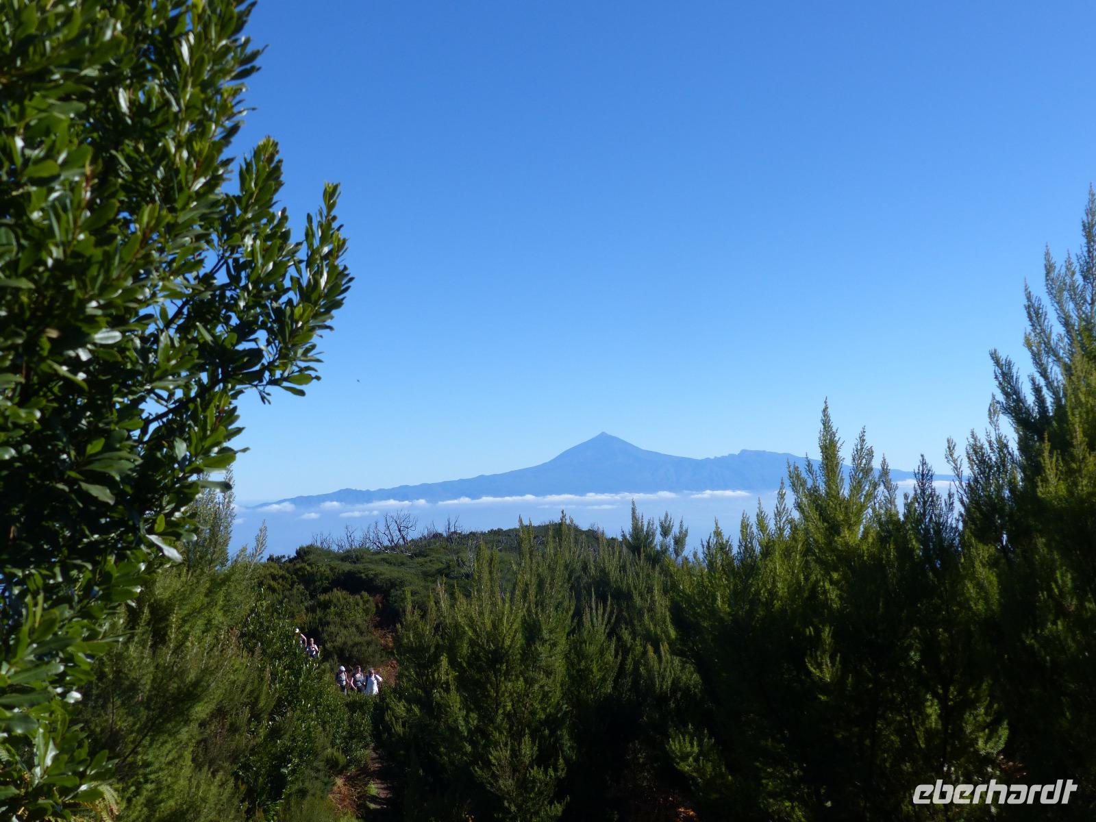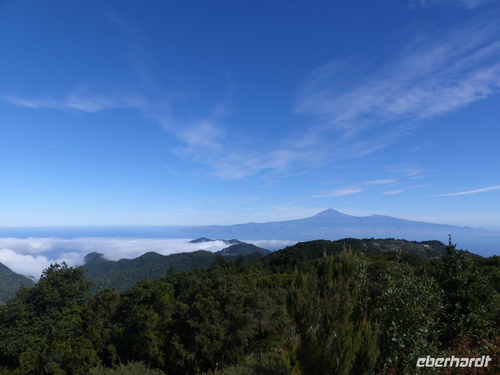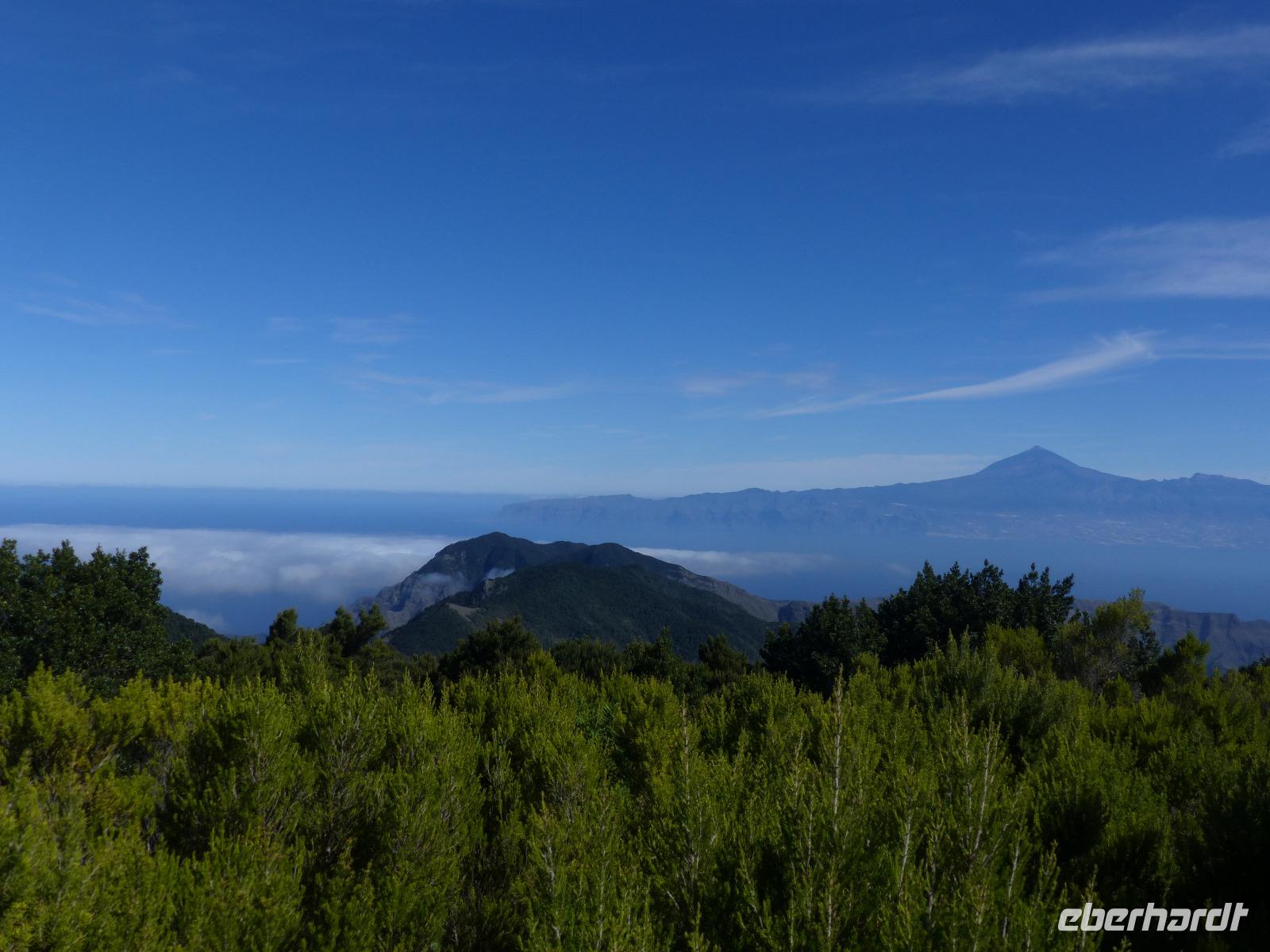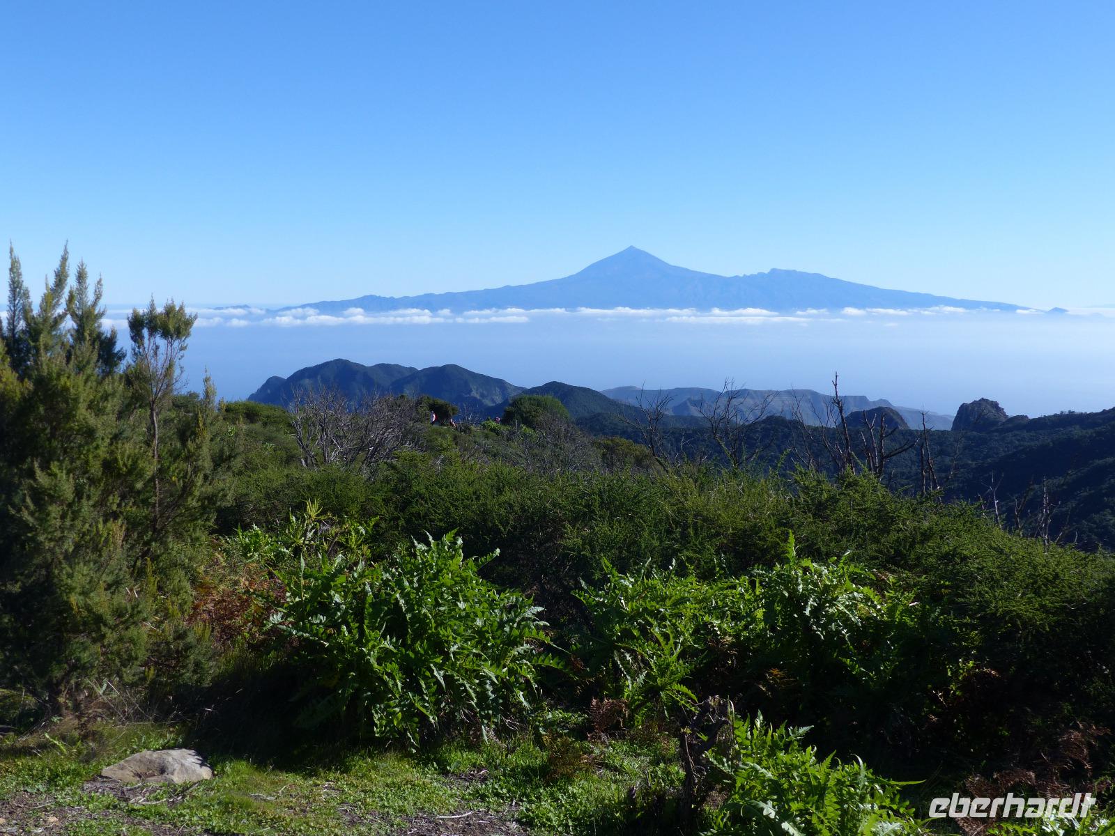 Nach dem Frühstück starteten wir zu unserer ersten Wanderung. Ich hatte die Tour durch den Nebelwald ausgewählt, denn sie ist nicht allzu schwierig und die Wettervorhersage kündigte zwar warmes, aber auch etwas wolkiges Wetter an. Am Morgen sah man nicht viel von den Wolken. Die Sonne strahlte und unser netter Busfahrer Carlos musste bald schon Fotostopps einlegen, denn wir hatten eine herrliche Aussicht nach Teneriffa, als wir ins Gebirge hochfuhren. Blitzblau der Himmel, blitzblau das Meer, leuchtend Grün die Pflanzen und alles überragt vom Teide, der sich am Horizont abzeichnete. Wir starteten schließlich in Las Hayas in rund 1000 Metern Höhe. Da war es dann nicht mehr so warm wie an der Küste und wir trugen sogar Jacken. Gleich hinter dem Dorfrand erreichten wir eine zauberhafte Welt voller bizarr geformter Bäume. Und es war feucht, ein bisschen klamm sogar. Die Pflanzen leben vom Wasser des Nebels. Große Baumheidegewächse und Gagelbäume säumten zunächst unseren Weg, von Flechten und Moosen bedeckt. Dann erreichten wir den Lorbeerwald. Krumme, bizarr geformte Stämme voller Moose schraubten sich in die Höhe und beeindruckten uns sehr. Die Sonne brach durch den Nebel, was uns spektakuläre Fotomotive brachte. Spinnennetze voller Tautropfen, die in der Sonne glitzerten. Und blitzblauen Himmel an der Nordküste, so dass wir von einem Aussichtspunkt aus Hermingua in der Sonne liegen sahen. Farbenfrohe Baumpilze säumten unseren malerischen Weg. Zurück in Las Hayas fuhren wir per Bus nach Arure. Nun waren sie da, die Wolken. Sie verschluckten in Windeseile fast alles. Wir zogen uns zu einem späten Mittagessen in Arure in eine lokale Gaststätte zurück, und kehrten am Nachmittag mit wirklich guter Stimmung zurück in unser Hotel ins immer noch sonnige San Sebastian.
