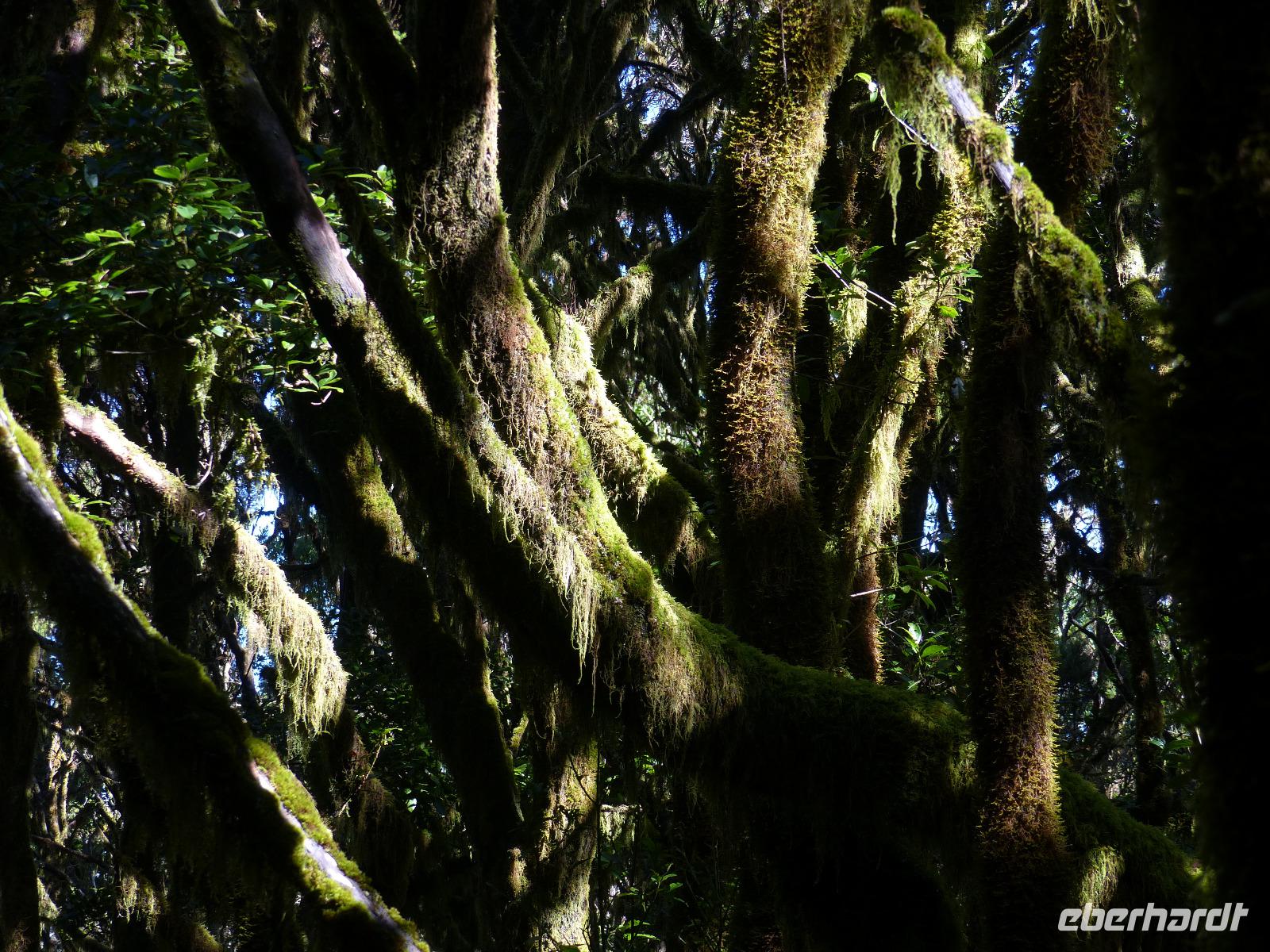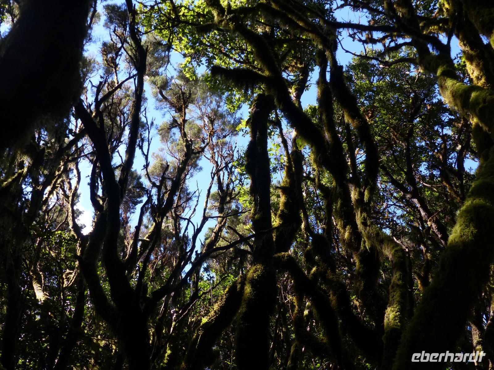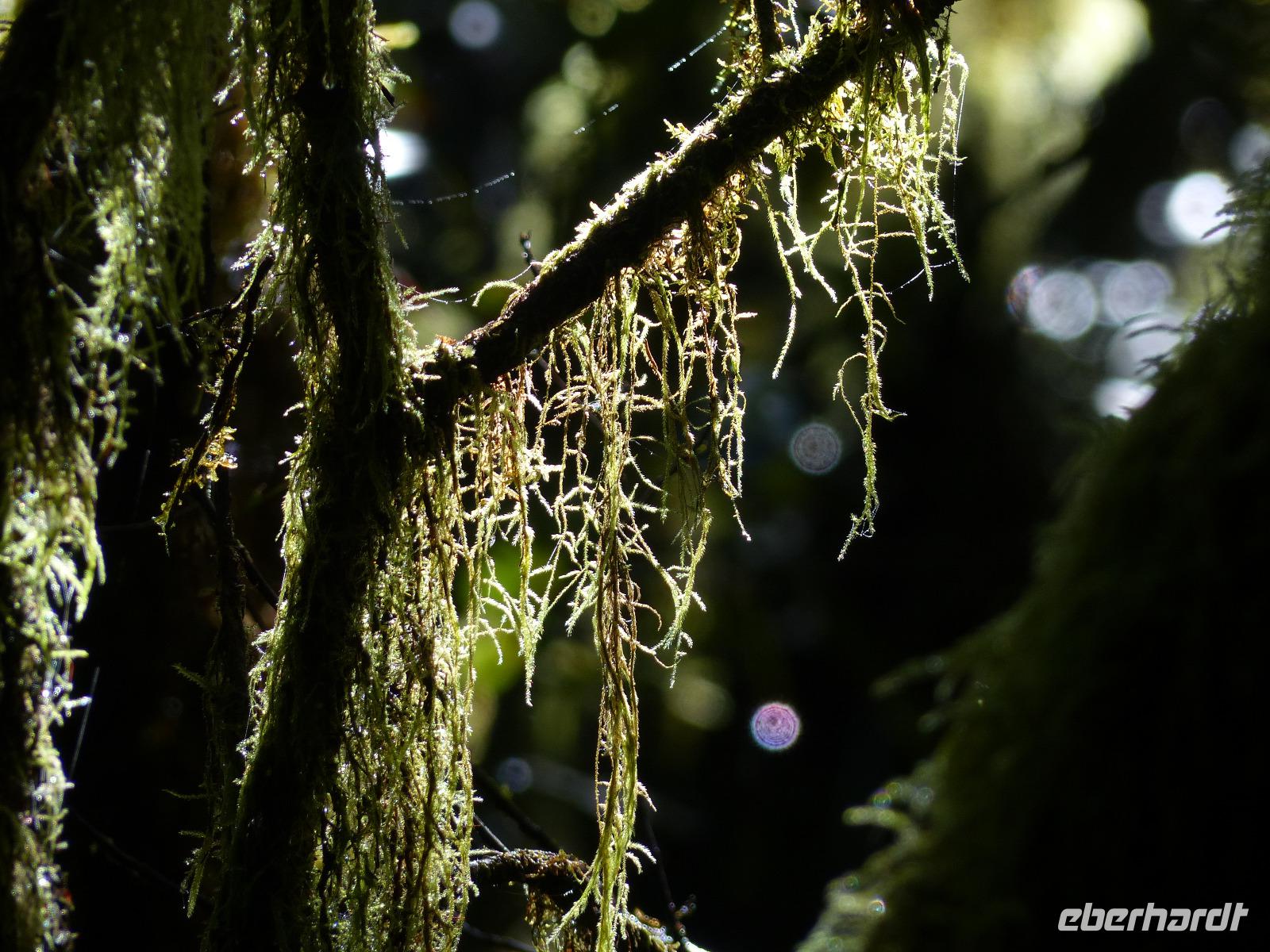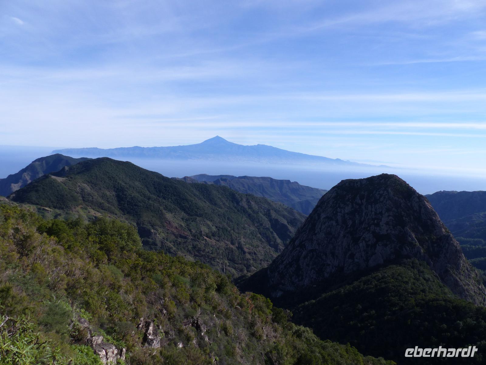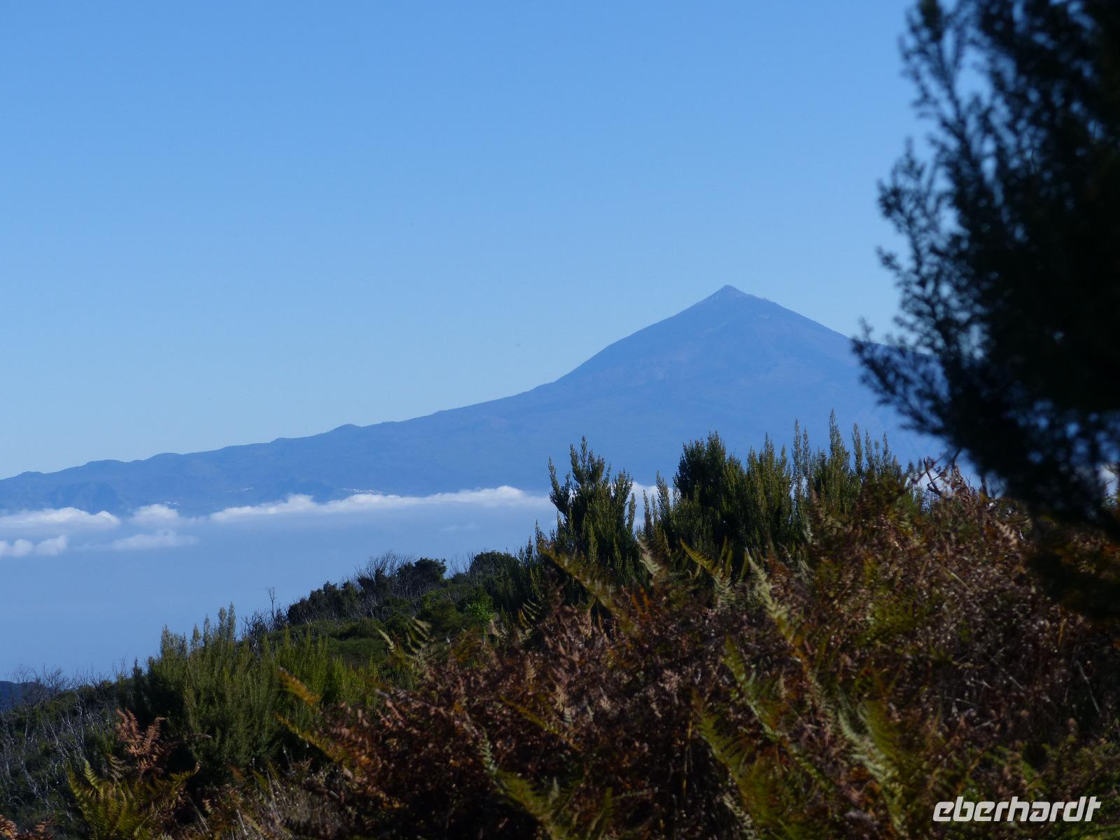 Nach dem Frühstück starteten wir zu unserer ersten Wanderung. Ich hatte die Tour durch den Nebelwald ausgewählt, denn sie ist nicht allzu schwierig und die Wettervorhersage kündigte zwar warmes, aber auch etwas wolkiges Wetter an. Am Morgen sah man nicht viel von den Wolken. Die Sonne strahlte und unser netter Busfahrer Carlos musste bald schon Fotostopps einlegen, denn wir hatten eine herrliche Aussicht nach Teneriffa, als wir ins Gebirge hochfuhren. Blitzblau der Himmel, blitzblau das Meer, leuchtend Grün die Pflanzen und alles überragt vom Teide, der sich am Horizont abzeichnete. Wir starteten schließlich in Las Hayas in rund 1000 Metern Höhe. Da war es dann nicht mehr so warm wie an der Küste und wir trugen sogar Jacken. Gleich hinter dem Dorfrand erreichten wir eine zauberhafte Welt voller bizarr geformter Bäume. Und es war feucht, ein bisschen klamm sogar. Die Pflanzen leben vom Wasser des Nebels. Große Baumheidegewächse und Gagelbäume säumten zunächst unseren Weg, von Flechten und Moosen bedeckt. Dann erreichten wir den Lorbeerwald. Krumme, bizarr geformte Stämme voller Moose schraubten sich in die Höhe und beeindruckten uns sehr. Die Sonne brach durch den Nebel, was uns spektakuläre Fotomotive brachte. Spinnennetze voller Tautropfen, die in der Sonne glitzerten. Und blitzblauen Himmel an der Nordküste, so dass wir von einem Aussichtspunkt aus Hermingua in der Sonne liegen sahen. Farbenfrohe Baumpilze säumten unseren malerischen Weg. Zurück in Las Hayas fuhren wir per Bus nach Arure. Nun waren sie da, die Wolken. Sie verschluckten in Windeseile fast alles. Wir zogen uns zu einem späten Mittagessen in Arure in eine lokale Gaststätte zurück, und kehrten am Nachmittag mit wirklich guter Stimmung zurück in unser Hotel ins immer noch sonnige San Sebastian.