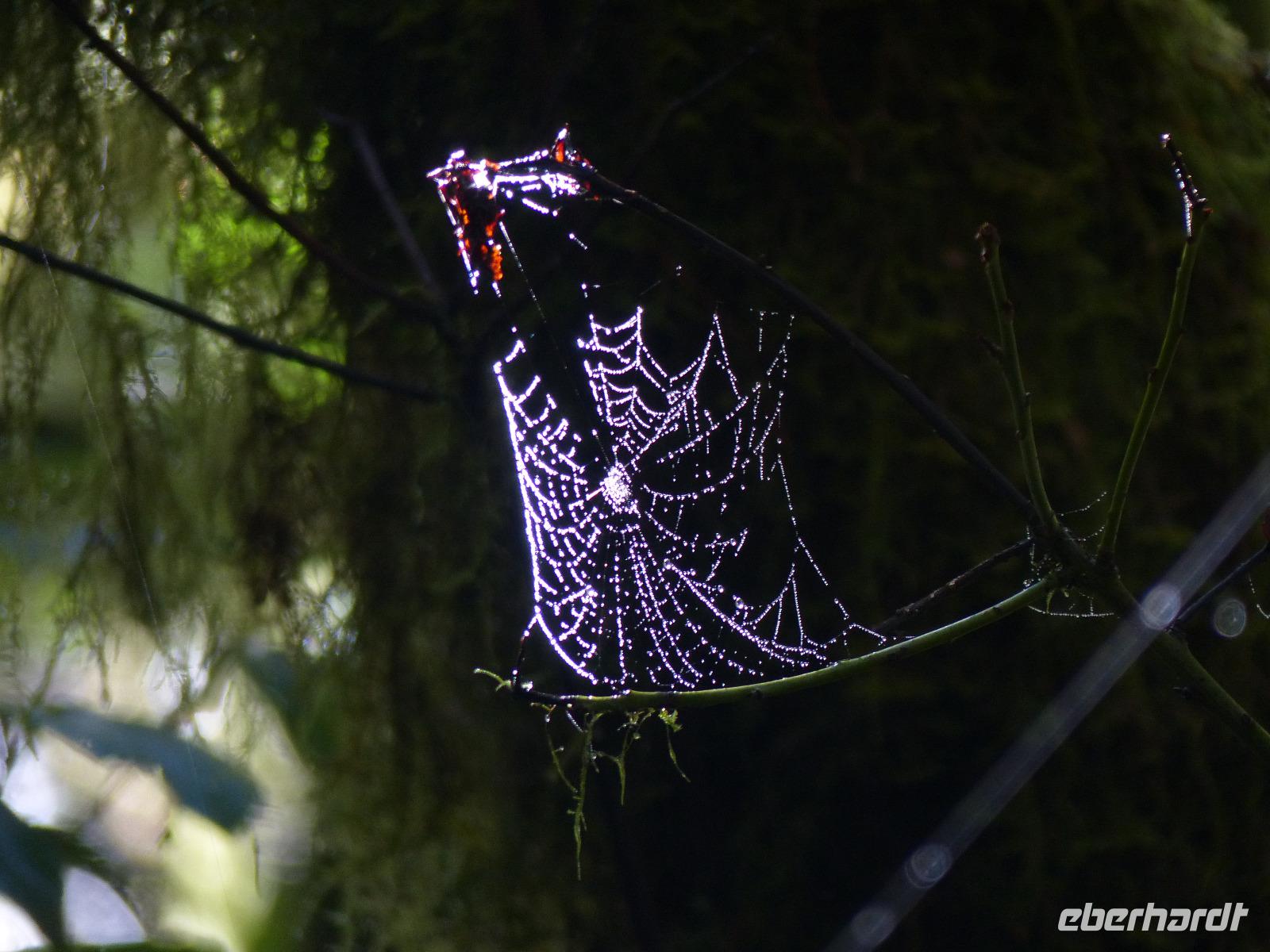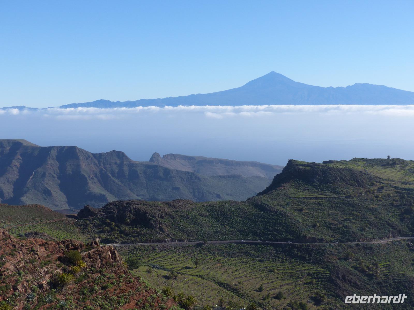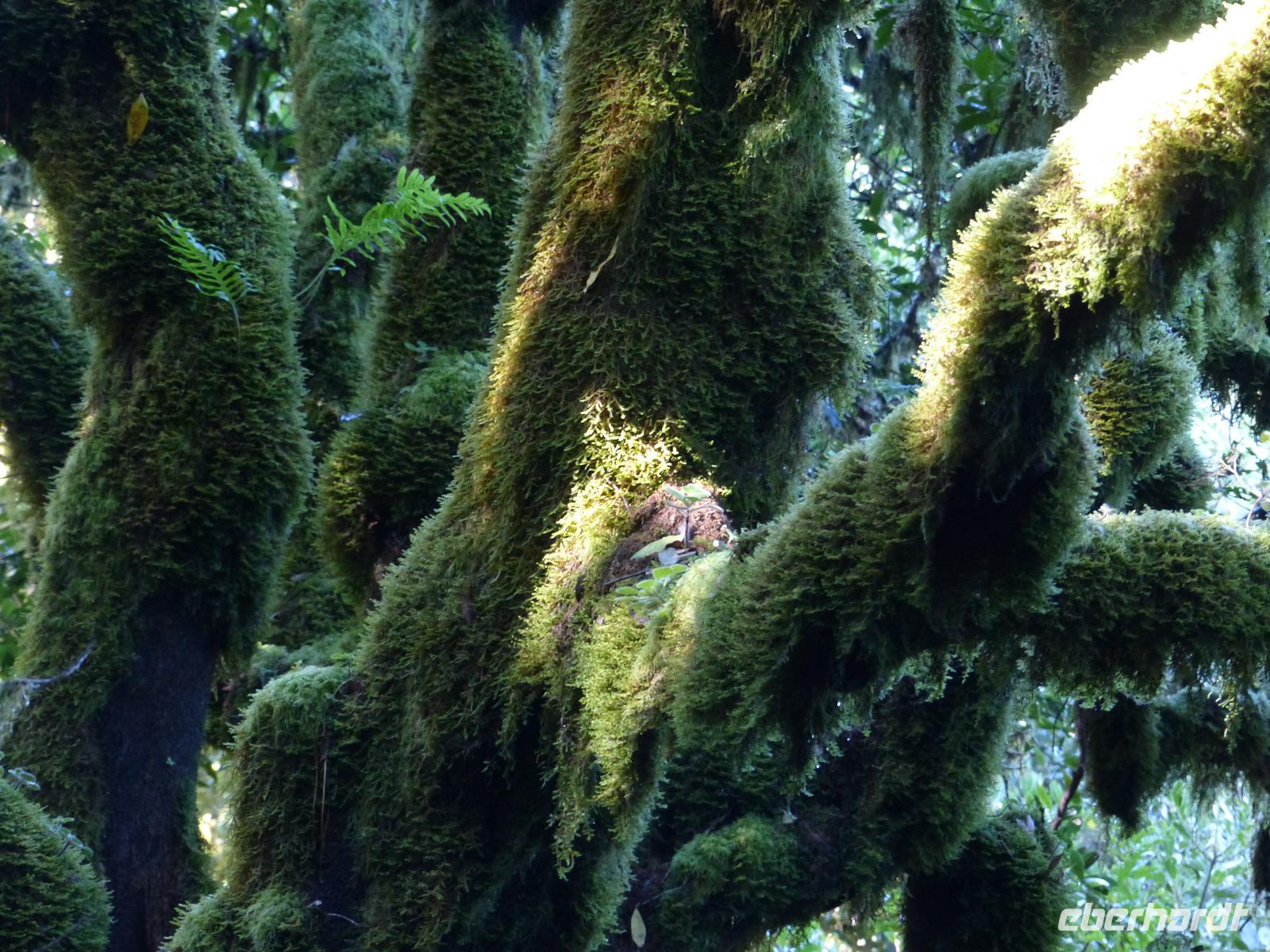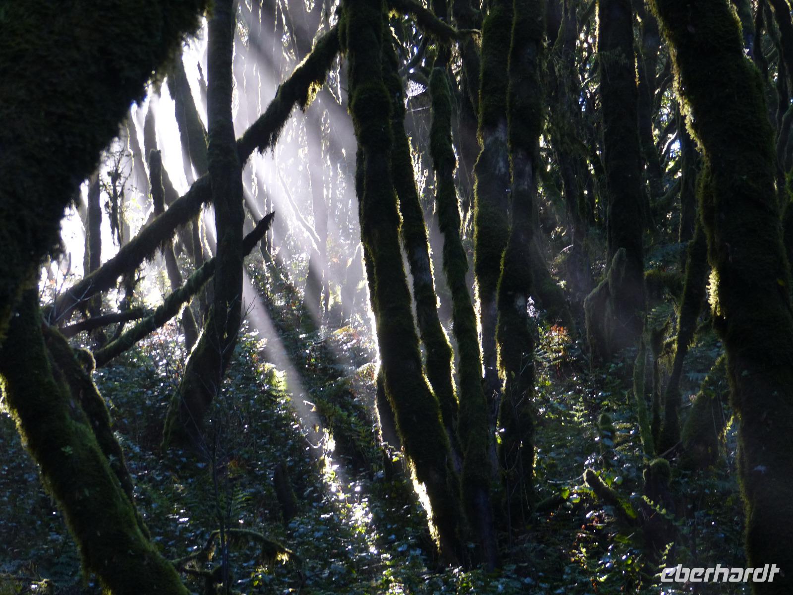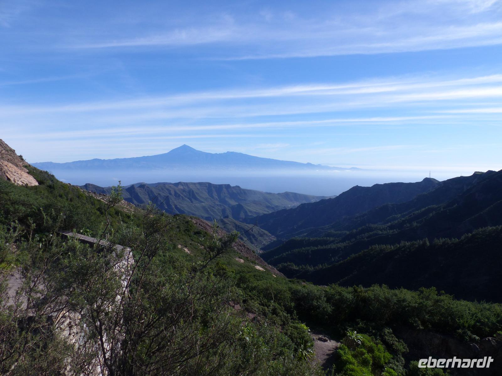 Nach dem Frühstück starteten wir zu unserer ersten Wanderung. Ich hatte die Tour durch den Nebelwald ausgewählt, denn sie ist nicht allzu schwierig und die Wettervorhersage kündigte zwar warmes, aber auch etwas wolkiges Wetter an. Am Morgen sah man nicht viel von den Wolken. Die Sonne strahlte und unser netter Busfahrer Carlos musste bald schon Fotostopps einlegen, denn wir hatten eine herrliche Aussicht nach Teneriffa, als wir ins Gebirge hochfuhren. Blitzblau der Himmel, blitzblau das Meer, leuchtend Grün die Pflanzen und alles überragt vom Teide, der sich am Horizont abzeichnete. Wir starteten schließlich in Las Hayas in rund 1000 Metern Höhe. Da war es dann nicht mehr so warm wie an der Küste und wir trugen sogar Jacken. Gleich hinter dem Dorfrand erreichten wir eine zauberhafte Welt voller bizarr geformter Bäume. Und es war feucht, ein bisschen klamm sogar. Die Pflanzen leben vom Wasser des Nebels. Große Baumheidegewächse und Gagelbäume säumten zunächst unseren Weg, von Flechten und Moosen bedeckt. Dann erreichten wir den Lorbeerwald. Krumme, bizarr geformte Stämme voller Moose schraubten sich in die Höhe und beeindruckten uns sehr. Die Sonne brach durch den Nebel, was uns spektakuläre Fotomotive brachte. Spinnennetze voller Tautropfen, die in der Sonne glitzerten. Und blitzblauen Himmel an der Nordküste, so dass wir von einem Aussichtspunkt aus Hermingua in der Sonne liegen sahen. Farbenfrohe Baumpilze säumten unseren malerischen Weg. Zurück in Las Hayas fuhren wir per Bus nach Arure. Nun waren sie da, die Wolken. Sie verschluckten in Windeseile fast alles. Wir zogen uns zu einem späten Mittagessen in Arure in eine lokale Gaststätte zurück, und kehrten am Nachmittag mit wirklich guter Stimmung zurück in unser Hotel ins immer noch sonnige San Sebastian.