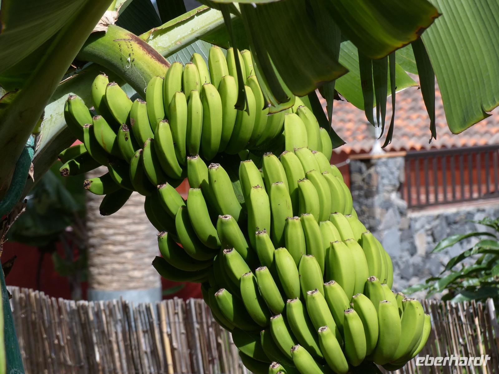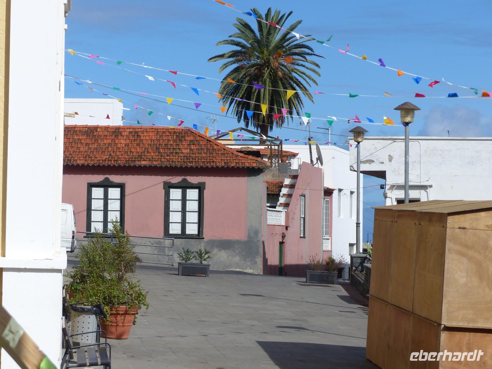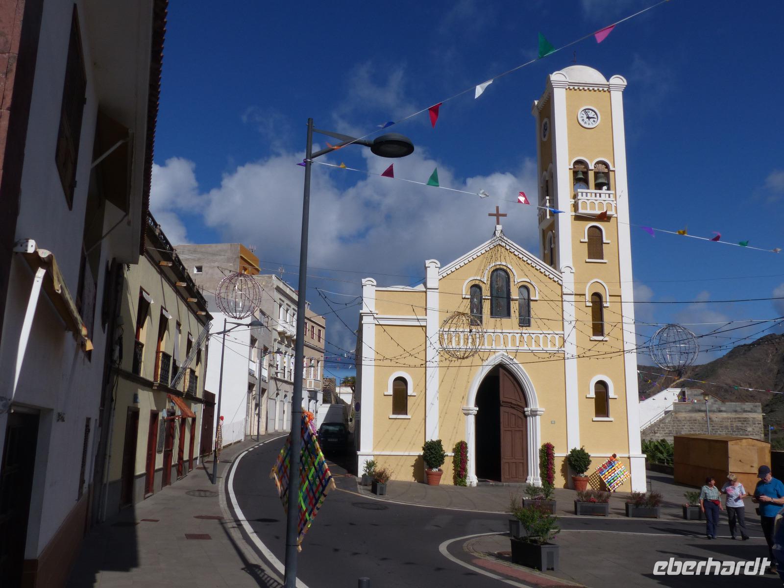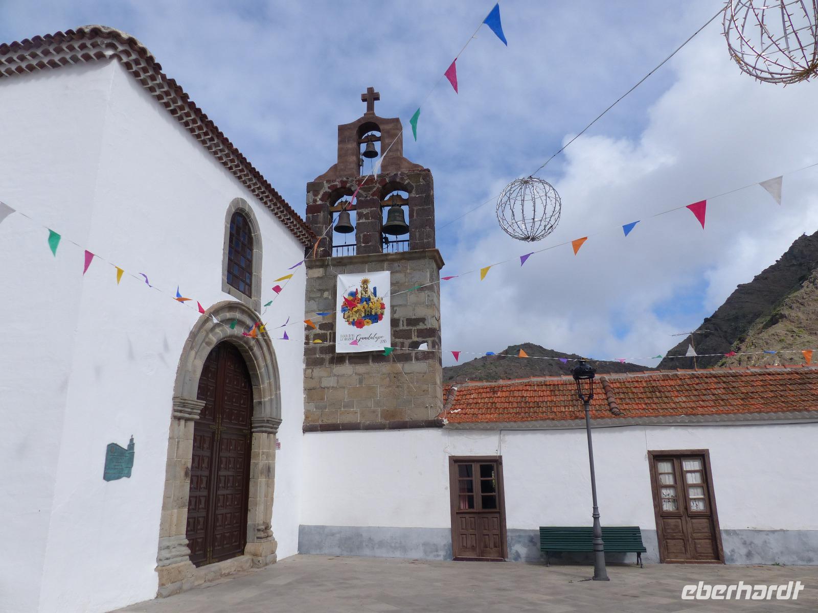 Heute hatten wir den Inselnorden auf unserem Programm. Unsere kurze Wanderung in Hermingua löste Begeisterung aus. Was für eine herrliche Landschaft. Üppig grün, überall Blumen, ein plätscherndes Bächlein und blauer Himmel. Was will man mehr? Einen Ziegenbock! Alle waren begeistert, nur ich nicht. Wenn uns dieses Vieh hinterher marschiert, dann begleitet uns eine Dauer-Duftnote, die mir gar nicht zusagt. Der Bock hatte aber keine Lust, sich den Hang hinauf zu kämpfen - uff! Glück gehabt. An einem kleinen Stausee trafen wir auf unsere Genusswanderer, die wir unterwegs einen Hangweg entlang geschickt hatten, so dass sie mühelos auch die Aussicht genießen konnten und nicht so wie wir Bergziegen das steile Tal heraufturnen mussten. Bei den meisten Wanderungen dieser Reise kann ich es einrichten, dass die Flotten auf ihre Kosten kommen, ohne dass dies die Gemütlichen quält. Nach dieser herrlichen Wanderung besichtigten wir die Gofiomühle samt Garten und Heimatmuseum in Hermingua. Im Garten gab es jede Menge herrlicher Blüten und Früchte. Bananen in Grün, Bananen in Gelb, rot leuchtende Mangos, blühende Papayas - wir haben es genossen. Und wir machten noch einen kurzen Abstecher zum El Convento, dem nahegelegenen Klösterchen. Mönche sind hier heute keine mehr zu finden, aber der hübsche Kirchplatz lohnt einen Besuch. Und die Kirche war offen. Darin befanden sich mehrere Damen mit großen Blumenkörben, die die Kirche festlich schmückten, denn 2018 feierte man auf La Gomera das nur alle 5 Jahre gefeierte Fest Bajada de la Virgen de Guadalupe. Sie ist seit dem 16. Jh. die Schutzheilige der Insel und ihre Heiligenstatue wird alle 5 Jahre in einer großen Prozession per Boot nach San Sebastian gebracht und von Kirche zu Kirche auf der ganzen Insel herumgereicht. Und so schmückten die Damen die Kirche fürs kurz darauf folgende Fest.