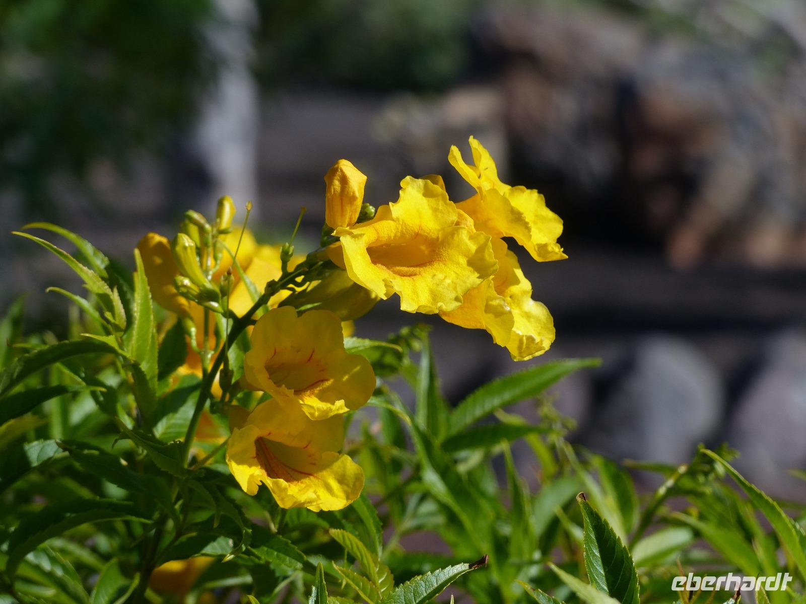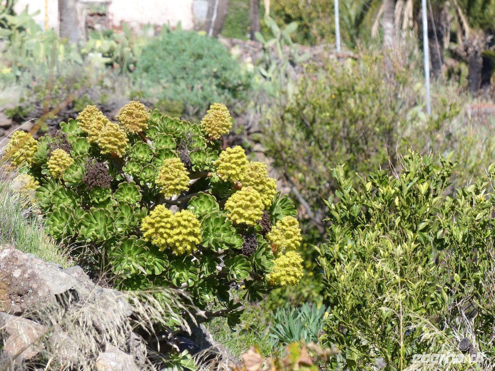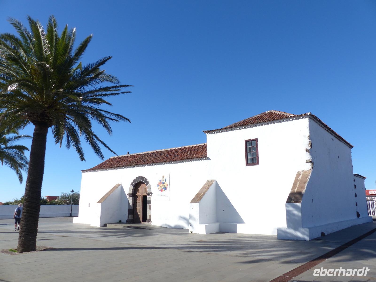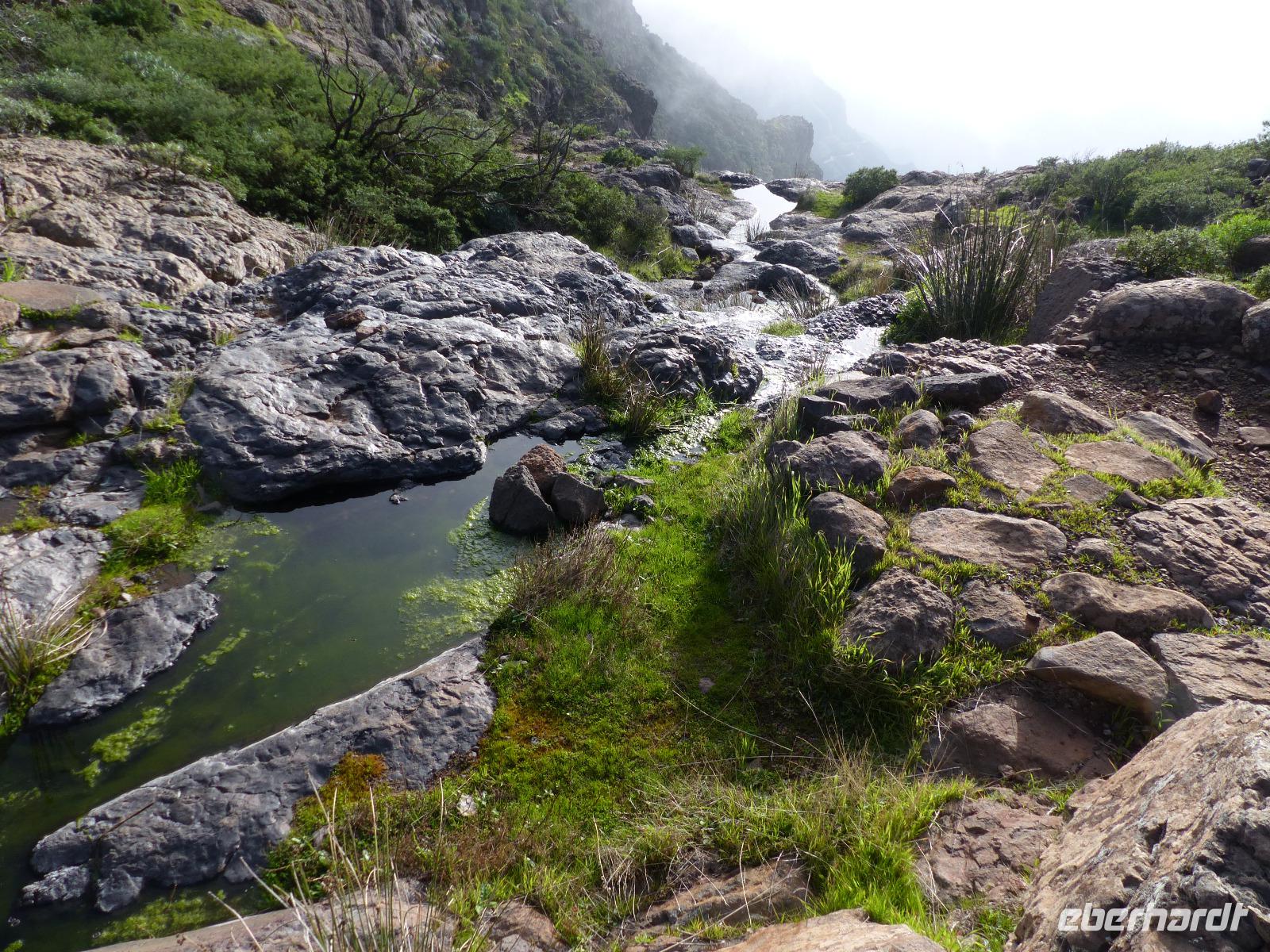 Heute hatten wir den Inselnorden auf unserem Programm. Unsere kurze Wanderung in Hermingua löste Begeisterung aus. Was für eine herrliche Landschaft. Üppig grün, überall Blumen, ein plätscherndes Bächlein und blauer Himmel. Was will man mehr? Einen Ziegenbock! Alle waren begeistert, nur ich nicht. Wenn uns dieses Vieh hinterher marschiert, dann begleitet uns eine Dauer-Duftnote, die mir gar nicht zusagt. Der Bock hatte aber keine Lust, sich den Hang hinauf zu kämpfen - uff! Glück gehabt. An einem kleinen Stausee trafen wir auf unsere Genusswanderer, die wir unterwegs einen Hangweg entlang geschickt hatten, so dass sie mühelos auch die Aussicht genießen konnten und nicht so wie wir Bergziegen das steile Tal heraufturnen mussten. Bei den meisten Wanderungen dieser Reise kann ich es einrichten, dass die Flotten auf ihre Kosten kommen, ohne dass dies die Gemütlichen quält. Nach dieser herrlichen Wanderung besichtigten wir die Gofiomühle samt Garten und Heimatmuseum in Hermingua. Im Garten gab es jede Menge herrlicher Blüten und Früchte. Bananen in Grün, Bananen in Gelb, rot leuchtende Mangos, blühende Papayas - wir haben es genossen. Und wir machten noch einen kurzen Abstecher zum El Convento, dem nahegelegenen Klösterchen. Mönche sind hier heute keine mehr zu finden, aber der hübsche Kirchplatz lohnt einen Besuch. Und die Kirche war offen. Darin befanden sich mehrere Damen mit großen Blumenkörben, die die Kirche festlich schmückten, denn 2018 feierte man auf La Gomera das nur alle 5 Jahre gefeierte Fest Bajada de la Virgen de Guadalupe. Sie ist seit dem 16. Jh. die Schutzheilige der Insel und ihre Heiligenstatue wird alle 5 Jahre in einer großen Prozession per Boot nach San Sebastian gebracht und von Kirche zu Kirche auf der ganzen Insel herumgereicht. Und so schmückten die Damen die Kirche fürs kurz darauf folgende Fest.