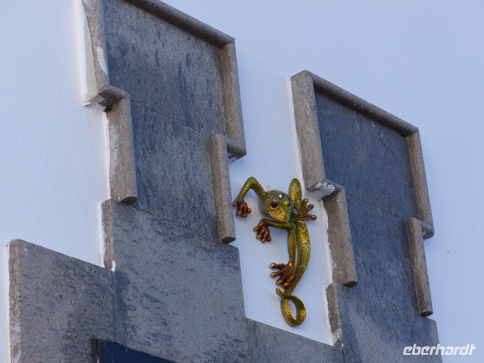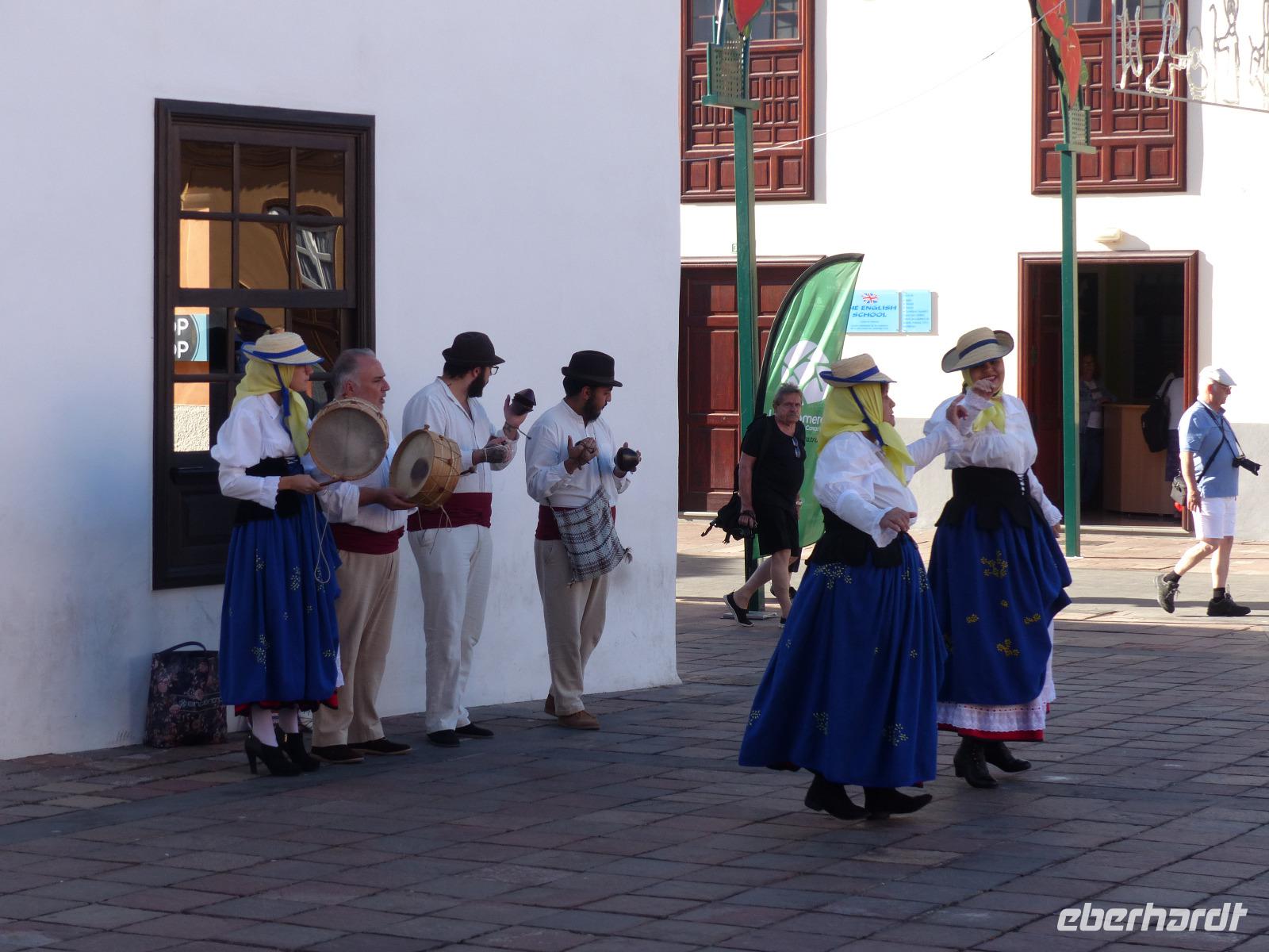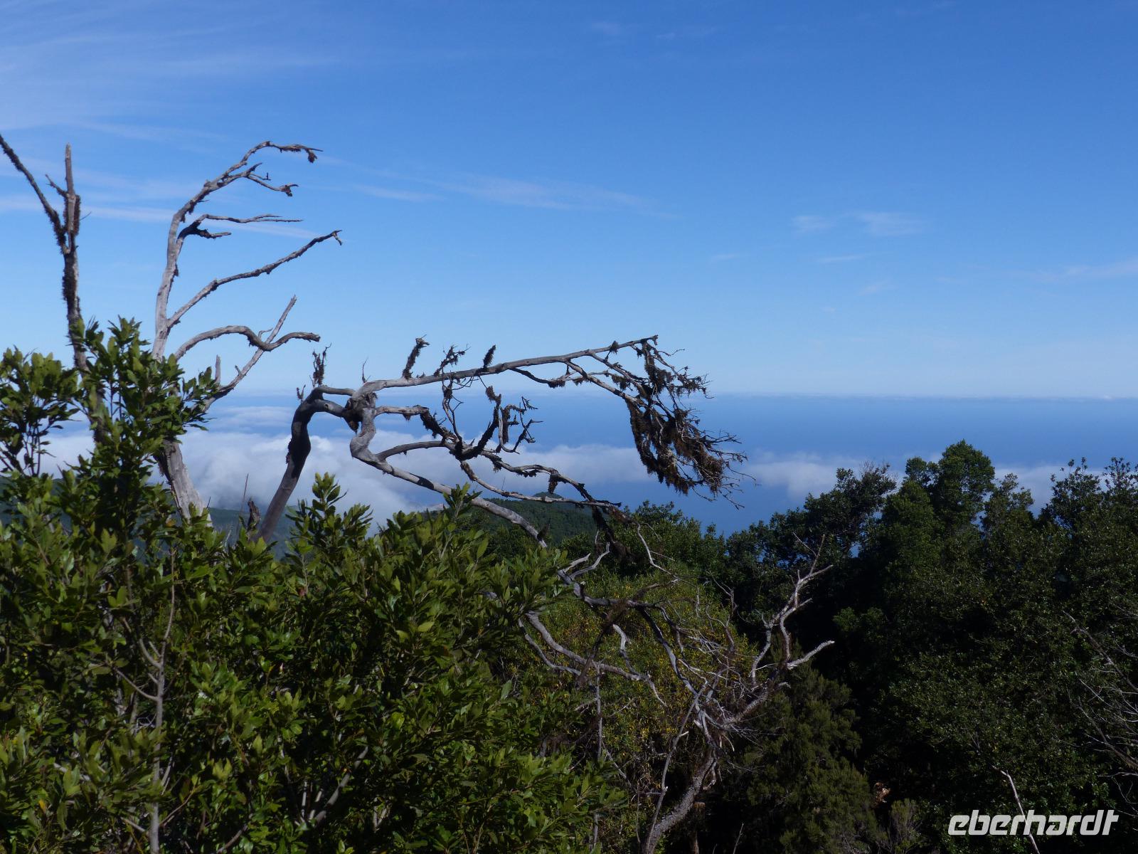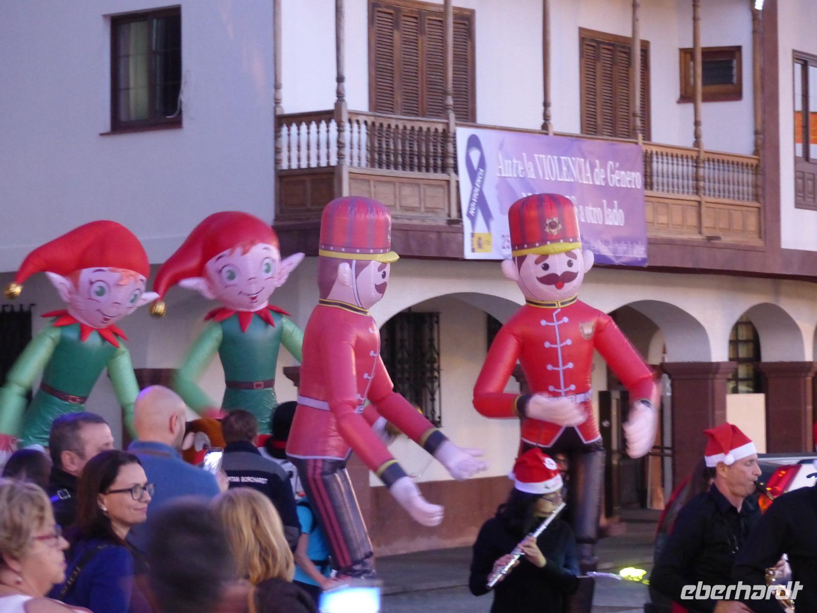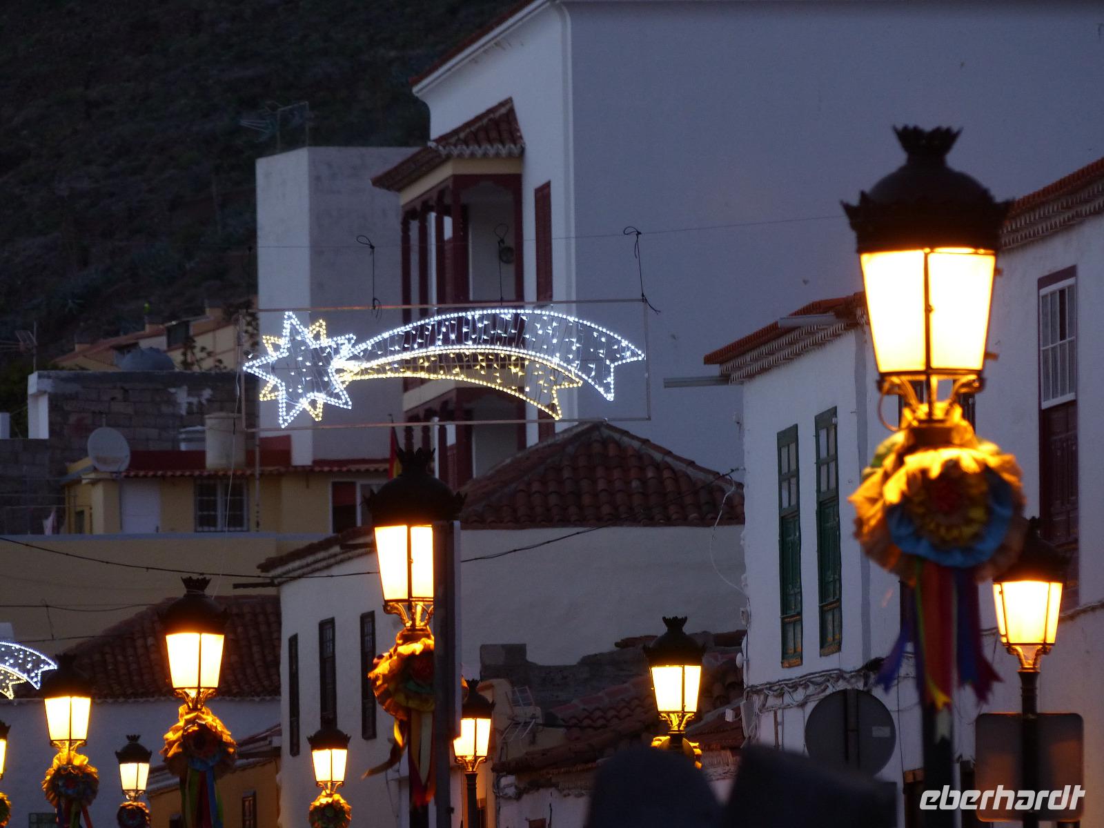 Auch heute war der Roque Agando wolkenfrei. Also starteten wir unsere Wanderung, die eigentlich mit der Besteigung des höchsten Inselberges Garajonay hätte enden sollen. Unser aussichtsreicher Pfad schlängelte sich durch den Fayal-Brezal-Wald aufwärts. Also auch hier trafen wir wieder auf die großen Baumheiden und die Gagelbäume. Auf einem Aussichtspodest machten wir unsere Mittagspause, die heute mal als Picknick ohne Restaurantbesuch stattfand. Wieder dieser wunderschöne Blick nach Teneriffa bei blitzblauem Himmel! Und es war warm. Nur die Eidechsen wollten nicht so recht. Nicht mal Apfelstückchen konnten sie locken, wo sie doch sonst immer direkt neben einem Parkplatz an der Inselhochstraße auf Futter lauern. So ist das, wenn Reisleiter gerne Tiere präsentieren wollen. Die sind dummerweise beweglich. Bei Pajarito angekommen, beendeten wir die Tour. Den Garajonay hatten wir ja bereits an einem anderen Tag bestiegen. Und so fuhren wir am Nachmittag wieder abwärts und gut die Hälfte der Gruppe verschwand im Meer. In San Sebastian wurde nun überall emsig geschmückt. Die Palmen bekamen Weihnachtsgirlanden übergestreift. Maria und Josef wurden probegezündet und blinkten wie eine Diskobeleuchtung: An, aus, an, aus... Und während unseres Essens zog ein Umzug mit großen aufgeblasenen Nussknackerpuppen an unserem Hotel vorüber. Die Puppen beugten sich zu den Kindern hinunter und strichen ihnen über den Kopf. Manche mochten dies und freuten sich mit ihren Eltern, andere dagegen fingen an zu heulen. Nach dem Essen beschlossen wir, der Festivität auf den Grund zu gehen. Heute hatten wir ja nur ein kleines Wanderprogramm, und das passte, denn einige Gäste schwangen nun kräftig das Tanzbein. Dann zogen wir uns an den Platzrand zurück. Und dabei hatten wir Glück, denn am Tisch neben uns wurden bald schon die Gitarren und Ukelelen gezückt und die Gomeros nebenan begannen zu singen. Wir trällterten mit so gut wir das eben konnten und waren bald schon eingekreist von einheimischen Sängern. Ein wirklich schöner Abend, den einige der Gäste in kleinen Filmen festgehalten haben. Das wurde eine etwas kürzere Nacht. Und noch heute habe ich diese Lieder im Ohr und denke sehr gerne an diesen Abend zurück. Ergeht es Euch auch so??