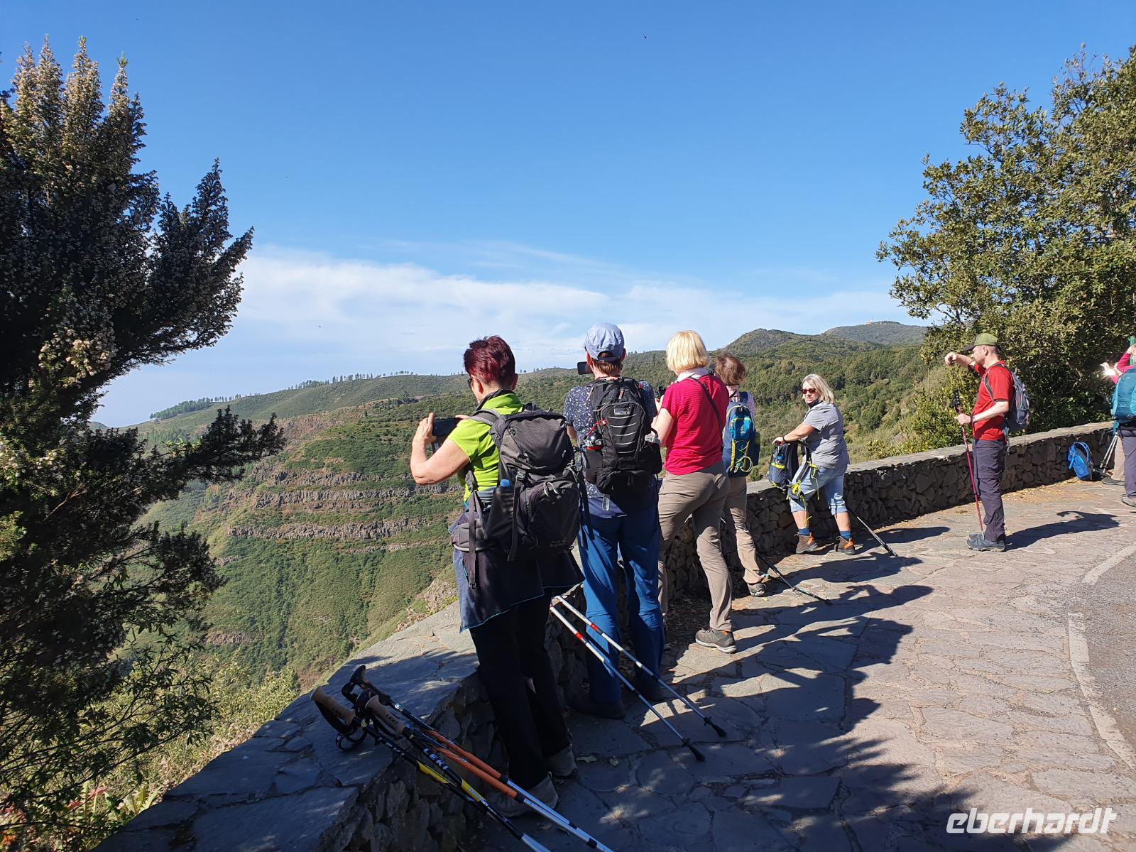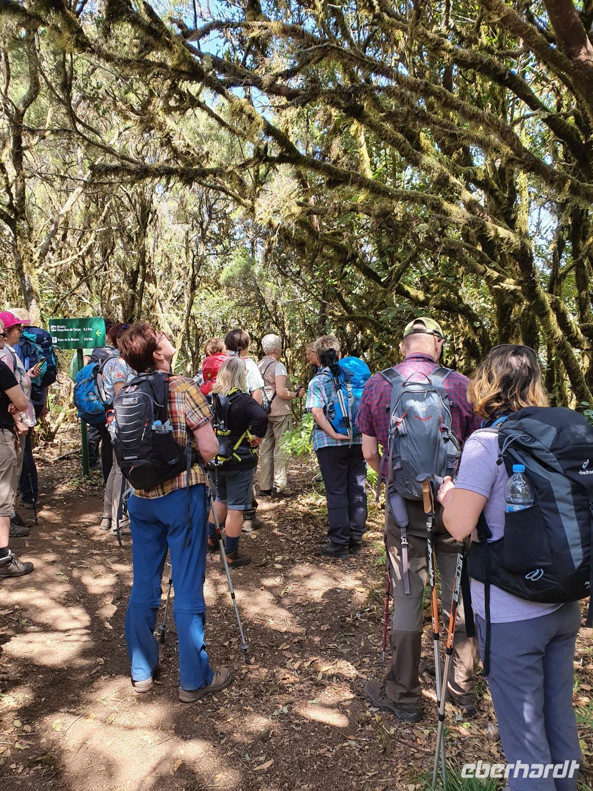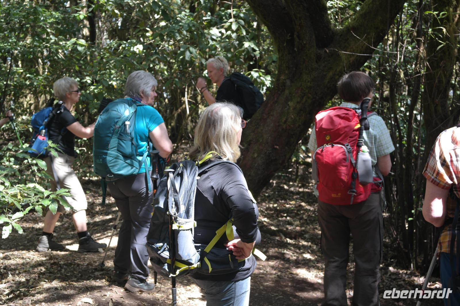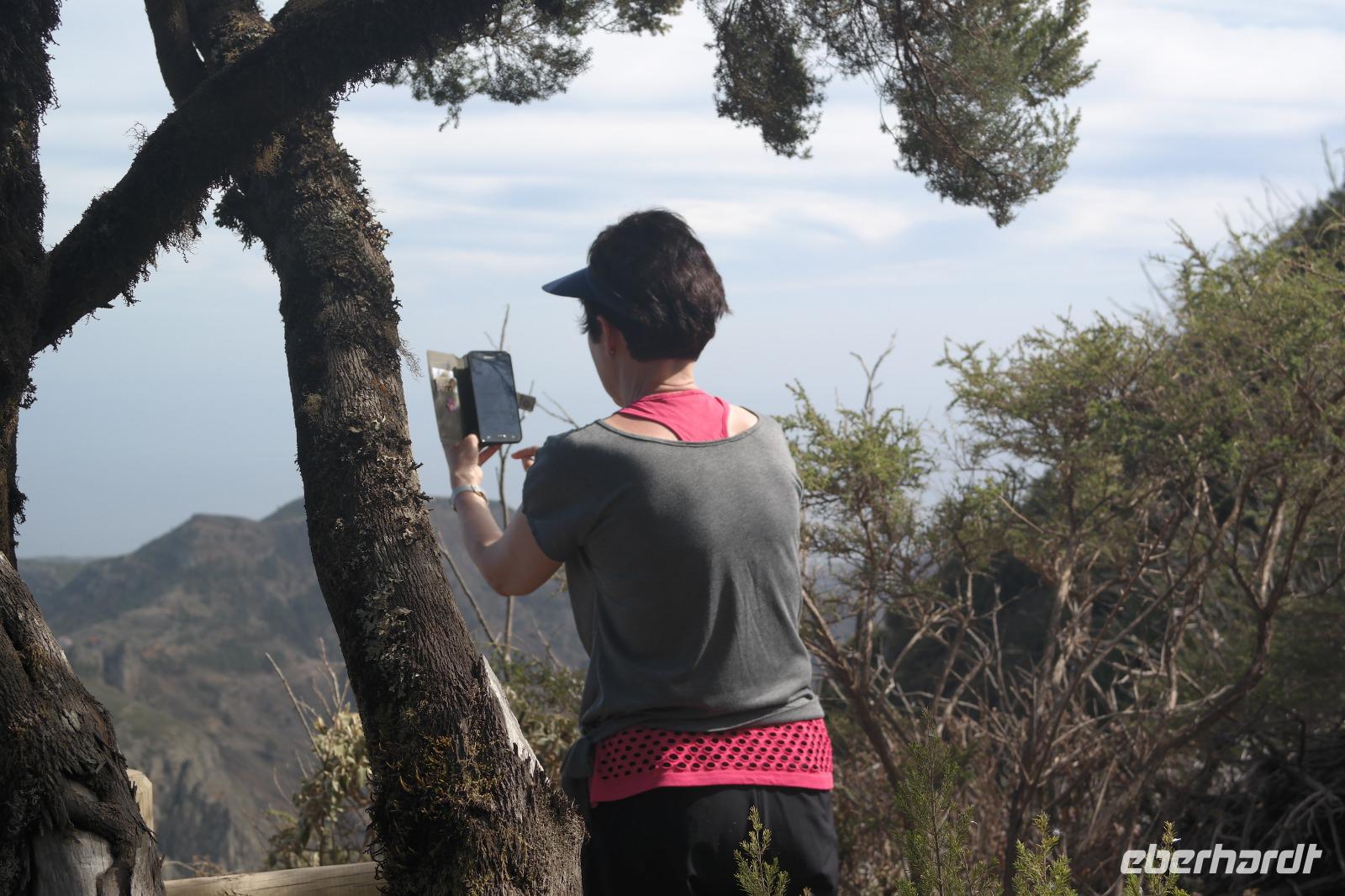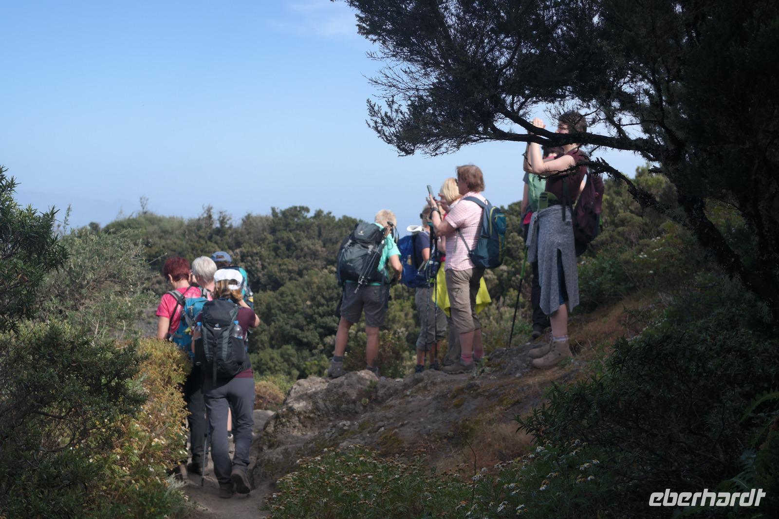 Nach dem Frühstück erwartet uns Ulrike bereits vor dem Hotel, wir gehen noch schnell in den Super-markt um Proviant für unterwegs zu kaufen, und dann lernen wir unseren Buschauffeur Ernesto mit seinem Cabrio-Bus kennen, der uns die ganze Woche zur Verfügung steht. Bei genau 20 Sitzplätzen ist die Vollzähligkeit der Gruppe sehr übersichtlich - Bus voll = alle sind da. Ernesto schiebt das Verdeck des Busses zurück und der warme Luftzug lässt uns die erste Fahrt in vollen Zügen genießen. Unsere erste Wanderung ist gleich die Gipfeltour - wir erwandern den mit 1.487 höchsten Berg der Insel, den Alto de Garajonay, der im gleichnamigen Naturschutzgebiet liegt. Unsere Ulrike nimmt Rücksicht auf die Strapazen unserer Anreise und verkürzt die erste Wanderung um gut 2,5 km (um sie anschließend an die Gipfeltour wieder anzuhängen). Die einzigartige Naturlandschaft wird geprägt von meterhoher Baumheide, verschieden Arten Lorbeerbäume, Buschheide, Farne, Moose, Sukkulenten, kanarischen Kiefern und jeder Menge endemischer Pflanzen - Ulrike scheint sie alle persönlich zu kennen und lässt uns an ihrem botanischen Fachwissen teilhaben. Schon um die Mittagszeit genießen wir den fantastischen Ausblick vom Gipfel des Garajonay über die gesamte Insel und auch der Pico del Teide auf der benachbarten Insel Teneriffa ist nun gut zu erkennen. Auf dem Rückweg holt ein Teil der Gruppe die zunächst eingesparten 2,5 km Wanderung nach, wir hatten schließlich noch nicht genug fotografiert und neue Motive fanden sich sehr schnell. Ulrike lobte unsere Gruppe als „beste Gruppe, die sie heute hatte" und wir treffen uns pünktlich um 18.52 Uhr zum gemeinsamen Abendessen. Im Restaurant Los Caprichos wartet natürlich die grüne Suppe auf uns, diesmal etwas dicker und sehr reichlich davon, die kanarische Kresse (Tropaeolum peregrinum, stammt ursprünglich aus Peru) muss ähnlich groß sein wie Rhabarberblätter. Almogrote, Mojo rojo und Mojo verde, Miel de Palma, Gofio und die schrumpeligen Salzkartoffeln (papas arrugadas) erobern unser Herz und unsere Mägen. Dazu passt sehr gut ein Wein von der Insel oder ein frisch gezapftes Dorada.