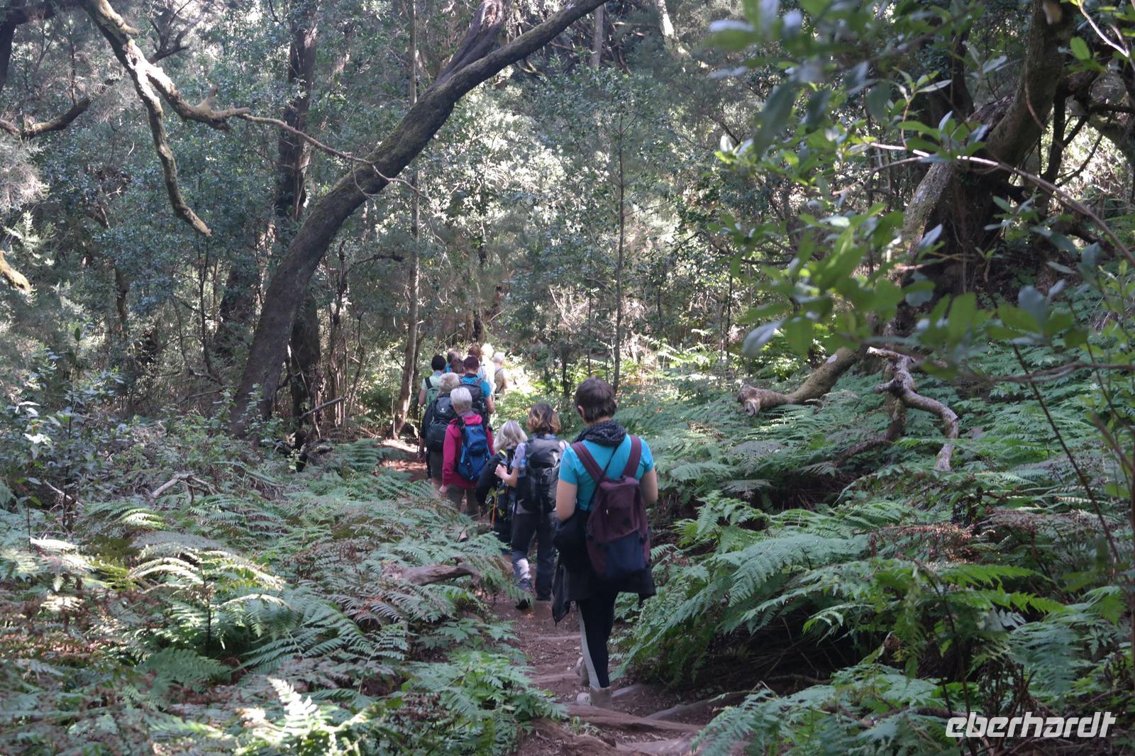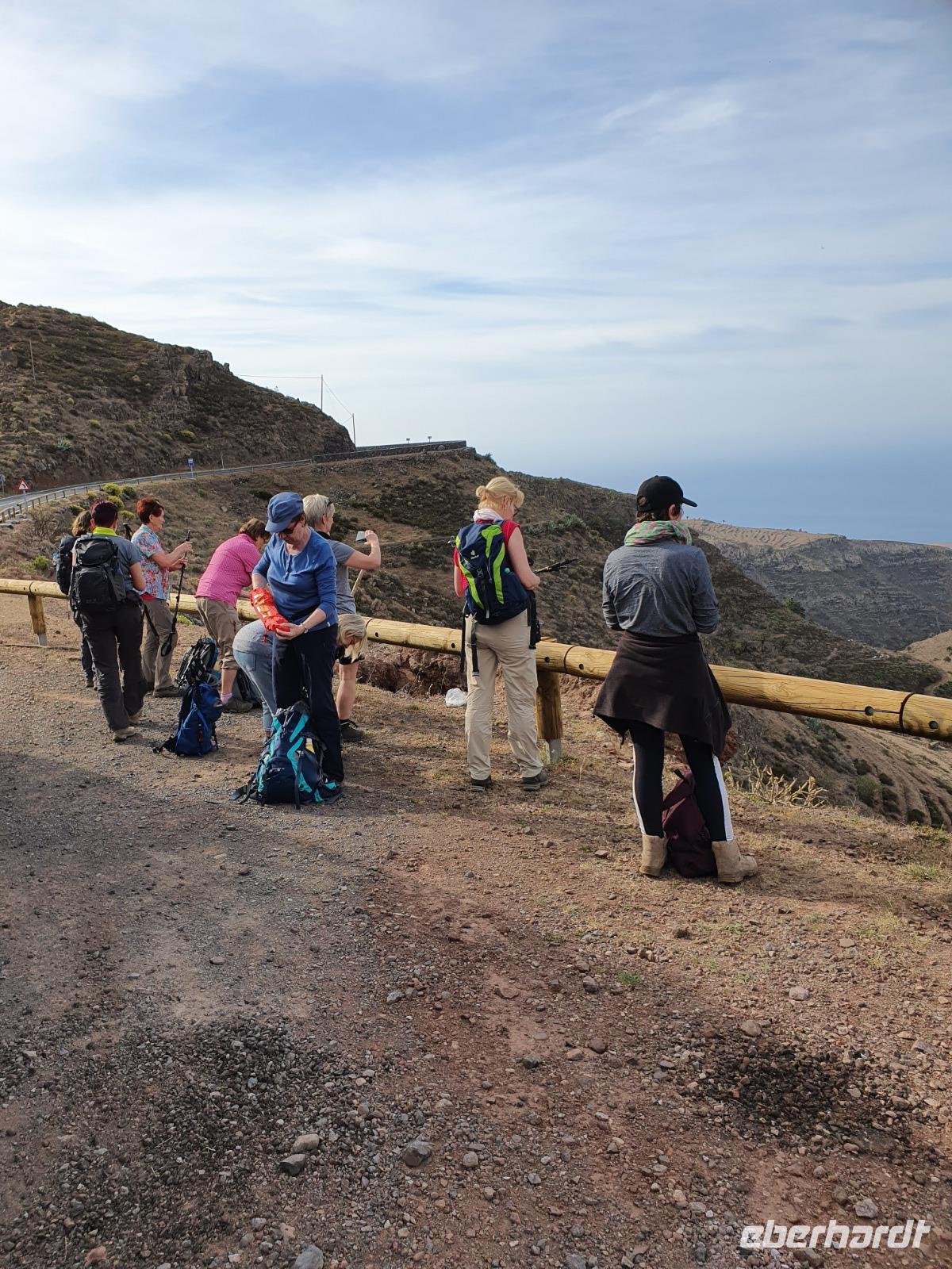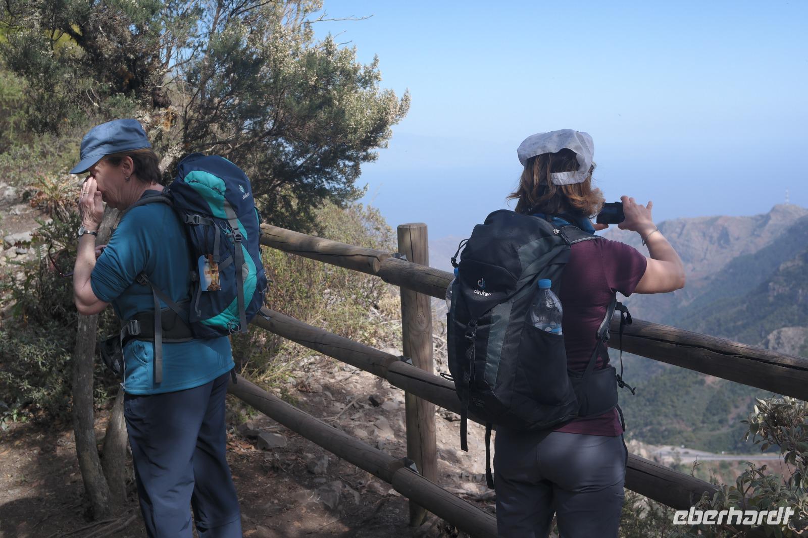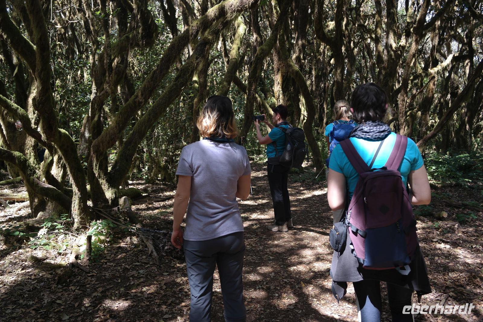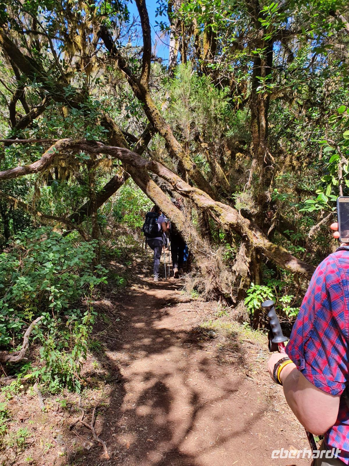 Nach dem Frühstück erwartet uns Ulrike bereits vor dem Hotel, wir gehen noch schnell in den Super-markt um Proviant für unterwegs zu kaufen, und dann lernen wir unseren Buschauffeur Ernesto mit seinem Cabrio-Bus kennen, der uns die ganze Woche zur Verfügung steht. Bei genau 20 Sitzplätzen ist die Vollzähligkeit der Gruppe sehr übersichtlich - Bus voll = alle sind da. Ernesto schiebt das Verdeck des Busses zurück und der warme Luftzug lässt uns die erste Fahrt in vollen Zügen genießen. Unsere erste Wanderung ist gleich die Gipfeltour - wir erwandern den mit 1.487 höchsten Berg der Insel, den Alto de Garajonay, der im gleichnamigen Naturschutzgebiet liegt. Unsere Ulrike nimmt Rücksicht auf die Strapazen unserer Anreise und verkürzt die erste Wanderung um gut 2,5 km (um sie anschließend an die Gipfeltour wieder anzuhängen). Die einzigartige Naturlandschaft wird geprägt von meterhoher Baumheide, verschieden Arten Lorbeerbäume, Buschheide, Farne, Moose, Sukkulenten, kanarischen Kiefern und jeder Menge endemischer Pflanzen - Ulrike scheint sie alle persönlich zu kennen und lässt uns an ihrem botanischen Fachwissen teilhaben. Schon um die Mittagszeit genießen wir den fantastischen Ausblick vom Gipfel des Garajonay über die gesamte Insel und auch der Pico del Teide auf der benachbarten Insel Teneriffa ist nun gut zu erkennen. Auf dem Rückweg holt ein Teil der Gruppe die zunächst eingesparten 2,5 km Wanderung nach, wir hatten schließlich noch nicht genug fotografiert und neue Motive fanden sich sehr schnell. Ulrike lobte unsere Gruppe als „beste Gruppe, die sie heute hatte" und wir treffen uns pünktlich um 18.52 Uhr zum gemeinsamen Abendessen. Im Restaurant Los Caprichos wartet natürlich die grüne Suppe auf uns, diesmal etwas dicker und sehr reichlich davon, die kanarische Kresse (Tropaeolum peregrinum, stammt ursprünglich aus Peru) muss ähnlich groß sein wie Rhabarberblätter. Almogrote, Mojo rojo und Mojo verde, Miel de Palma, Gofio und die schrumpeligen Salzkartoffeln (papas arrugadas) erobern unser Herz und unsere Mägen. Dazu passt sehr gut ein Wein von der Insel oder ein frisch gezapftes Dorada.