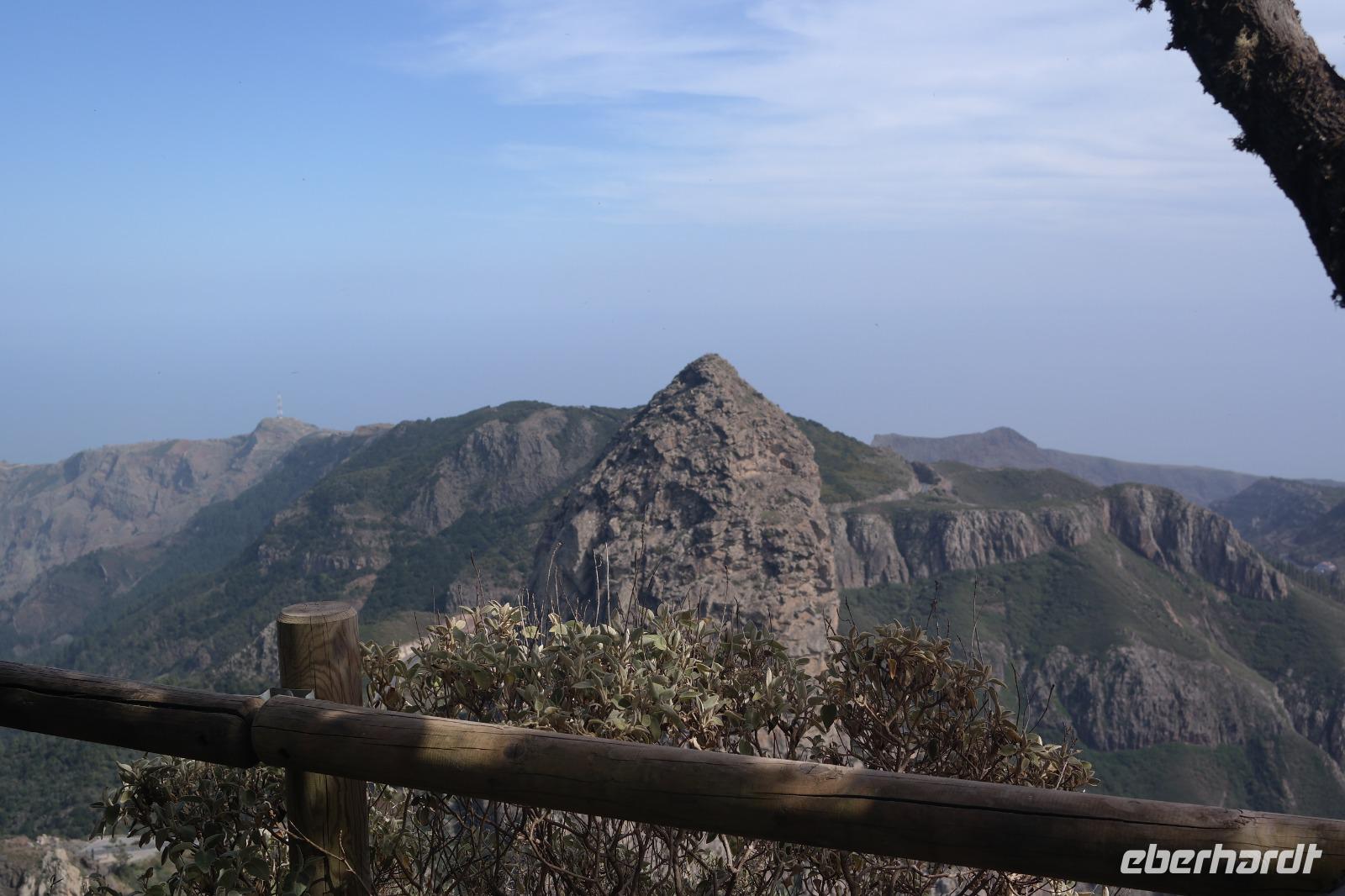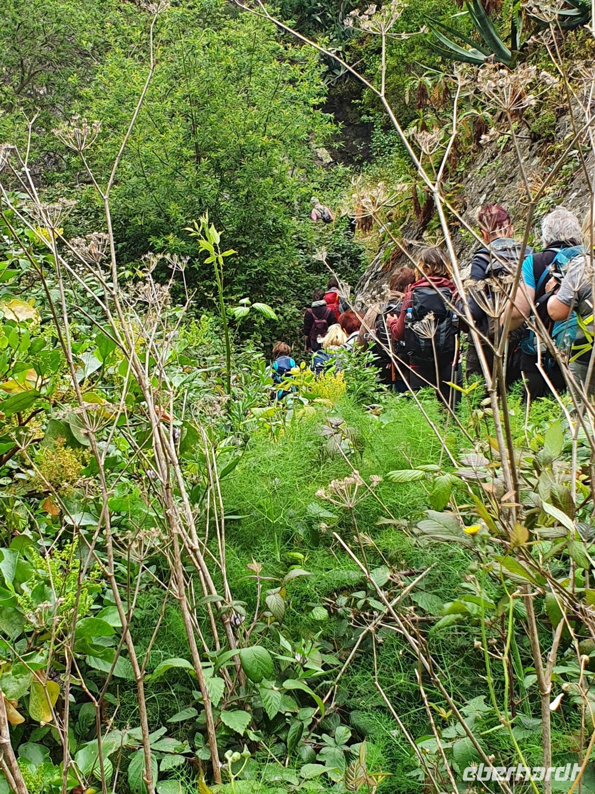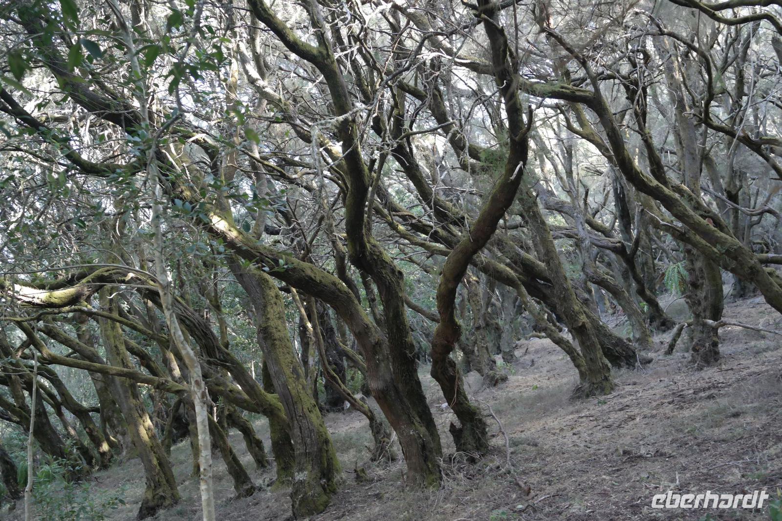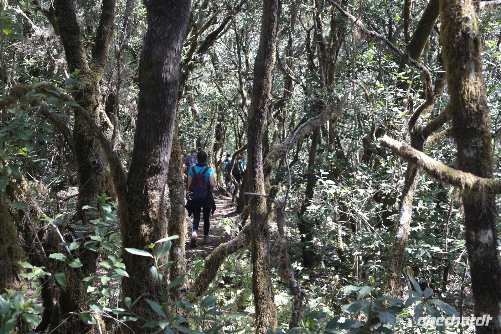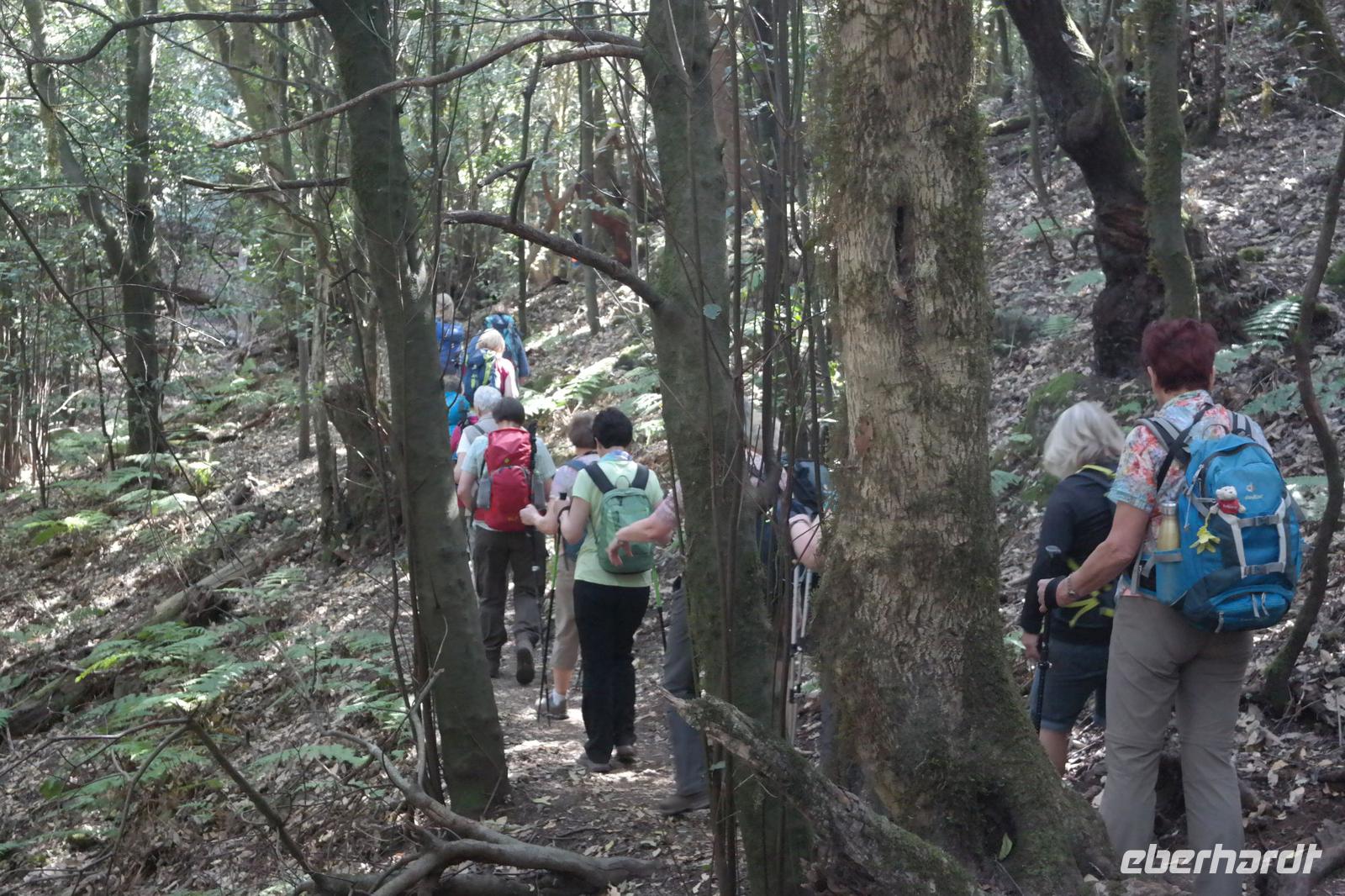 Nach dem Frühstück erwartet uns Ulrike bereits vor dem Hotel, wir gehen noch schnell in den Super-markt um Proviant für unterwegs zu kaufen, und dann lernen wir unseren Buschauffeur Ernesto mit seinem Cabrio-Bus kennen, der uns die ganze Woche zur Verfügung steht. Bei genau 20 Sitzplätzen ist die Vollzähligkeit der Gruppe sehr übersichtlich - Bus voll = alle sind da. Ernesto schiebt das Verdeck des Busses zurück und der warme Luftzug lässt uns die erste Fahrt in vollen Zügen genießen. Unsere erste Wanderung ist gleich die Gipfeltour - wir erwandern den mit 1.487 höchsten Berg der Insel, den Alto de Garajonay, der im gleichnamigen Naturschutzgebiet liegt. Unsere Ulrike nimmt Rücksicht auf die Strapazen unserer Anreise und verkürzt die erste Wanderung um gut 2,5 km (um sie anschließend an die Gipfeltour wieder anzuhängen). Die einzigartige Naturlandschaft wird geprägt von meterhoher Baumheide, verschieden Arten Lorbeerbäume, Buschheide, Farne, Moose, Sukkulenten, kanarischen Kiefern und jeder Menge endemischer Pflanzen - Ulrike scheint sie alle persönlich zu kennen und lässt uns an ihrem botanischen Fachwissen teilhaben. Schon um die Mittagszeit genießen wir den fantastischen Ausblick vom Gipfel des Garajonay über die gesamte Insel und auch der Pico del Teide auf der benachbarten Insel Teneriffa ist nun gut zu erkennen. Auf dem Rückweg holt ein Teil der Gruppe die zunächst eingesparten 2,5 km Wanderung nach, wir hatten schließlich noch nicht genug fotografiert und neue Motive fanden sich sehr schnell. Ulrike lobte unsere Gruppe als „beste Gruppe, die sie heute hatte" und wir treffen uns pünktlich um 18.52 Uhr zum gemeinsamen Abendessen. Im Restaurant Los Caprichos wartet natürlich die grüne Suppe auf uns, diesmal etwas dicker und sehr reichlich davon, die kanarische Kresse (Tropaeolum peregrinum, stammt ursprünglich aus Peru) muss ähnlich groß sein wie Rhabarberblätter. Almogrote, Mojo rojo und Mojo verde, Miel de Palma, Gofio und die schrumpeligen Salzkartoffeln (papas arrugadas) erobern unser Herz und unsere Mägen. Dazu passt sehr gut ein Wein von der Insel oder ein frisch gezapftes Dorada.