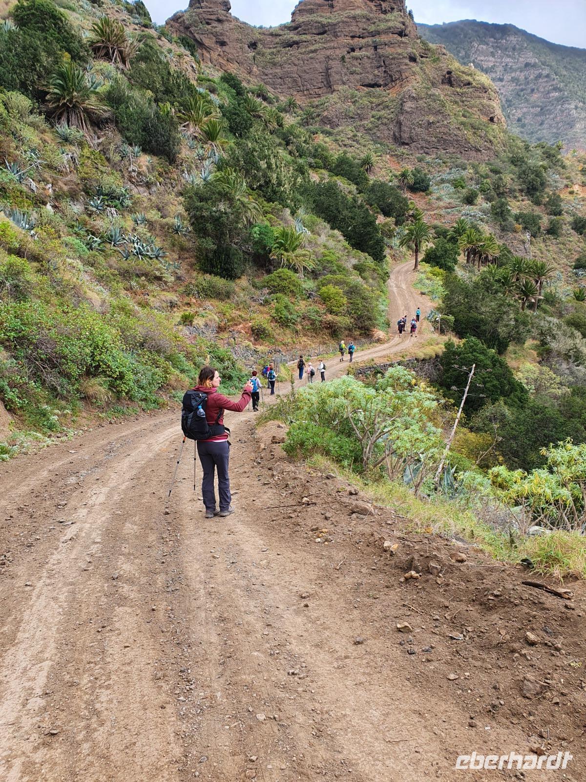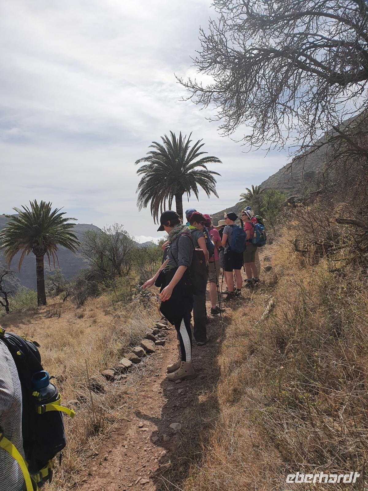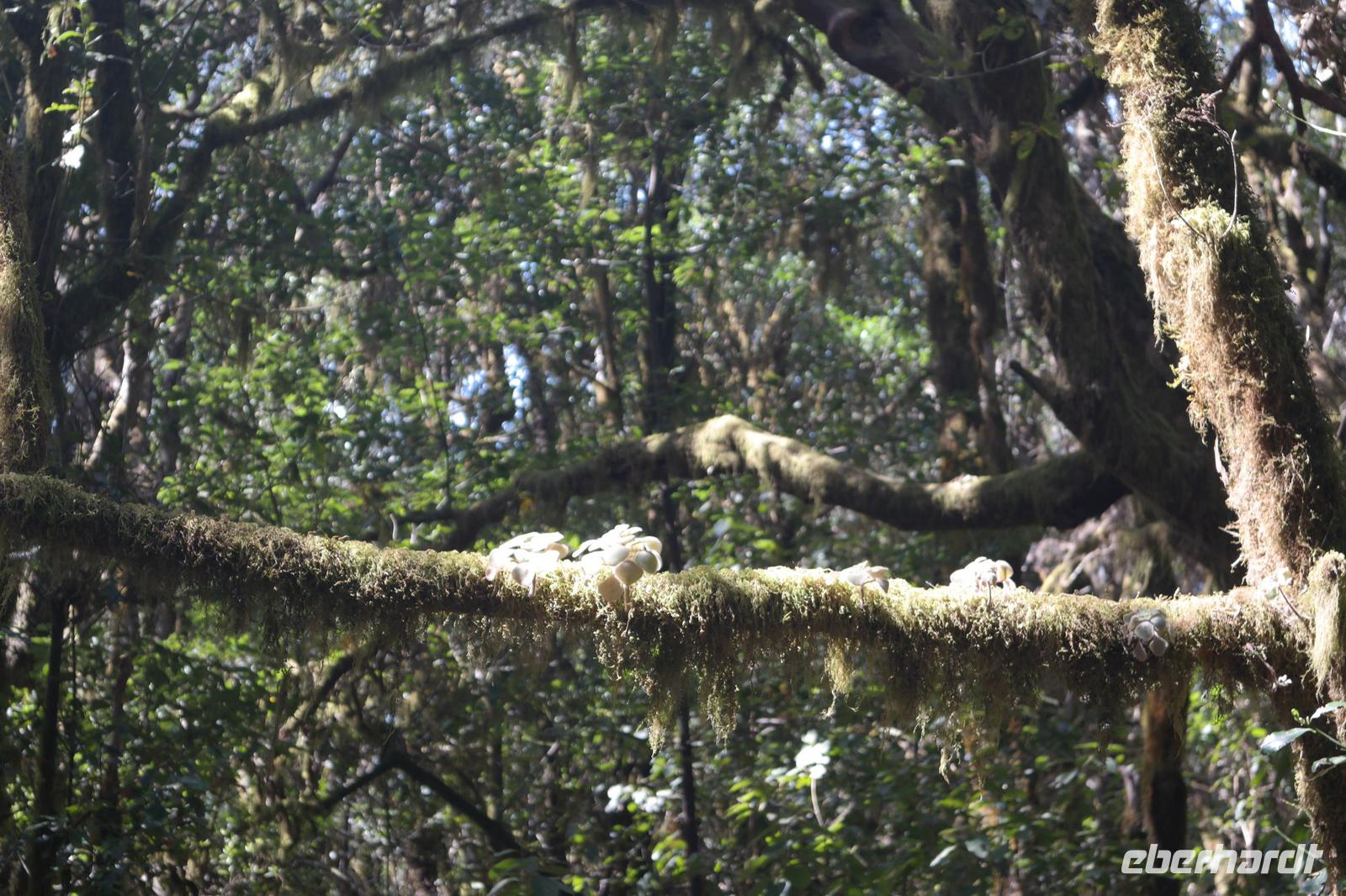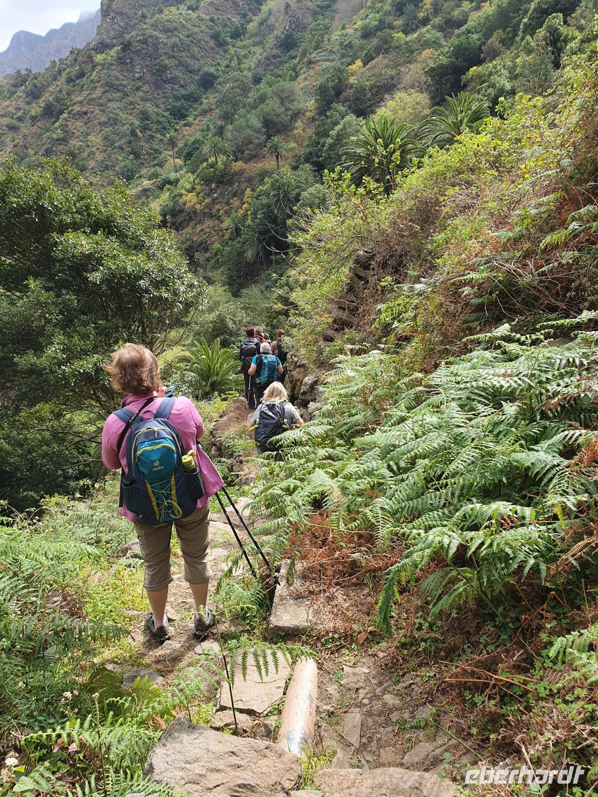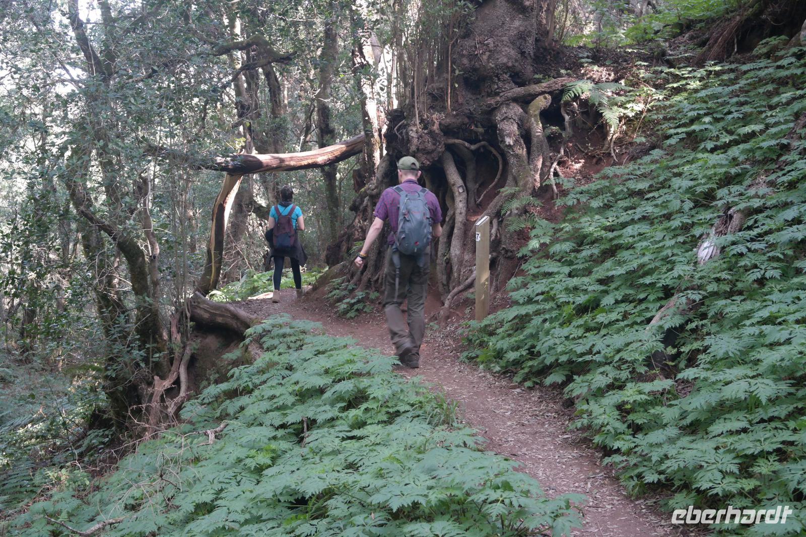 Nach dem Frühstück erwartet uns Ulrike bereits vor dem Hotel, wir gehen noch schnell in den Super-markt um Proviant für unterwegs zu kaufen, und dann lernen wir unseren Buschauffeur Ernesto mit seinem Cabrio-Bus kennen, der uns die ganze Woche zur Verfügung steht. Bei genau 20 Sitzplätzen ist die Vollzähligkeit der Gruppe sehr übersichtlich - Bus voll = alle sind da. Ernesto schiebt das Verdeck des Busses zurück und der warme Luftzug lässt uns die erste Fahrt in vollen Zügen genießen. Unsere erste Wanderung ist gleich die Gipfeltour - wir erwandern den mit 1.487 höchsten Berg der Insel, den Alto de Garajonay, der im gleichnamigen Naturschutzgebiet liegt. Unsere Ulrike nimmt Rücksicht auf die Strapazen unserer Anreise und verkürzt die erste Wanderung um gut 2,5 km (um sie anschließend an die Gipfeltour wieder anzuhängen). Die einzigartige Naturlandschaft wird geprägt von meterhoher Baumheide, verschieden Arten Lorbeerbäume, Buschheide, Farne, Moose, Sukkulenten, kanarischen Kiefern und jeder Menge endemischer Pflanzen - Ulrike scheint sie alle persönlich zu kennen und lässt uns an ihrem botanischen Fachwissen teilhaben. Schon um die Mittagszeit genießen wir den fantastischen Ausblick vom Gipfel des Garajonay über die gesamte Insel und auch der Pico del Teide auf der benachbarten Insel Teneriffa ist nun gut zu erkennen. Auf dem Rückweg holt ein Teil der Gruppe die zunächst eingesparten 2,5 km Wanderung nach, wir hatten schließlich noch nicht genug fotografiert und neue Motive fanden sich sehr schnell. Ulrike lobte unsere Gruppe als „beste Gruppe, die sie heute hatte" und wir treffen uns pünktlich um 18.52 Uhr zum gemeinsamen Abendessen. Im Restaurant Los Caprichos wartet natürlich die grüne Suppe auf uns, diesmal etwas dicker und sehr reichlich davon, die kanarische Kresse (Tropaeolum peregrinum, stammt ursprünglich aus Peru) muss ähnlich groß sein wie Rhabarberblätter. Almogrote, Mojo rojo und Mojo verde, Miel de Palma, Gofio und die schrumpeligen Salzkartoffeln (papas arrugadas) erobern unser Herz und unsere Mägen. Dazu passt sehr gut ein Wein von der Insel oder ein frisch gezapftes Dorada.