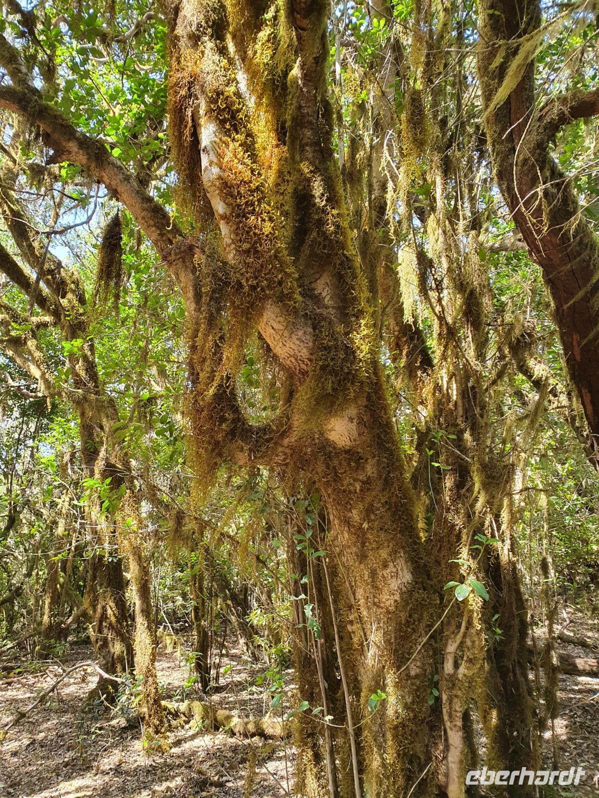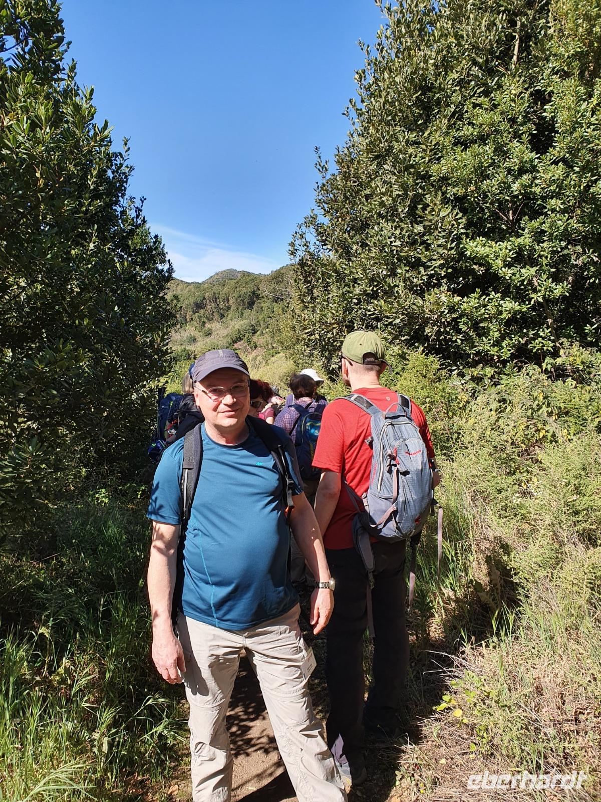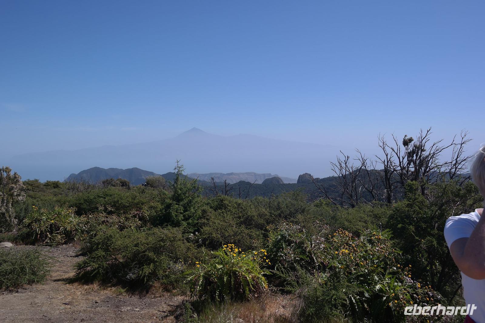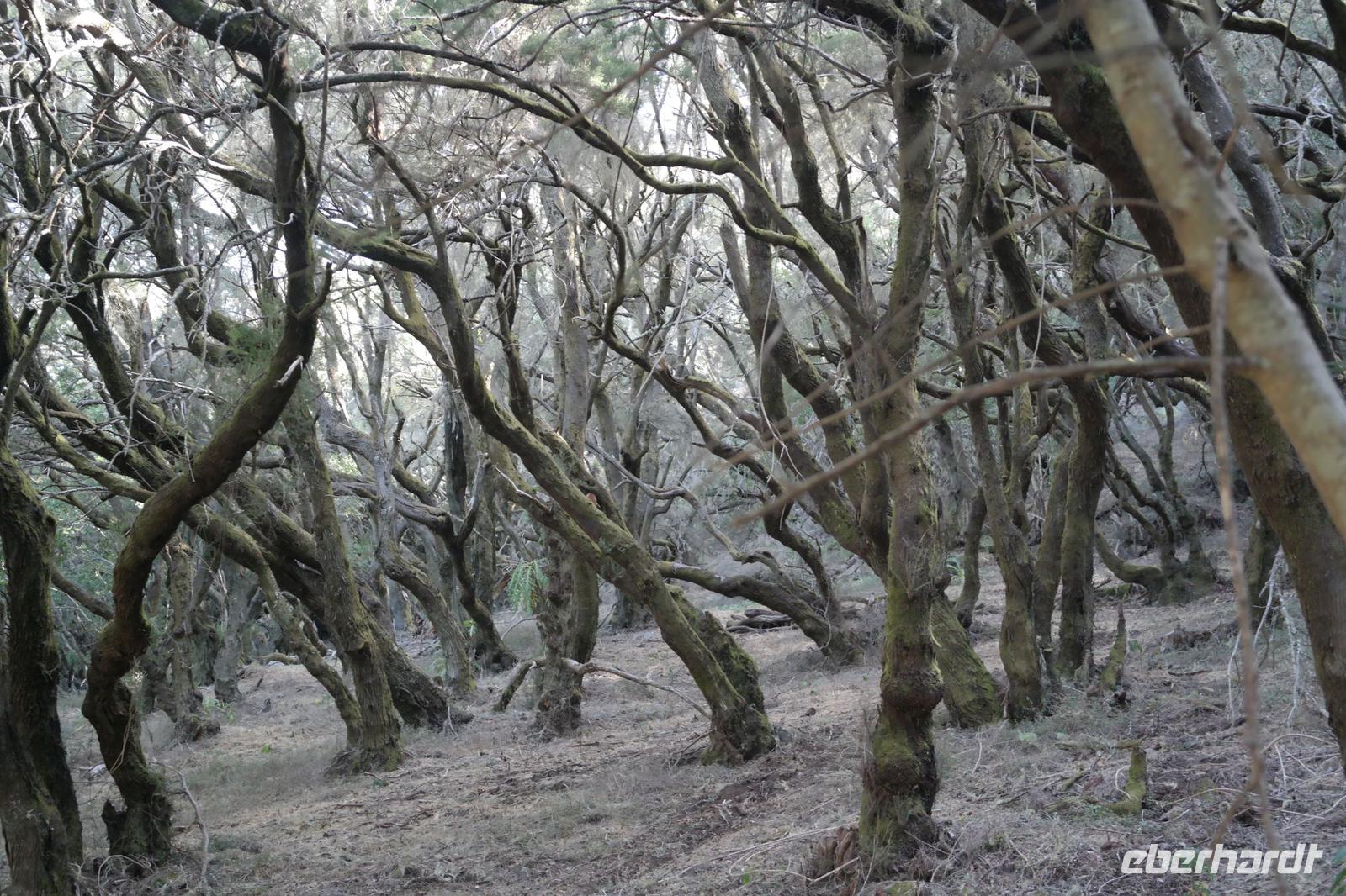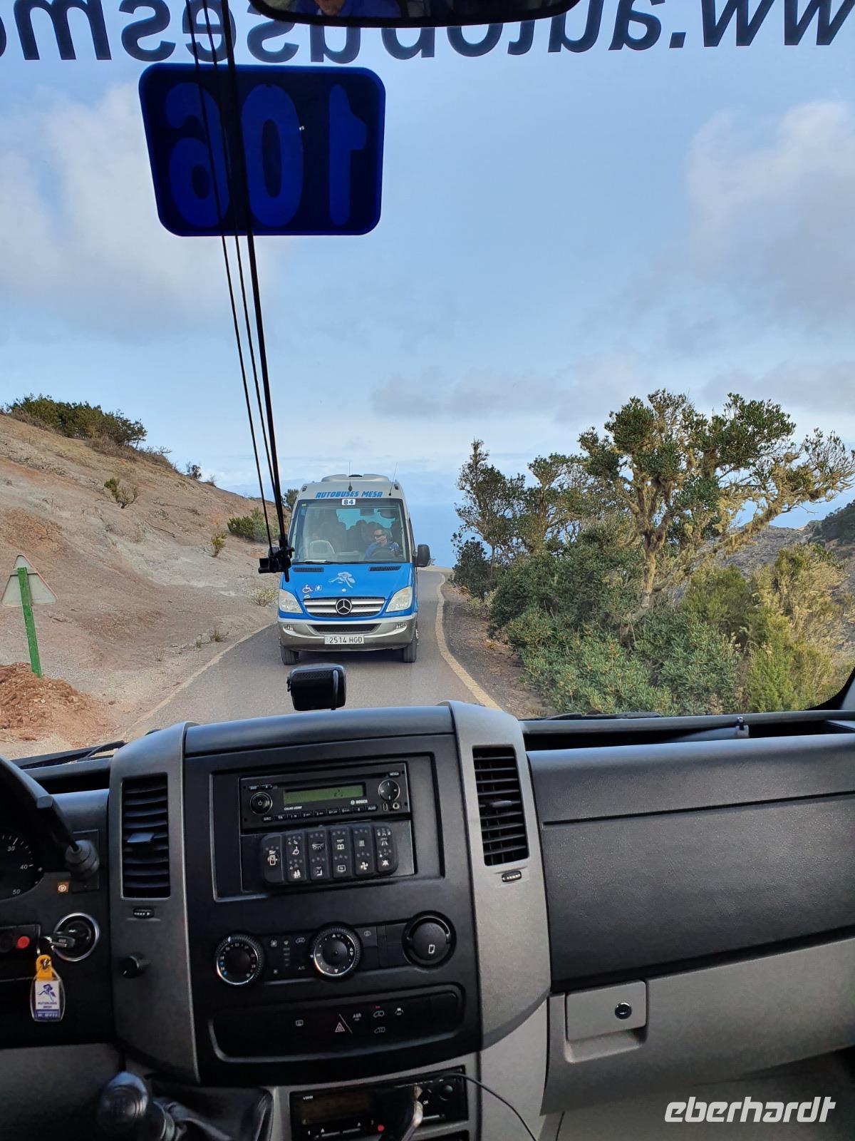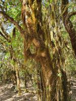 Nach dem Frühstück erwartet uns Ulrike bereits vor dem Hotel, wir gehen noch schnell in den Super-markt um Proviant für unterwegs zu kaufen, und dann lernen wir unseren Buschauffeur Ernesto mit seinem Cabrio-Bus kennen, der uns die ganze Woche zur Verfügung steht. Bei genau 20 Sitzplätzen ist die Vollzähligkeit der Gruppe sehr übersichtlich - Bus voll = alle sind da. Ernesto schiebt das Verdeck des Busses zurück und der warme Luftzug lässt uns die erste Fahrt in vollen Zügen genießen. Unsere erste Wanderung ist gleich die Gipfeltour - wir erwandern den mit 1.487 höchsten Berg der Insel, den Alto de Garajonay, der im gleichnamigen Naturschutzgebiet liegt. Unsere Ulrike nimmt Rücksicht auf die Strapazen unserer Anreise und verkürzt die erste Wanderung um gut 2,5 km (um sie anschließend an die Gipfeltour wieder anzuhängen). Die einzigartige Naturlandschaft wird geprägt von meterhoher Baumheide, verschieden Arten Lorbeerbäume, Buschheide, Farne, Moose, Sukkulenten, kanarischen Kiefern und jeder Menge endemischer Pflanzen - Ulrike scheint sie alle persönlich zu kennen und lässt uns an ihrem botanischen Fachwissen teilhaben. Schon um die Mittagszeit genießen wir den fantastischen Ausblick vom Gipfel des Garajonay über die gesamte Insel und auch der Pico del Teide auf der benachbarten Insel Teneriffa ist nun gut zu erkennen. Auf dem Rückweg holt ein Teil der Gruppe die zunächst eingesparten 2,5 km Wanderung nach, wir hatten schließlich noch nicht genug fotografiert und neue Motive fanden sich sehr schnell. Ulrike lobte unsere Gruppe als „beste Gruppe, die sie heute hatte" und wir treffen uns pünktlich um 18.52 Uhr zum gemeinsamen Abendessen. Im Restaurant Los Caprichos wartet natürlich die grüne Suppe auf uns, diesmal etwas dicker und sehr reichlich davon, die kanarische Kresse (Tropaeolum peregrinum, stammt ursprünglich aus Peru) muss ähnlich groß sein wie Rhabarberblätter. Almogrote, Mojo rojo und Mojo verde, Miel de Palma, Gofio und die schrumpeligen Salzkartoffeln (papas arrugadas) erobern unser Herz und unsere Mägen. Dazu passt sehr gut ein Wein von der Insel oder ein frisch gezapftes Dorada.