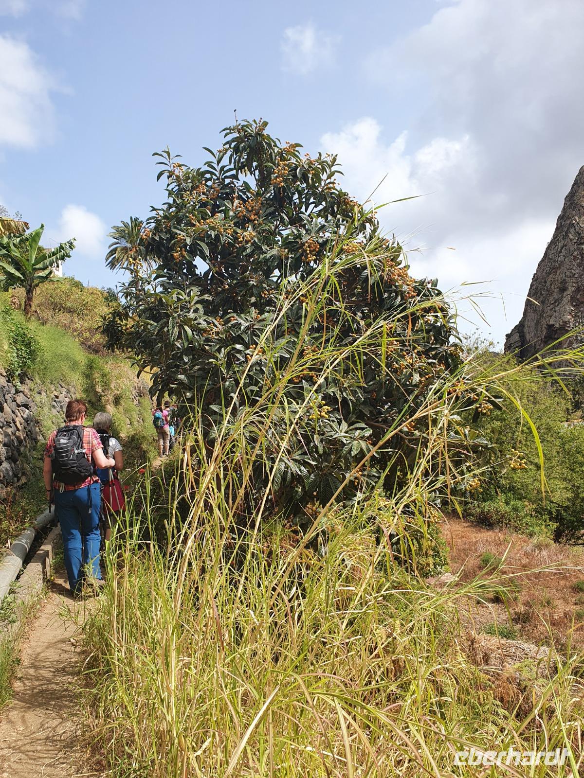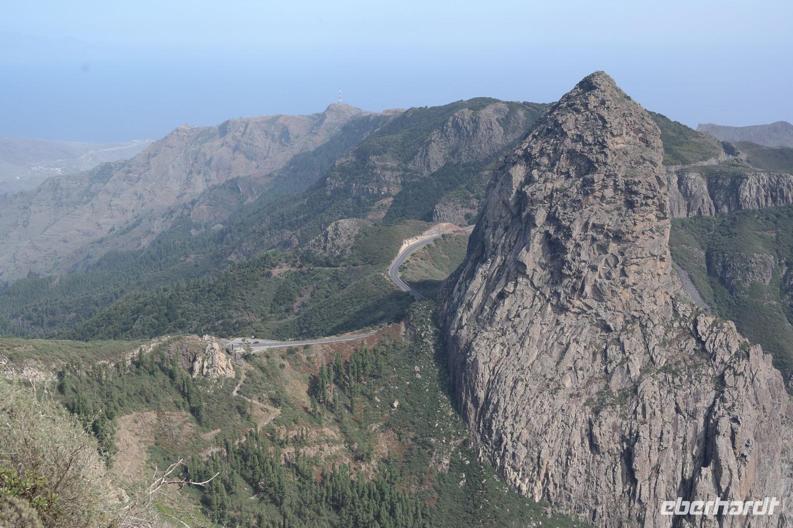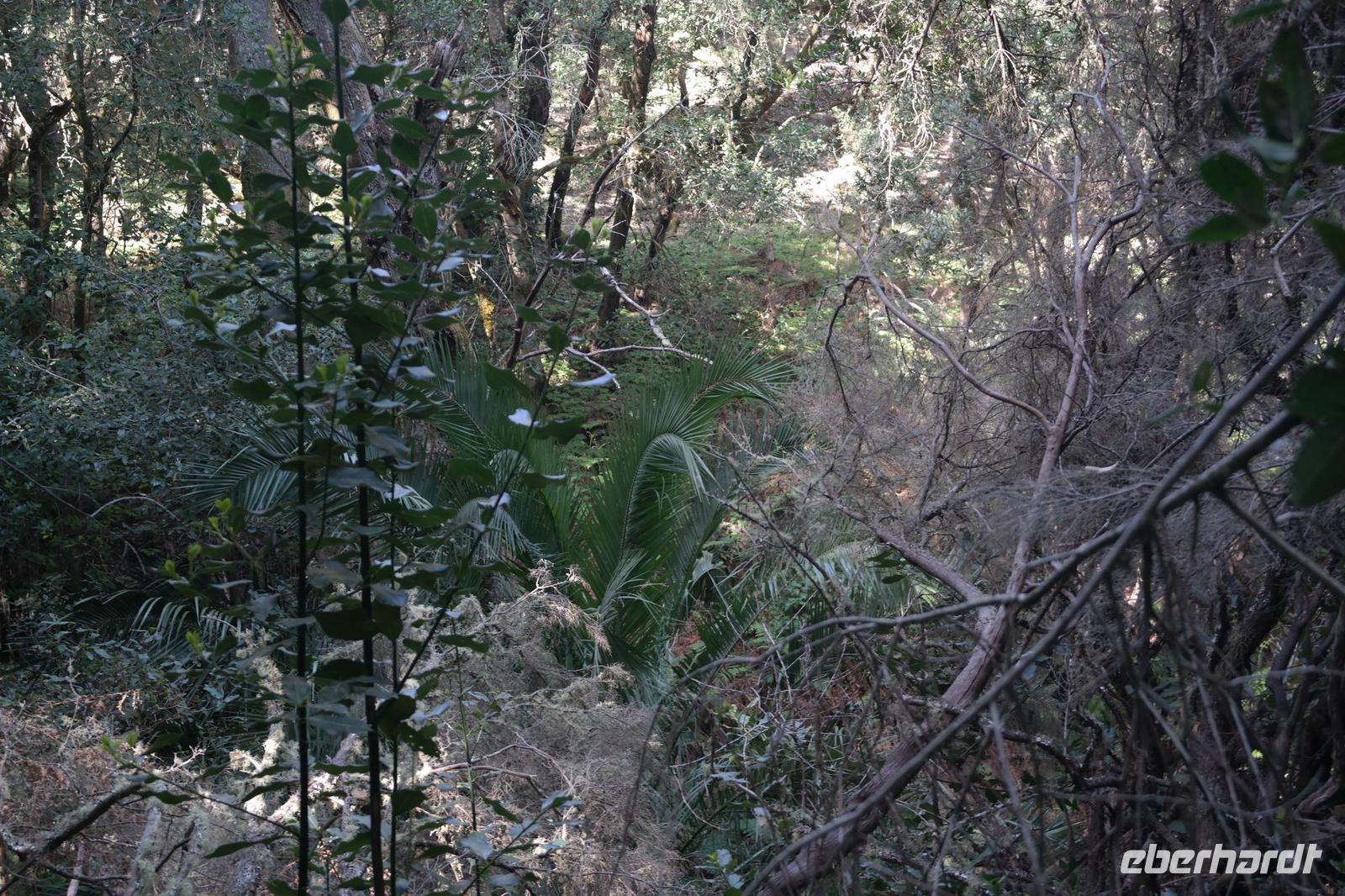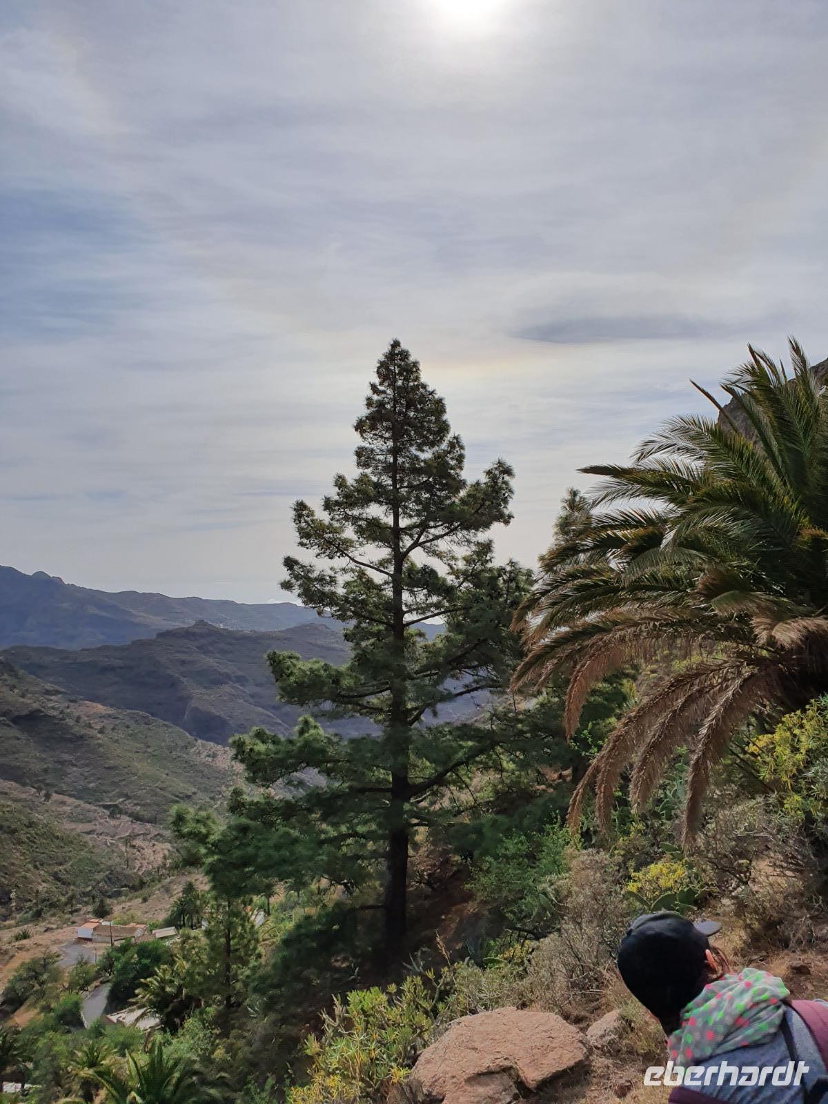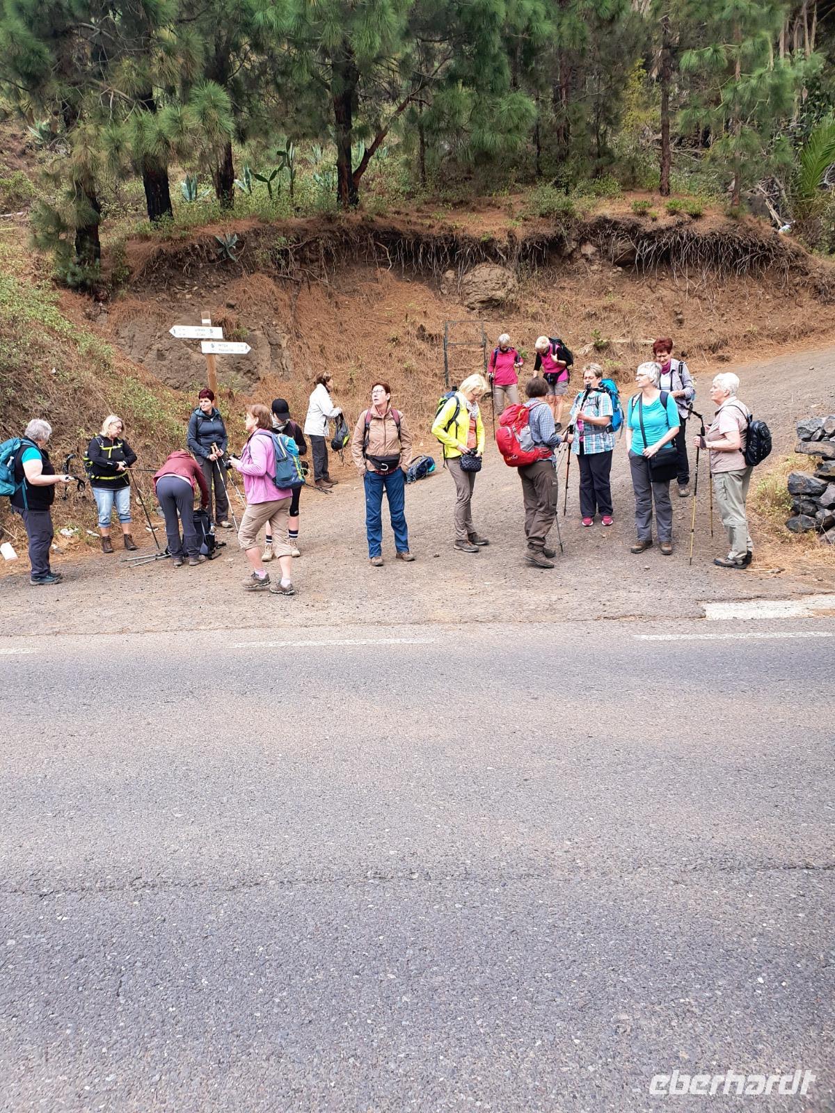 Nach dem Frühstück erwartet uns Ulrike bereits vor dem Hotel, wir gehen noch schnell in den Super-markt um Proviant für unterwegs zu kaufen, und dann lernen wir unseren Buschauffeur Ernesto mit seinem Cabrio-Bus kennen, der uns die ganze Woche zur Verfügung steht. Bei genau 20 Sitzplätzen ist die Vollzähligkeit der Gruppe sehr übersichtlich - Bus voll = alle sind da. Ernesto schiebt das Verdeck des Busses zurück und der warme Luftzug lässt uns die erste Fahrt in vollen Zügen genießen. Unsere erste Wanderung ist gleich die Gipfeltour - wir erwandern den mit 1.487 höchsten Berg der Insel, den Alto de Garajonay, der im gleichnamigen Naturschutzgebiet liegt. Unsere Ulrike nimmt Rücksicht auf die Strapazen unserer Anreise und verkürzt die erste Wanderung um gut 2,5 km (um sie anschließend an die Gipfeltour wieder anzuhängen). Die einzigartige Naturlandschaft wird geprägt von meterhoher Baumheide, verschieden Arten Lorbeerbäume, Buschheide, Farne, Moose, Sukkulenten, kanarischen Kiefern und jeder Menge endemischer Pflanzen - Ulrike scheint sie alle persönlich zu kennen und lässt uns an ihrem botanischen Fachwissen teilhaben. Schon um die Mittagszeit genießen wir den fantastischen Ausblick vom Gipfel des Garajonay über die gesamte Insel und auch der Pico del Teide auf der benachbarten Insel Teneriffa ist nun gut zu erkennen. Auf dem Rückweg holt ein Teil der Gruppe die zunächst eingesparten 2,5 km Wanderung nach, wir hatten schließlich noch nicht genug fotografiert und neue Motive fanden sich sehr schnell. Ulrike lobte unsere Gruppe als „beste Gruppe, die sie heute hatte" und wir treffen uns pünktlich um 18.52 Uhr zum gemeinsamen Abendessen. Im Restaurant Los Caprichos wartet natürlich die grüne Suppe auf uns, diesmal etwas dicker und sehr reichlich davon, die kanarische Kresse (Tropaeolum peregrinum, stammt ursprünglich aus Peru) muss ähnlich groß sein wie Rhabarberblätter. Almogrote, Mojo rojo und Mojo verde, Miel de Palma, Gofio und die schrumpeligen Salzkartoffeln (papas arrugadas) erobern unser Herz und unsere Mägen. Dazu passt sehr gut ein Wein von der Insel oder ein frisch gezapftes Dorada.