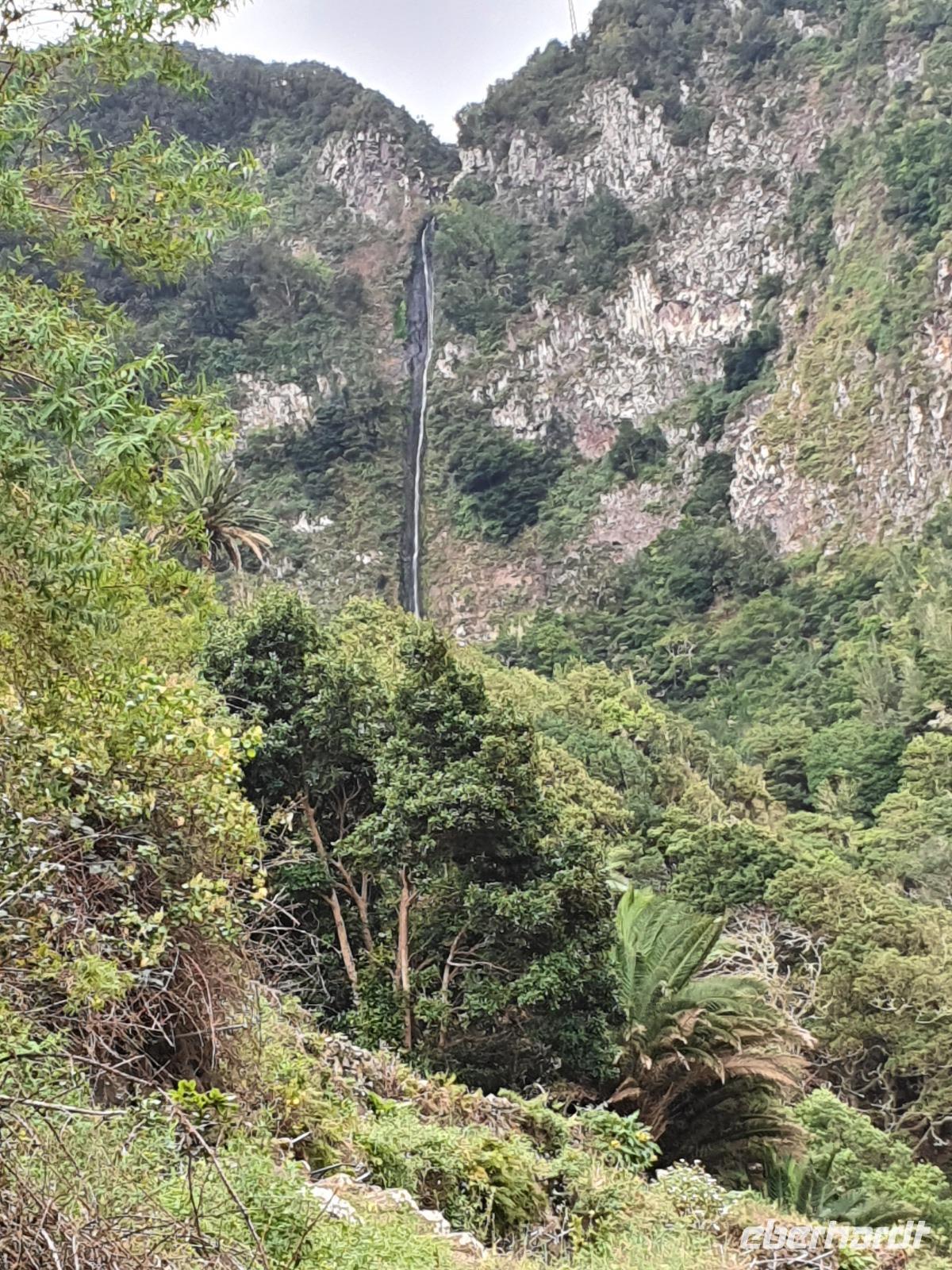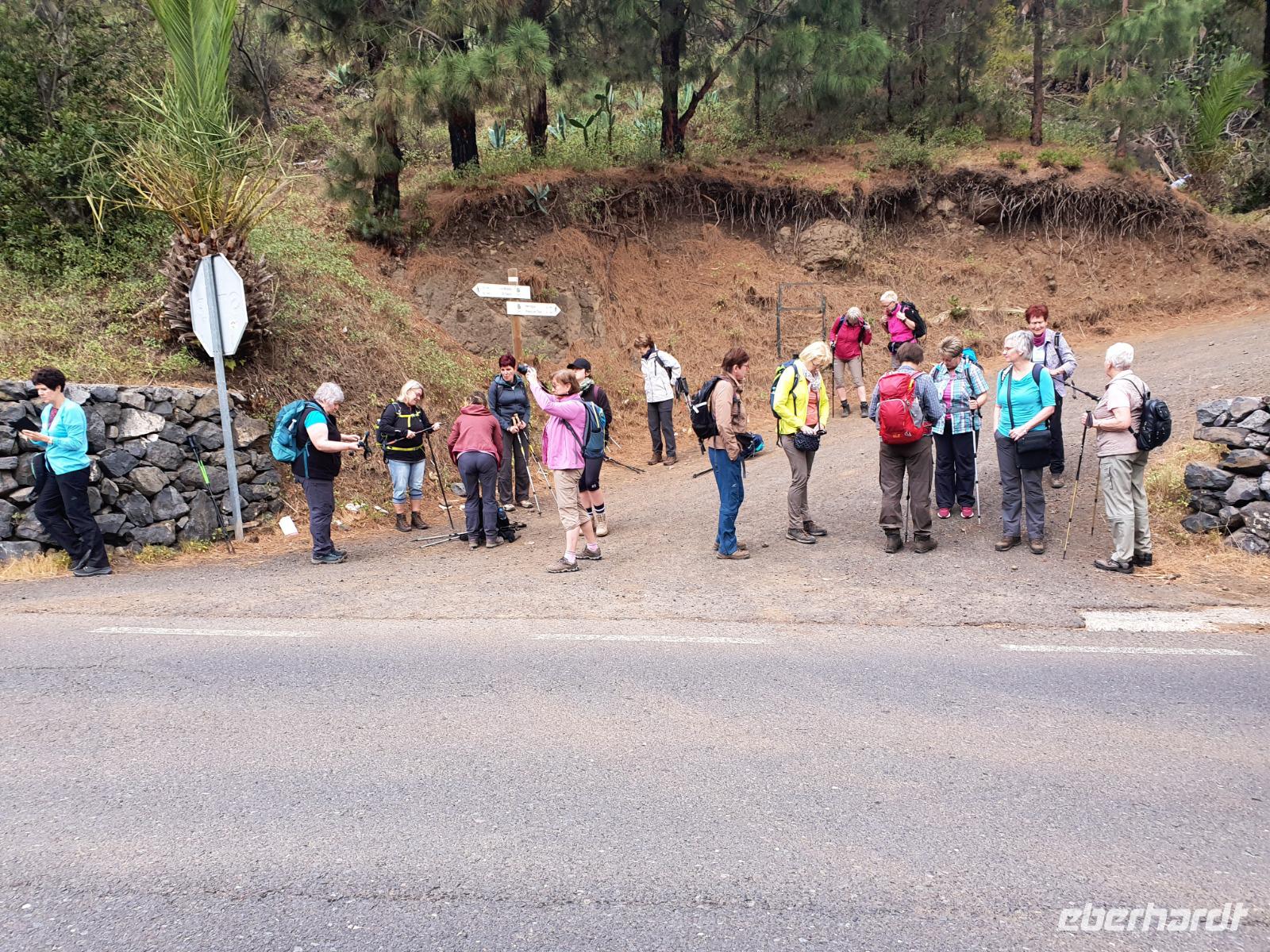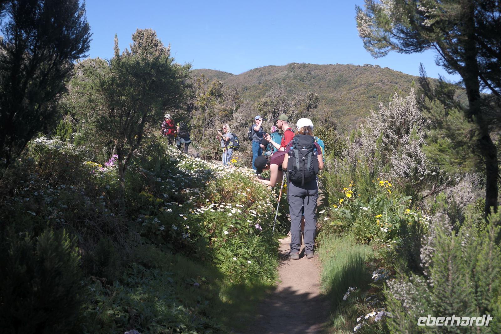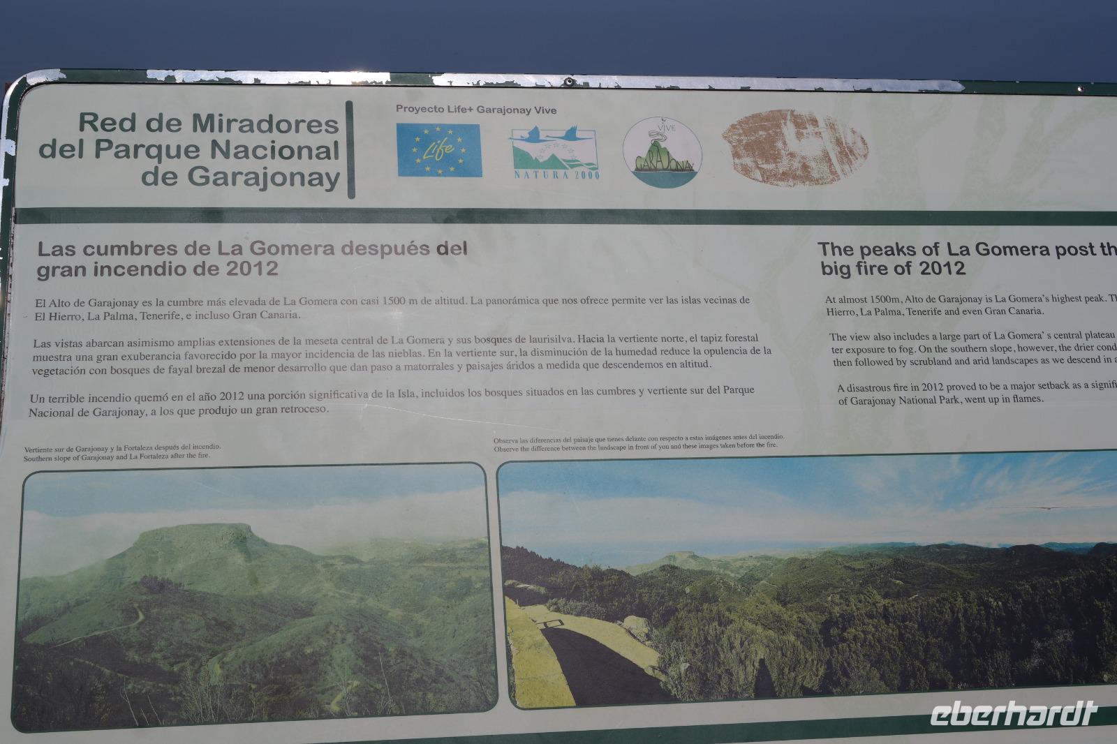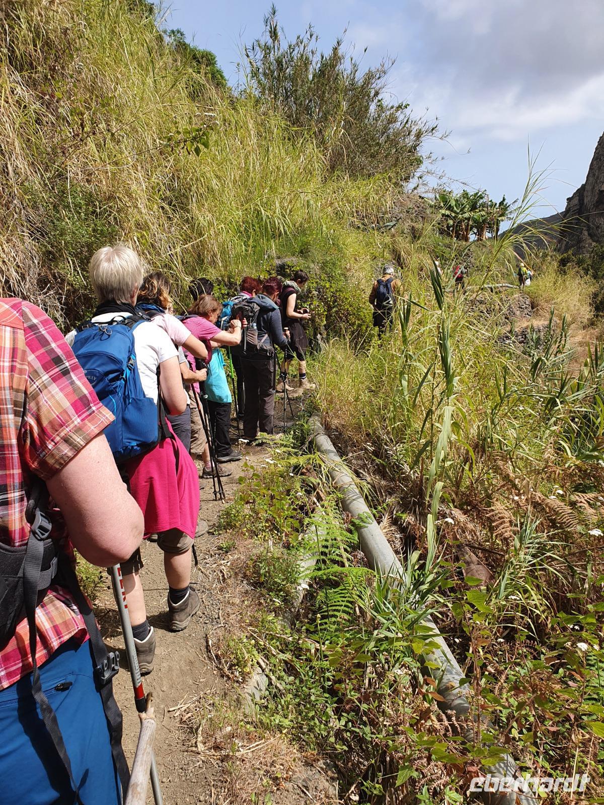 Nach dem Frühstück erwartet uns Ulrike bereits vor dem Hotel, wir gehen noch schnell in den Super-markt um Proviant für unterwegs zu kaufen, und dann lernen wir unseren Buschauffeur Ernesto mit seinem Cabrio-Bus kennen, der uns die ganze Woche zur Verfügung steht. Bei genau 20 Sitzplätzen ist die Vollzähligkeit der Gruppe sehr übersichtlich - Bus voll = alle sind da. Ernesto schiebt das Verdeck des Busses zurück und der warme Luftzug lässt uns die erste Fahrt in vollen Zügen genießen. Unsere erste Wanderung ist gleich die Gipfeltour - wir erwandern den mit 1.487 höchsten Berg der Insel, den Alto de Garajonay, der im gleichnamigen Naturschutzgebiet liegt. Unsere Ulrike nimmt Rücksicht auf die Strapazen unserer Anreise und verkürzt die erste Wanderung um gut 2,5 km (um sie anschließend an die Gipfeltour wieder anzuhängen). Die einzigartige Naturlandschaft wird geprägt von meterhoher Baumheide, verschieden Arten Lorbeerbäume, Buschheide, Farne, Moose, Sukkulenten, kanarischen Kiefern und jeder Menge endemischer Pflanzen - Ulrike scheint sie alle persönlich zu kennen und lässt uns an ihrem botanischen Fachwissen teilhaben. Schon um die Mittagszeit genießen wir den fantastischen Ausblick vom Gipfel des Garajonay über die gesamte Insel und auch der Pico del Teide auf der benachbarten Insel Teneriffa ist nun gut zu erkennen. Auf dem Rückweg holt ein Teil der Gruppe die zunächst eingesparten 2,5 km Wanderung nach, wir hatten schließlich noch nicht genug fotografiert und neue Motive fanden sich sehr schnell. Ulrike lobte unsere Gruppe als „beste Gruppe, die sie heute hatte" und wir treffen uns pünktlich um 18.52 Uhr zum gemeinsamen Abendessen. Im Restaurant Los Caprichos wartet natürlich die grüne Suppe auf uns, diesmal etwas dicker und sehr reichlich davon, die kanarische Kresse (Tropaeolum peregrinum, stammt ursprünglich aus Peru) muss ähnlich groß sein wie Rhabarberblätter. Almogrote, Mojo rojo und Mojo verde, Miel de Palma, Gofio und die schrumpeligen Salzkartoffeln (papas arrugadas) erobern unser Herz und unsere Mägen. Dazu passt sehr gut ein Wein von der Insel oder ein frisch gezapftes Dorada.