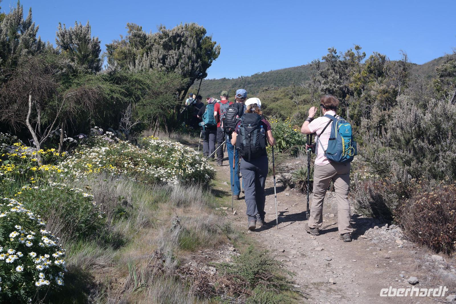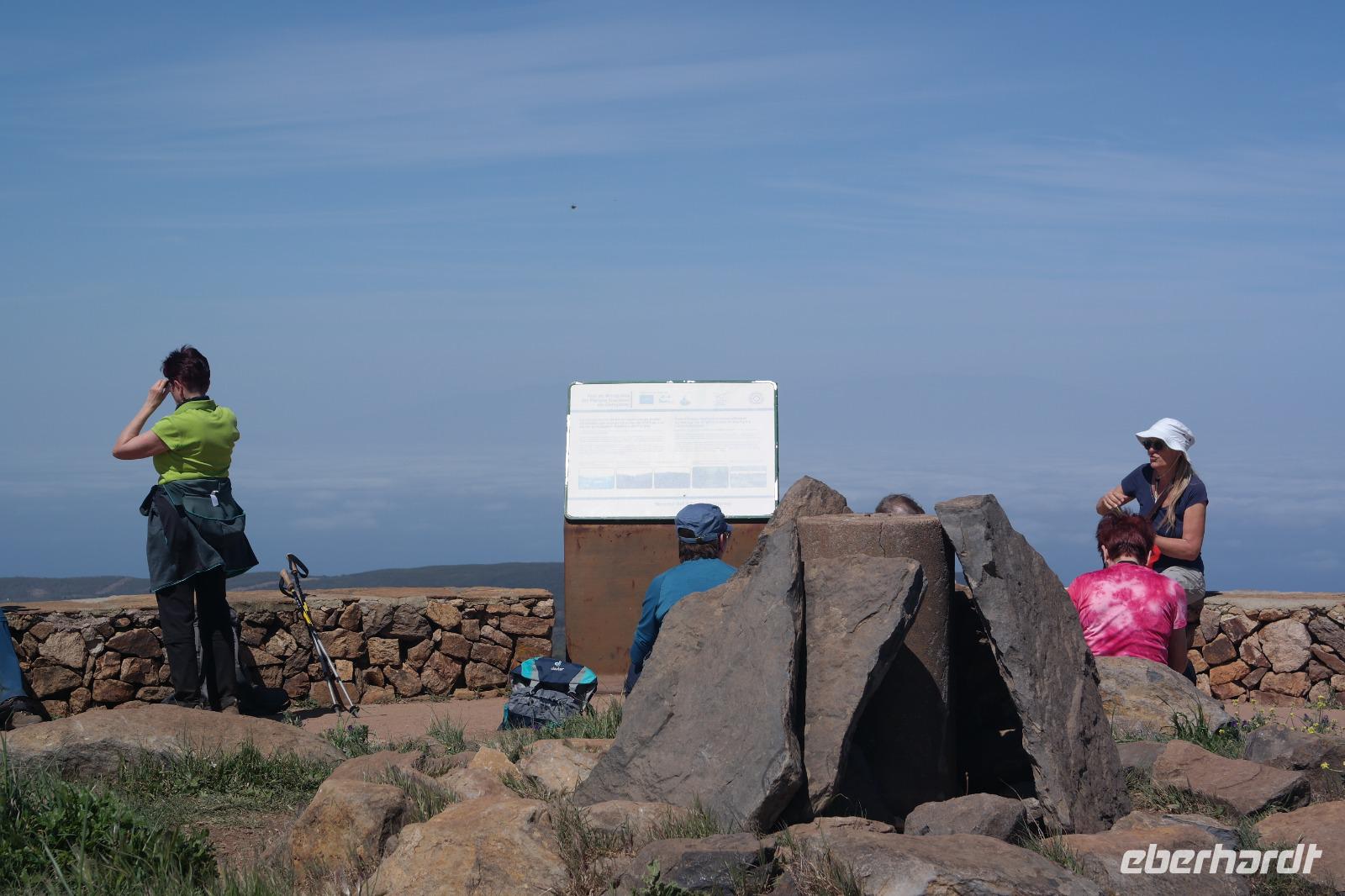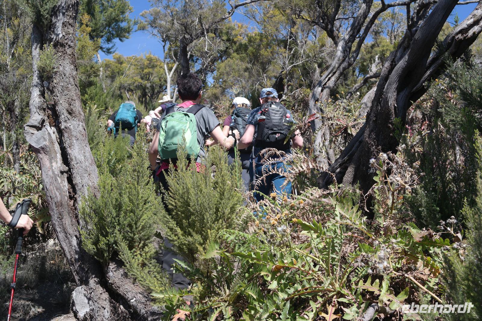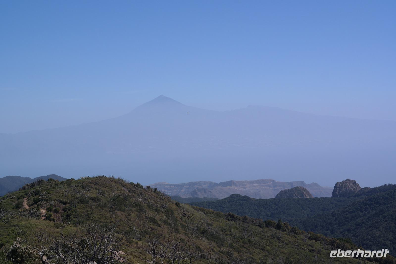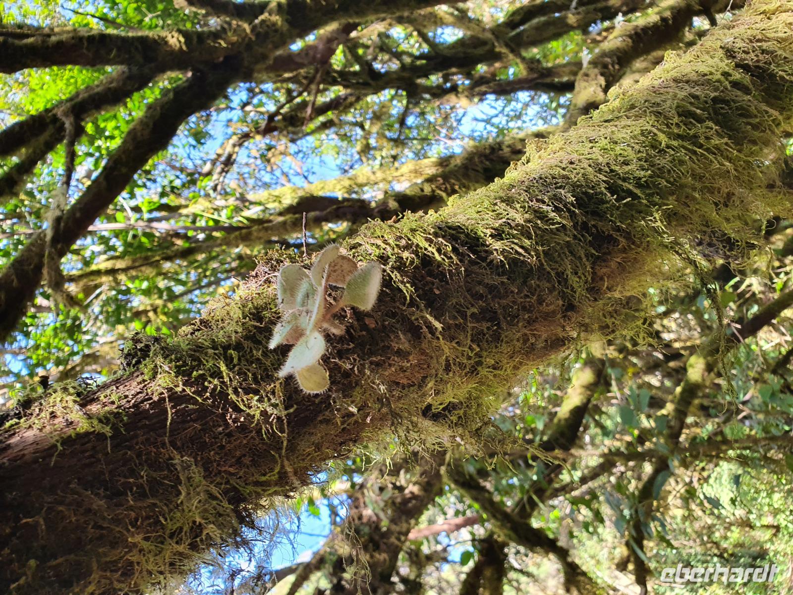 Nach dem Frühstück erwartet uns Ulrike bereits vor dem Hotel, wir gehen noch schnell in den Super-markt um Proviant für unterwegs zu kaufen, und dann lernen wir unseren Buschauffeur Ernesto mit seinem Cabrio-Bus kennen, der uns die ganze Woche zur Verfügung steht. Bei genau 20 Sitzplätzen ist die Vollzähligkeit der Gruppe sehr übersichtlich - Bus voll = alle sind da. Ernesto schiebt das Verdeck des Busses zurück und der warme Luftzug lässt uns die erste Fahrt in vollen Zügen genießen. Unsere erste Wanderung ist gleich die Gipfeltour - wir erwandern den mit 1.487 höchsten Berg der Insel, den Alto de Garajonay, der im gleichnamigen Naturschutzgebiet liegt. Unsere Ulrike nimmt Rücksicht auf die Strapazen unserer Anreise und verkürzt die erste Wanderung um gut 2,5 km (um sie anschließend an die Gipfeltour wieder anzuhängen). Die einzigartige Naturlandschaft wird geprägt von meterhoher Baumheide, verschieden Arten Lorbeerbäume, Buschheide, Farne, Moose, Sukkulenten, kanarischen Kiefern und jeder Menge endemischer Pflanzen - Ulrike scheint sie alle persönlich zu kennen und lässt uns an ihrem botanischen Fachwissen teilhaben. Schon um die Mittagszeit genießen wir den fantastischen Ausblick vom Gipfel des Garajonay über die gesamte Insel und auch der Pico del Teide auf der benachbarten Insel Teneriffa ist nun gut zu erkennen. Auf dem Rückweg holt ein Teil der Gruppe die zunächst eingesparten 2,5 km Wanderung nach, wir hatten schließlich noch nicht genug fotografiert und neue Motive fanden sich sehr schnell. Ulrike lobte unsere Gruppe als „beste Gruppe, die sie heute hatte" und wir treffen uns pünktlich um 18.52 Uhr zum gemeinsamen Abendessen. Im Restaurant Los Caprichos wartet natürlich die grüne Suppe auf uns, diesmal etwas dicker und sehr reichlich davon, die kanarische Kresse (Tropaeolum peregrinum, stammt ursprünglich aus Peru) muss ähnlich groß sein wie Rhabarberblätter. Almogrote, Mojo rojo und Mojo verde, Miel de Palma, Gofio und die schrumpeligen Salzkartoffeln (papas arrugadas) erobern unser Herz und unsere Mägen. Dazu passt sehr gut ein Wein von der Insel oder ein frisch gezapftes Dorada.