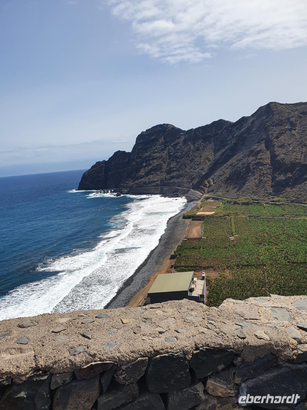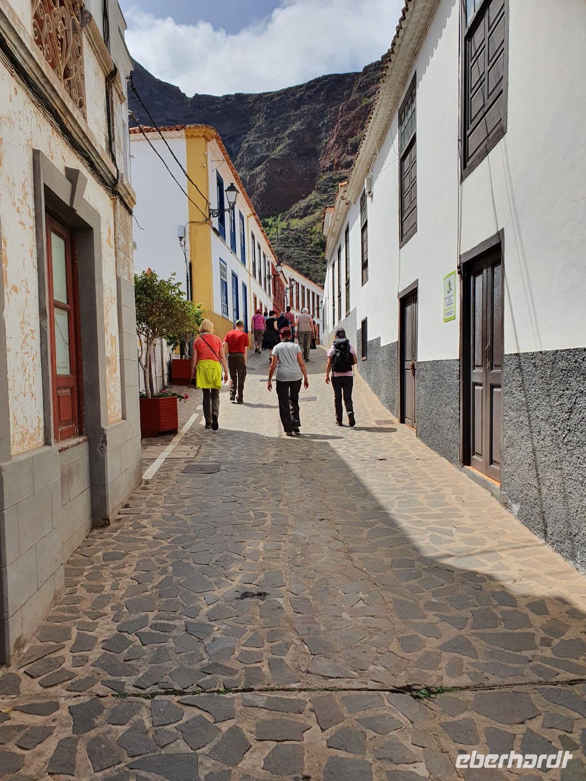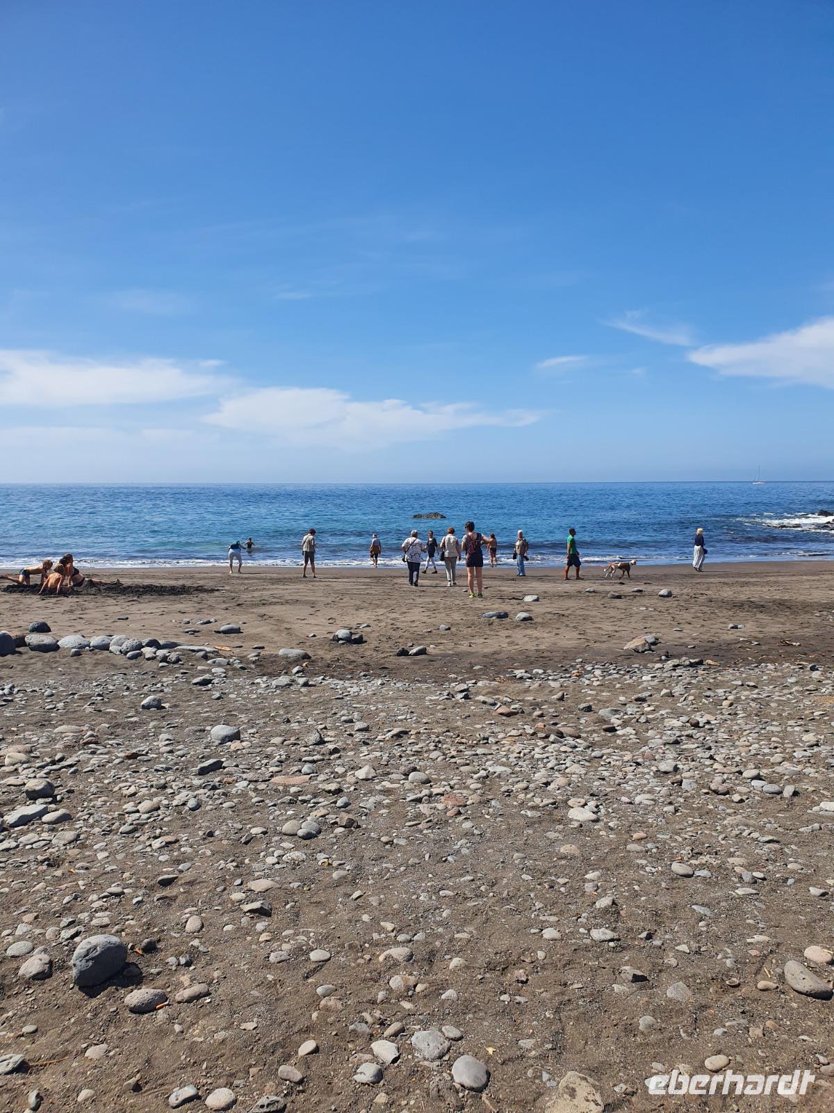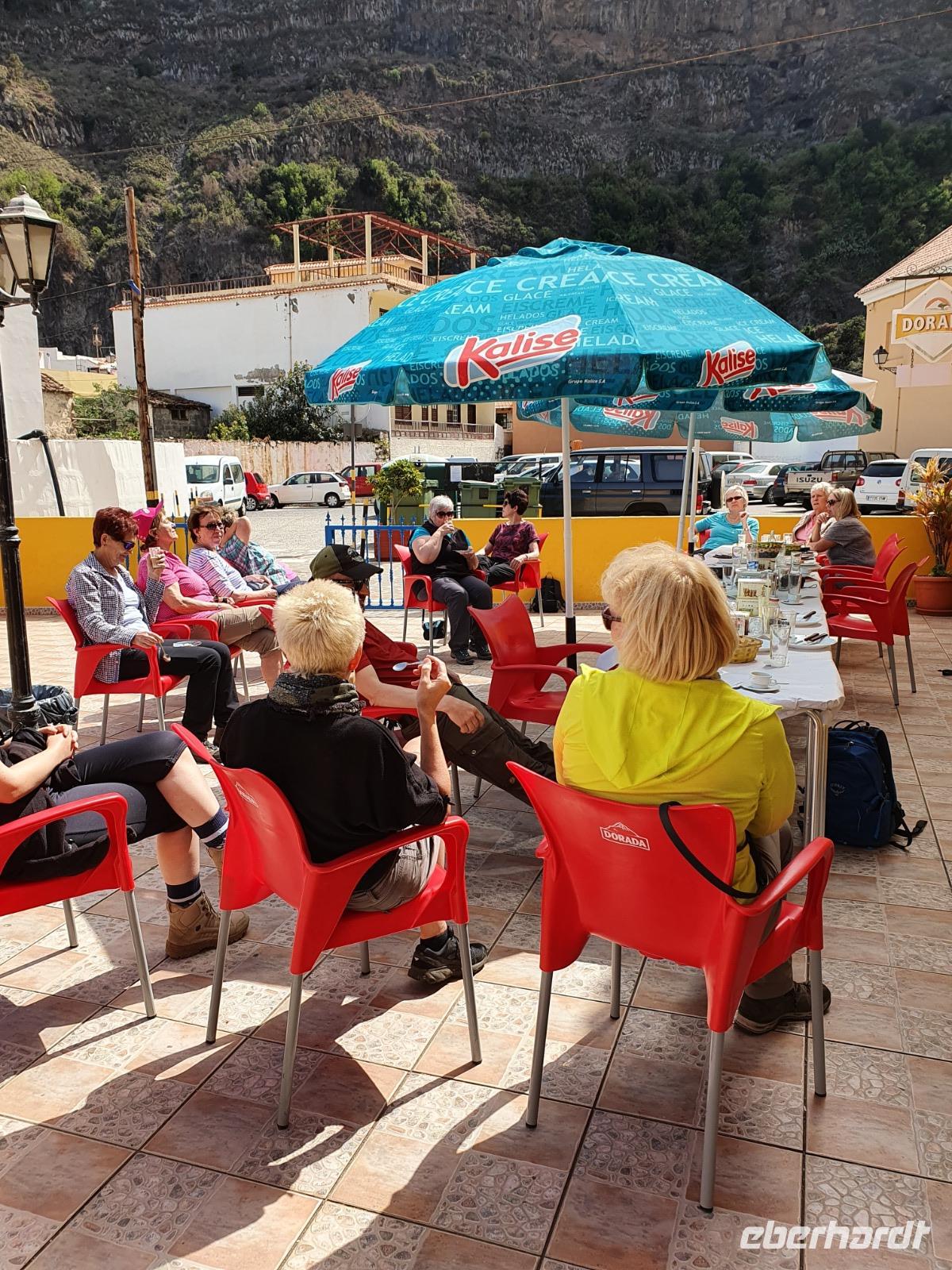 Eigentlich ist heute ein Tag zur freien Verfügung - wir aber bekommen einen Ausflug ins Tal des großen Königs (Valle Gran Rey) ganz im Westen der Insel spendiert. Auf dem Weg dorthin machen wir unterwegs einen kurzen Foto-Stopp am Mirador de Palmarejo und genießen den herrlichen Panorama-blick in das grüne Tal, kleine Dörfchen und Palmen - und Bananenplantagen sowie Terrassenfelder. Die steil aufragenden Berghänge machen die kleine Landwirtschaft in diesem Tal zu einem echten Abenteuer. An die terrassierten Berghänge schmiegen sich die weißen Häuser klitzekleiner Ortschften, auch eine winzige Kapelle thront über dem Tal. Der Wasserfall am oberen Ende des Barranco del Agua ist nur ein winziges Rinnsal - es hat seit Wochen auf La Gomera nicht geregnet, wie wir später noch sehen werden. Unser Busfahrer Ernesto lässt uns direkt am Strand von La Playa aussteigen - wir sehen und hören den Atlantik, der hier auf einen breiten und bei Touristen sehr beliebten Strand trifft. Die Uferpromenade verbindet die kleinen Dörfer La Playa, Puntilla und Vueltas und lädt zu einem gemütlichen Bummel ein. Zahlreiche Bars, Cafés und Restaurants laden zur Einkehr ein - wir lassen uns richtig gut gehen und genießen den Aufenthalt am Atlantik. Wie immer treffen wir uns um 18.52 Uhr vor dem Hotel - biegen einmal um's Eck und kehren zum Abendessen in Victor's Pension ein. Hier ist die grüne Suppe sehr viel gehaltvoller - dazu gibt's frischen Fisch oder Rindersteaks, Gemüse, die gesalzenen Schrumpelkartoffeln und zwei vegetarische Gerichte. Der einheimische Wein ist kräftig und lecker - wir lassen den Abend ausklingen und manche erkunden noch den hoteleigenen Wellnessbereich auf der Dachterrasse.