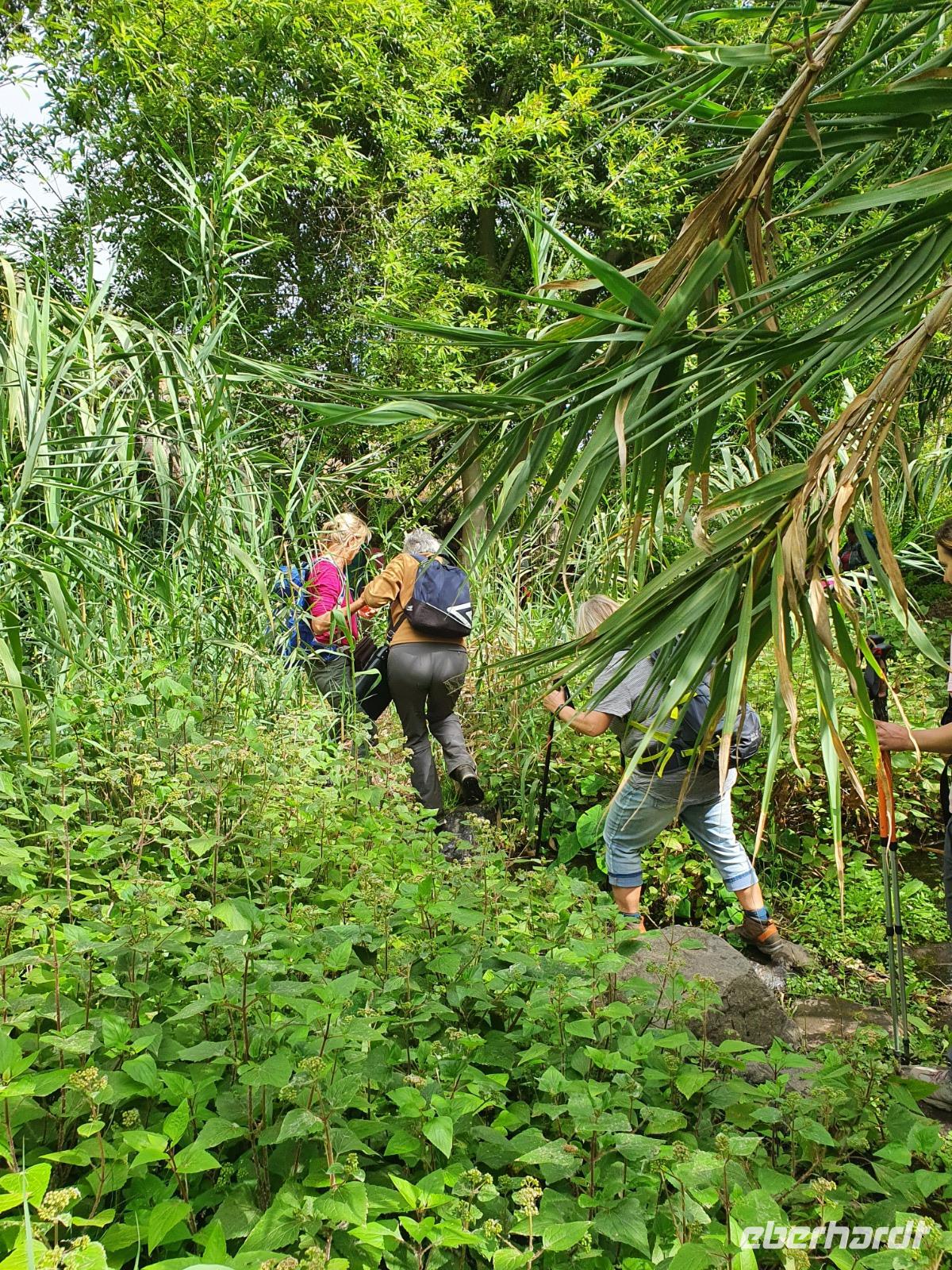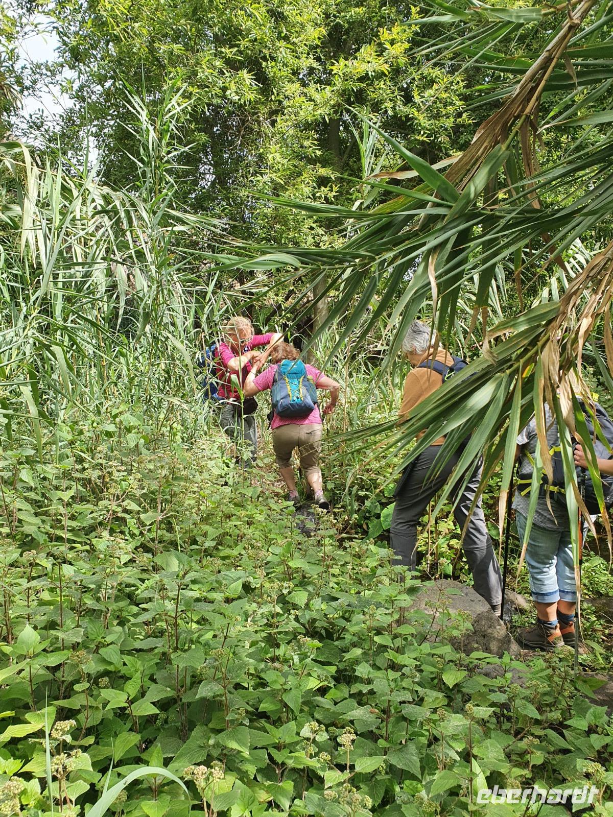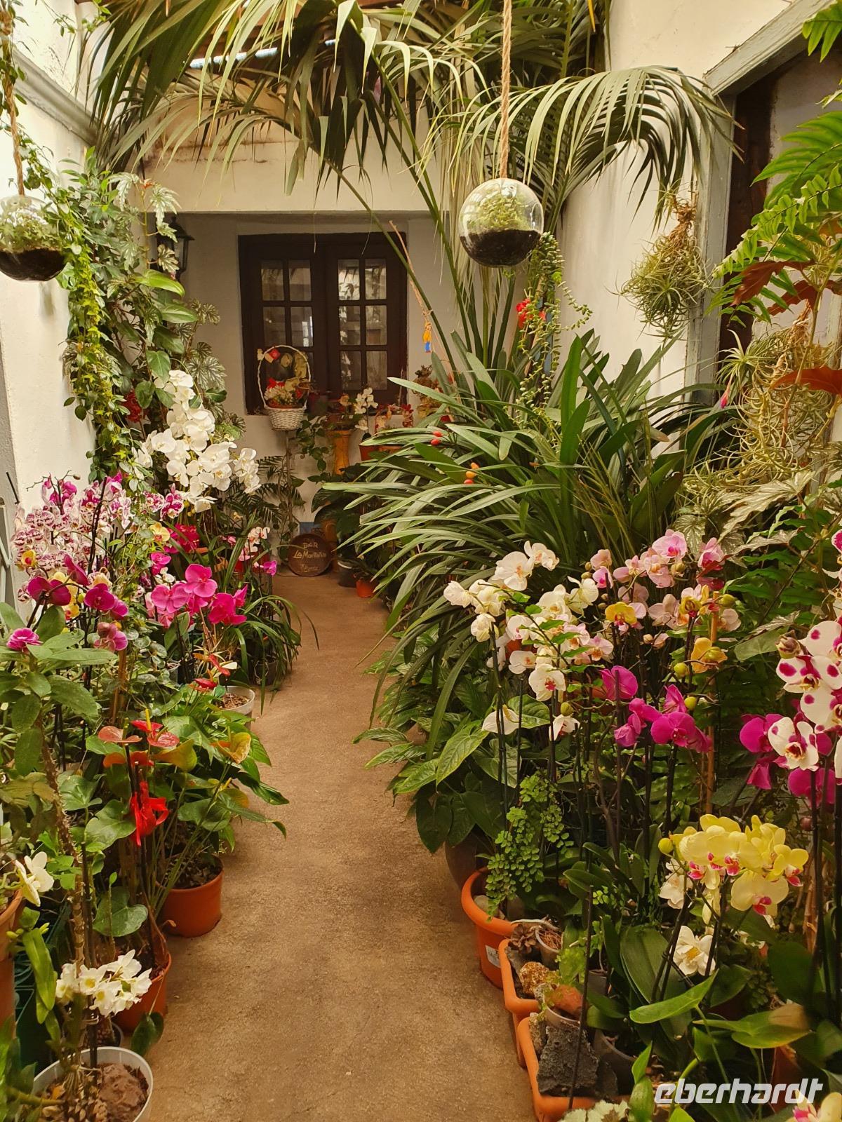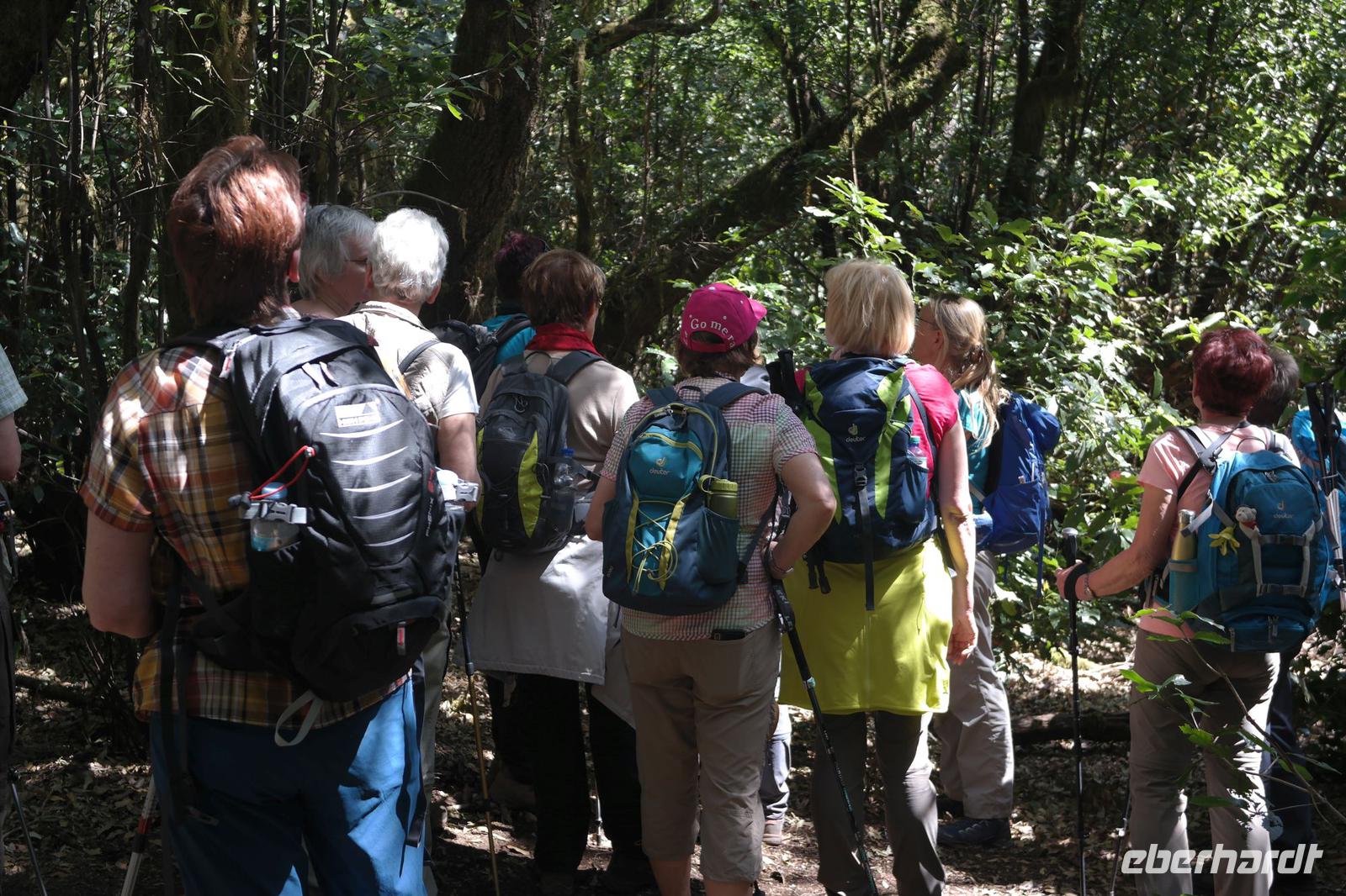 Ein weiteres Highlight steht heute auf unserem Programm - eine Wanderung im Märchen- oder Zauberwald im Nationalpark Garajonay. Der Lorbeerwald mit seinen moosbewachsenen Baumriesen, von denen Flechten zum Teil wie feines Haar herunterhängen, ist ein natürlicher Urwald. Die Passatwinde bringen die Wolken aus Nordosten auf die Insel und sorgen so für eine natürliche Bewässerung - so ist der Plan. Die langanhaltende Trockenheit wirkt sich auch hier aus - alles ist knochentrocken. Aber die Lorbeerbäume (4 Arten), Stechpalmen, Buschheide, Gagelbäume, Oliven, Flaschenputzerbäume, Agaven, Kaktusfeigen, verschiedene Sukkulenten und Wollmispeln überstehen die Trockenheit ganz gut. Unsere Ulrike ist sowieso in ihrem Element und zeigt und erklärt uns Pflanzen und Bäume, die in der Tat in diesem Wald ein sehr kurioses und nahezu einmaliges Bild von einem Urwald abgeben. Selbst große Waldbrände konnten dieses natürliche Refugium nicht dauerhaft schädigen. Bei schweißtreibenden Temperaturen führt uns Ulrike aus dem Urwald heraus - ein etwas steilerer Anstieg noch und ein paar Meter (oder war es ein Kilometer?) in der prallen Sonne und wir stehen in Las Hayas vor dem urigen Restaurant La Montana Casa Efigenia. Im Schatten mächtiger Eukalyptusbäume haben die Besitzerin (über 80 Jahre jung) und ihre Familie eine kleine und sehr feine Einkehr für Wanderer geschaffen, alles stammt aus eigener Landwirtschaft und wird in der Küche frisch zubereitet. Die Chefin bewirtet nach altem Brauch eine Wanderin persönlich - d.h., sie „füttert" sie mit etwas zittriger Hand. Viele Produkte können hier auch gekauft werden und Efigenia überwacht persönlich, dass das Entgelt auf den Cent stimmt. Mit ihren Blicken dirigiert sie auch die anderen Familienmitglieder im Service und in der Küche - die Dame hat einen sehr guten Ruf zu verteidigen.